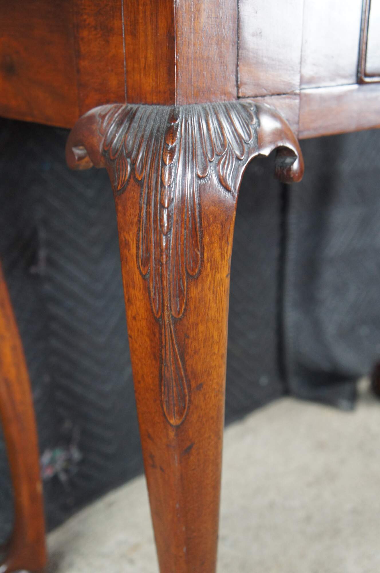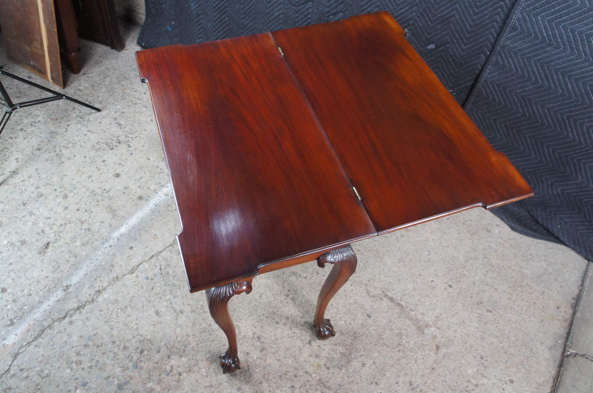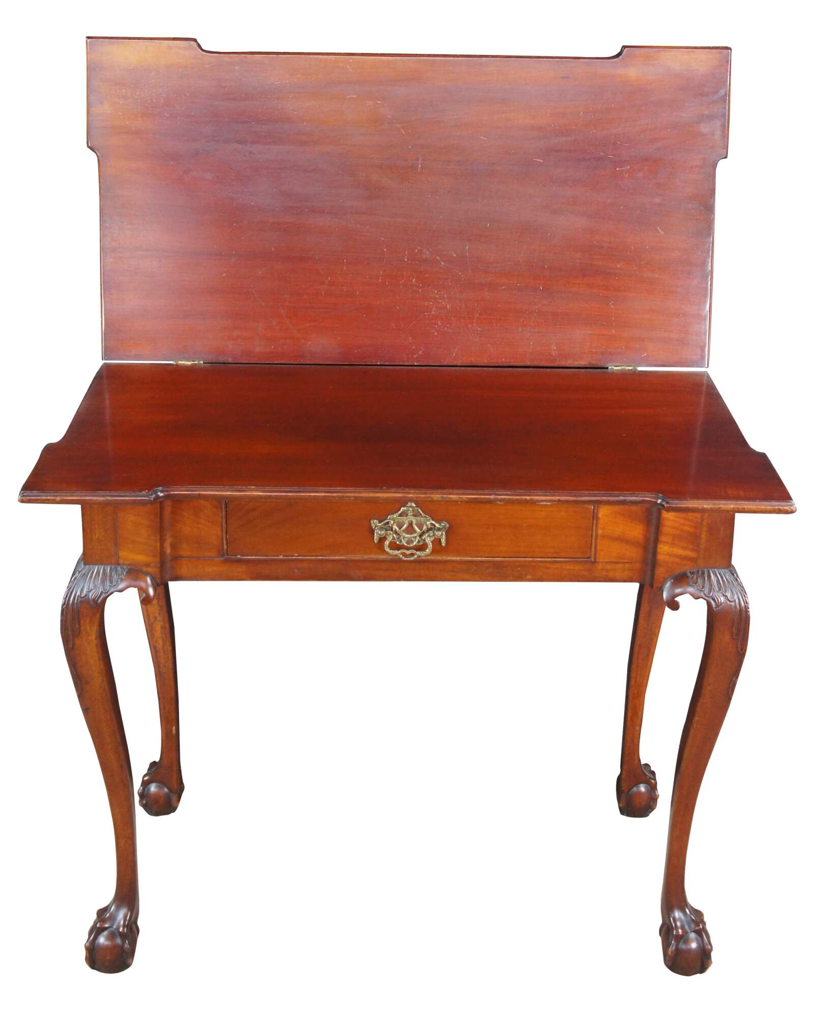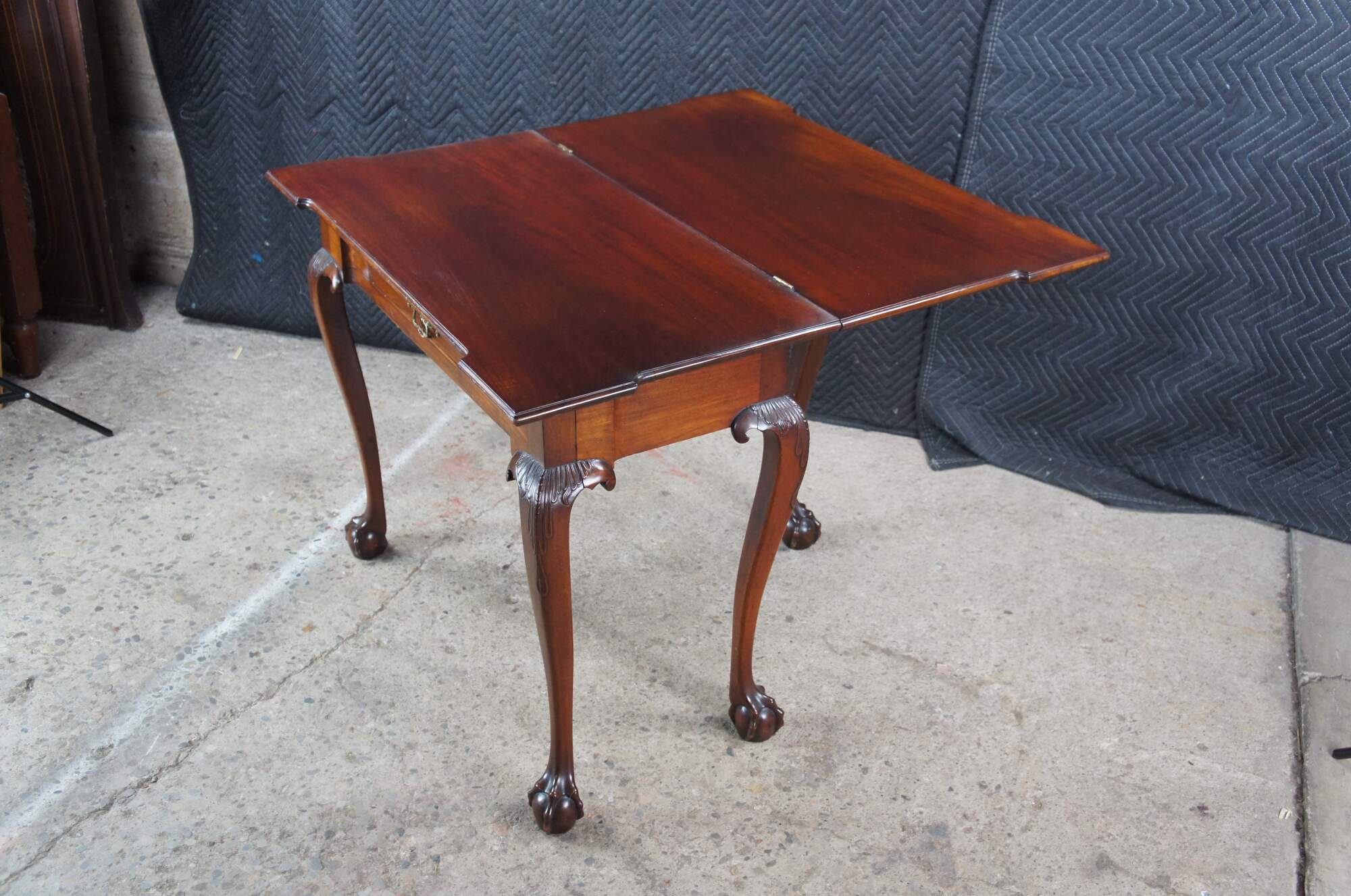 Mid 19th Century English George II Style Card / Game Table. Features a retangular form with recessed centers over a hand dovetailed frieze drawer with ornate scaled brass bale pull. The table is supported by long cabriole legs with carved knees terminating into ball and claw feet. The left rear legs swivels back to support the table when in the extended position. Perfect for use in an entry or library setting.