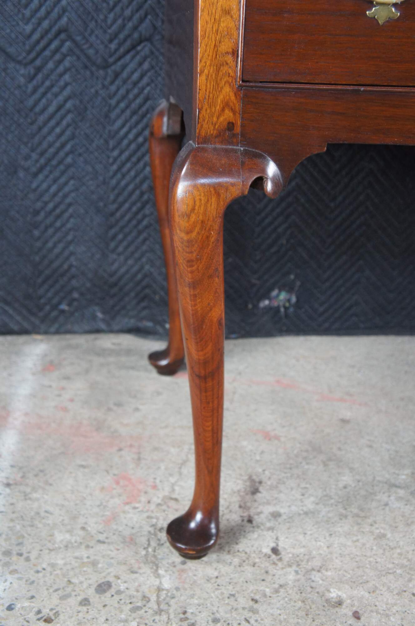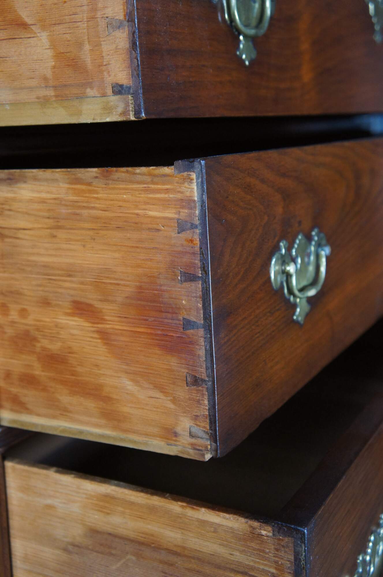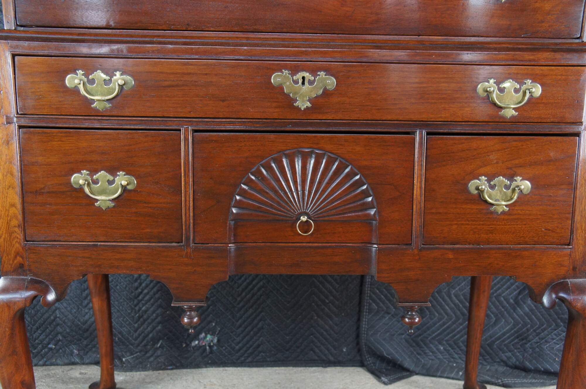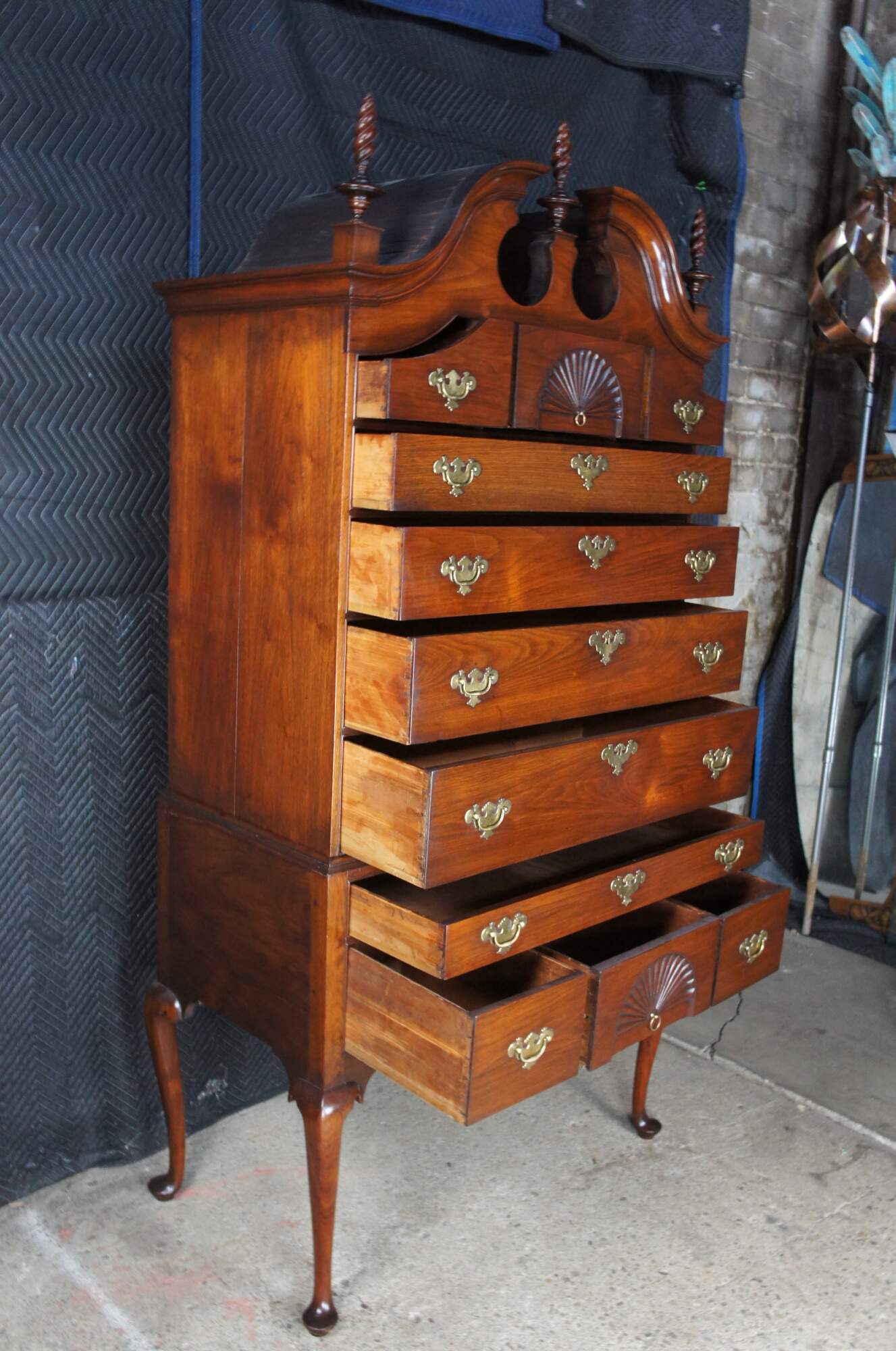 Mid 18th Century American Queen Anne Bonnet Top Boston Highboy. Features a cherry case with molded swans neck pediment centering flame finials above a case with three short drawers, the center showcasing fan carving over four graduated drawers. The lower part of the case has mid molding above a long slender drawer above three more short drawers with the centermost being fan carved. The lower apron is shaped with two down finials set between long slender cabriole legs with pad feet. The case and drawers are constructed via mortise and tenon and dovetailed joinery. Drawers have solid brass batwing drawer plates with bale hardware and matching escutcheon plates.