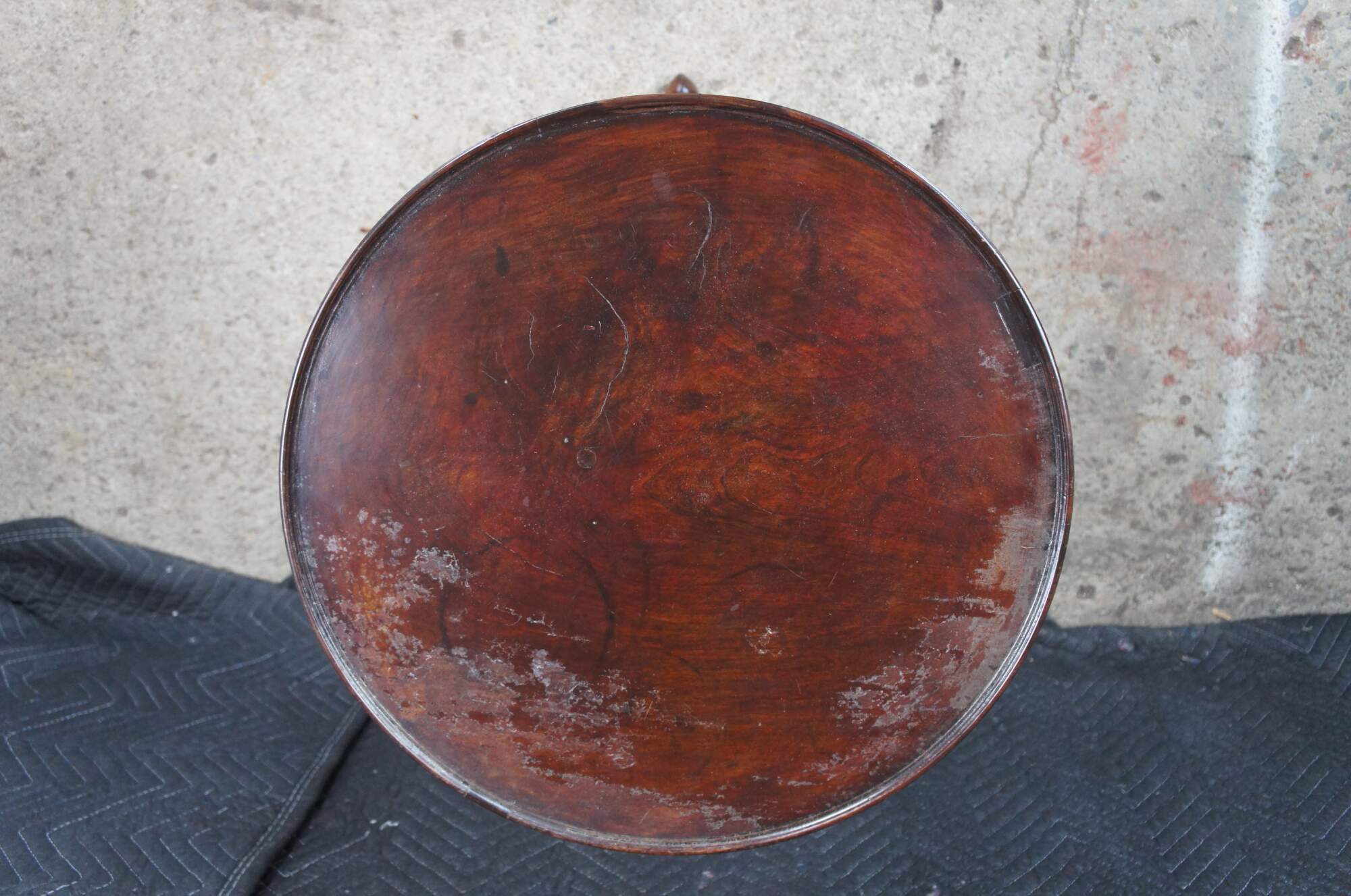 An American Queen Anne Tilt-Top Candletstand, tea or dessert table. Circa 1770. The table shows strong influences from Philadelphia. Features a finely turned dish top, birdcage, and suppressed ball turning. The base terminates in cabriole legs and pad feet.