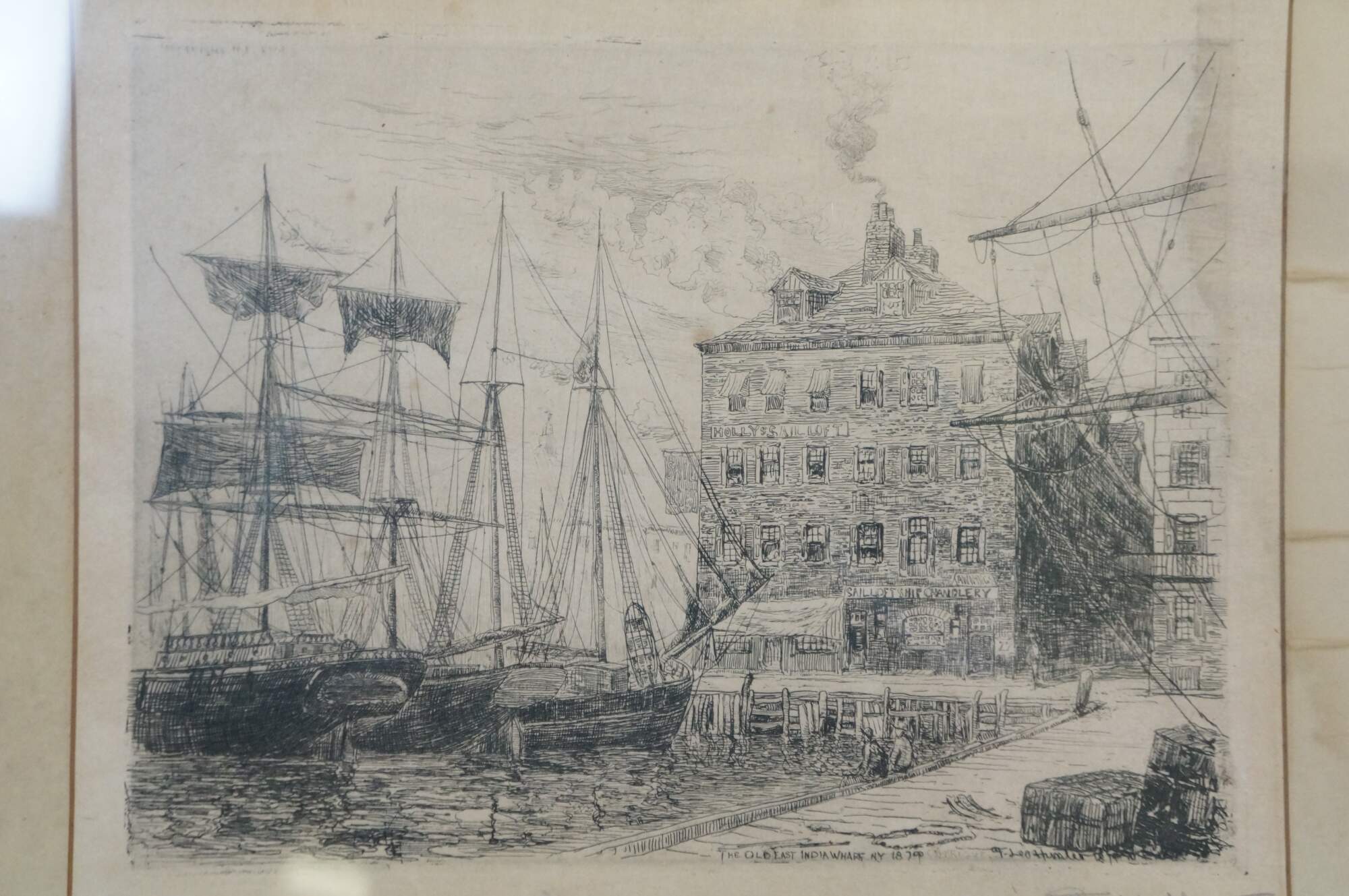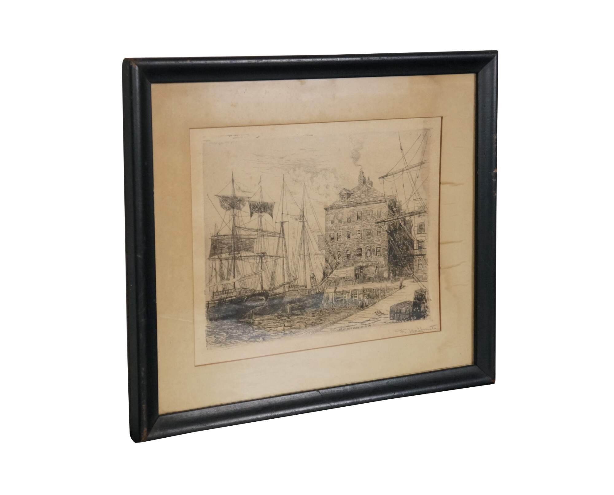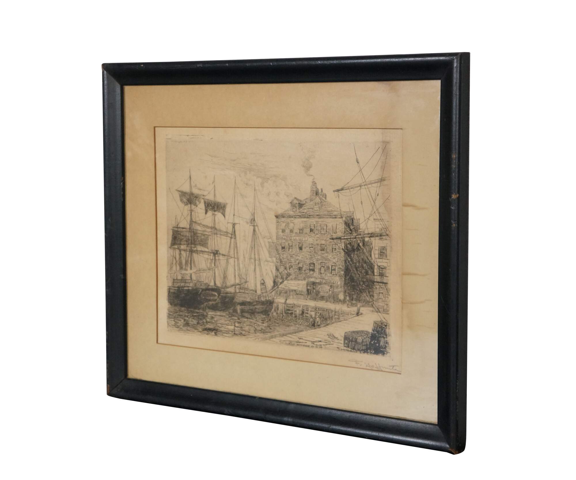 Late 19th century black and white etching titled "The Old East India Wharf, NY, 1879" by Frederick Leo Hunter. Dockside cityscape showing figures seated by boats in harbor. Signed and titled in plate. Pencil signed, lower right. Black beveled wood frame; white mat.