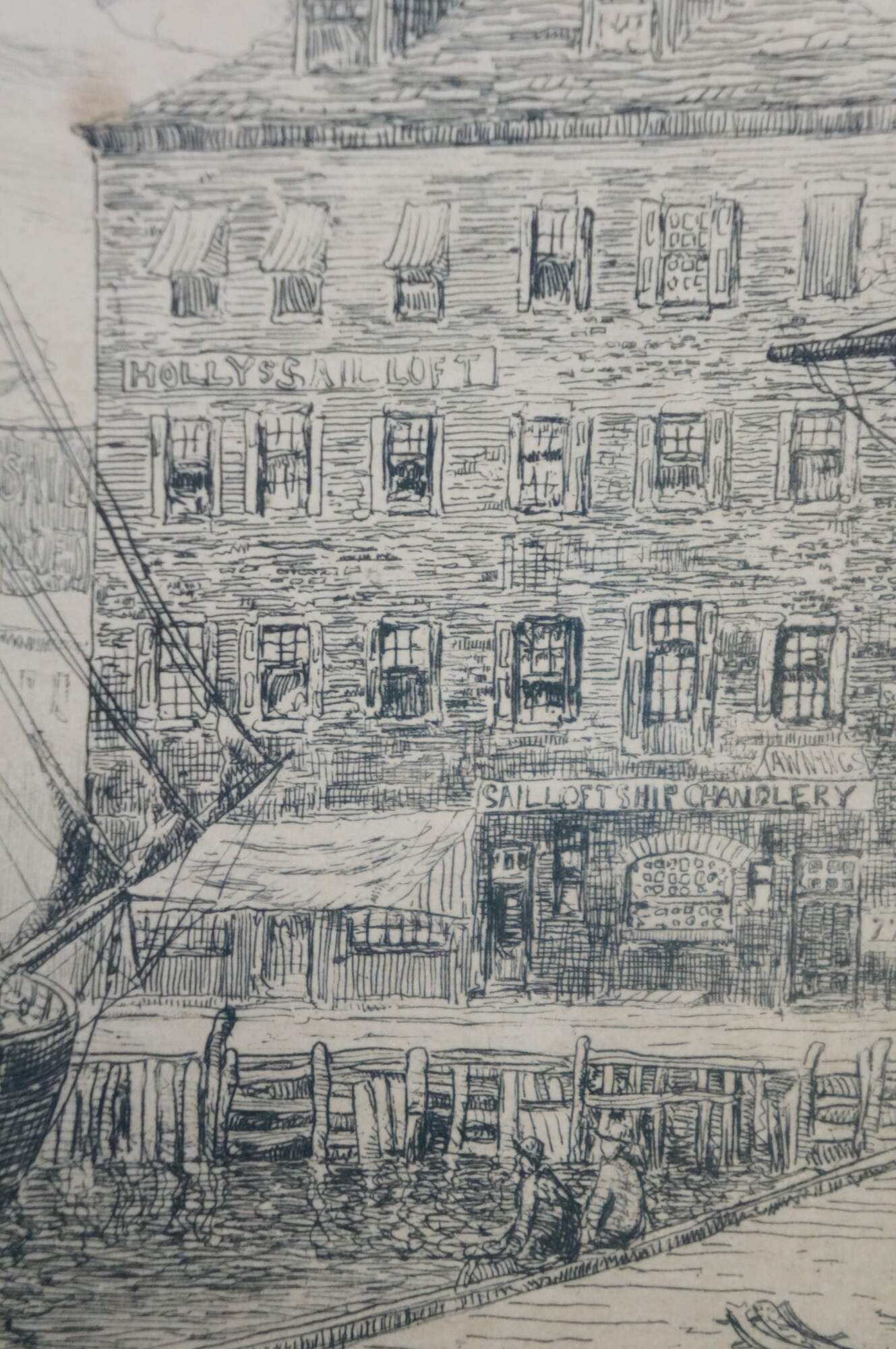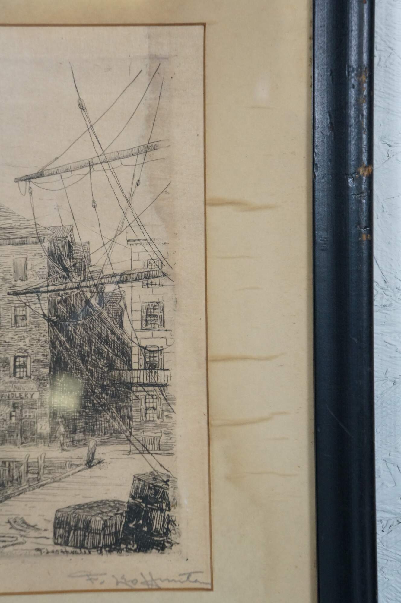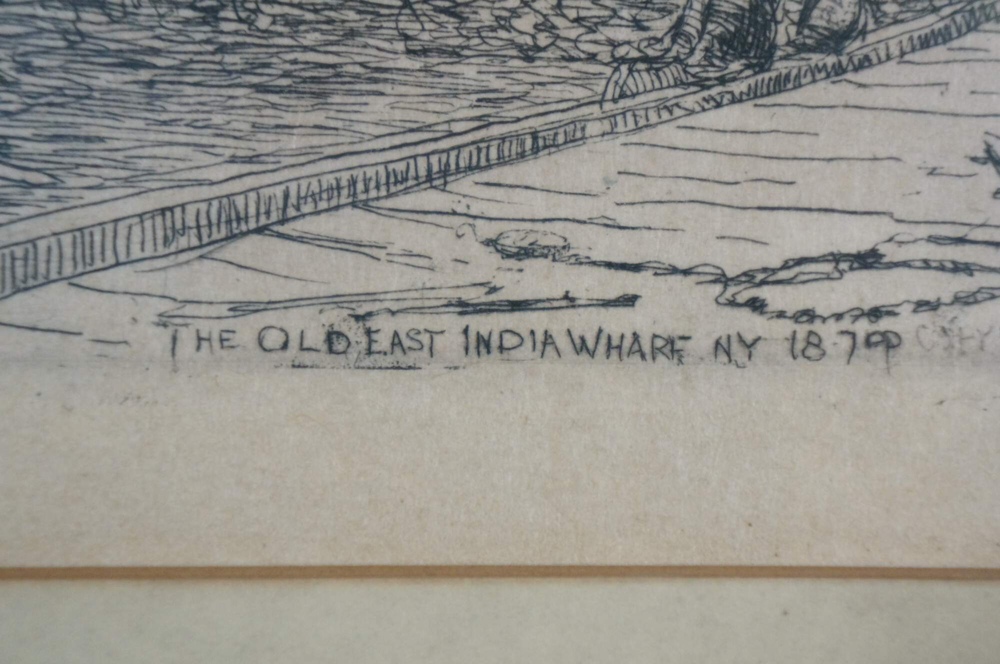Late 19th century black and white etching titled "The Old East India Wharf, NY, 1879" by Frederick Leo Hunter. Dockside cityscape showing figures seated by boats in harbor. Signed and titled in plate. Pencil signed, lower right. Black beveled wood frame; white mat.