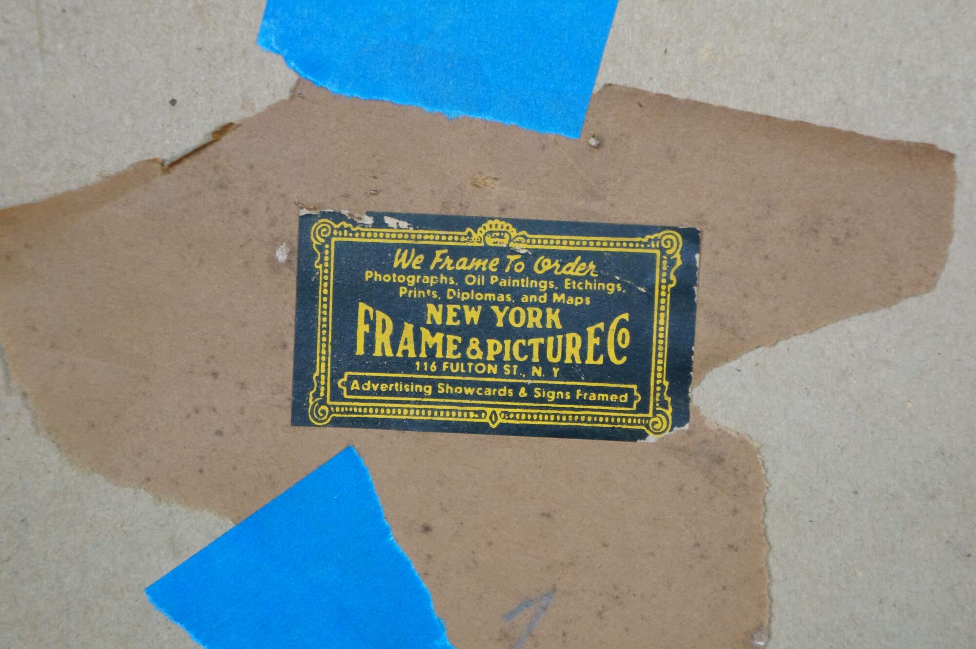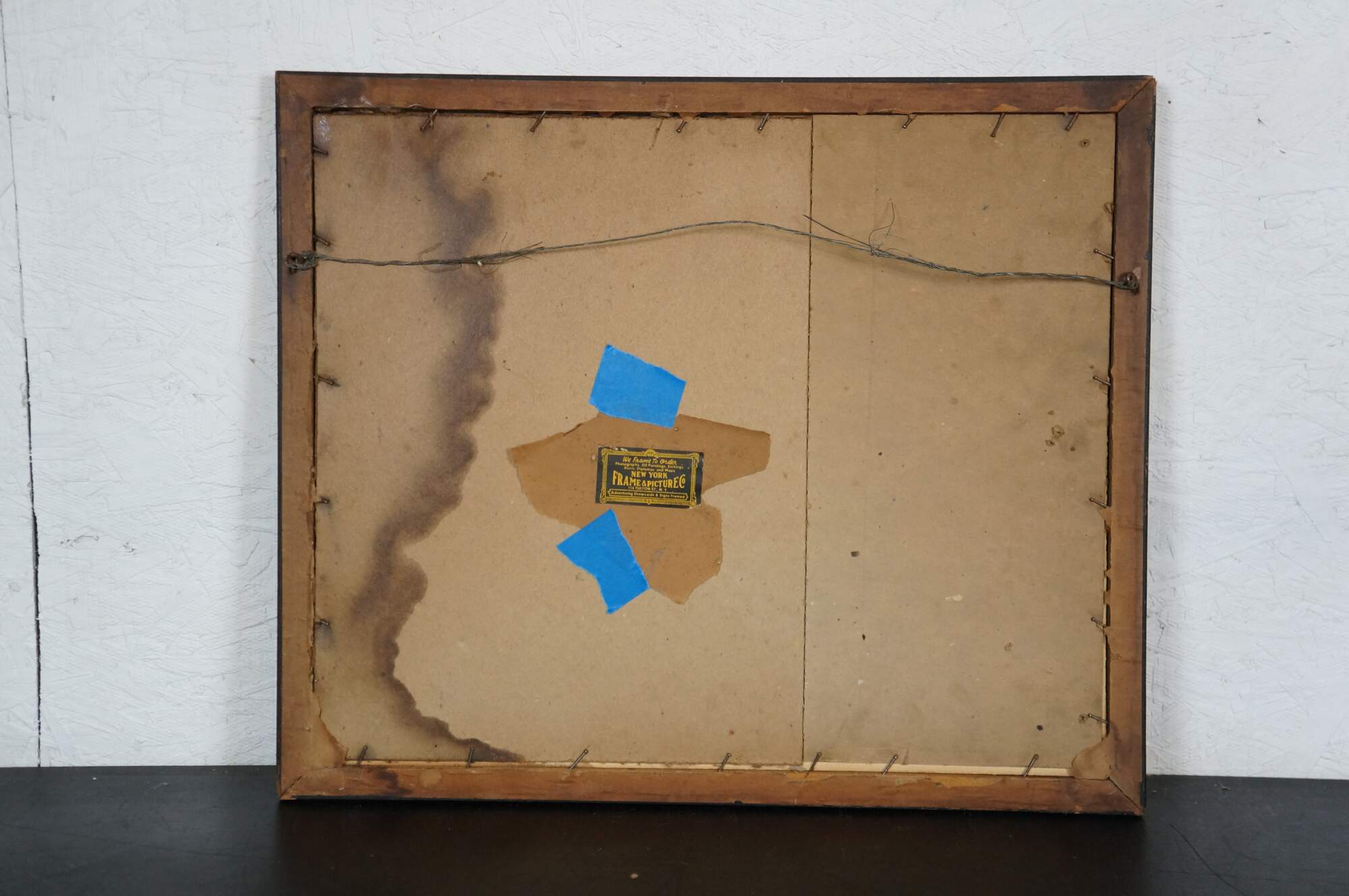 Wear and distressing from age, foxing / discoloration, scuffing, marking, finish loss to frame, water damage to right side of mat and etching