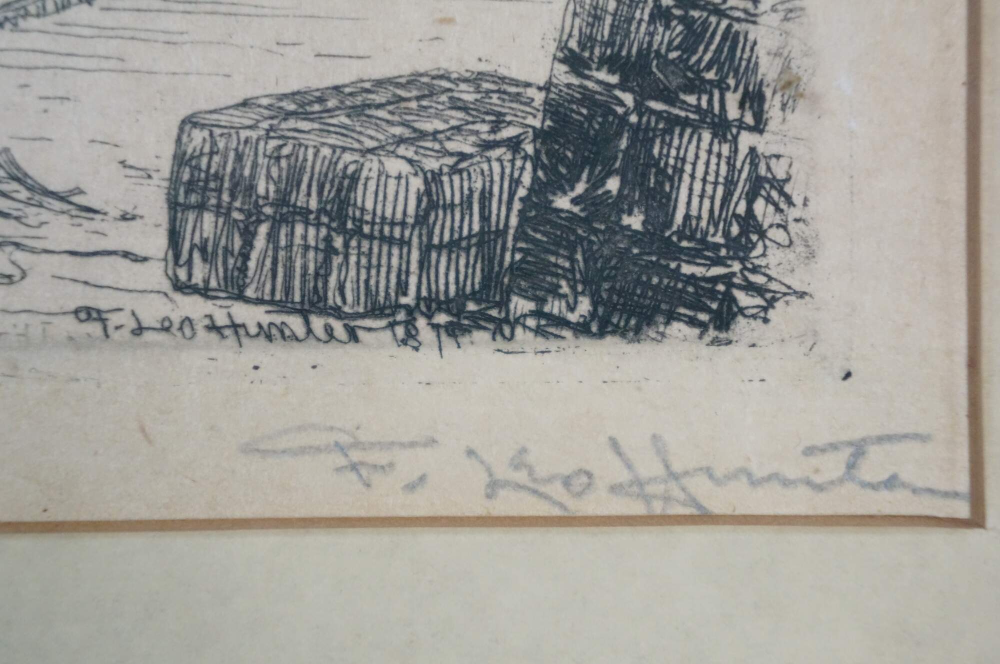 "Frederick Leo Hunter (1862-1943) The following represents the limited information that we have assembled so far on this artist. His date of birth is occasionally given as 1858; we have relied upon information from the New York Historical Society for the date of 1862. Exhibited at the New York Etching Club, 1888. Although Hunter was noted for his New York City images, he is reported, like most of the landscape artists of the period, to have traveled each summer (and obviously in winter too) searching for new subject matter in "exotic" locales in Canada and Europe. He is perhaps better known for his etchings, many of which have docks, quays and waterfront subjects with sailing vessels very prominently depicted. However, he produced a somewhat extensive repertoire of oil paintings, including ships portraits - some historical views on Long Island Sound-and pastural scenes. Frederick Hunter lived at Ossining, Cold Spring on Hudson, New York. Exhibition venues included the National Academy of Design, 1881-86; Brooklyn Art Association, 1881-86; and the Pennsylvania Academy of the Fine Arts, 1881-82, 1884. Source/Submitted by: Stillwell House Fine Art & Antiques" (askART)