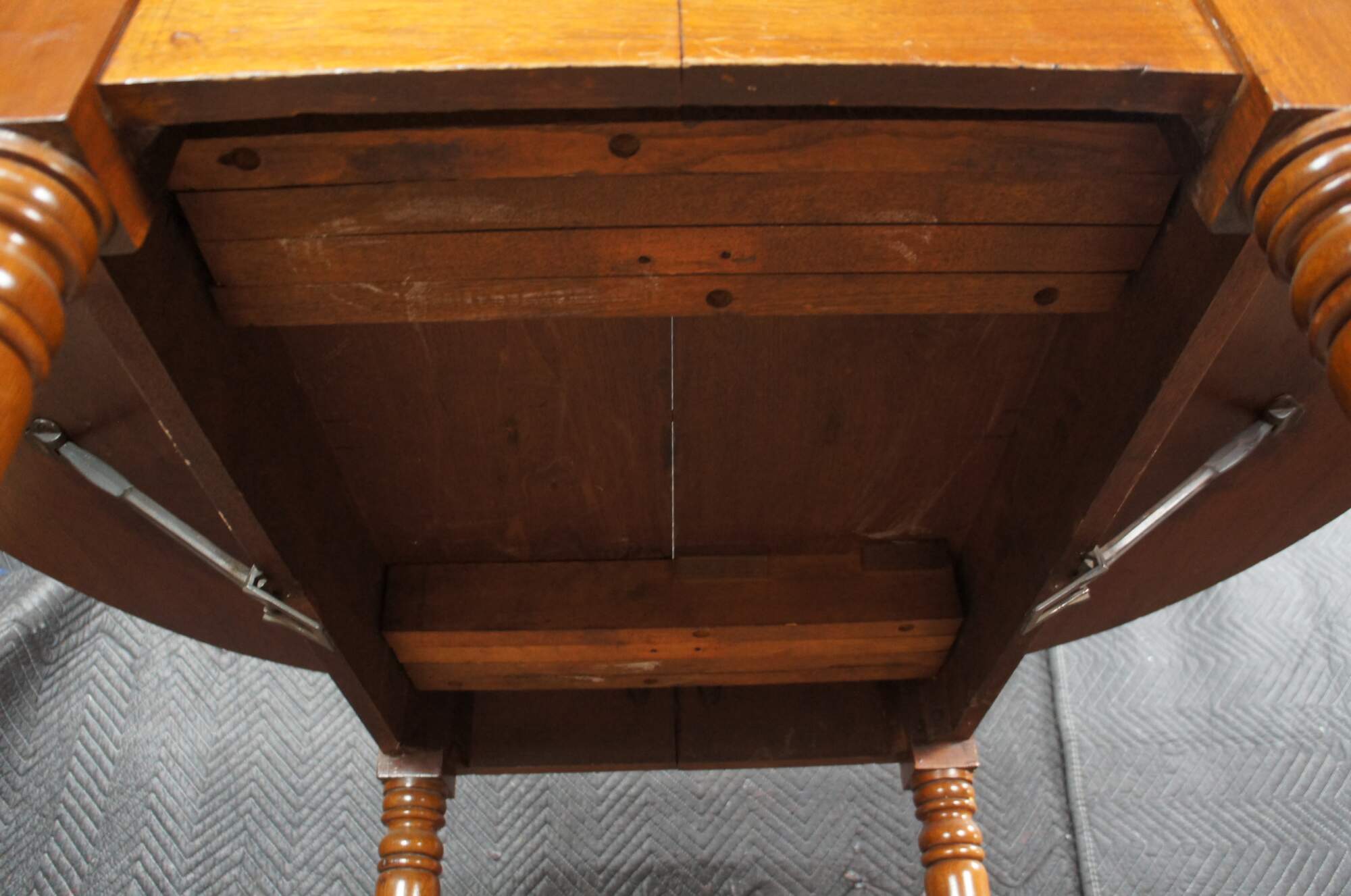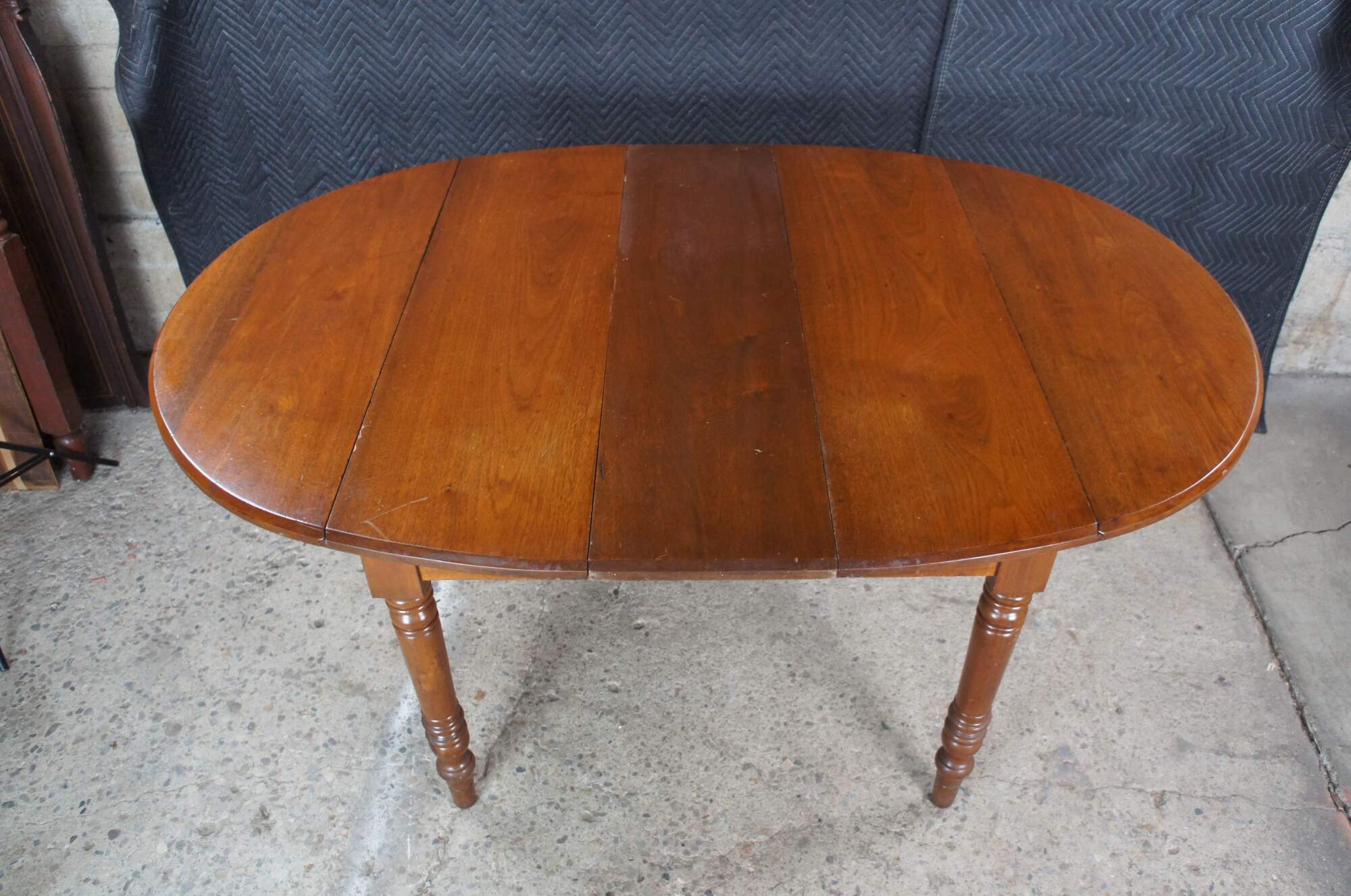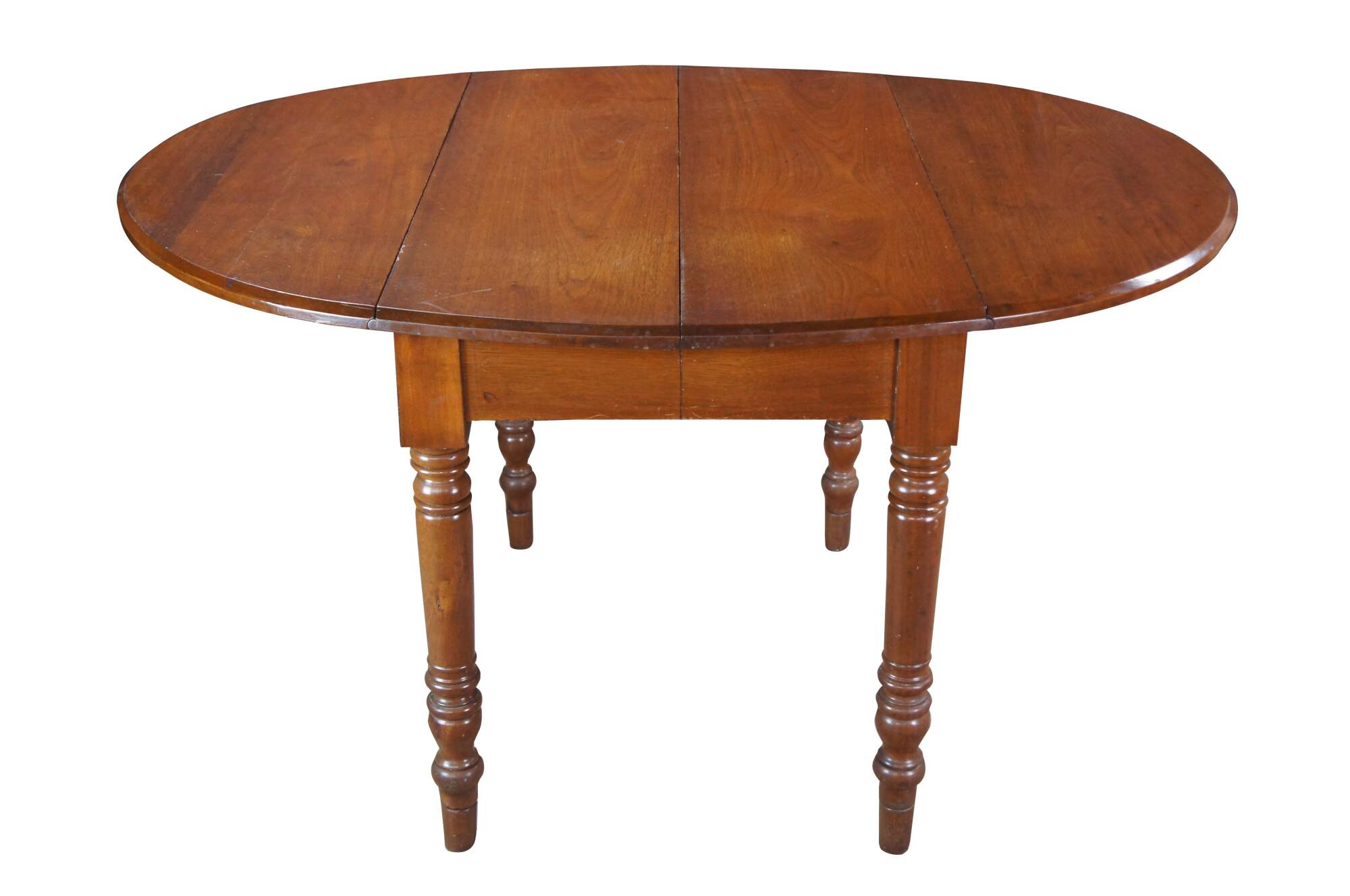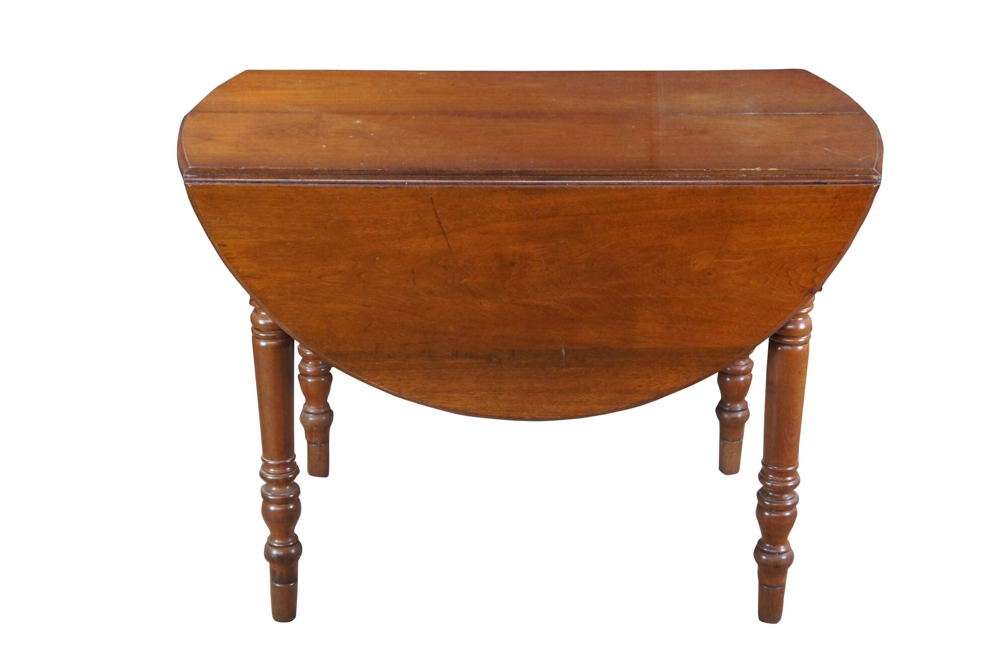 Late 19th Century drop leaf extendable breakfast or dining table. Made from American mahogany with ring turned legs leading to arrow feet. Includes one extendable leaf. The table is oval once the leafs are up.