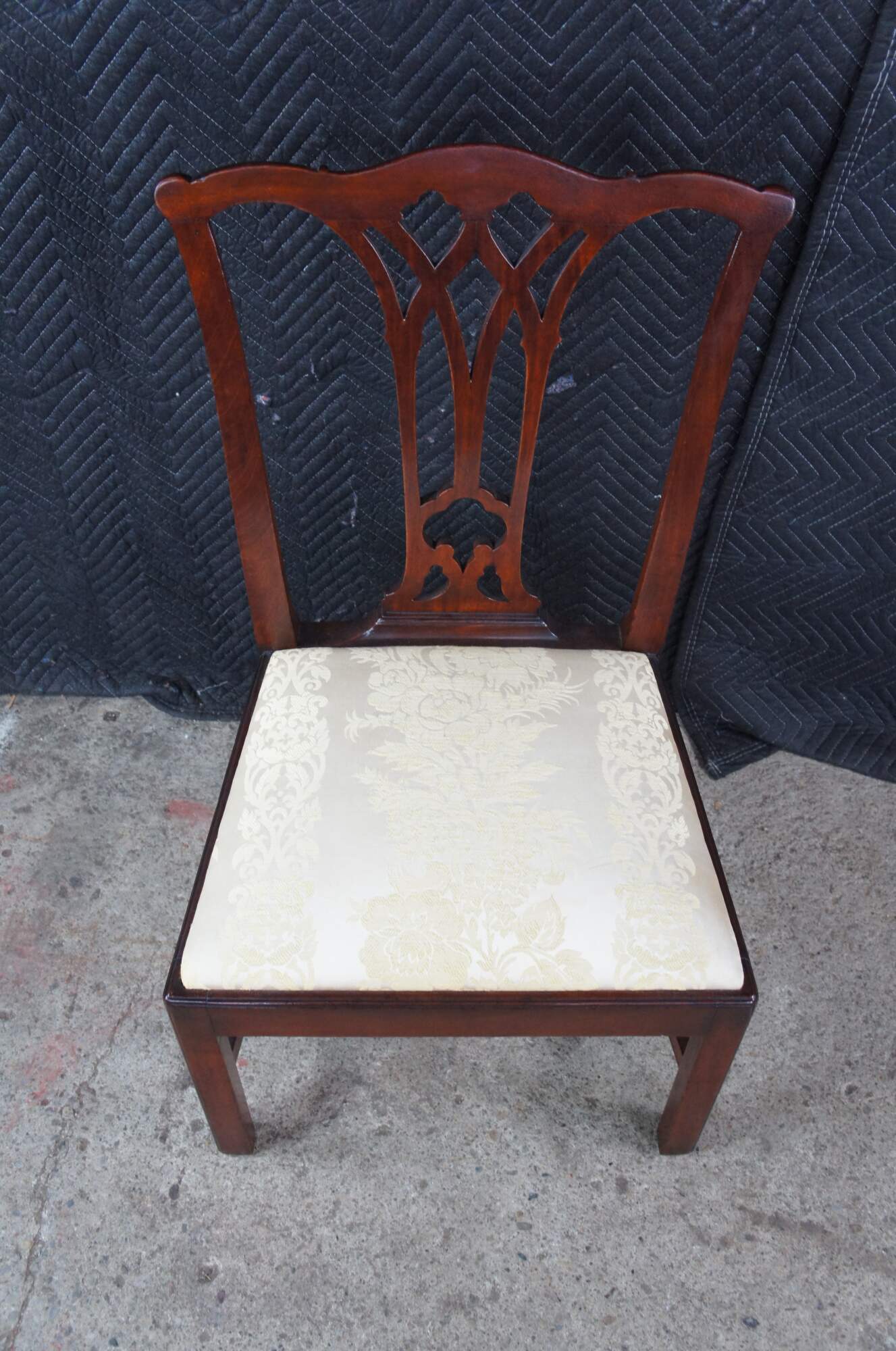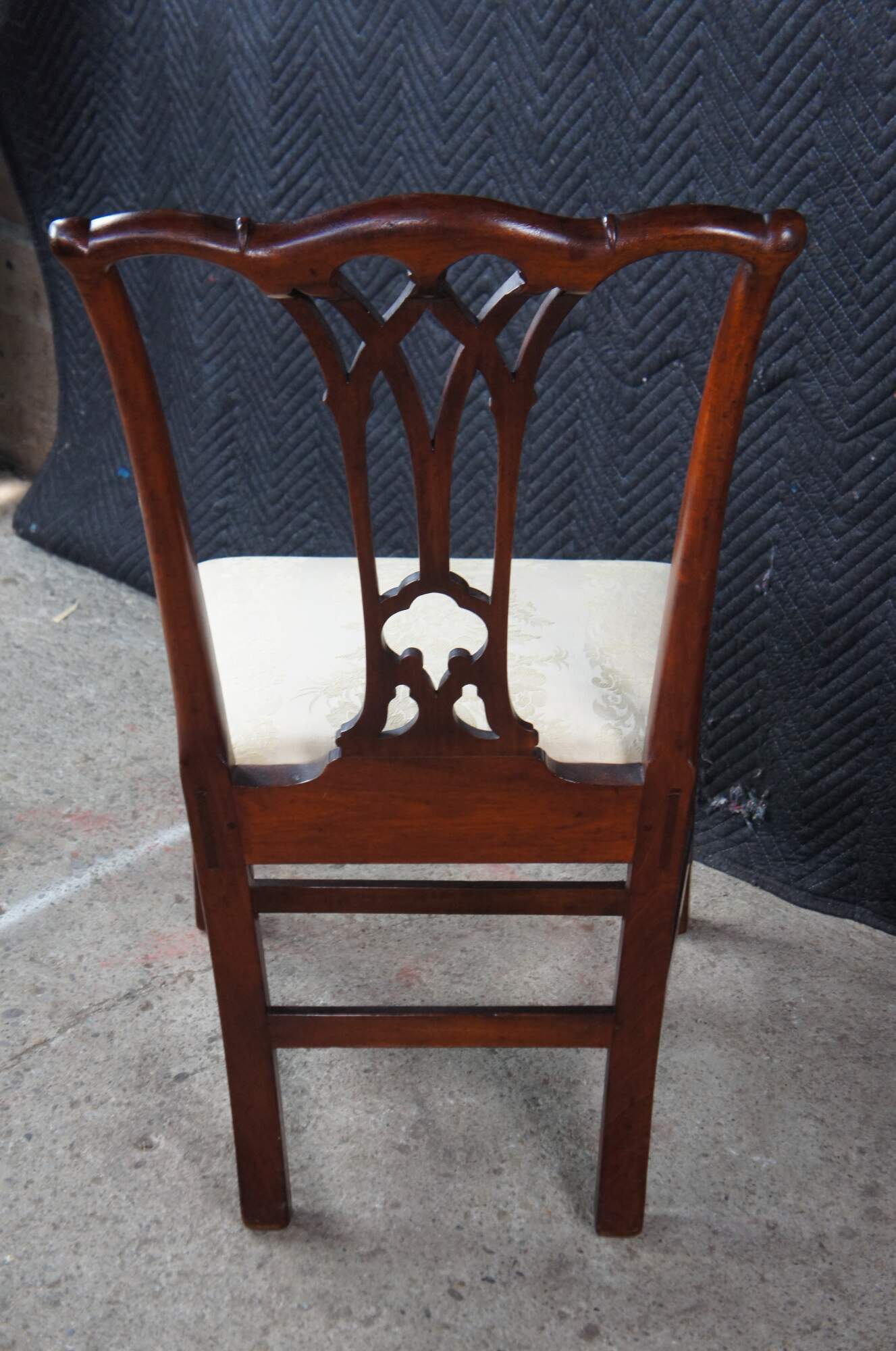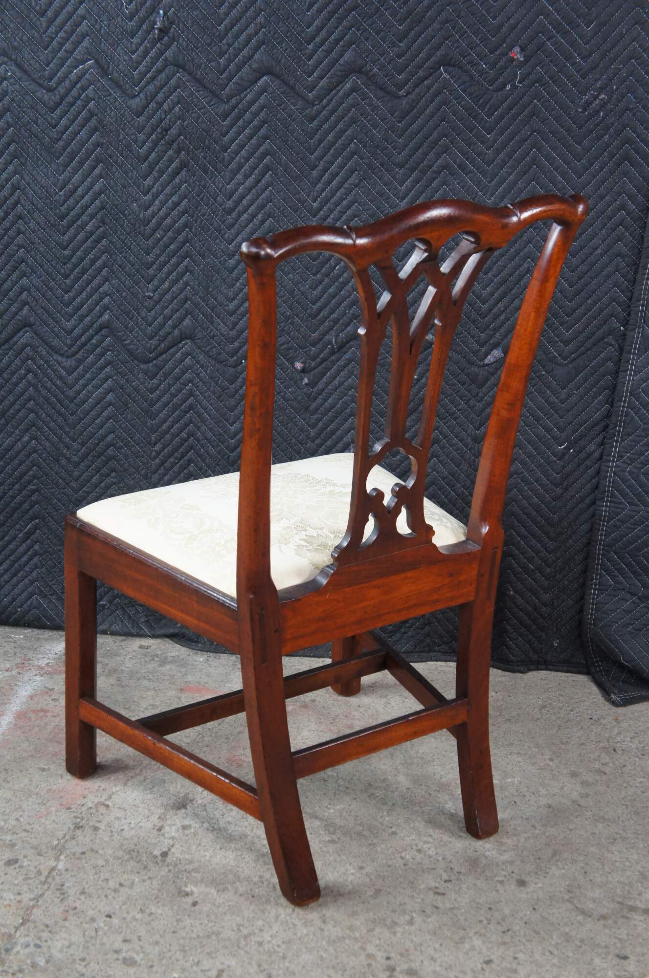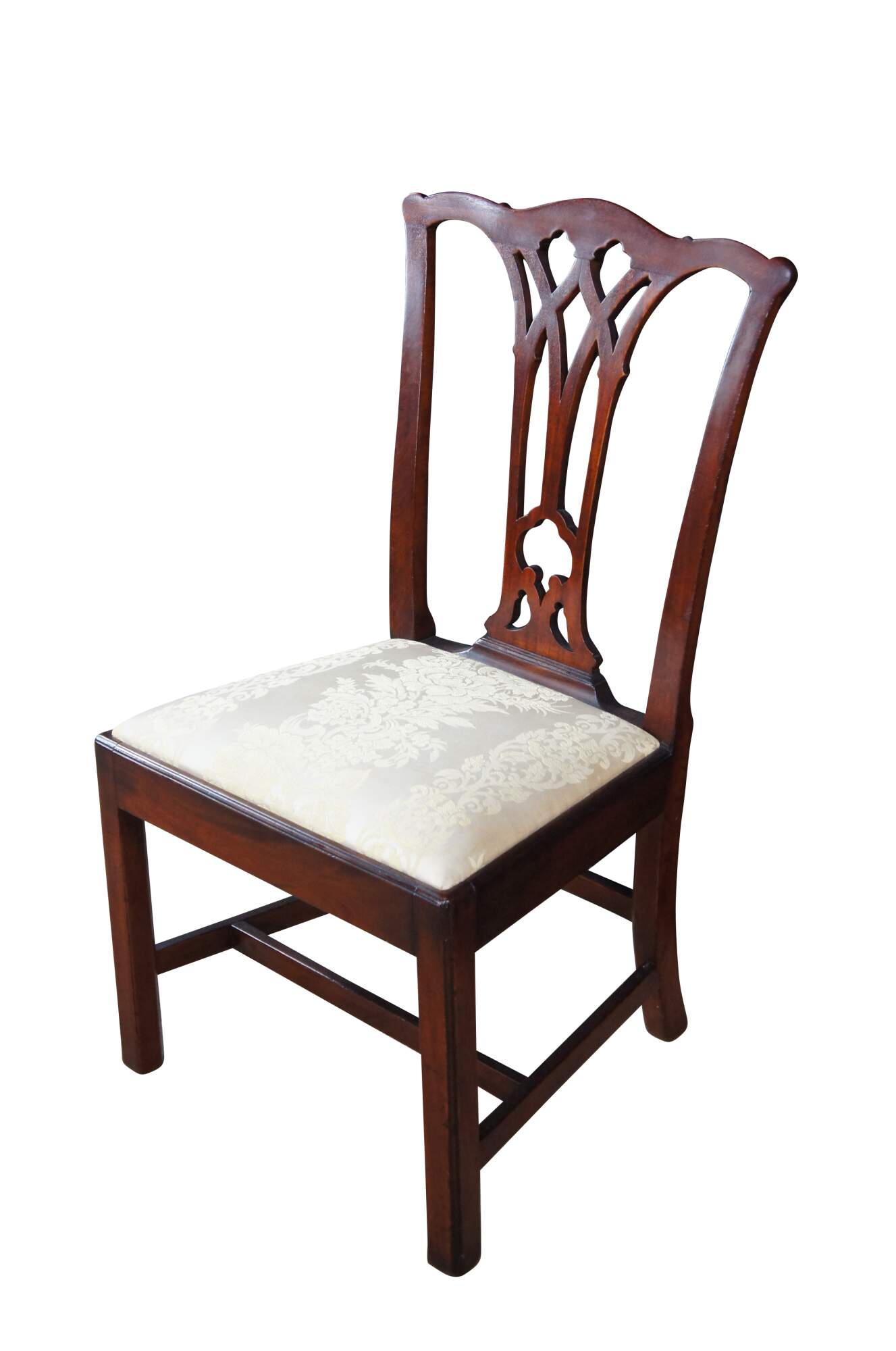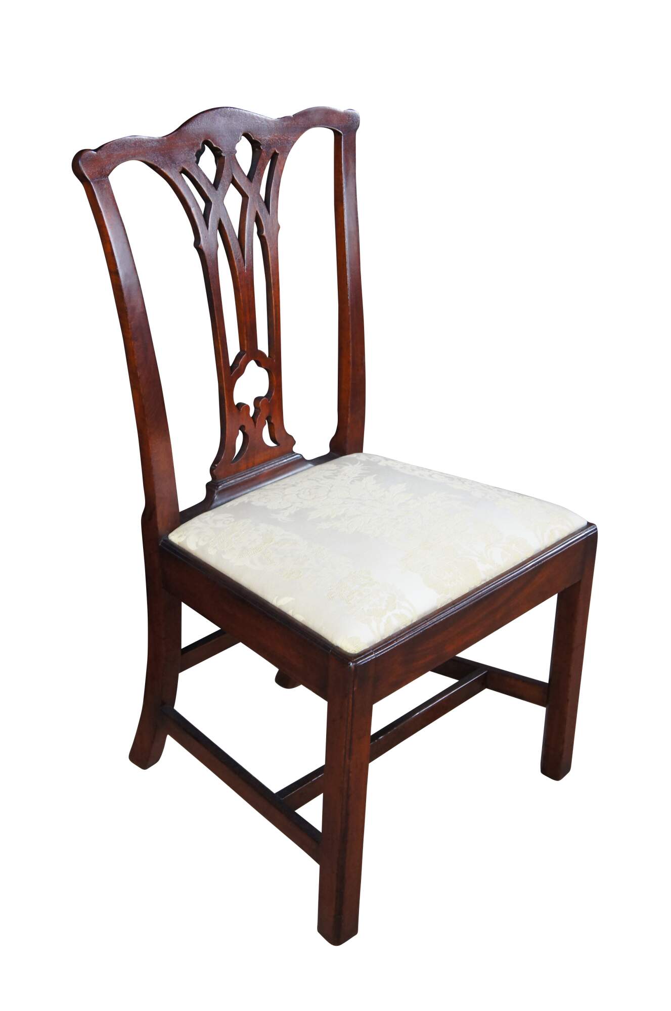 American Chippendale side chair, Pennsylvania, late 18th C. Made from mahogany with shaped crest with arch, rounded ears, vertical splat pierced in Gothic manner, typical Pennsylvania construction with through tenons and quarter-round quarter blocks, molded-edge seat rails, slip seat and straight legs. Upholstery is a floral brocade.