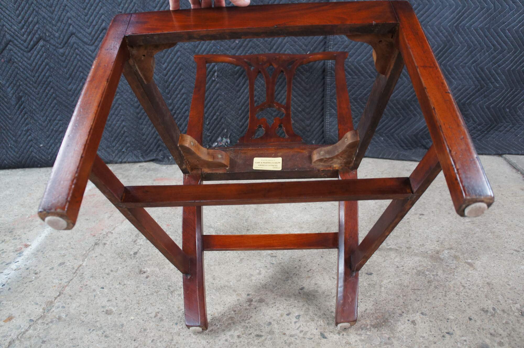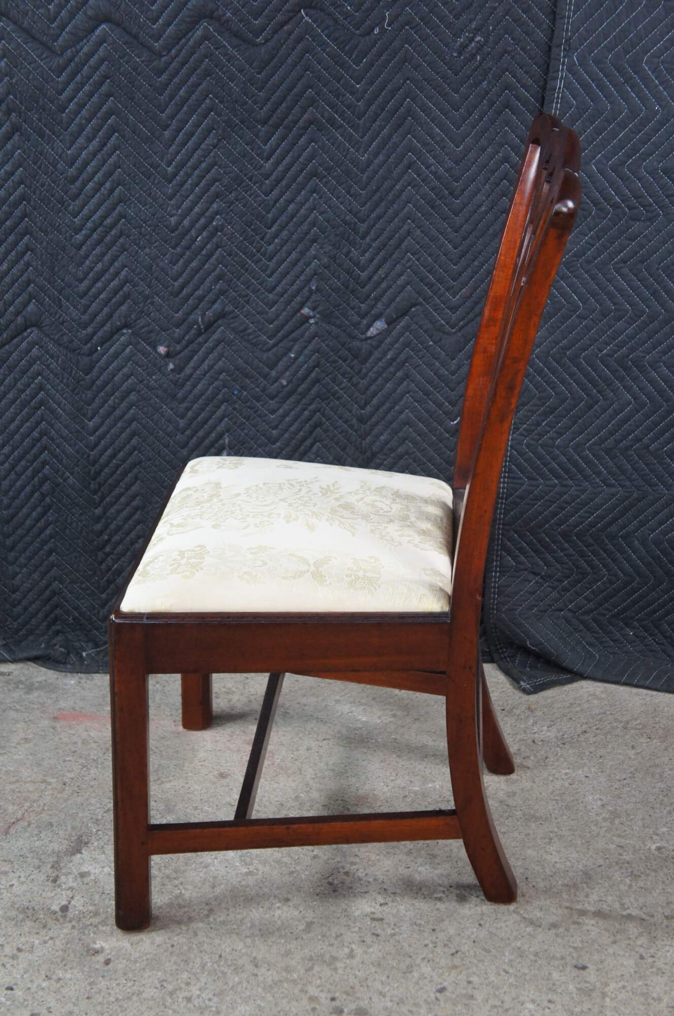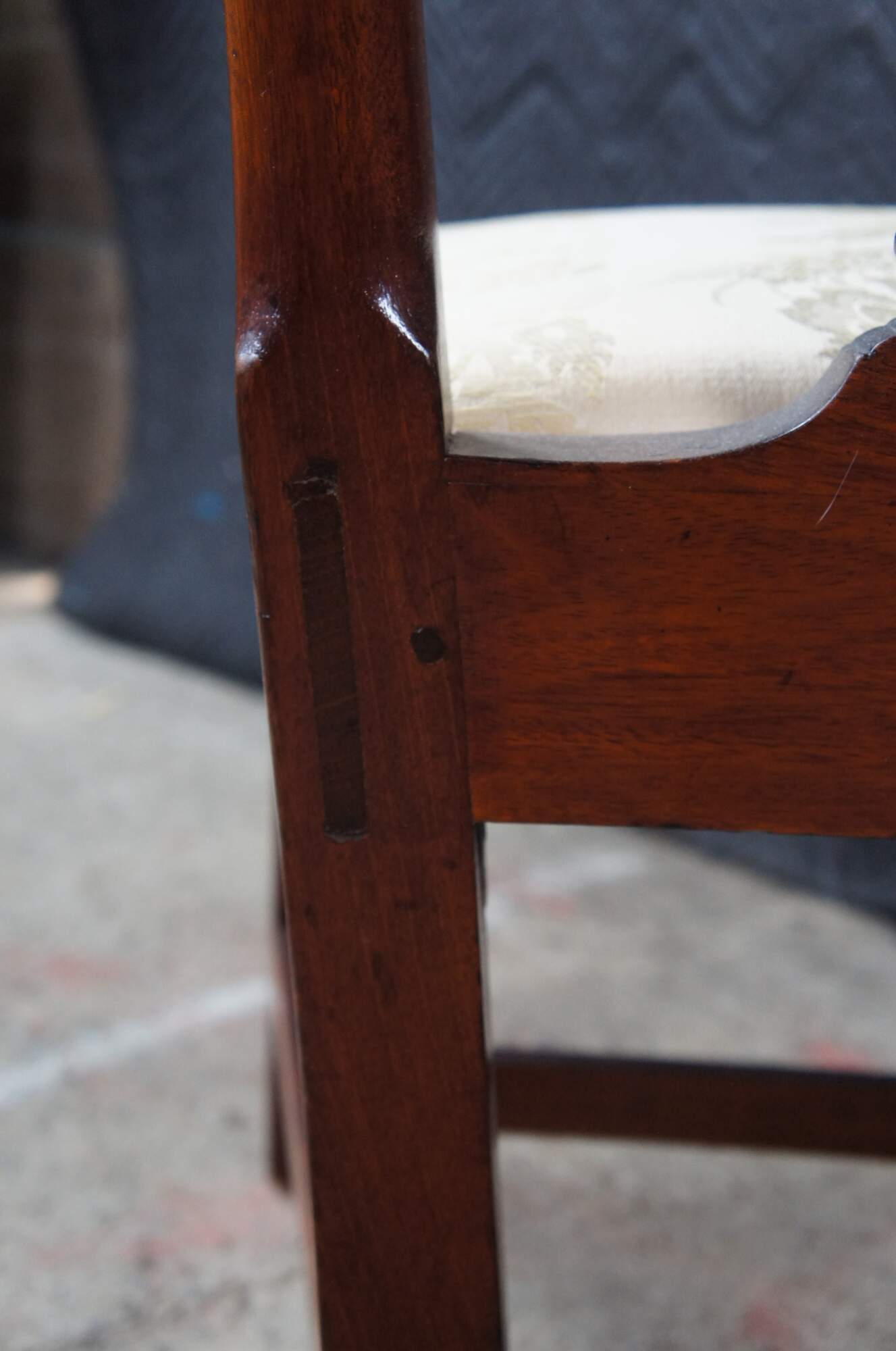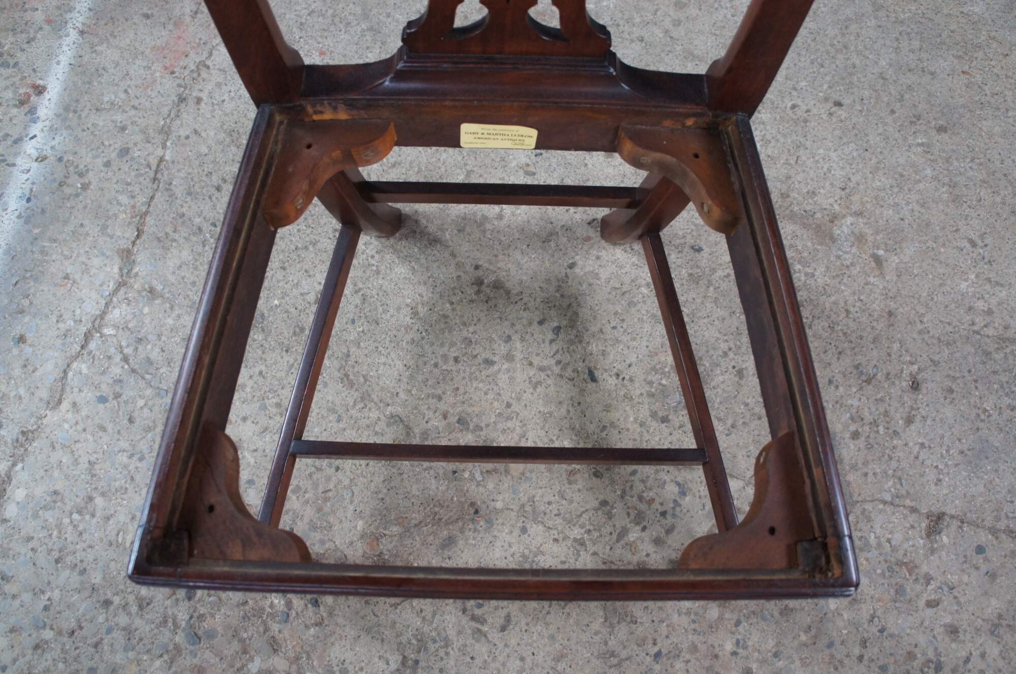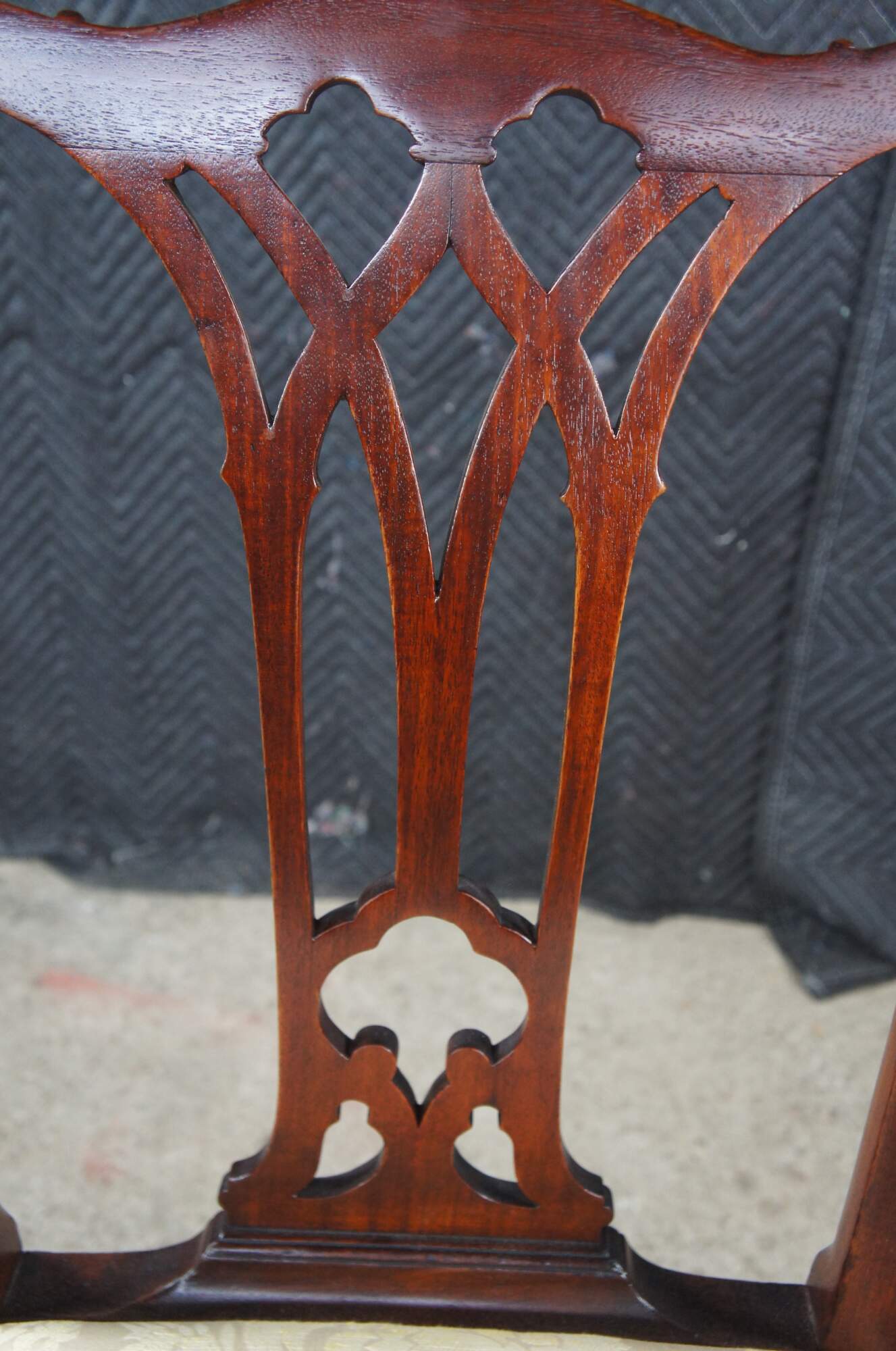 American Chippendale side chair, Pennsylvania, late 18th C. Made from mahogany with shaped crest with arch, rounded ears, vertical splat pierced in Gothic manner, typical Pennsylvania construction with through tenons and quarter-round quarter blocks, molded-edge seat rails, slip seat and straight legs. Upholstery is a floral brocade.