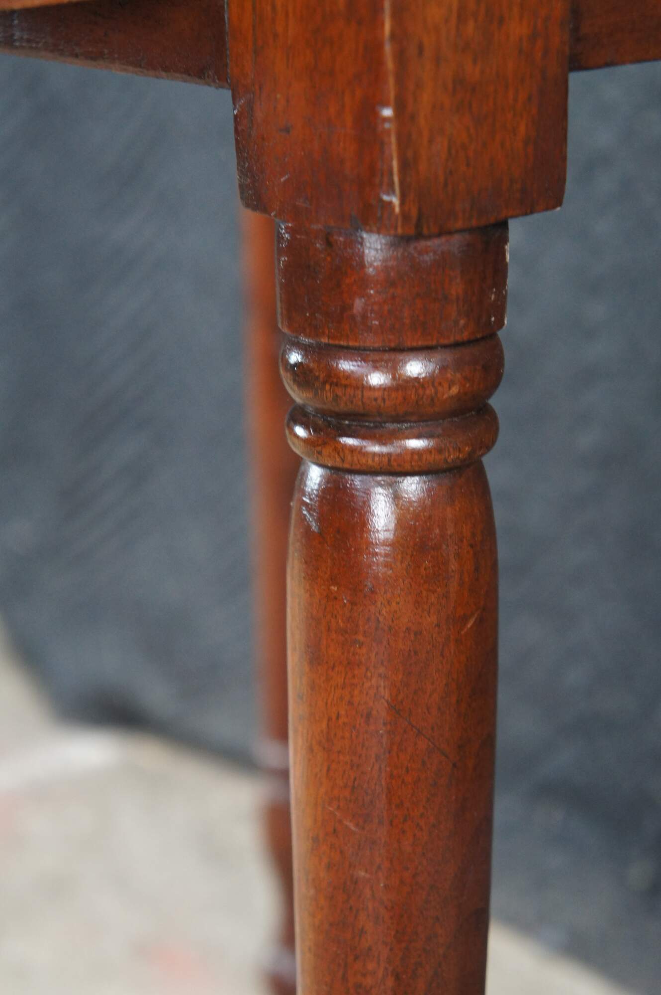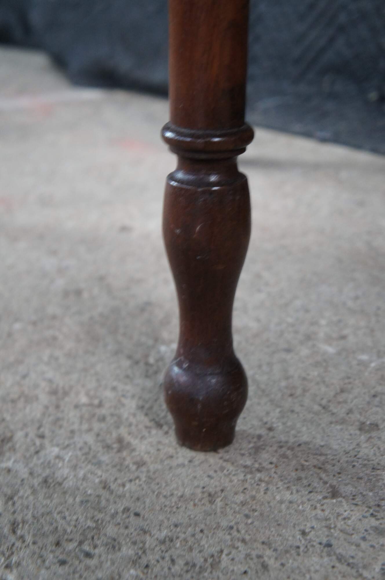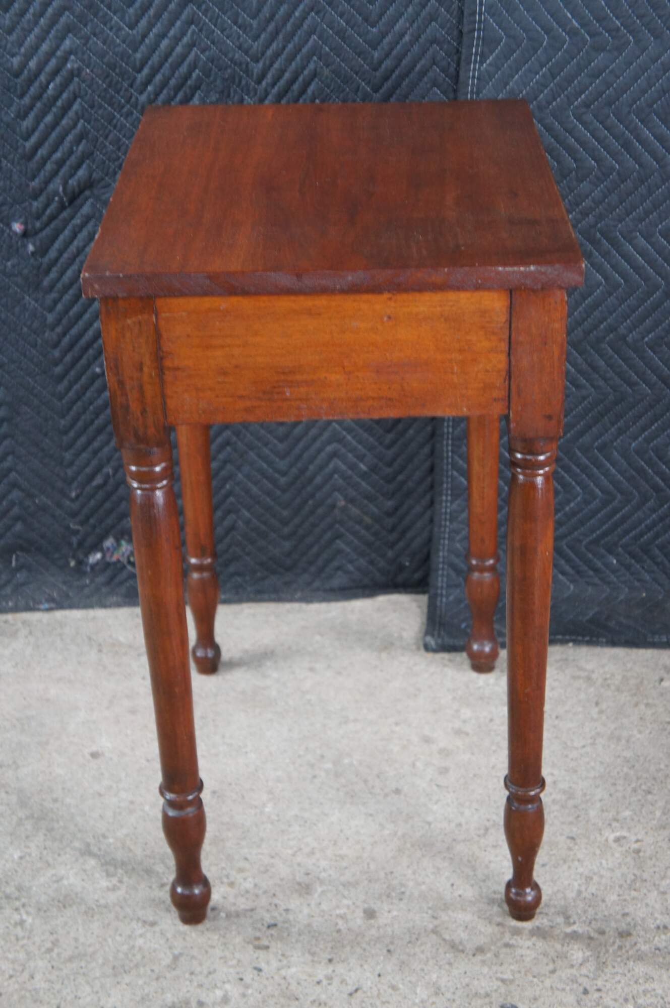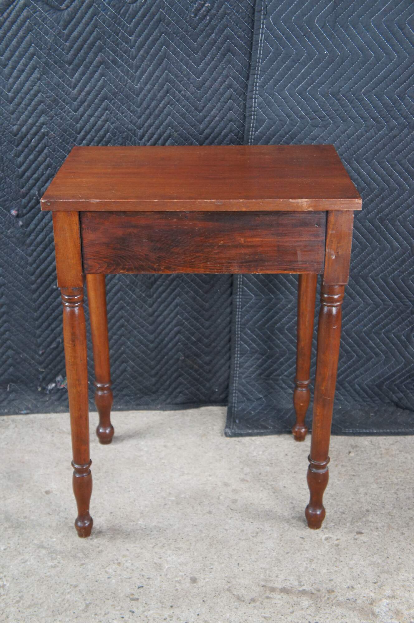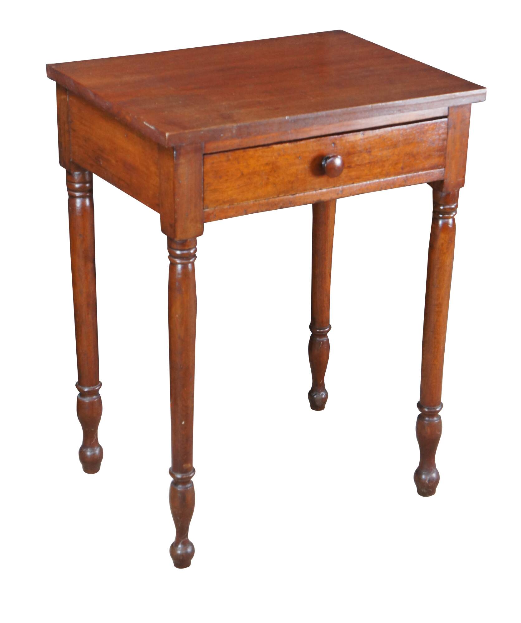 A beautiful antique early American mid 19th century walnut side table. Features a rectangular form with hand dovetailed drawer with turned wooden knob. The table is supported by four slender turned and ribbed legs leading to turnip feet. Underside of drawer is hand planed.