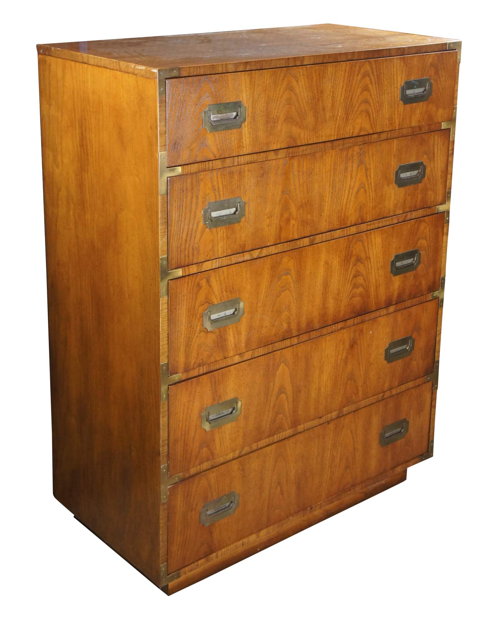 Circa 1975 Dixie Campaigner tallboy chest of drawers or dresser. Drawing inspiration from British Colonial Campaign Styling. Made of walnut with, five dovetailed drawers with recessed handles and applied brass accents. 767-307