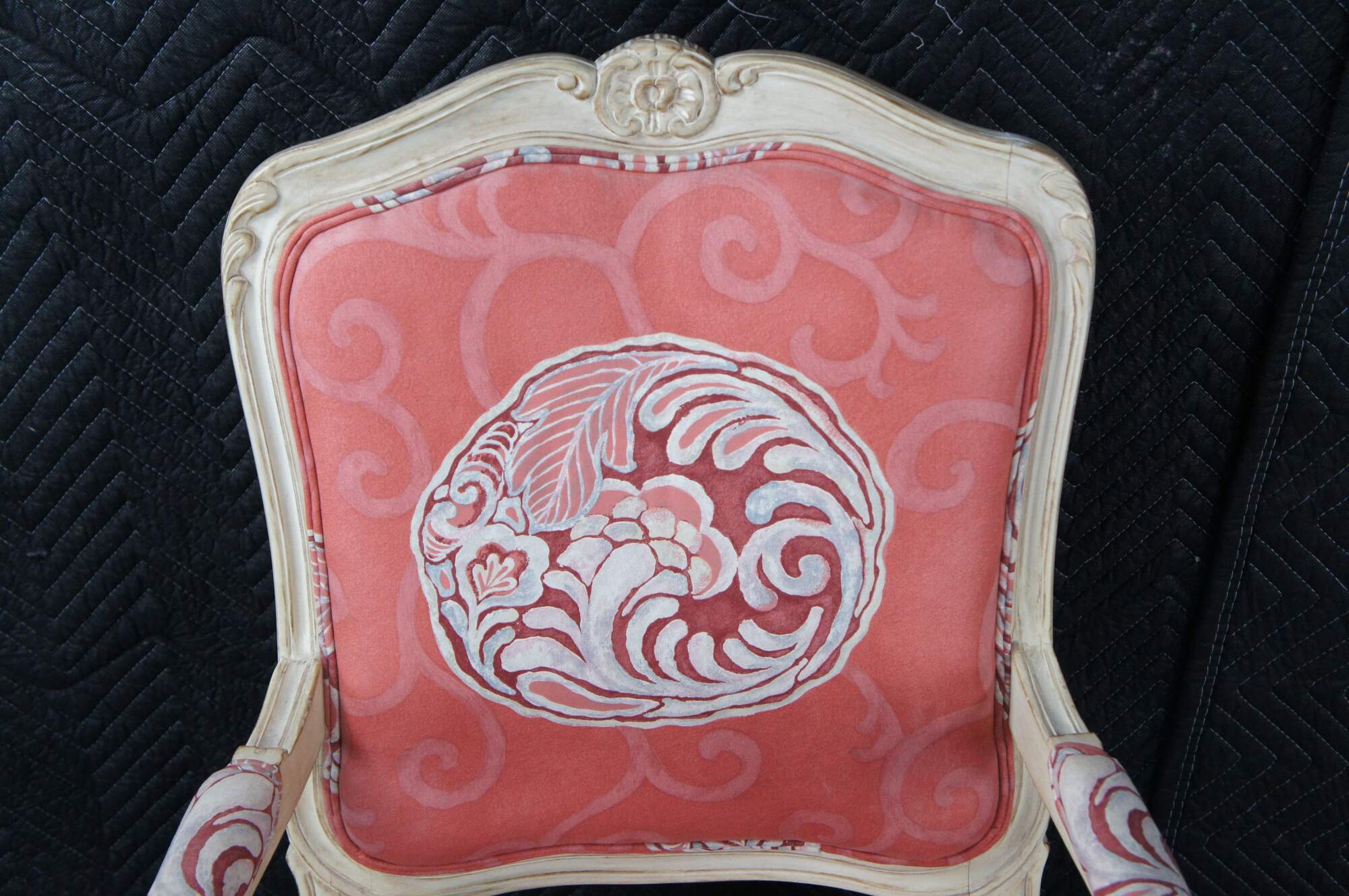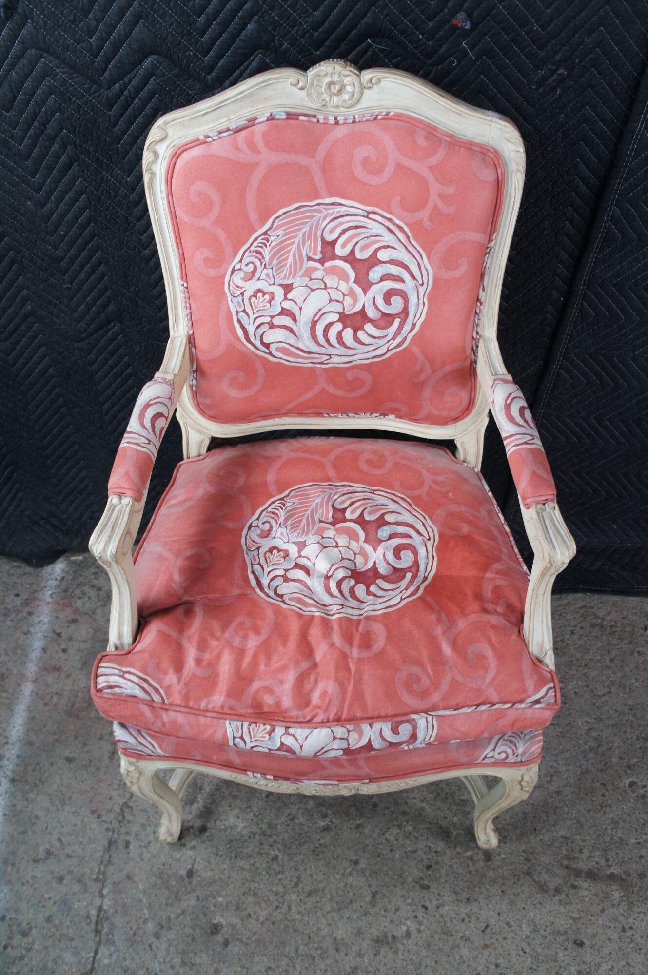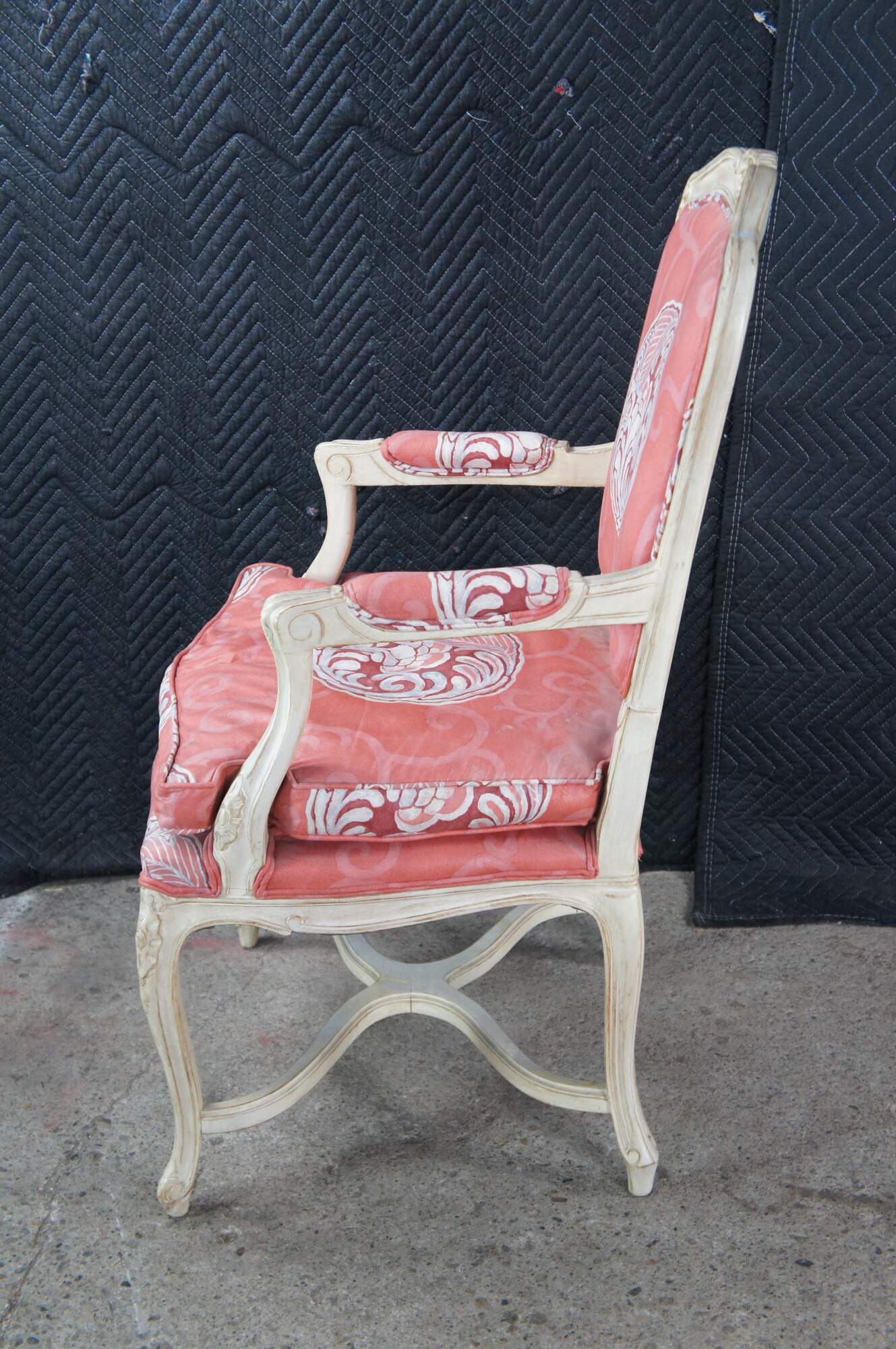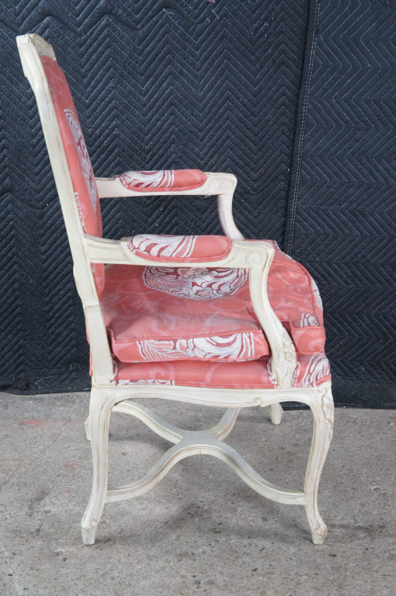 Vintage French Provincial Arm Chair, circa 1970s. Features a hardwood frame with floral medallions and chinoiserie fabric. The chair is supported by cabriole legs connected by an x-form stretcher. Seat cushion is fixed.