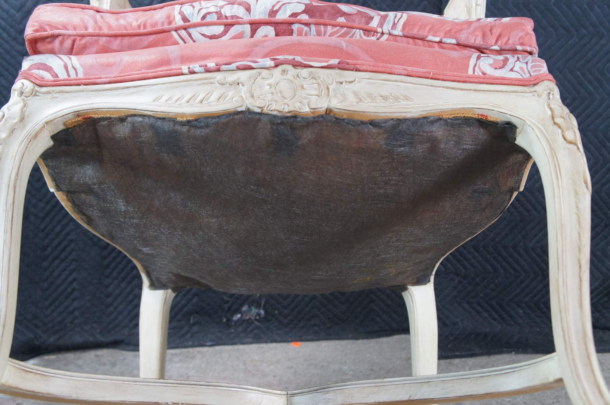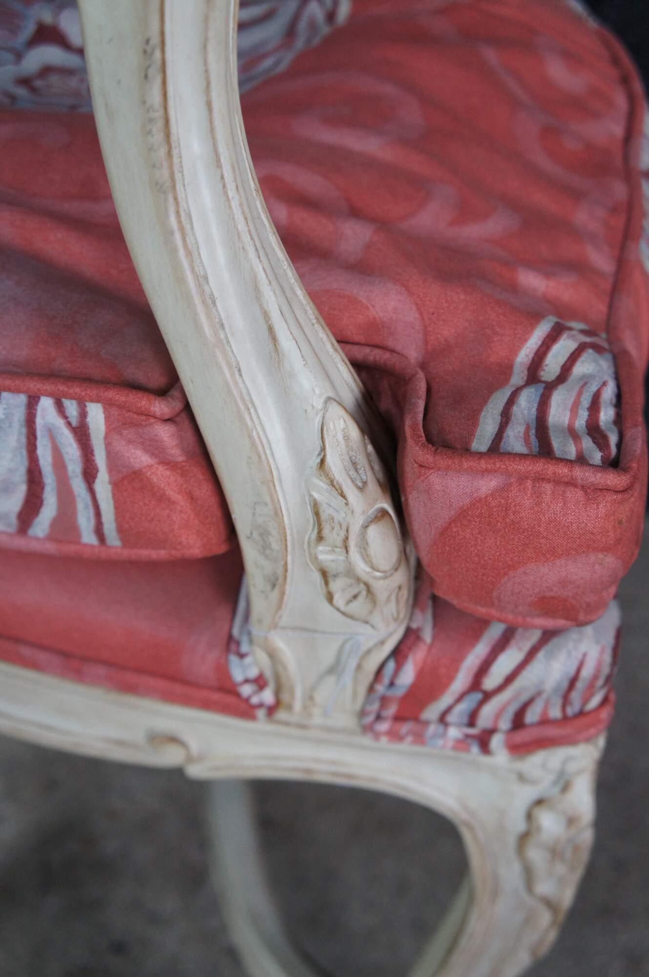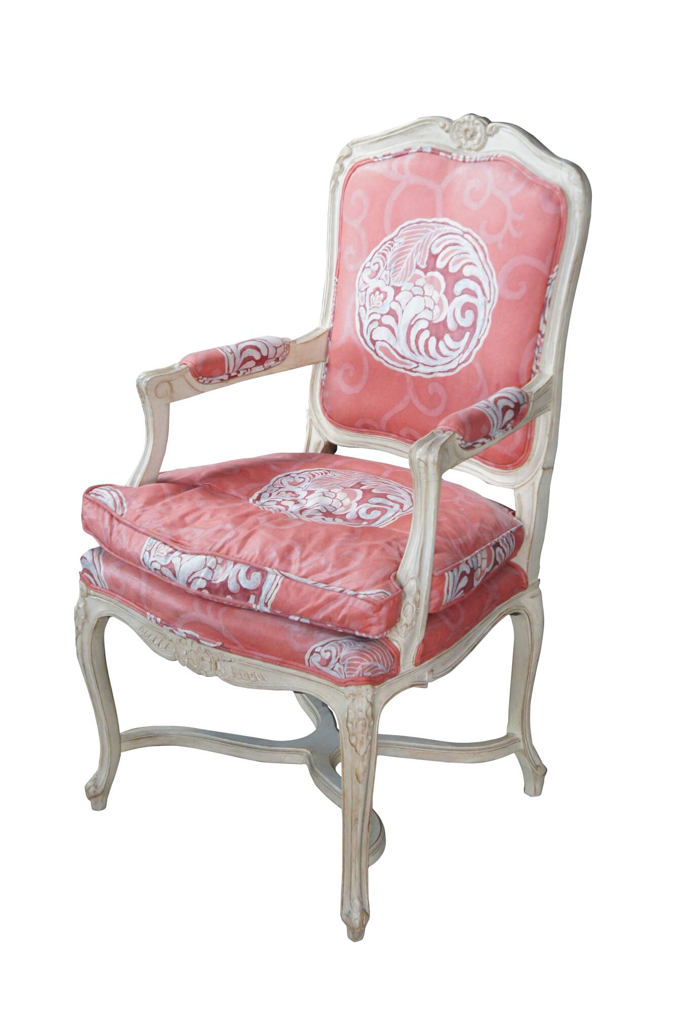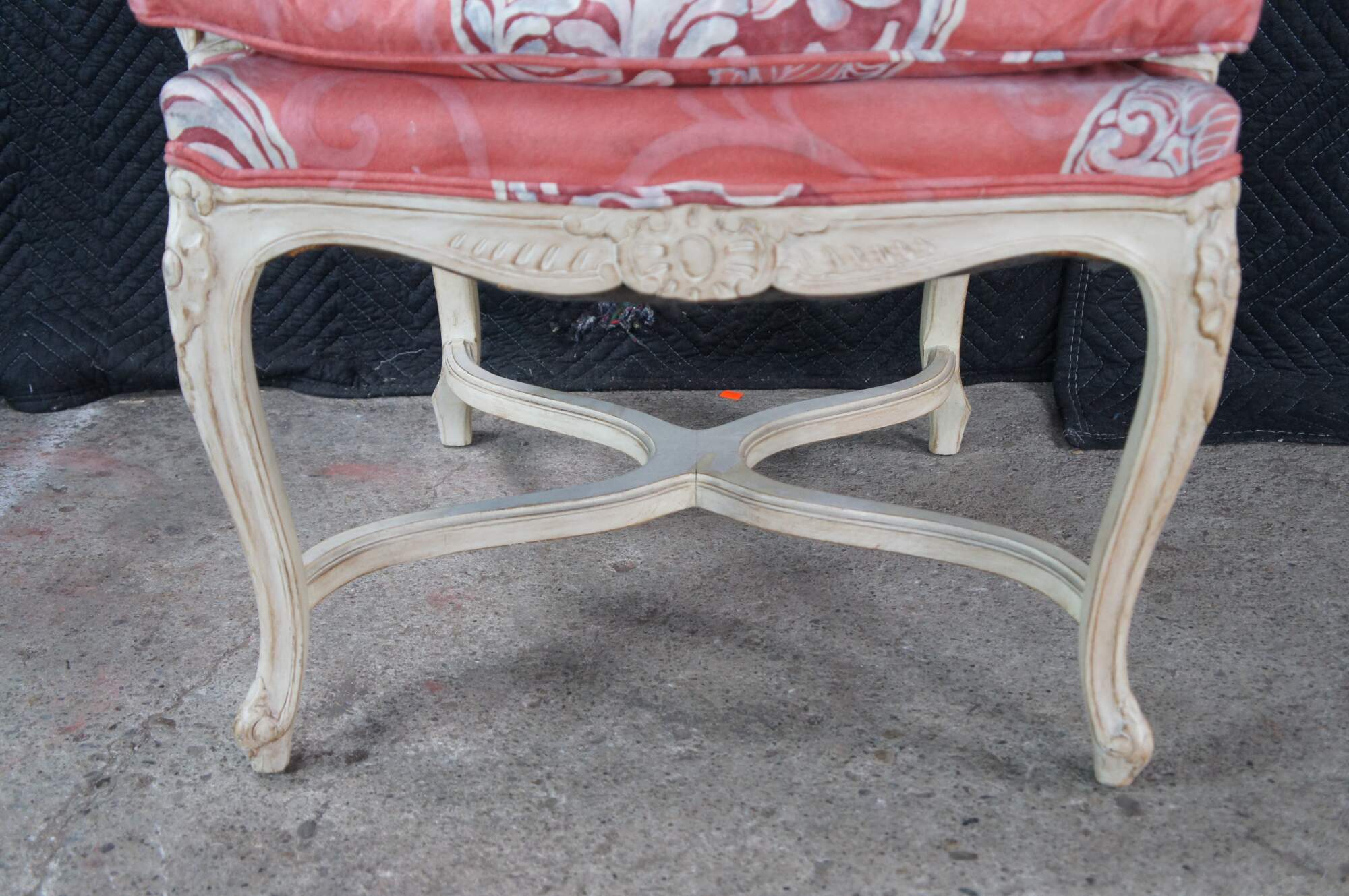 Vintage French Provincial Arm Chair, circa 1970s. Features a hardwood frame with floral medallions and chinoiserie fabric. The chair is supported by cabriole legs connected by an x-form stretcher. Seat cushion is fixed.