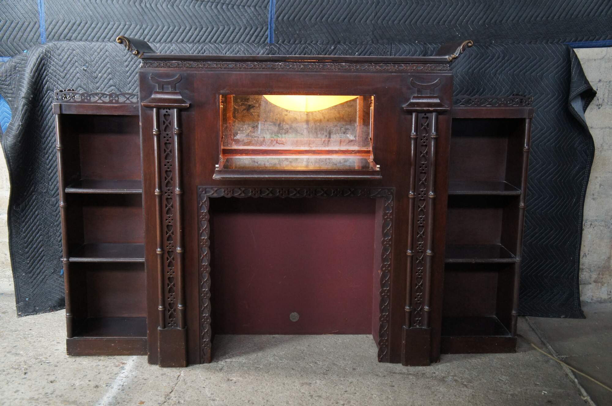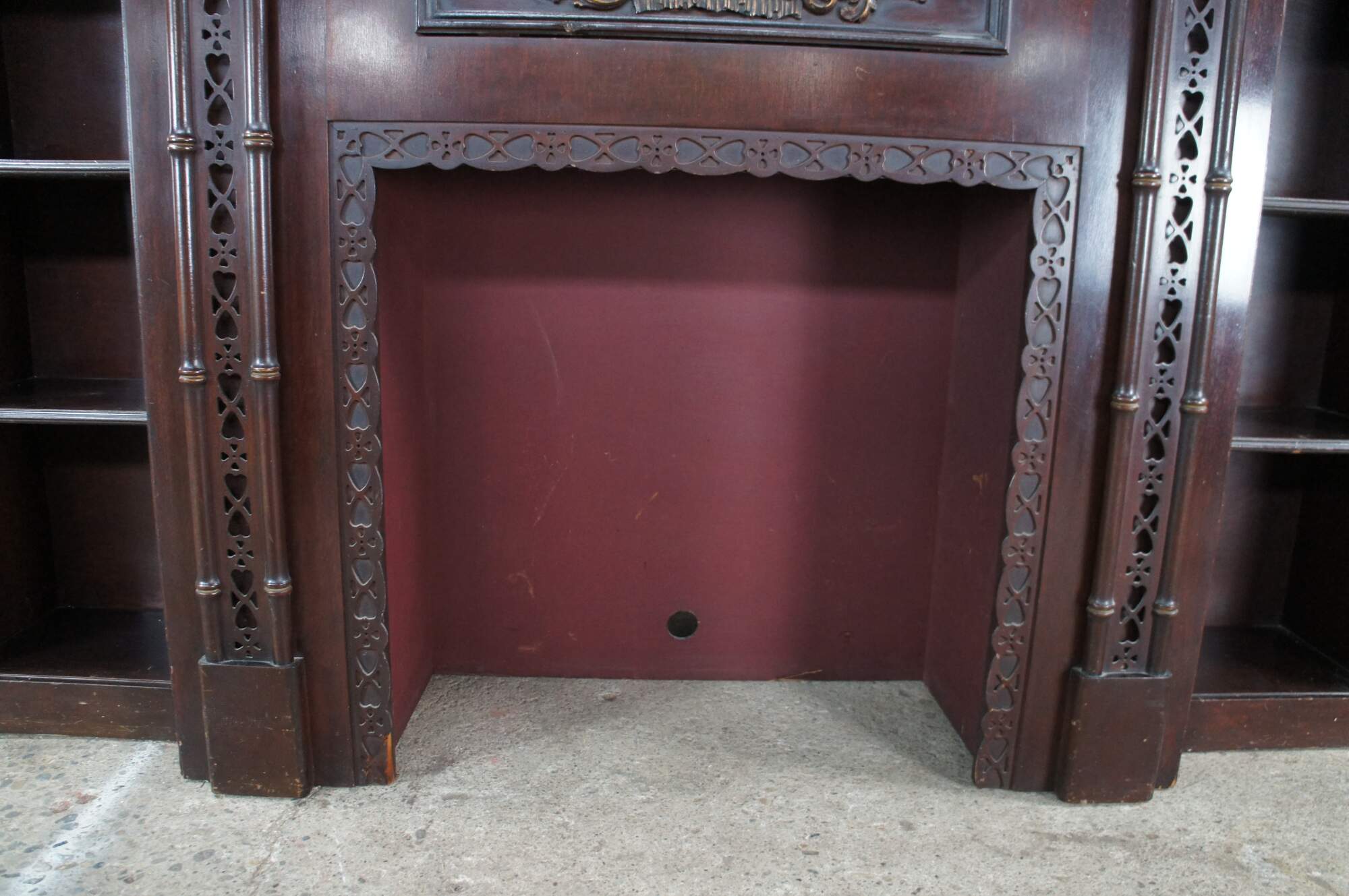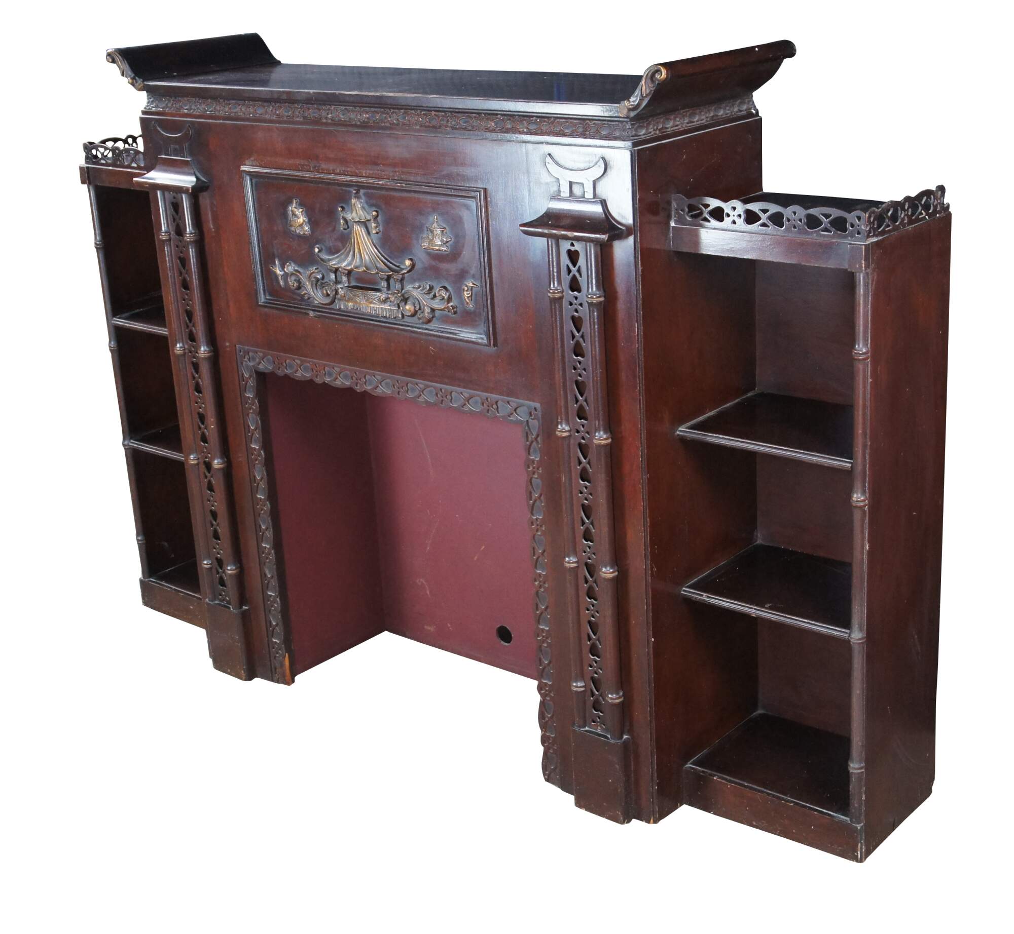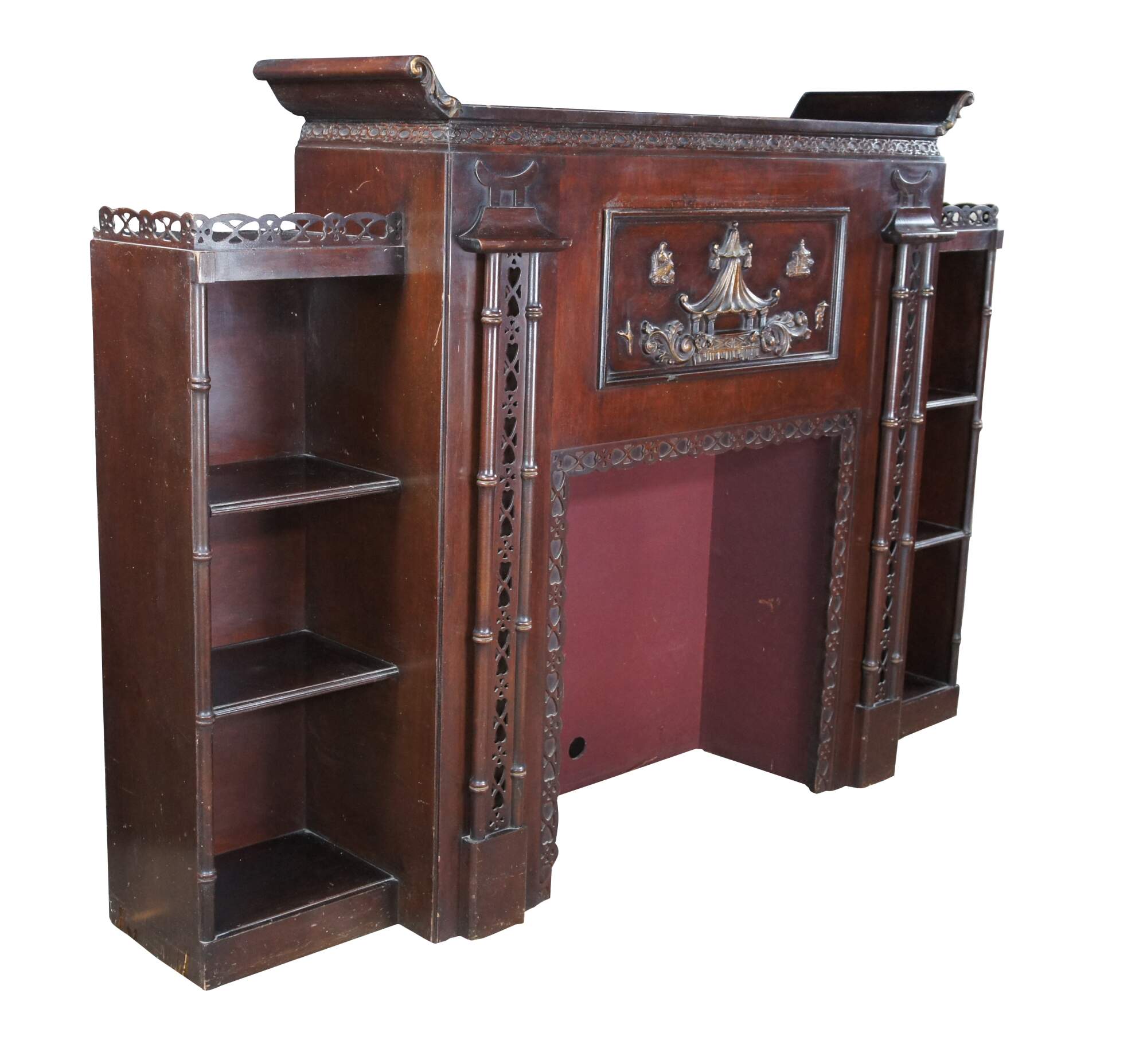 Mid 20th Century Chinese Chippendale Fireplace Surround & Bookcase by Majestic Arts Inc of New York. Features a pagoda form made from mahogany with reticulated faux bamboo accents. The central panel of the fireplace has a hidden secret compartment. The central panel flips down like a secretary to an illuminated and mirroed compartment. The fireplace surround is flanked by bookcases with shelves. The firebox portion has a hole along the back and was designed for a television. It can be used with a modern electric / decorative fireplace. A new firebox could be added to allow for use with logs.