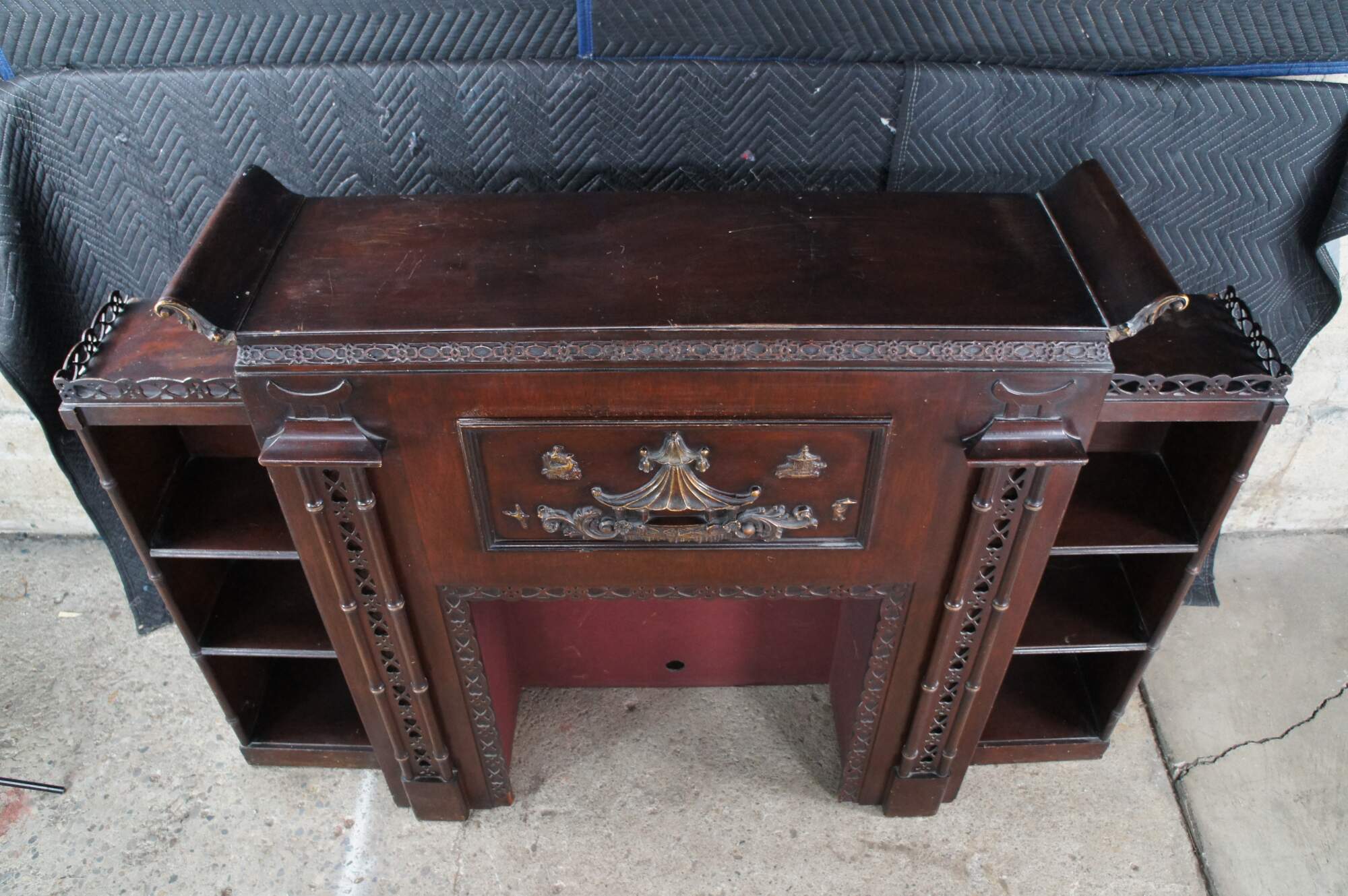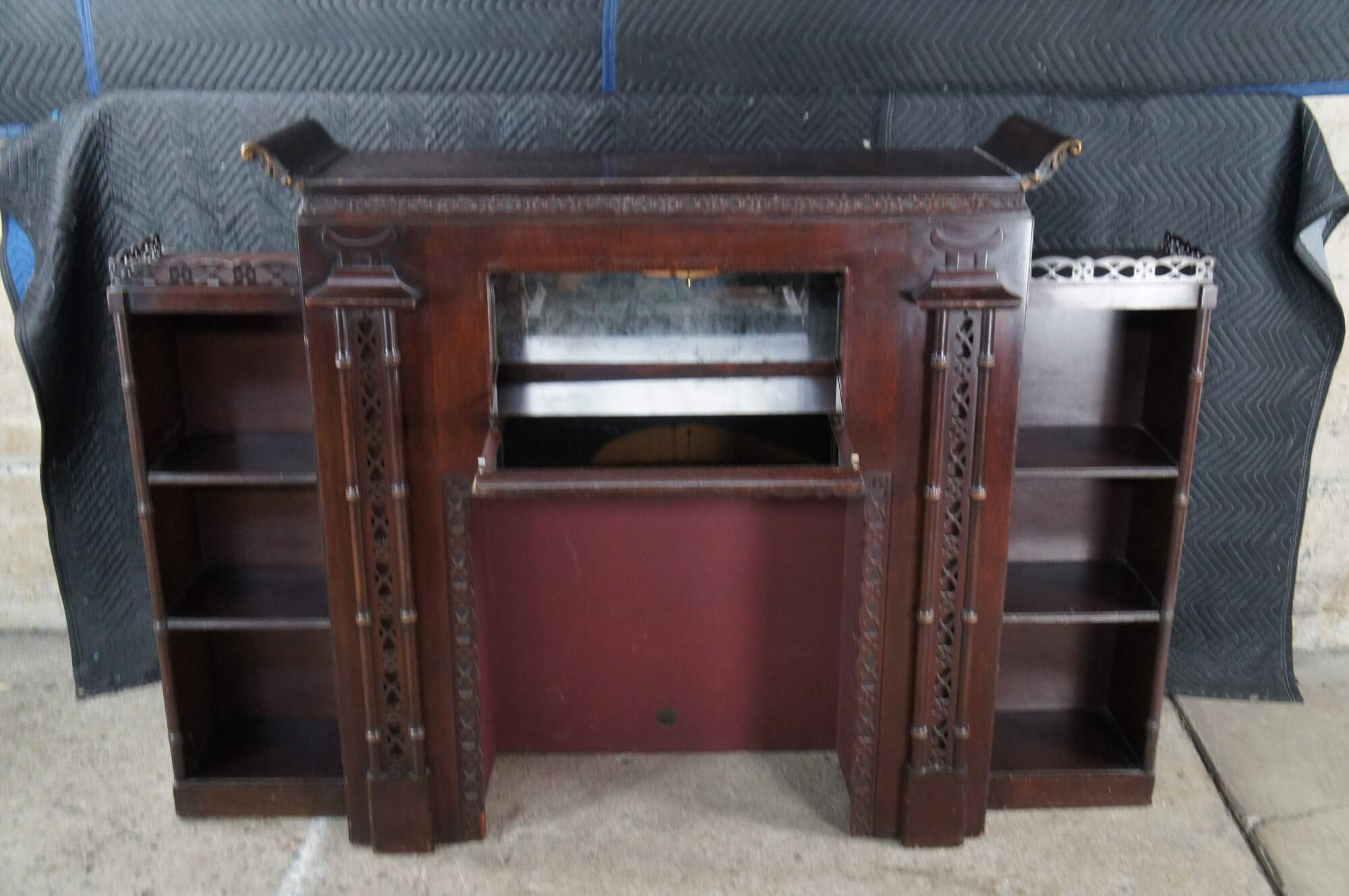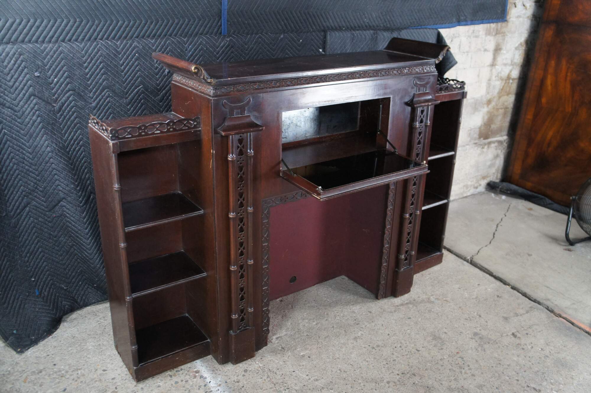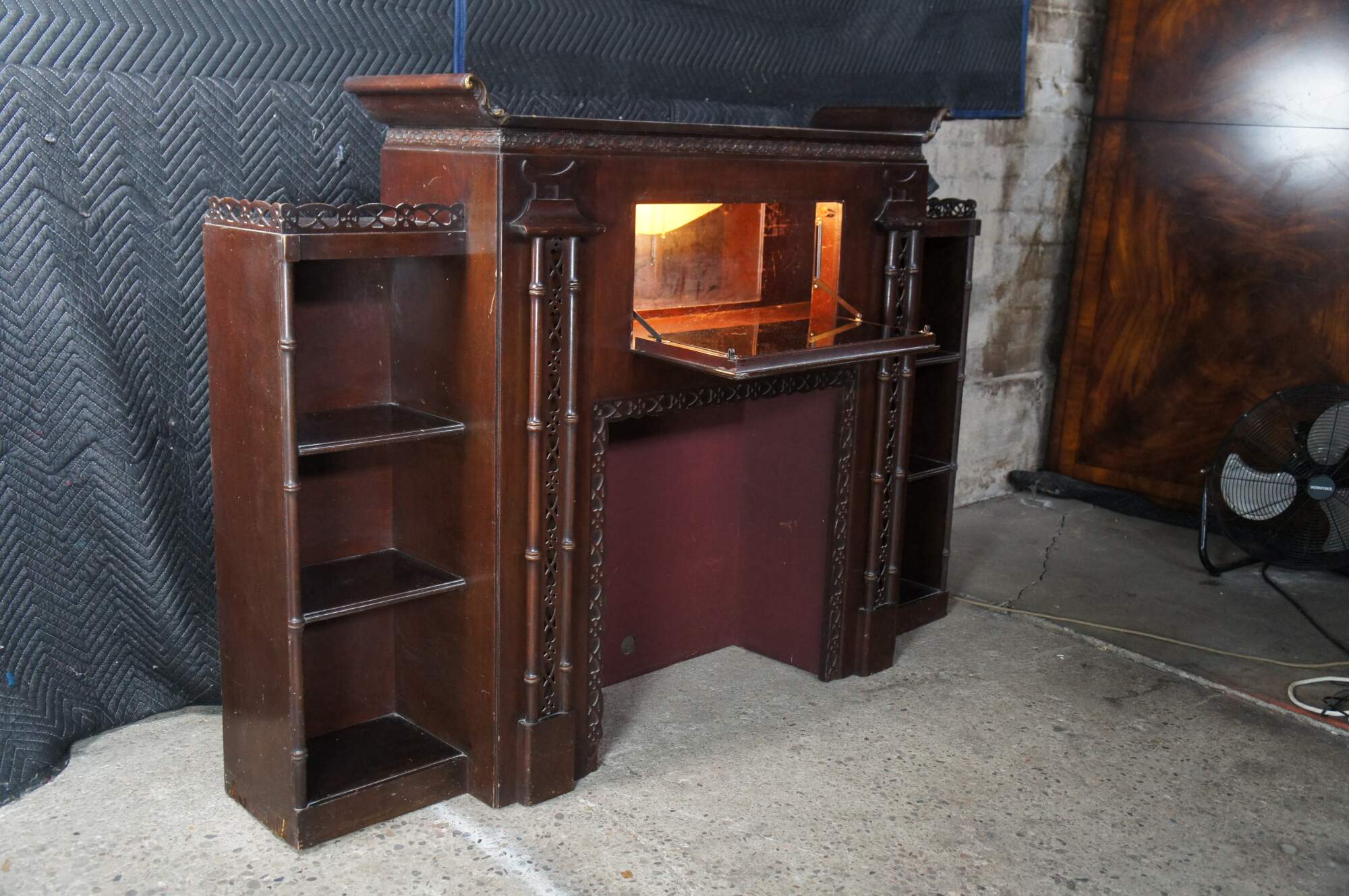 Mid 20th Century Chinese Chippendale Fireplace Surround & Bookcase by Majestic Arts Inc of New York. Features a pagoda form made from mahogany with reticulated faux bamboo accents. The central panel of the fireplace has a hidden secret compartment. The central panel flips down like a secretary to an illuminated and mirroed compartment. The fireplace surround is flanked by bookcases with shelves. The firebox portion has a hole along the back and was designed for a television. It can be used with a modern electric / decorative fireplace. A new firebox could be added to allow for use with logs.
