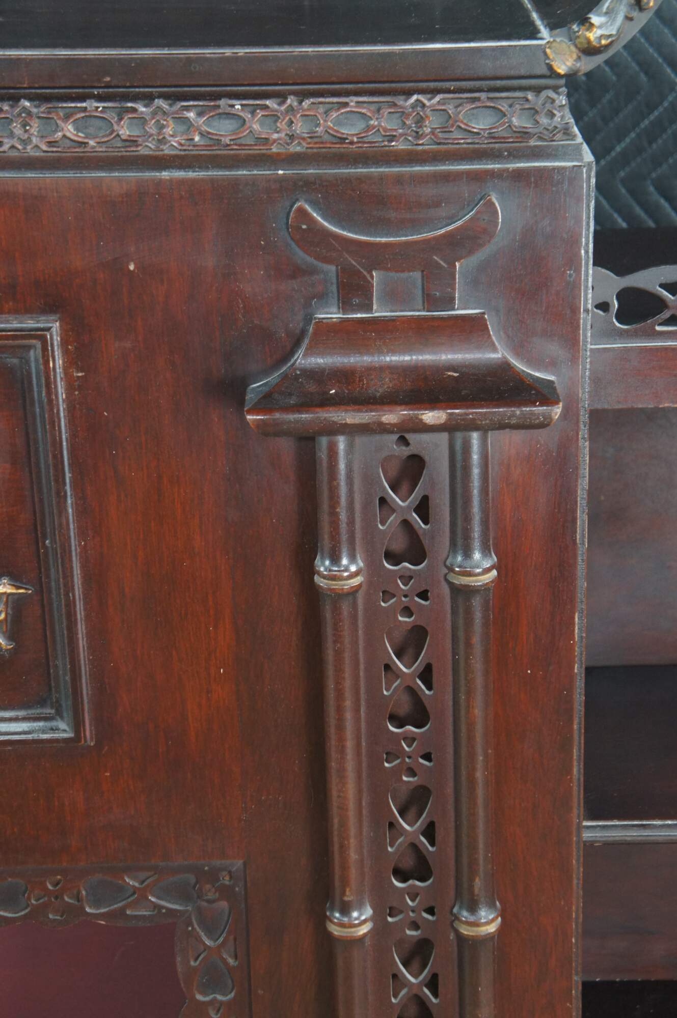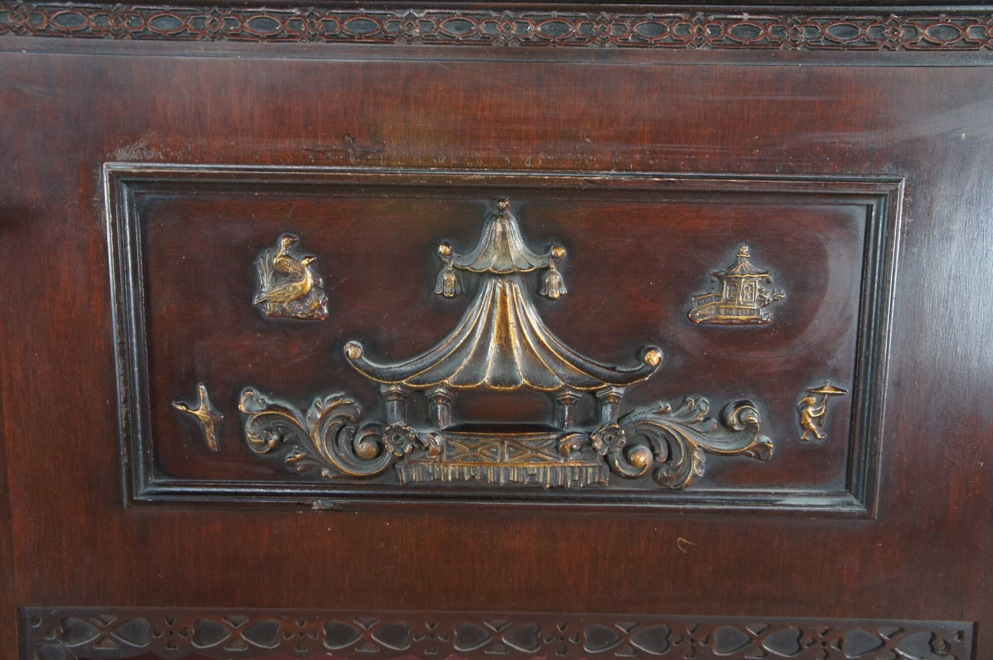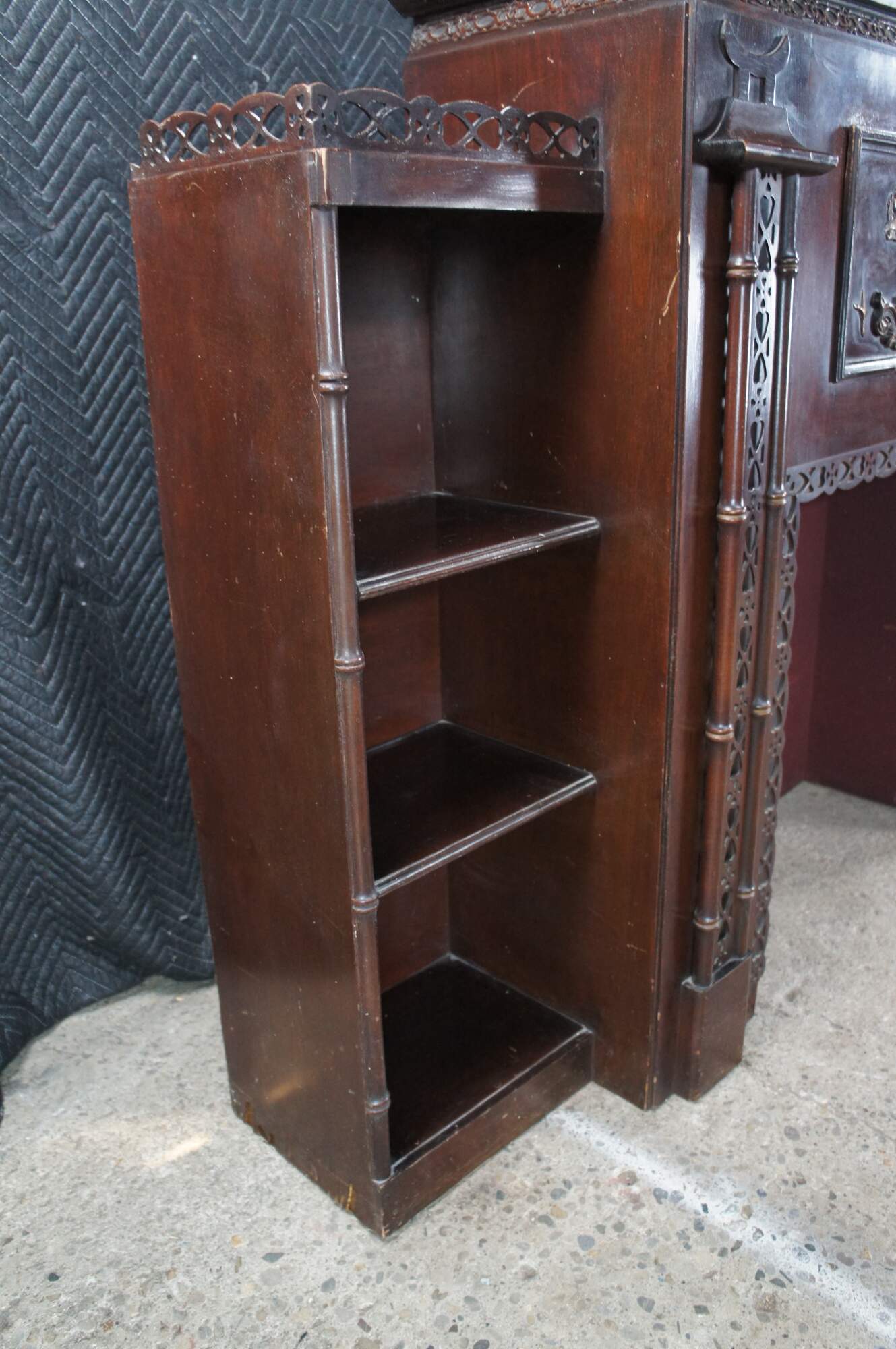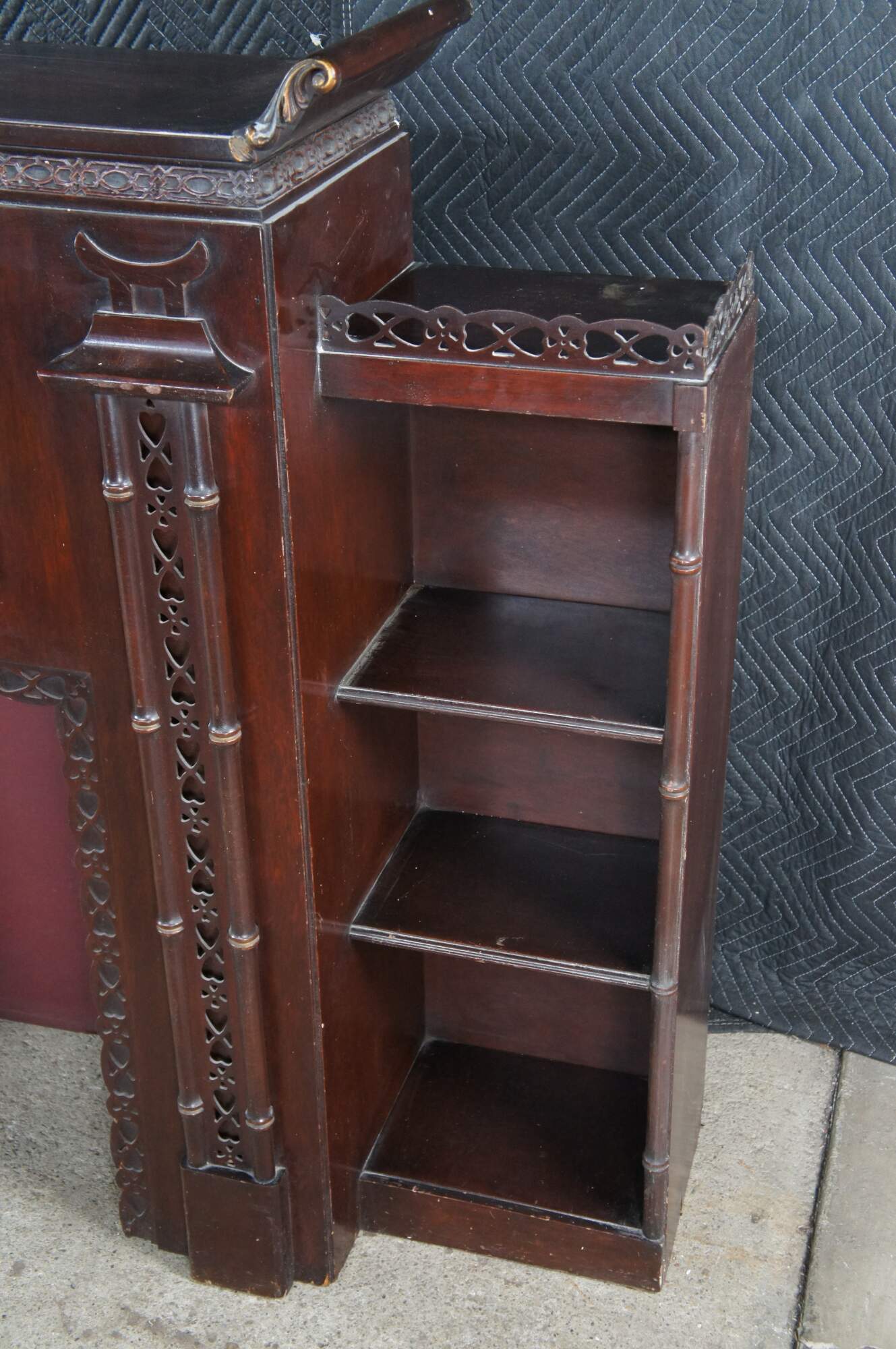 Mid 20th Century Chinese Chippendale Fireplace Surround & Bookcase by Majestic Arts Inc of New York. Features a pagoda form made from mahogany with reticulated faux bamboo accents. The central panel of the fireplace has a hidden secret compartment. The central panel flips down like a secretary to an illuminated and mirroed compartment. The fireplace surround is flanked by bookcases with shelves. The firebox portion has a hole along the back and was designed for a television. It can be used with a modern electric / decorative fireplace. A new firebox could be added to allow for use with logs.