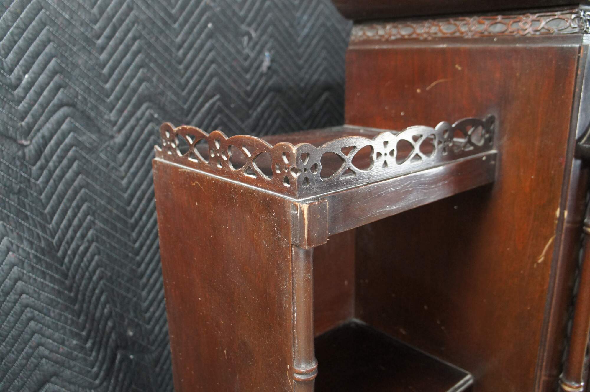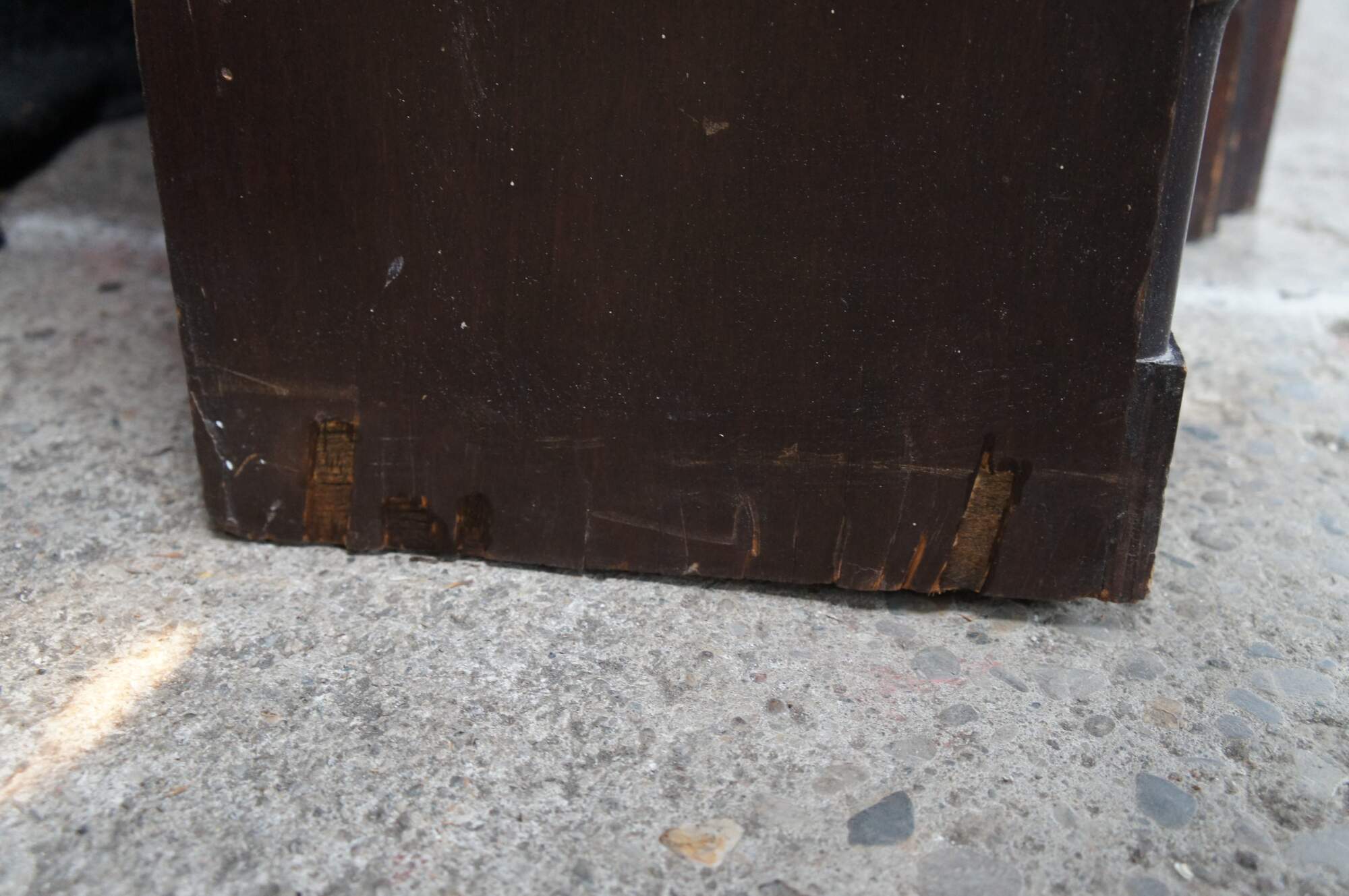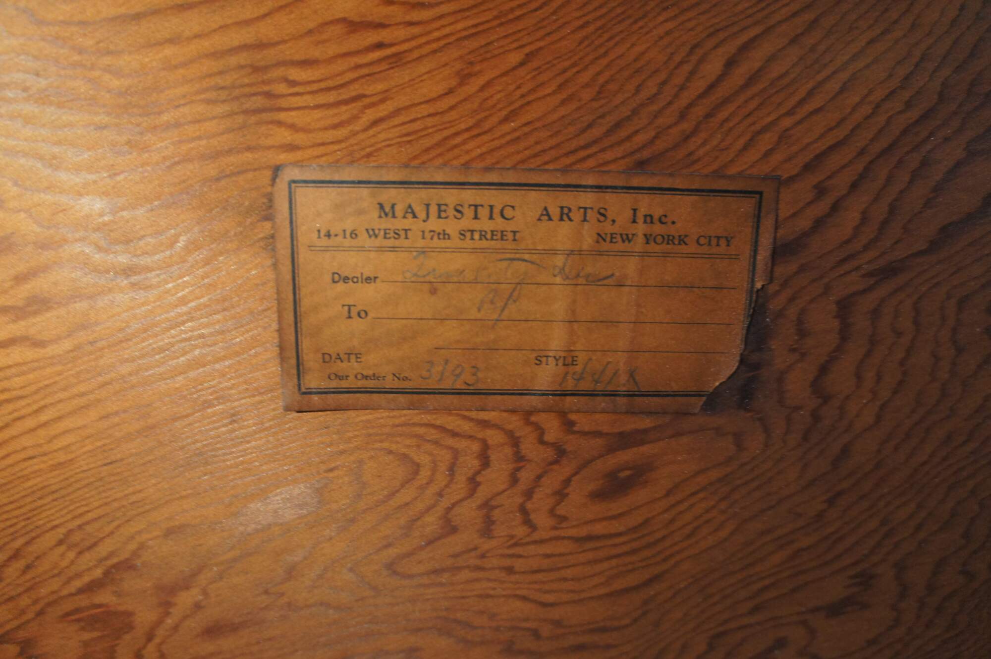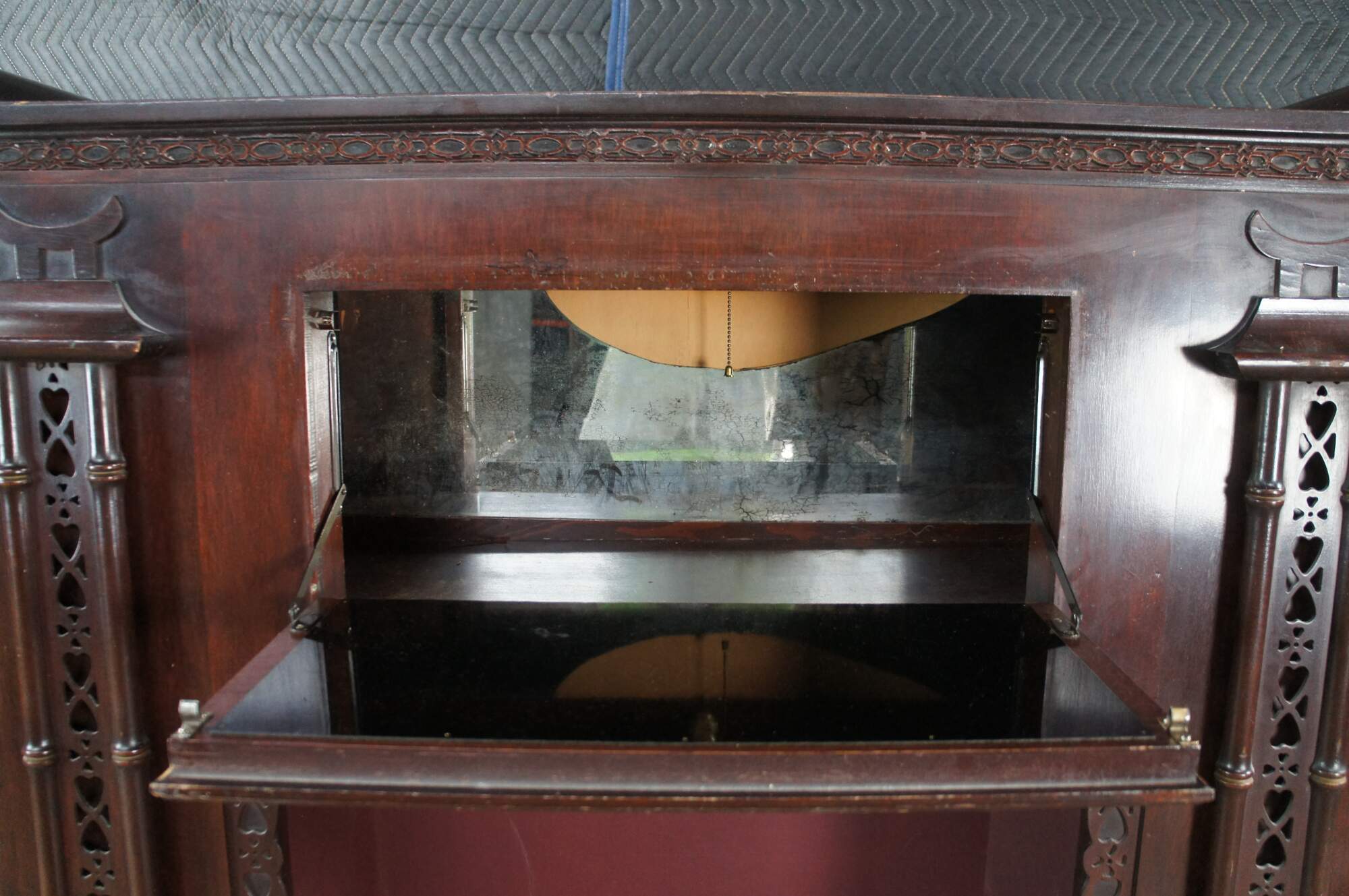 Fair; Stucturally solid, wear and distressing commensurate with age and use. Marking and edgewear. Some veneer damage along lower outside of left bookcase. Mirror on the inside of the compartment is broken / missing a piece
