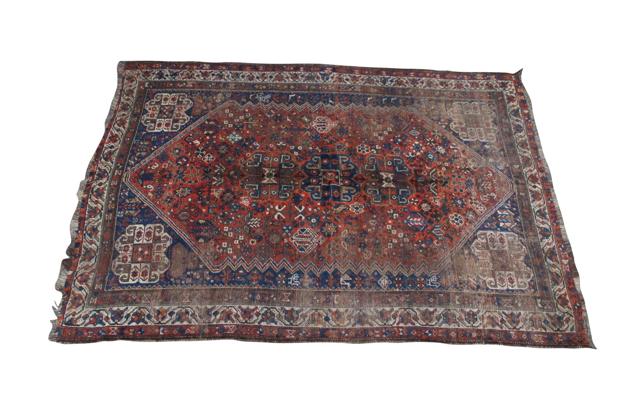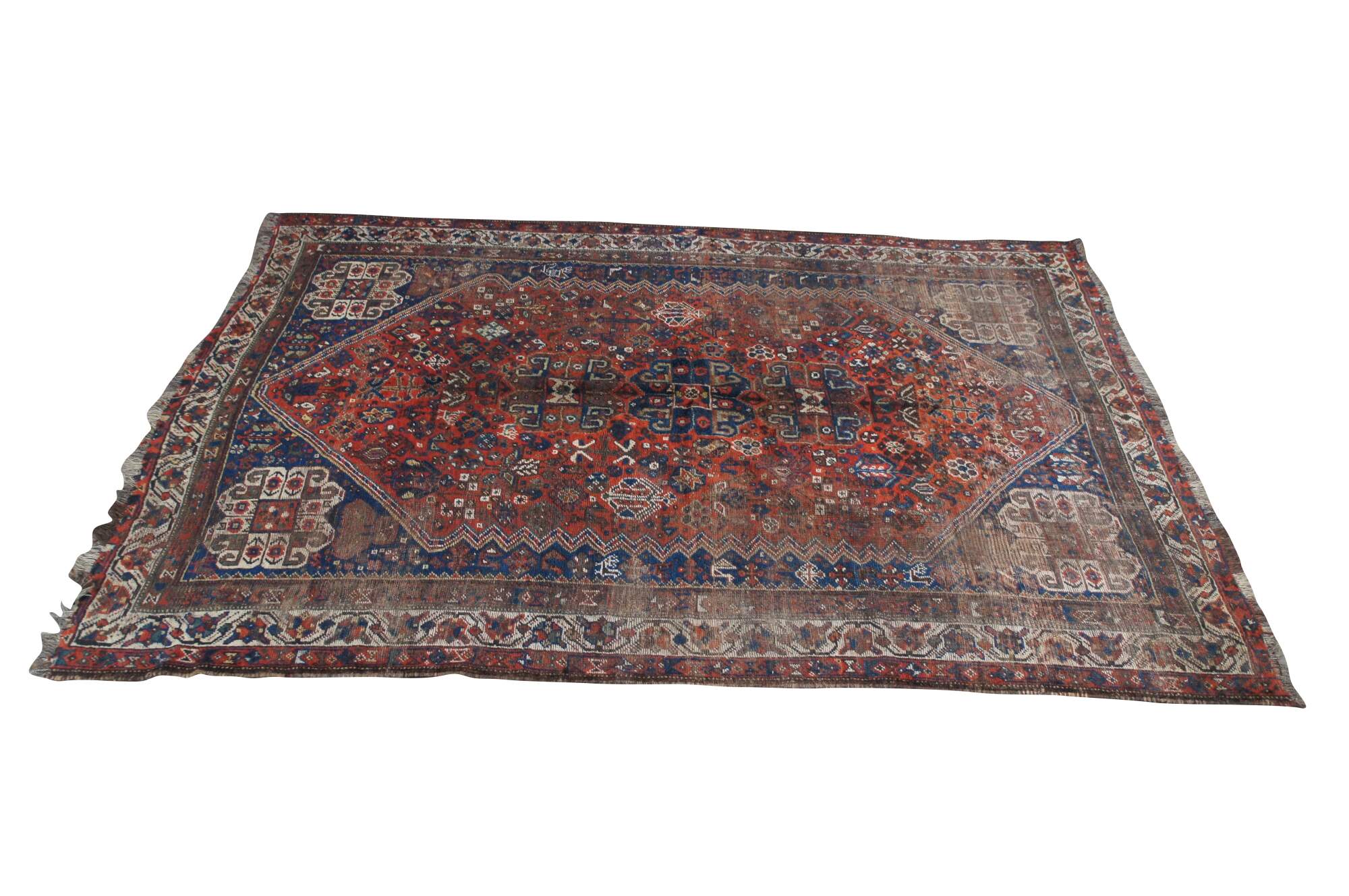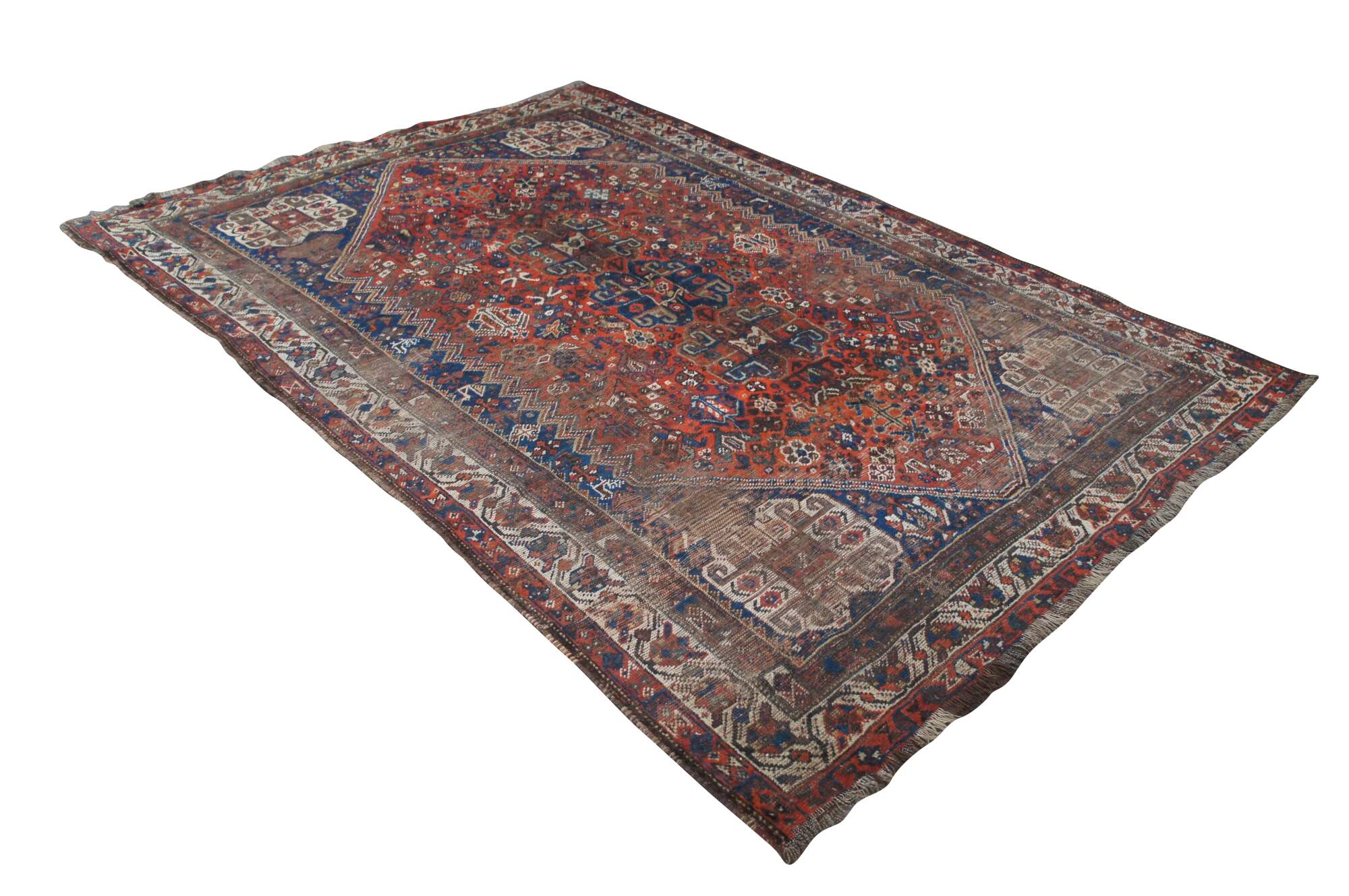 A beautiful vintage hand woven wool area rug. Features a geometric pattern with red and blue foreground accented by beige.