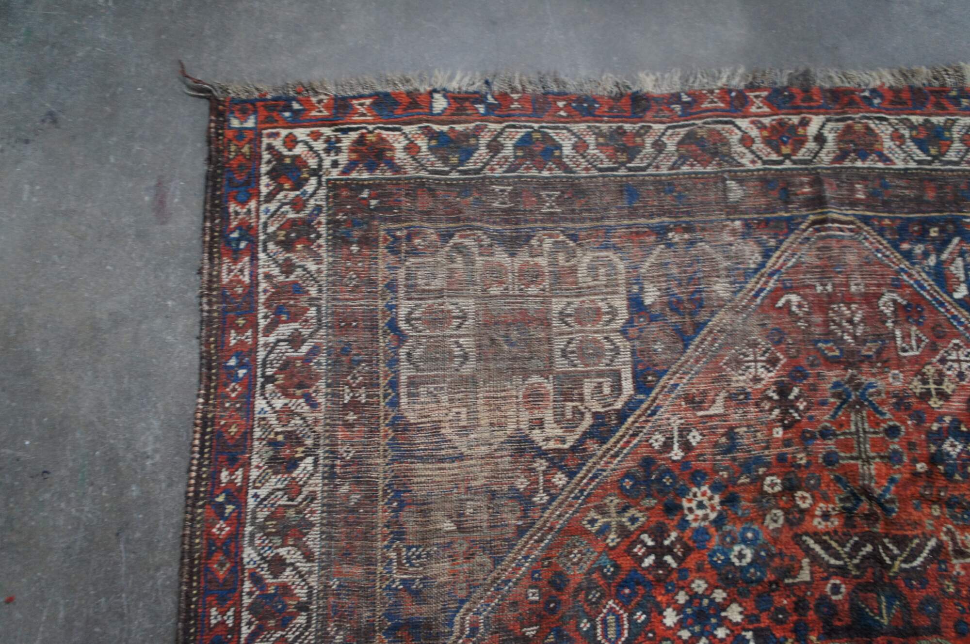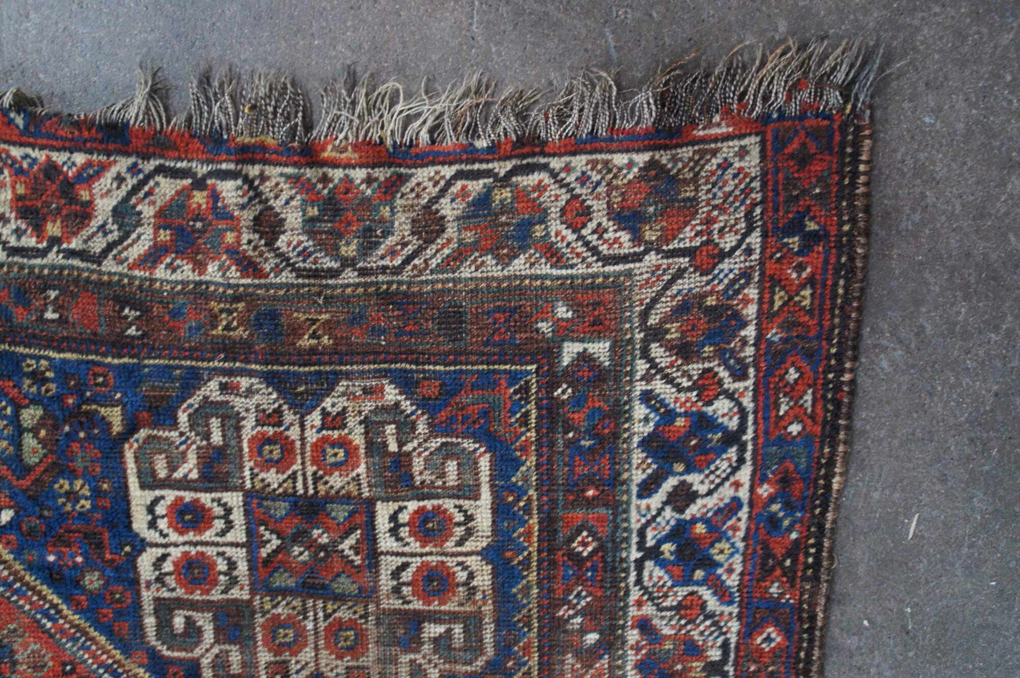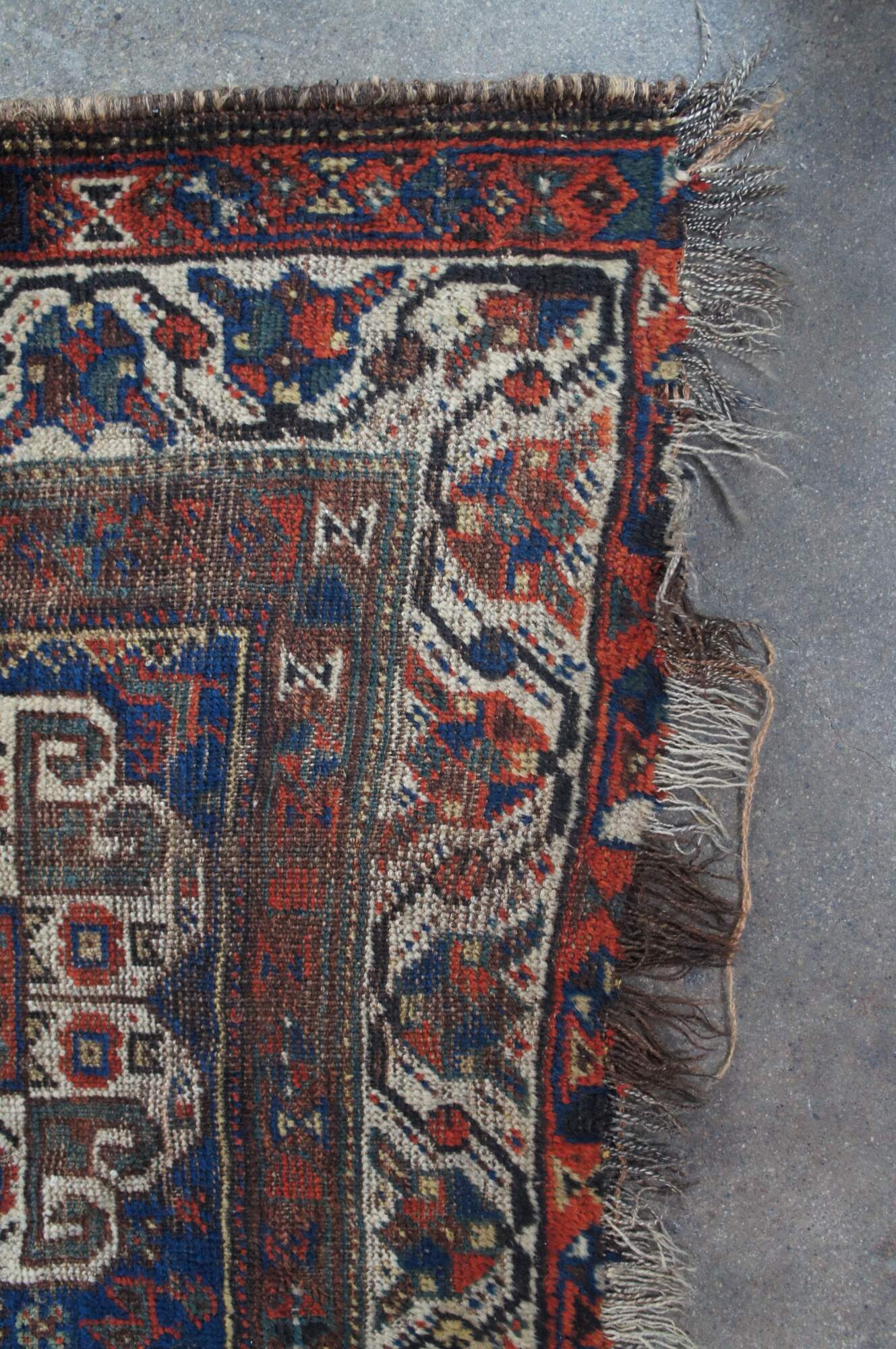 A beautiful vintage hand woven wool area rug. Features a geometric pattern with red and blue foreground accented by beige.