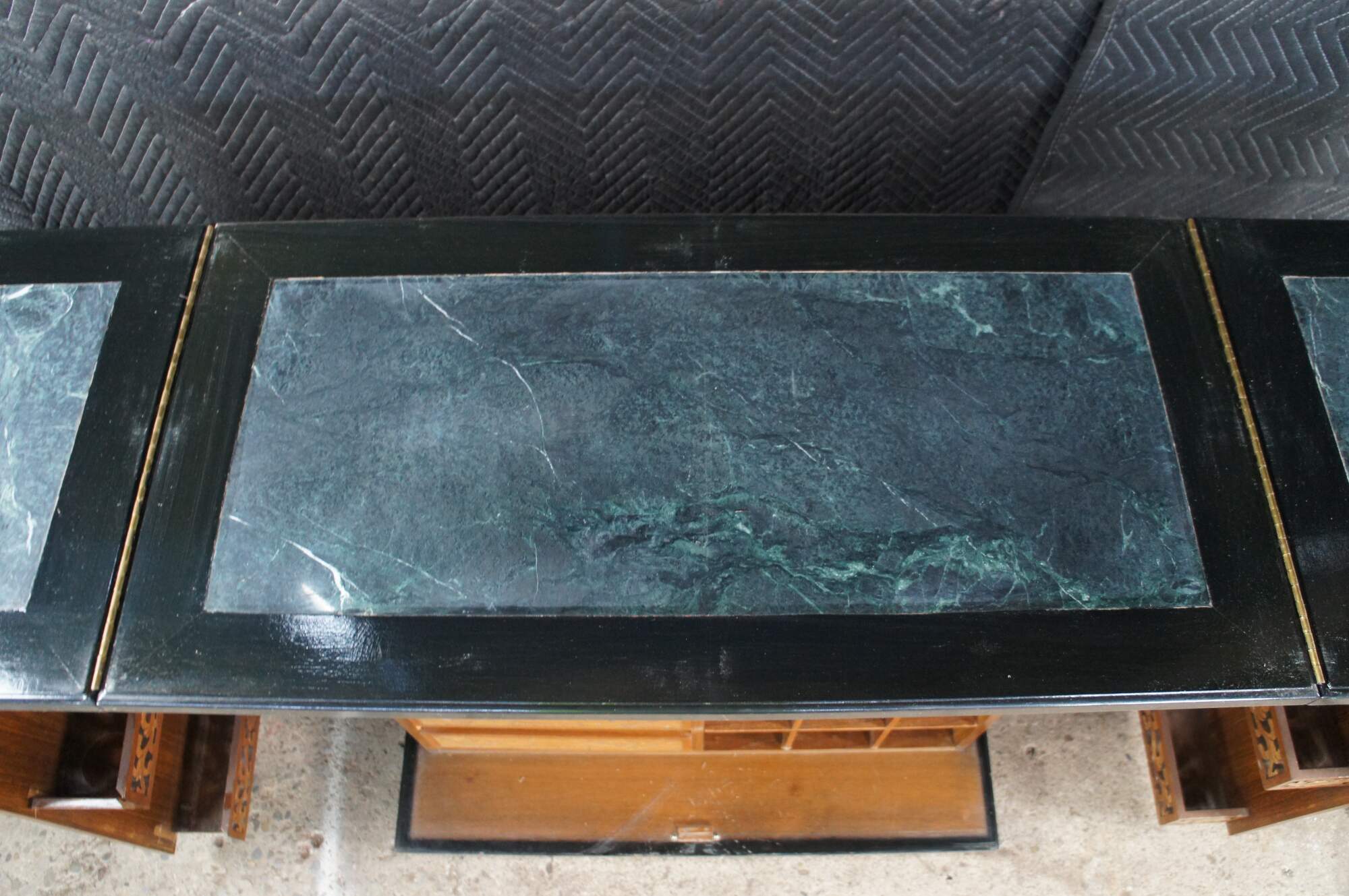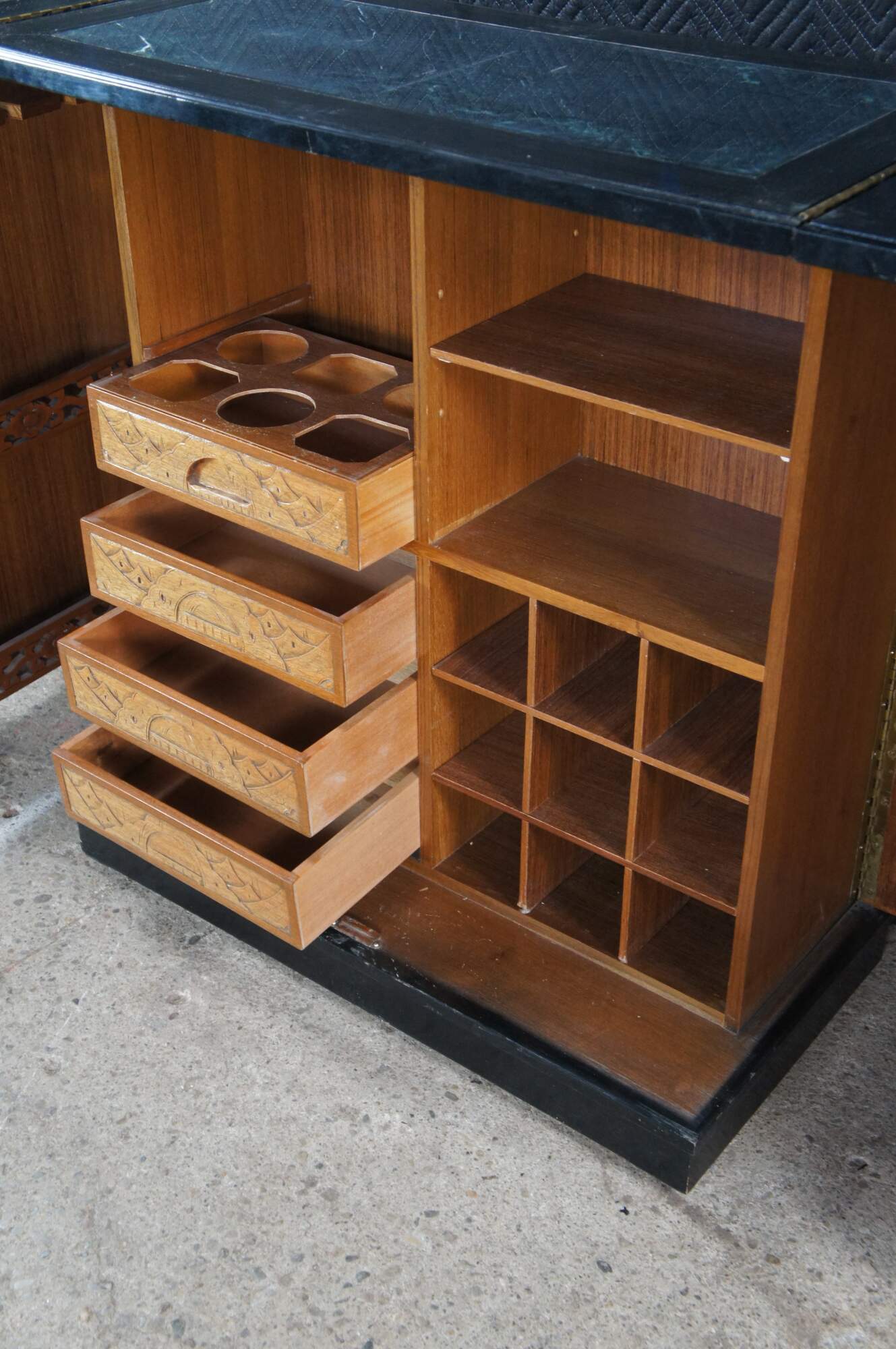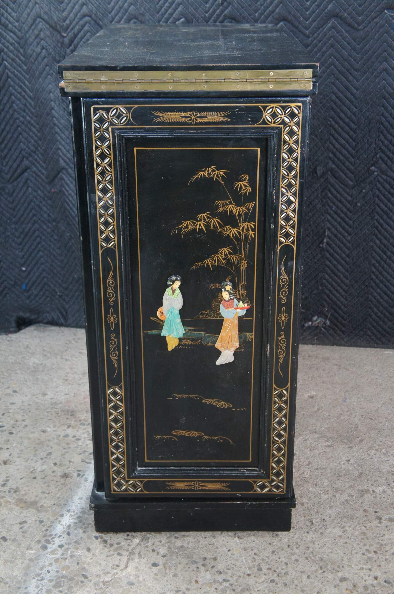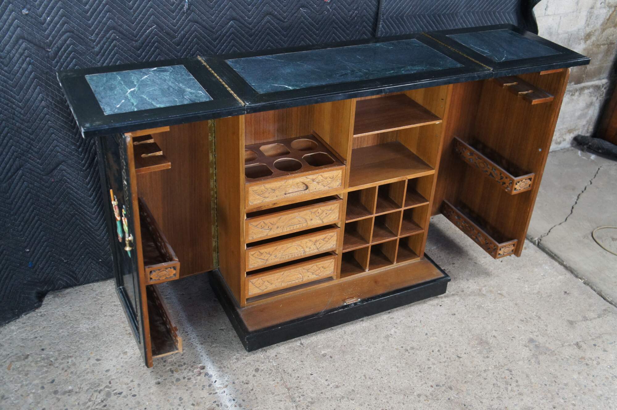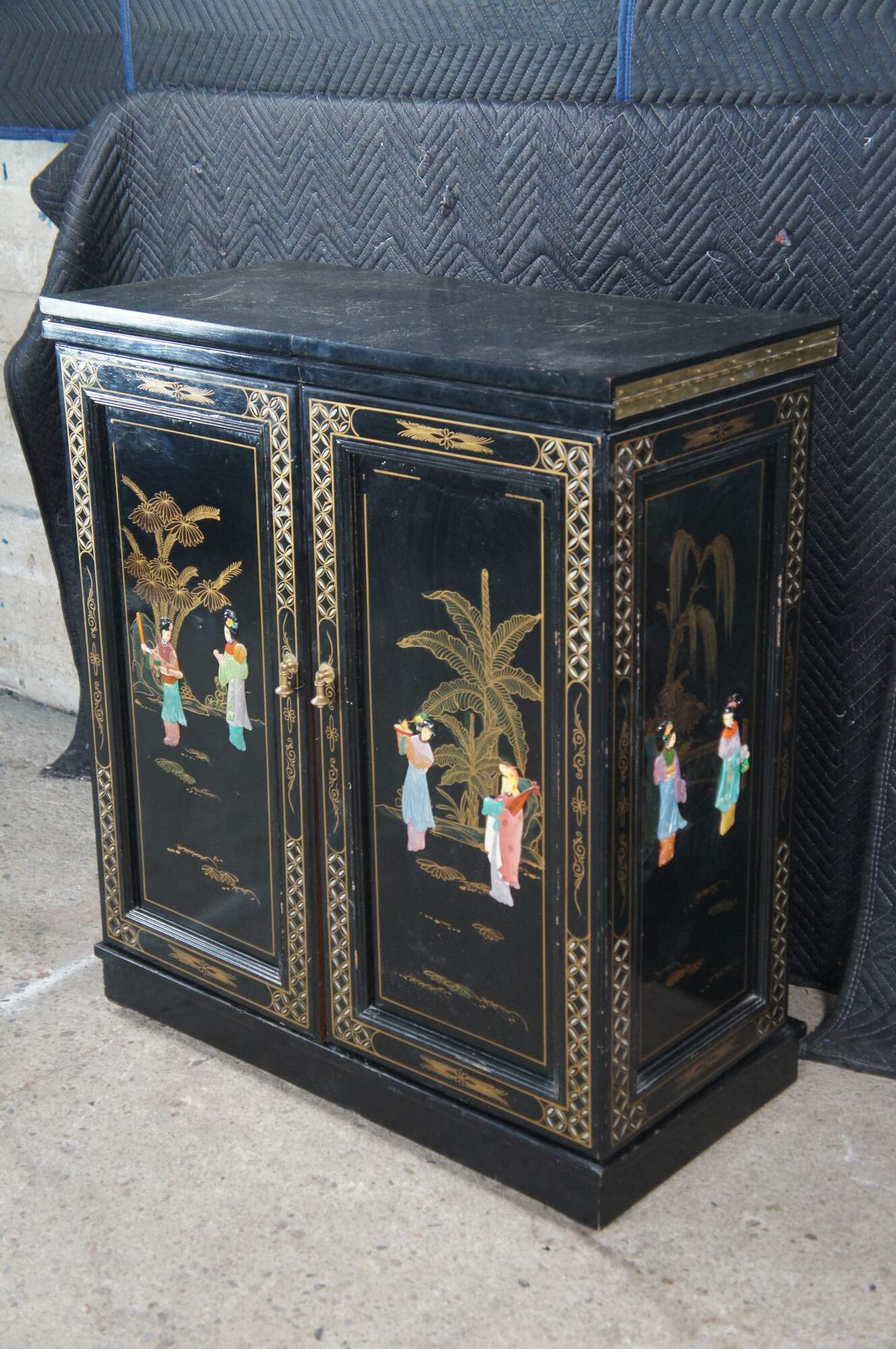 An Impressive Chinse Black lacquer folding bar cabinet, c.1970s Features a black and gold exterior with hand painted garden scenes with soapstone geisha figures. The cabinet doors open to support a marble inset flip top, revealing an imperssive bar cabinet and storage area. Includes space for wine, liquor bottles and other supplies. The perfect covnersation piece for any space.
