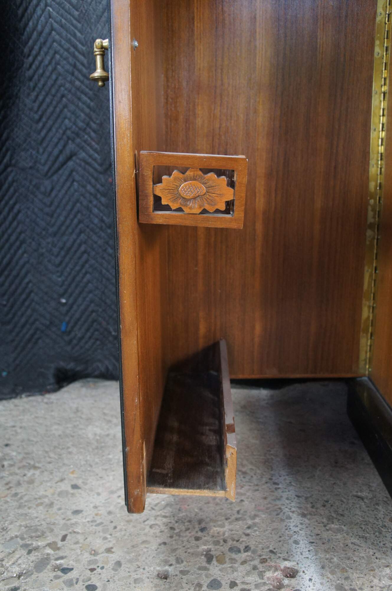 Fair; Structurally Solid, scratching and finish wear to the top and exterior case. Missing a carved section on the lower left shelf once open.