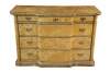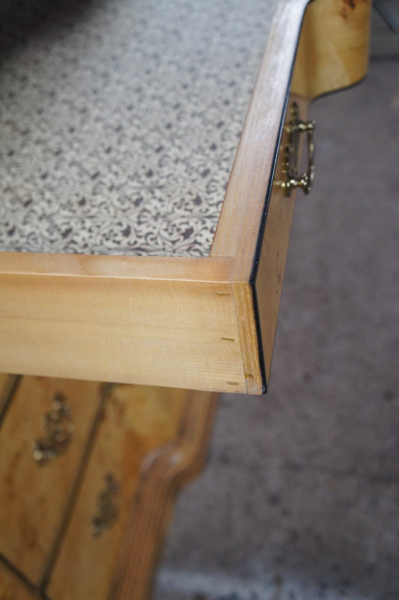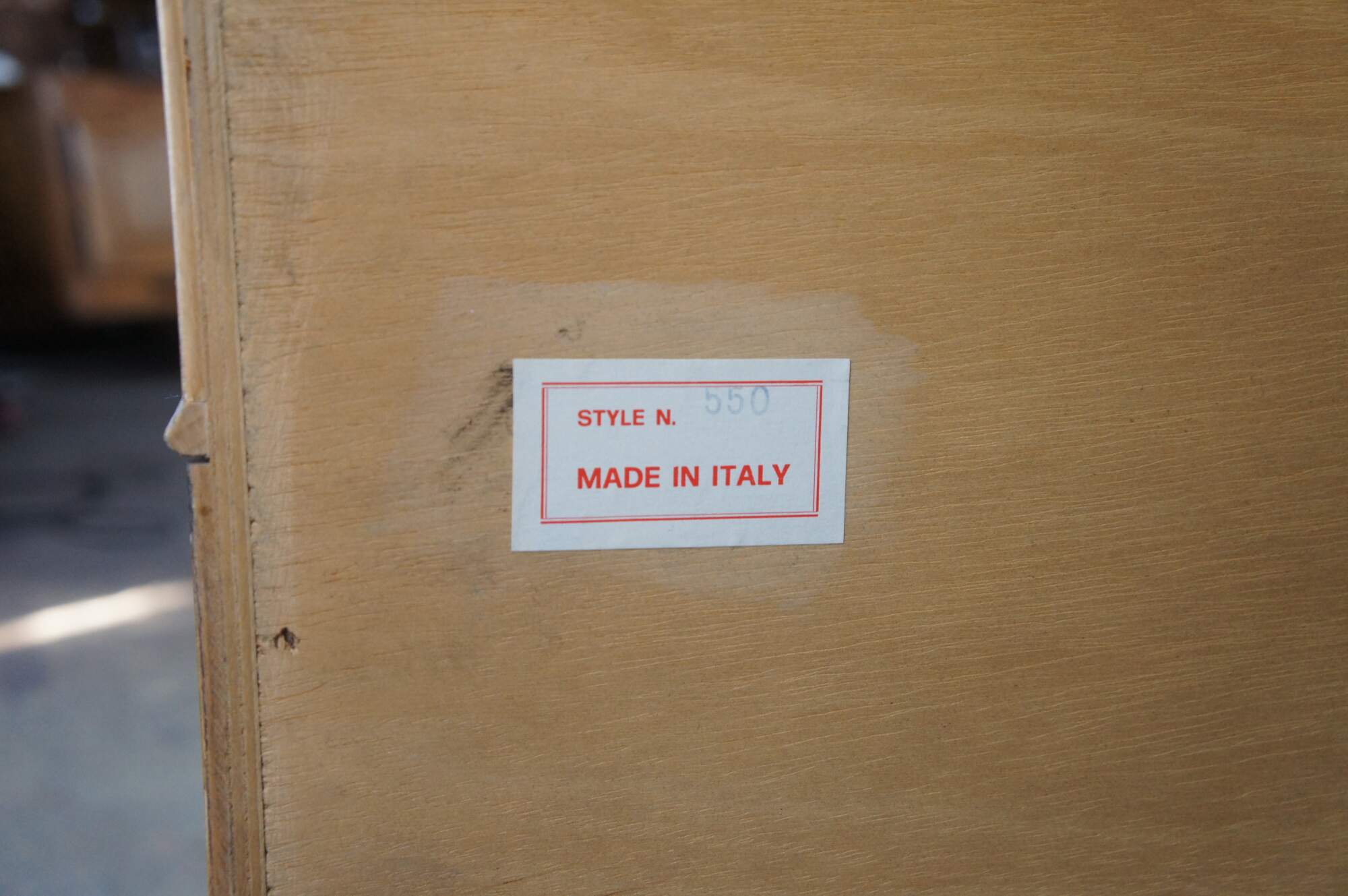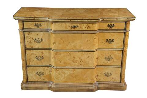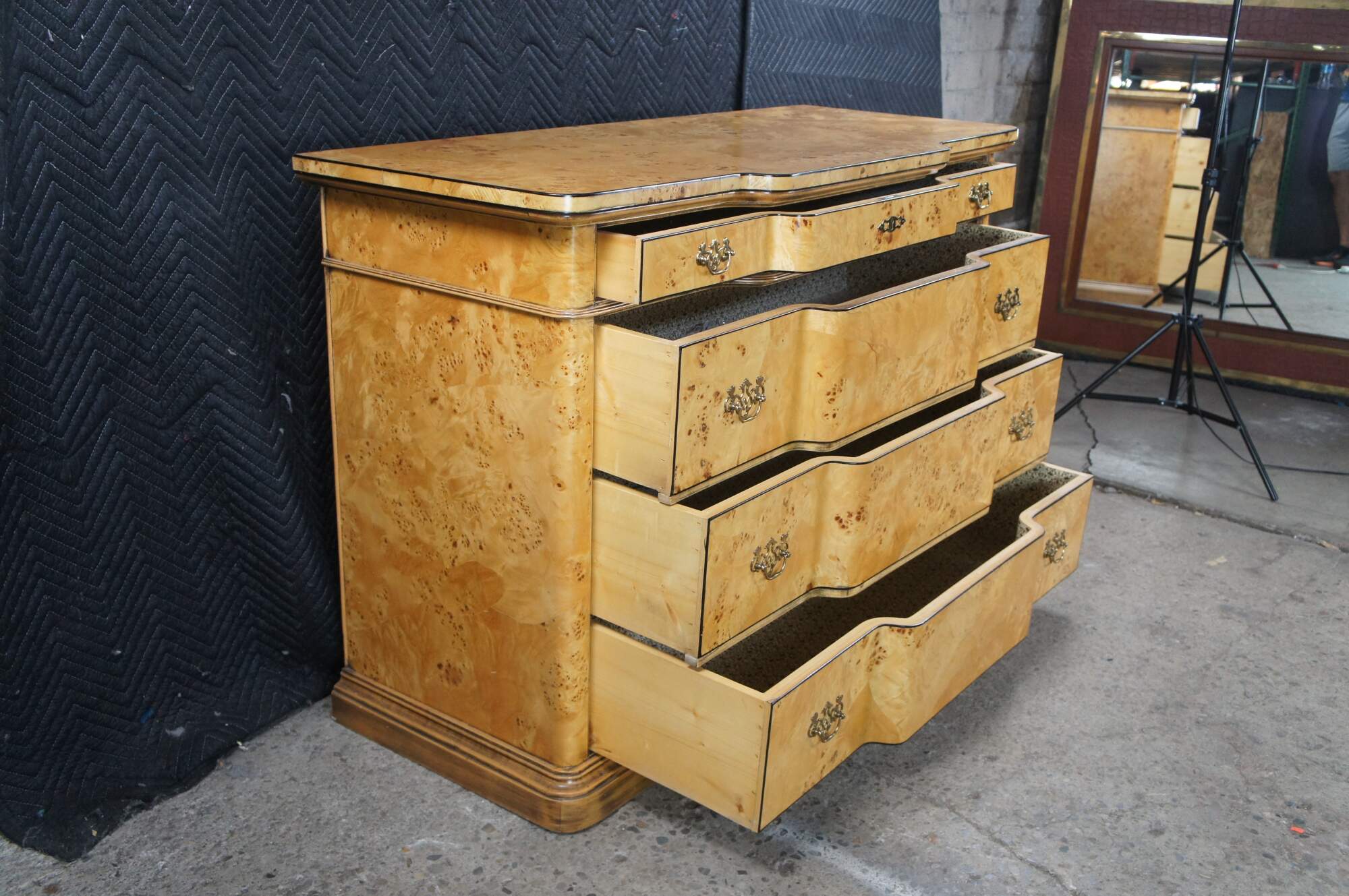Late 20th Century Italian Commode, circa 1970. Drawing inspiration from Louis XVI & Biedermeier styling. Features a breakfront form with birdseye maple veneer and classical interlaced brass bale pulls. The chest showcases four drawers made from pine with foliate lining. Marked Made in Italy along the back, style number 550.