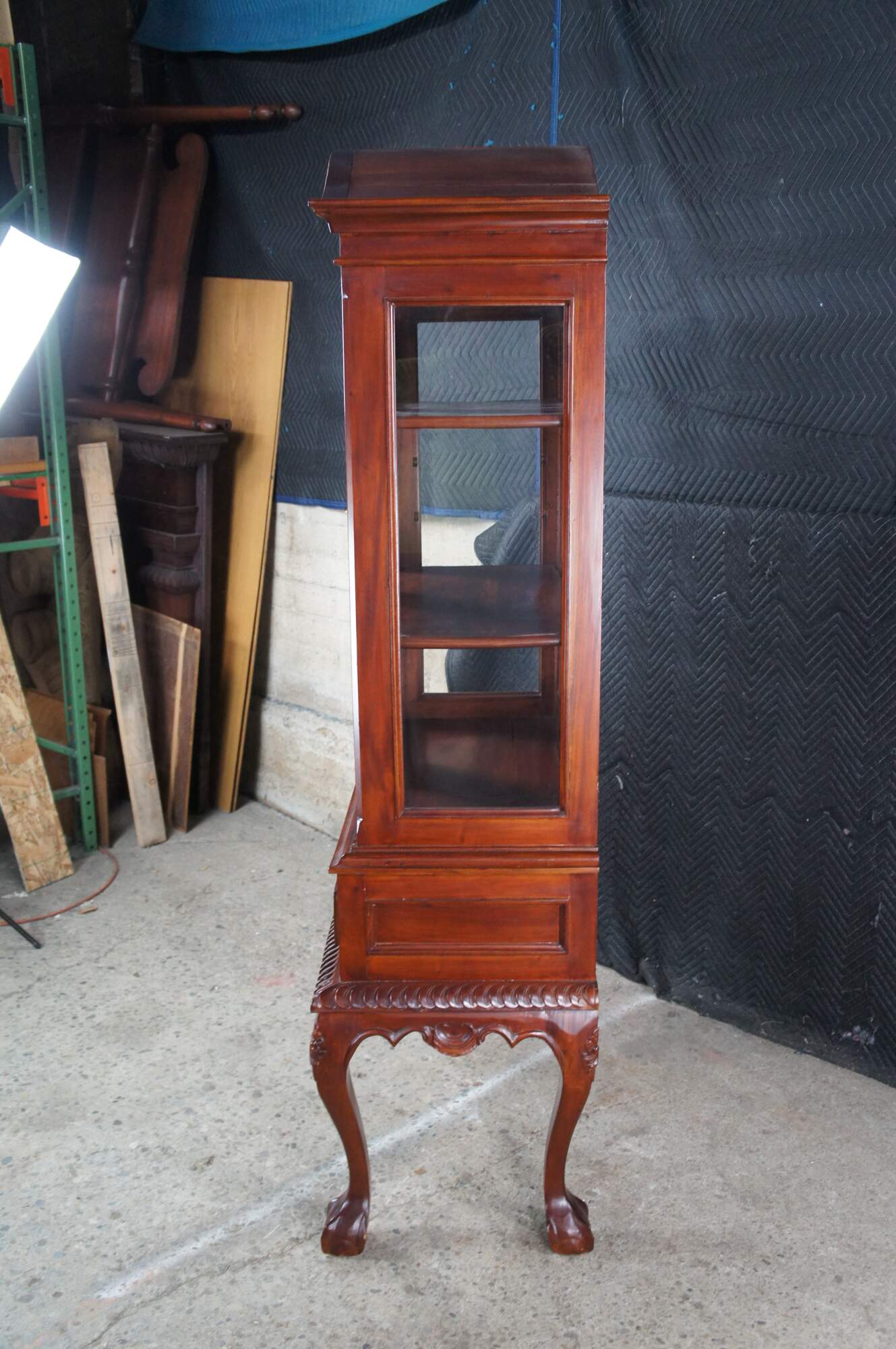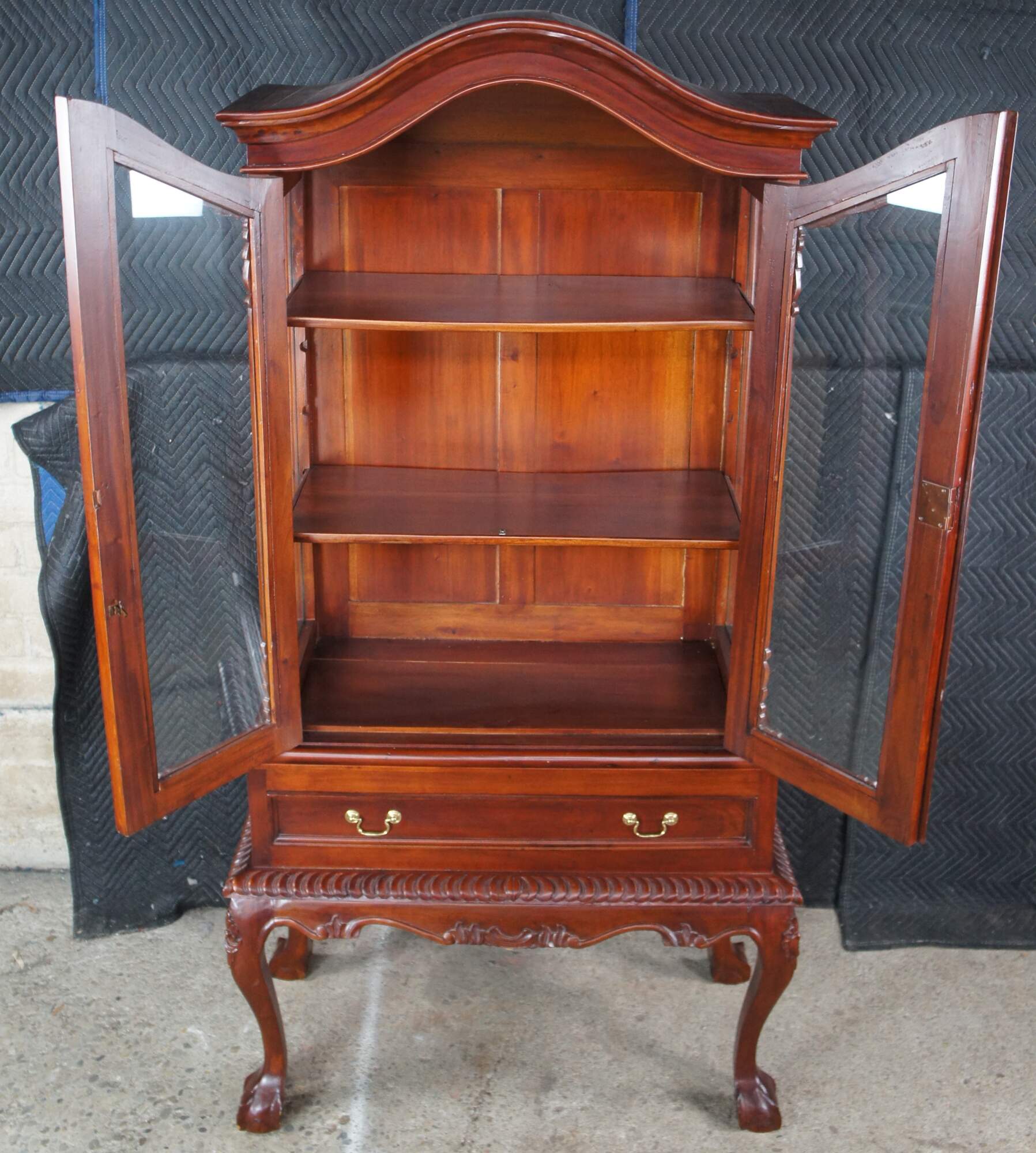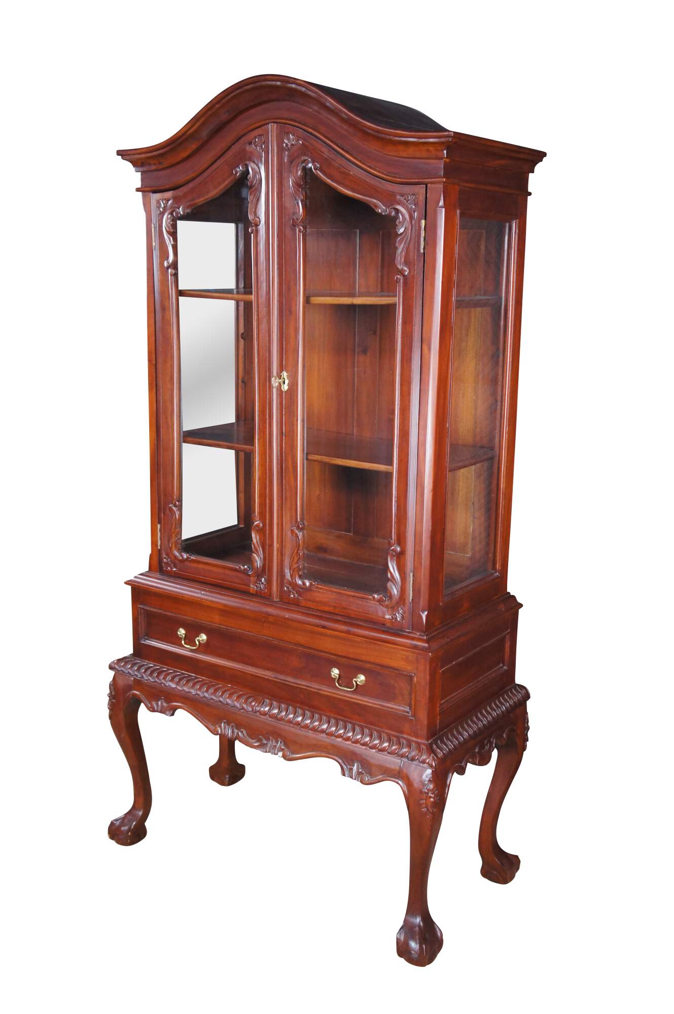Vintage mahogany curio display case / hutch / cabinet featuring Chippendale styling with a domed top and acanthus accents. The cabinet has a large lower storage drawer, and is supported by Queen Anne style ball and claw feet. Includes working key.