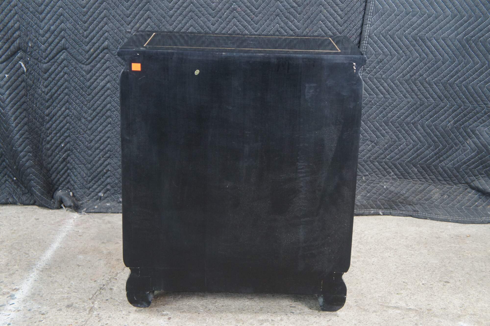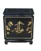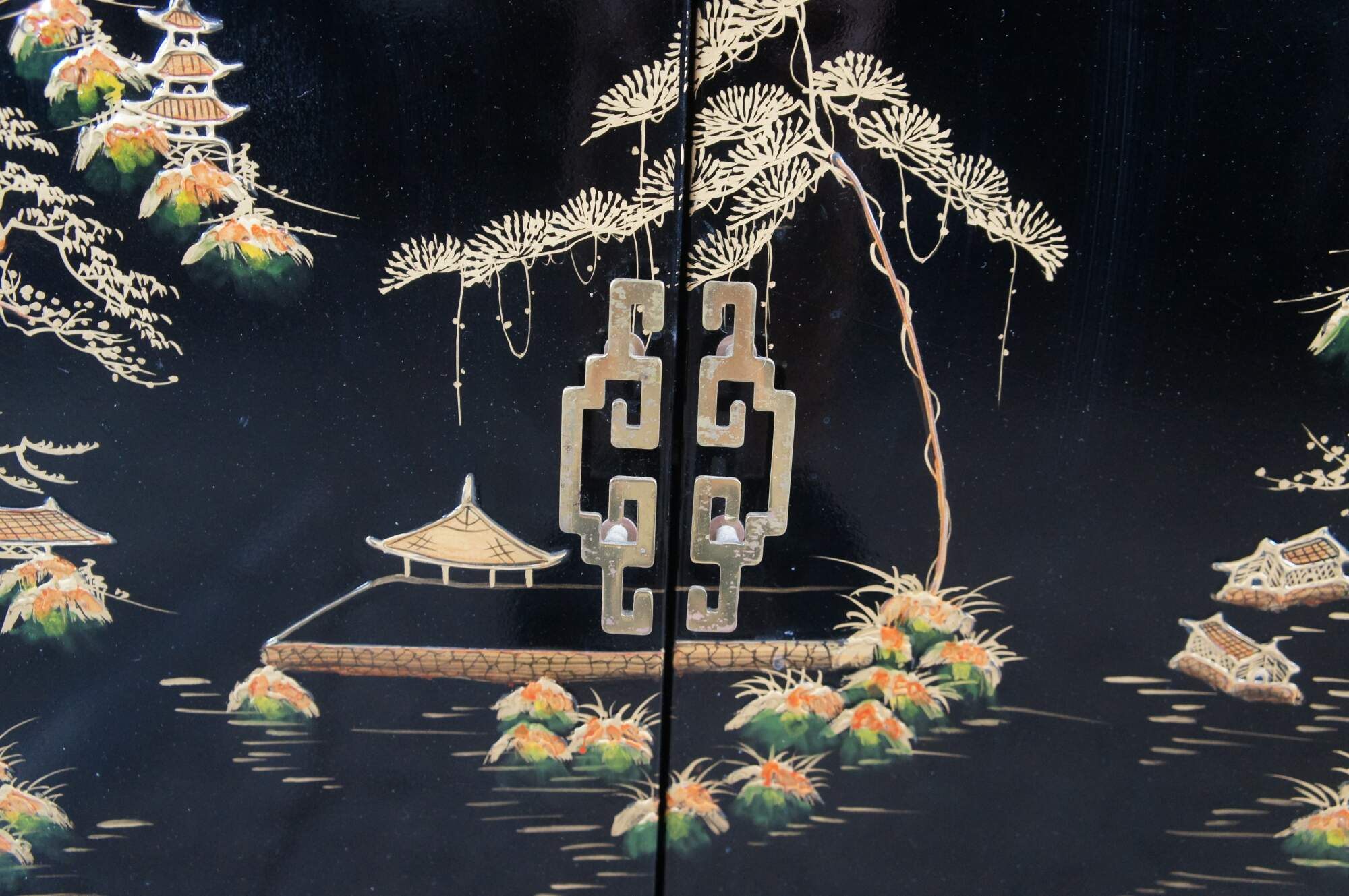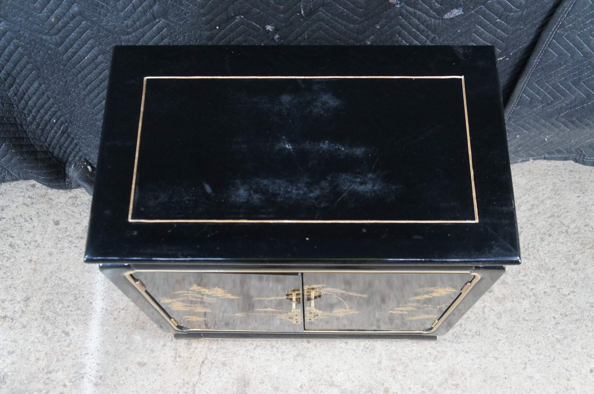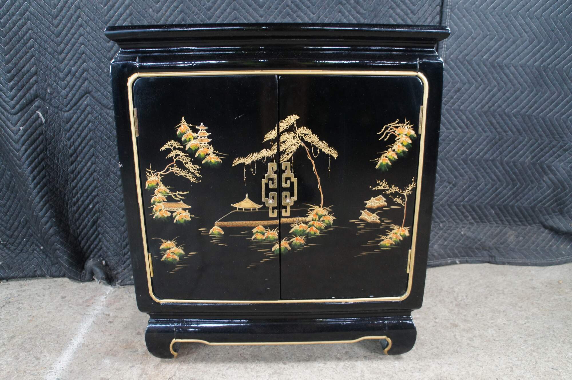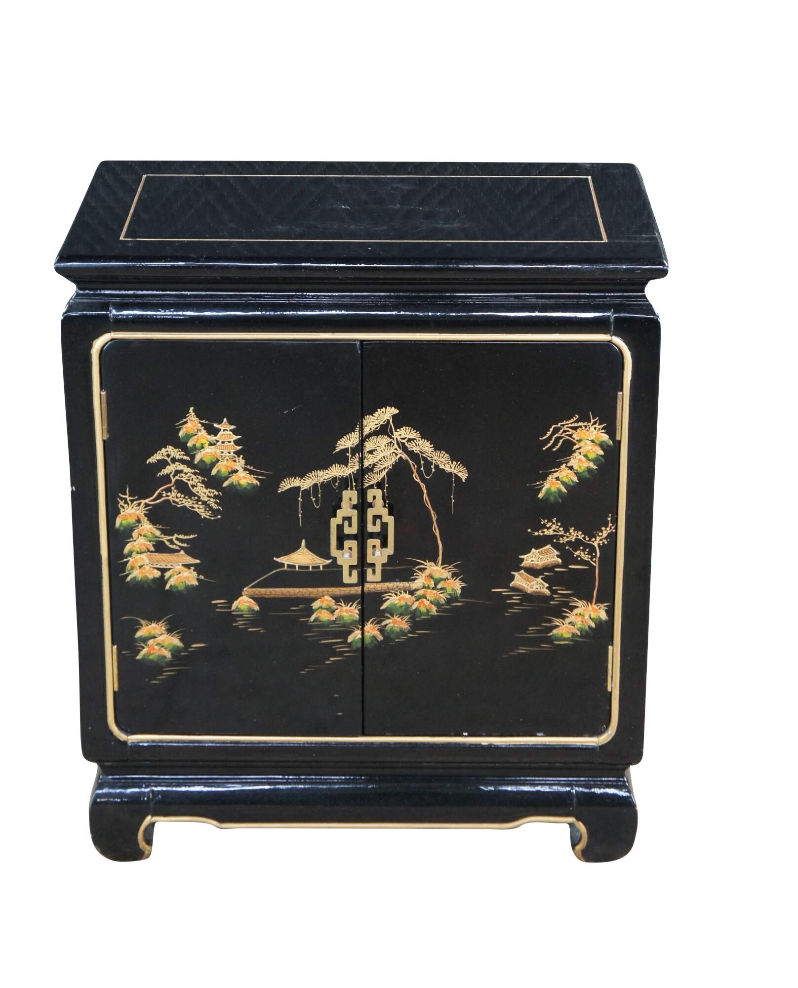 Late 20th Century Chinese Cabinet. Features black trimmed in gold with a geisha scene along the front. The cabinet opens to one shelf for accessory storage.