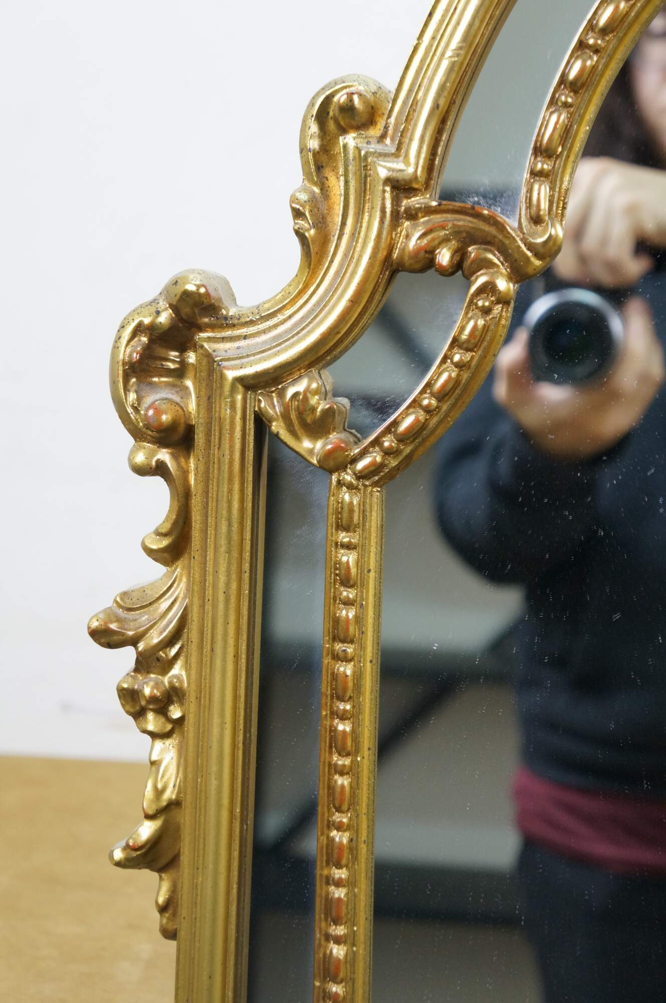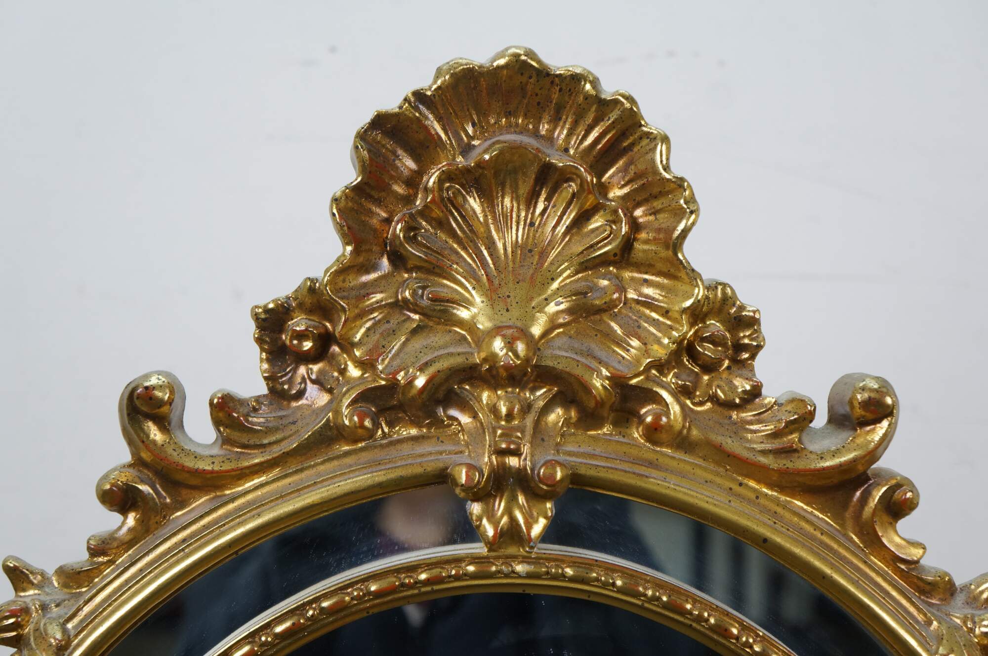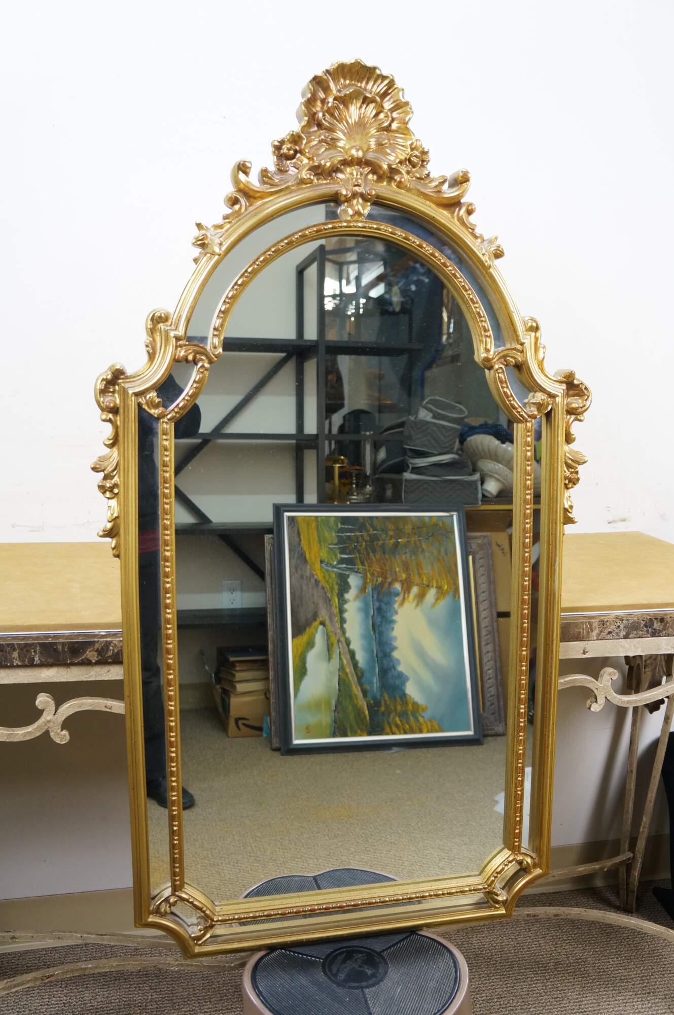 Late 20th century giltwood wall mirror by Carolina Mirror Company - tall arched design with cut corners, festooned with beaded edge inner border, foliate and acanthus swirls, and a scallop shell crest.