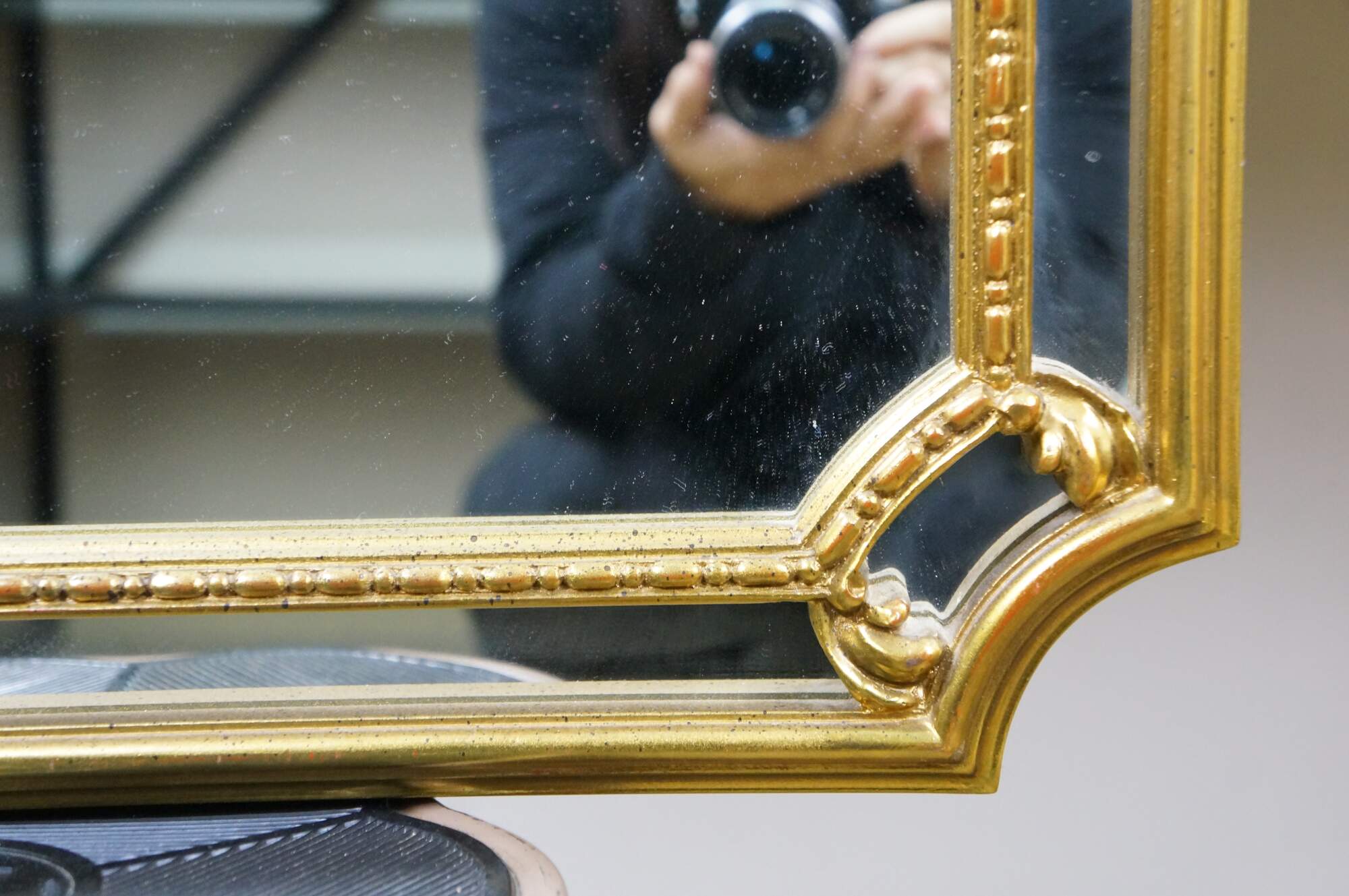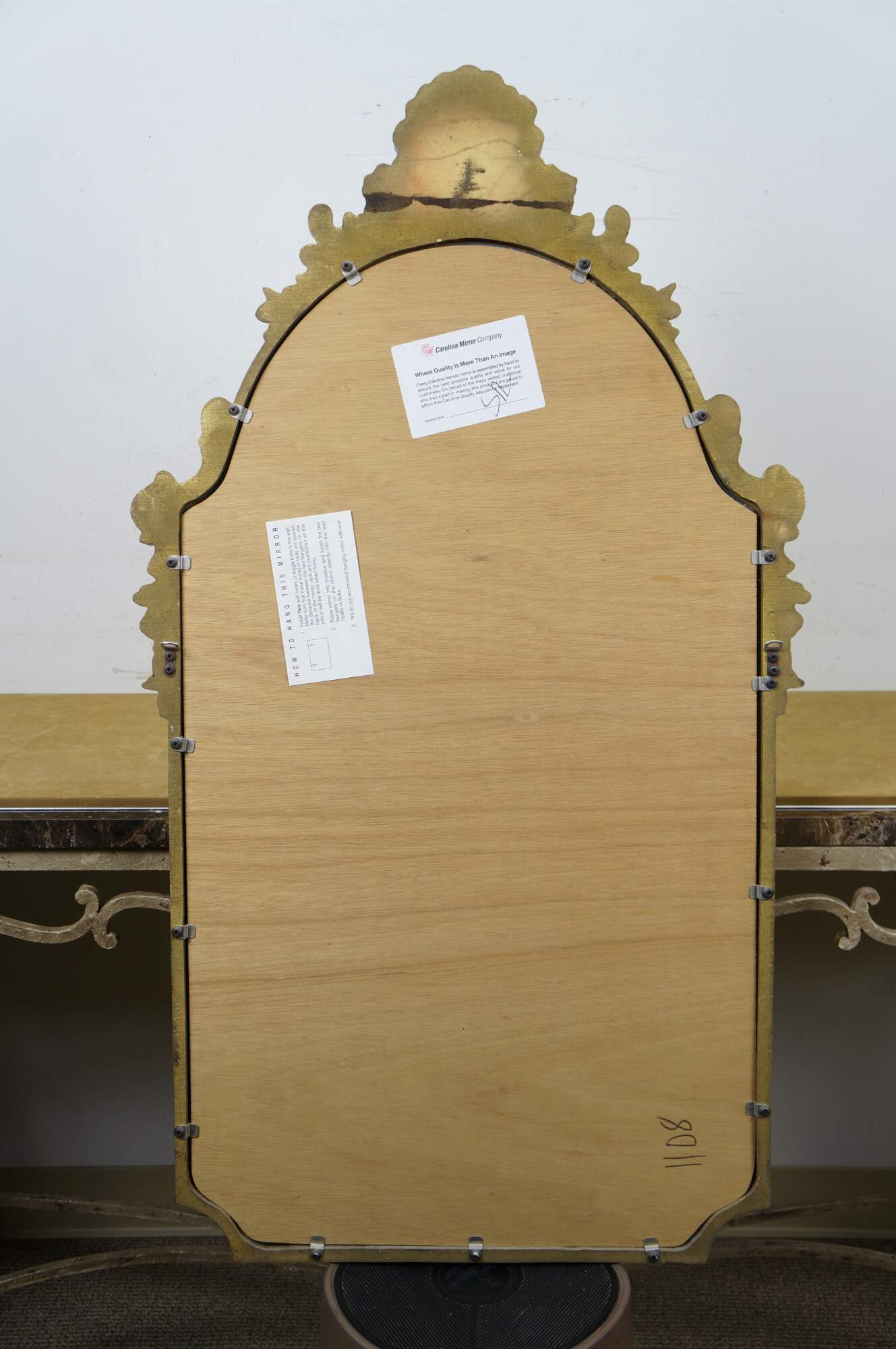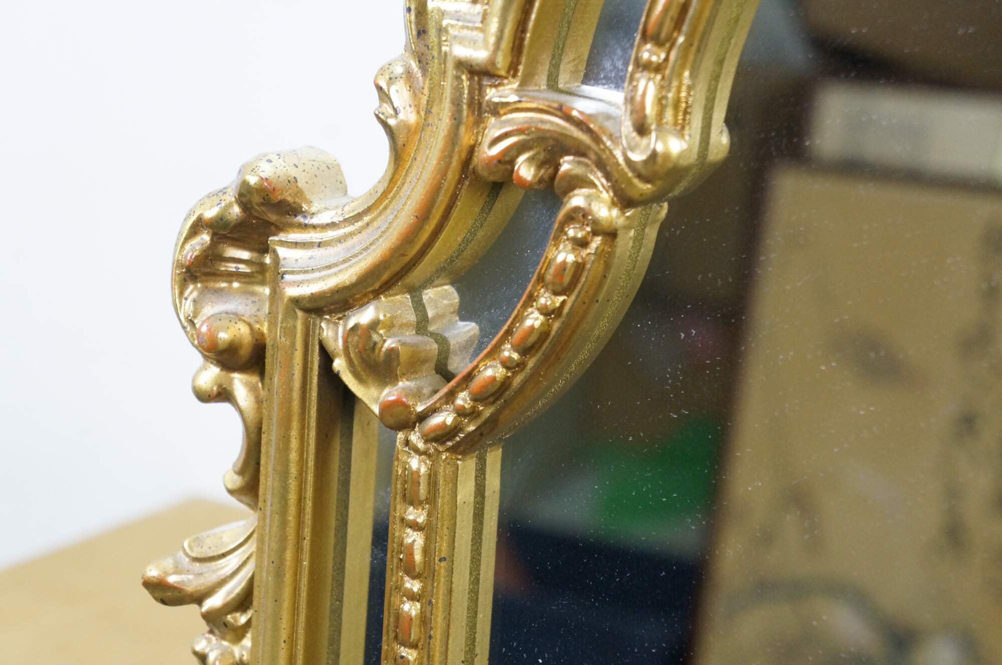 Late 20th century giltwood wall mirror by Carolina Mirror Company - tall arched design with cut corners, festooned with beaded edge inner border, foliate and acanthus swirls, and a scallop shell crest.