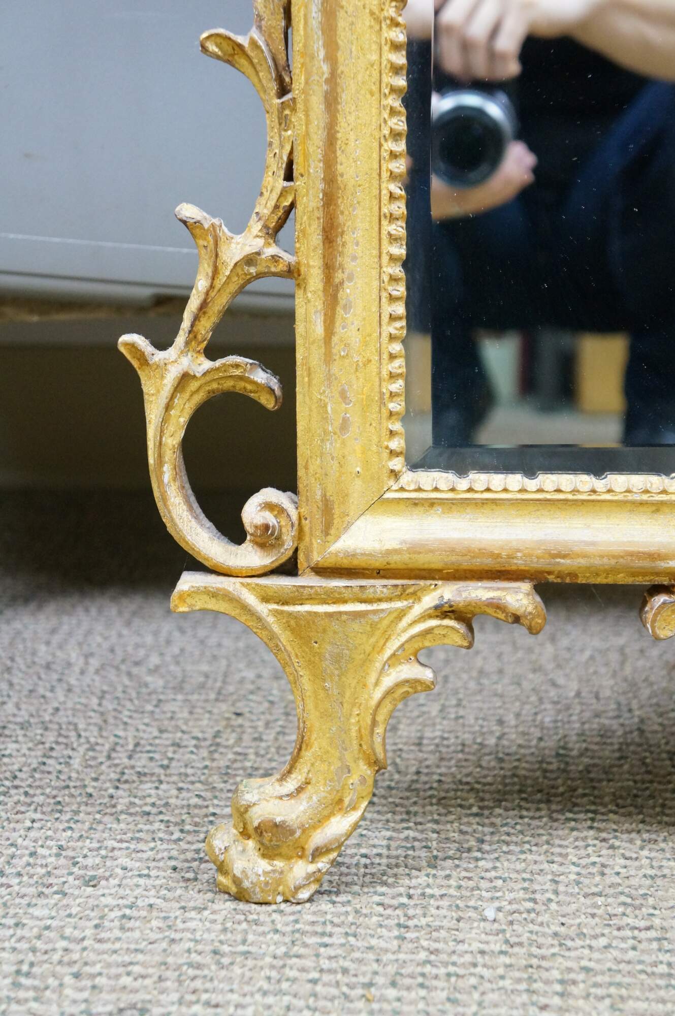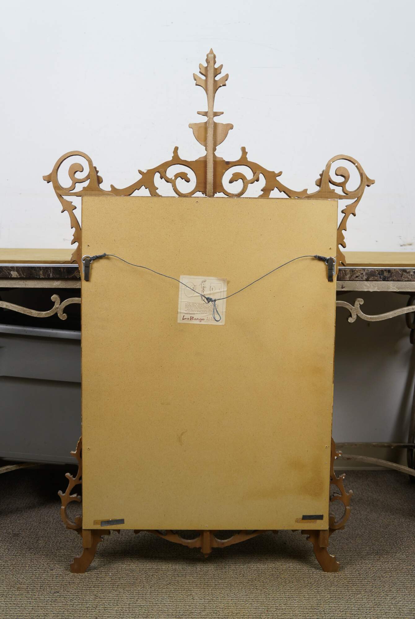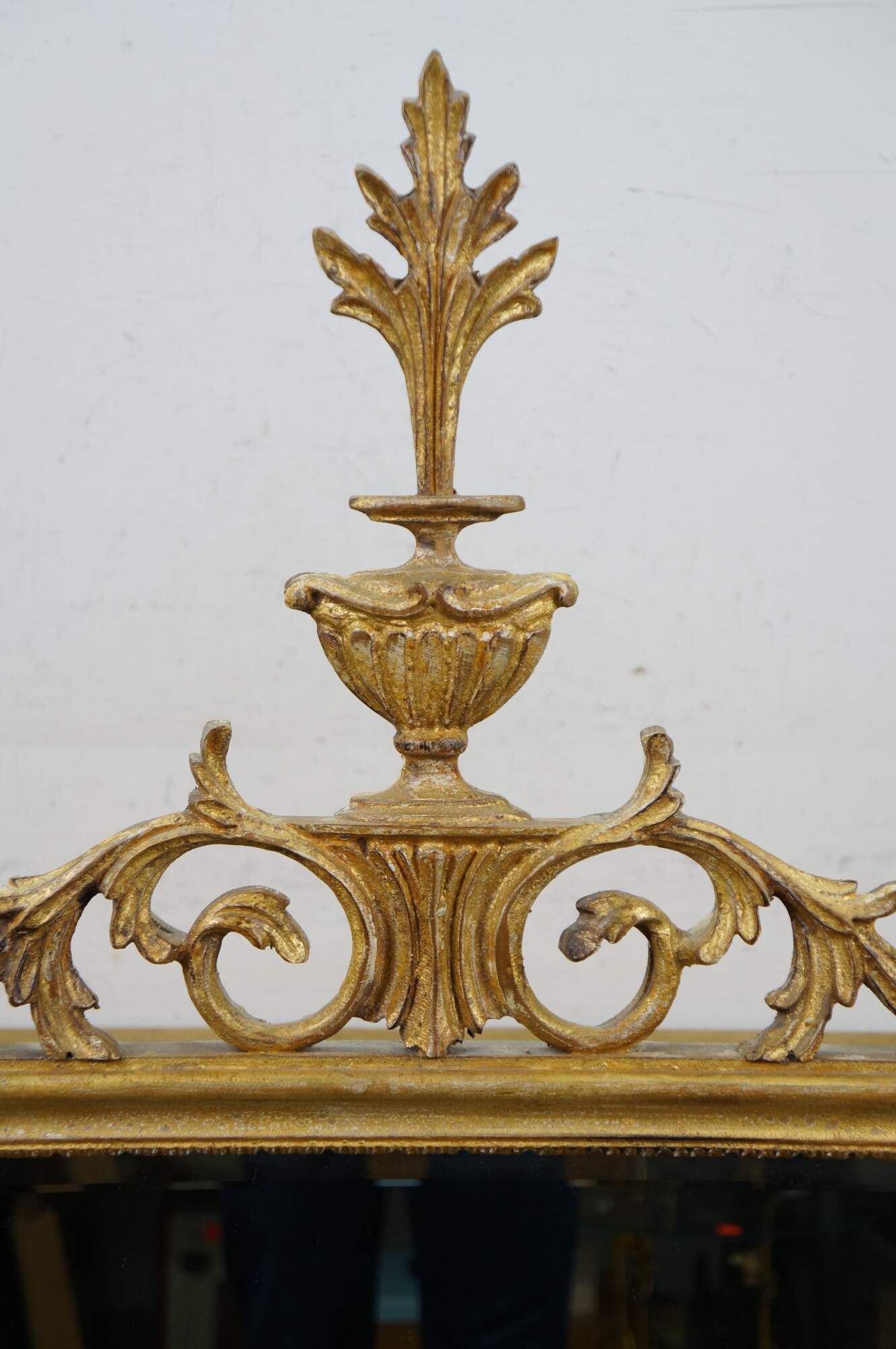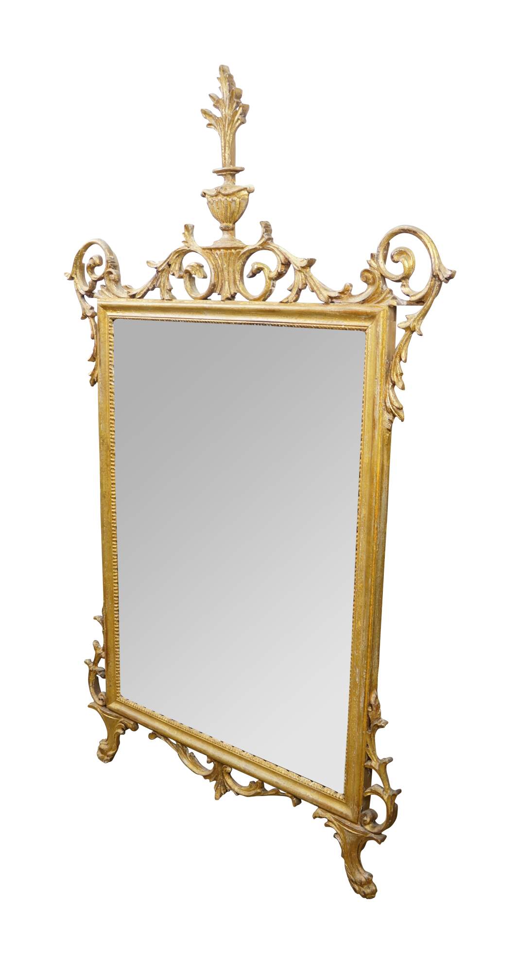 Circa mid 20th century La Barge number 1628B giltwood beveled glass wall mirror, featuring Italian Hollywood Regency / Neoclassical styling with delicate scrolling acanthus foliate crest and corners, paw feet, and manel urn.