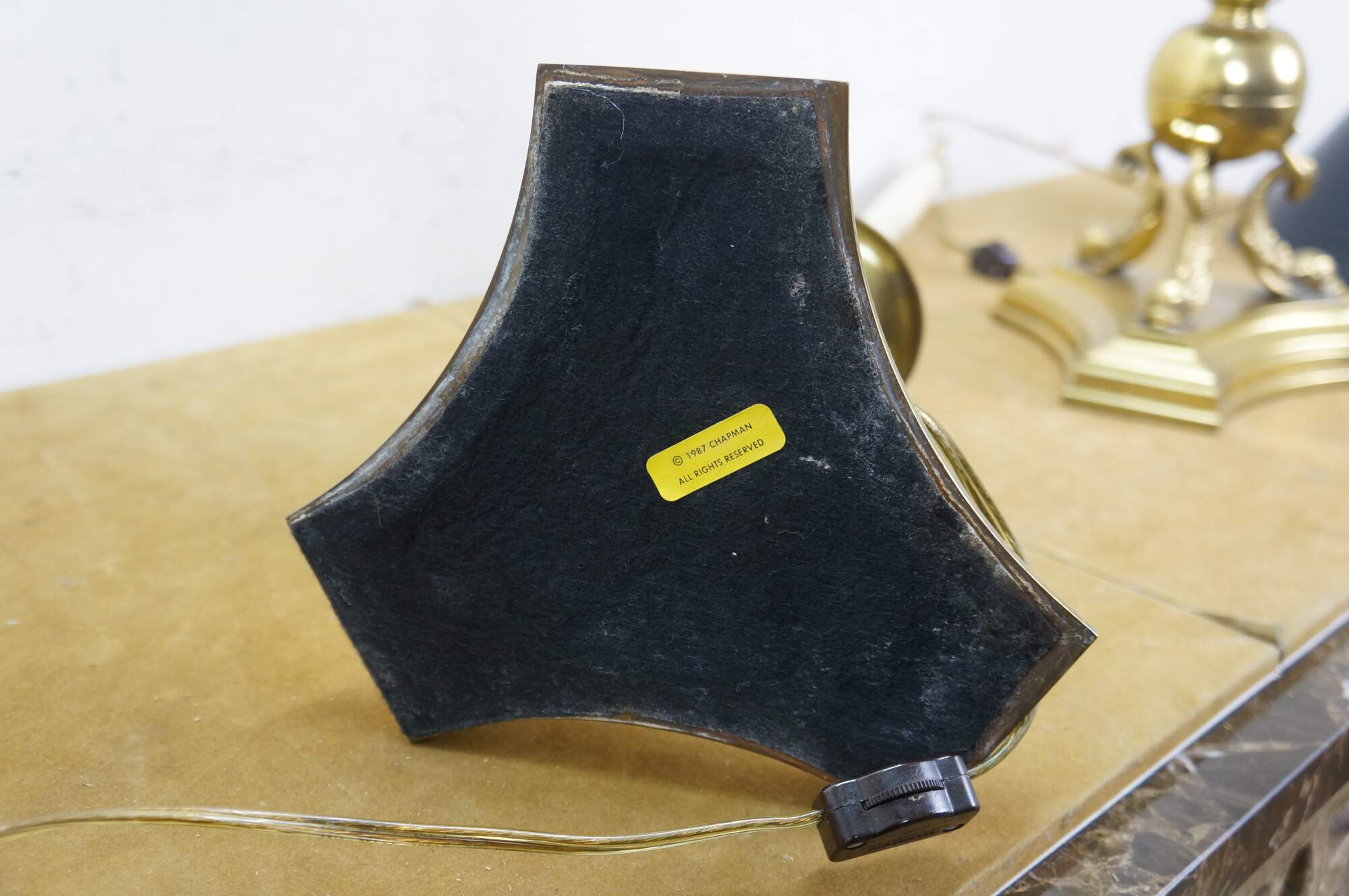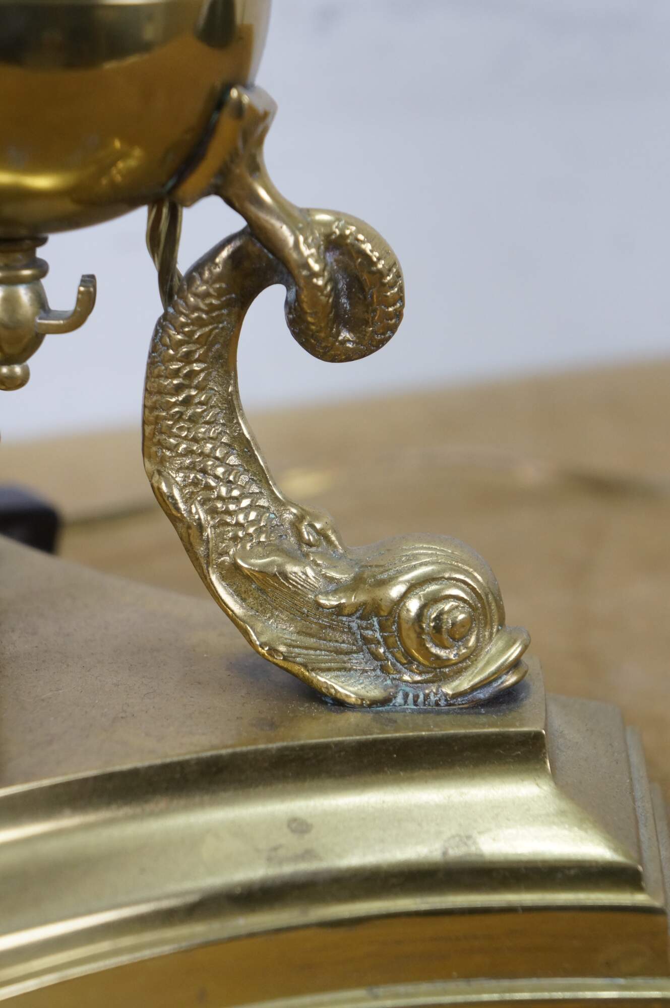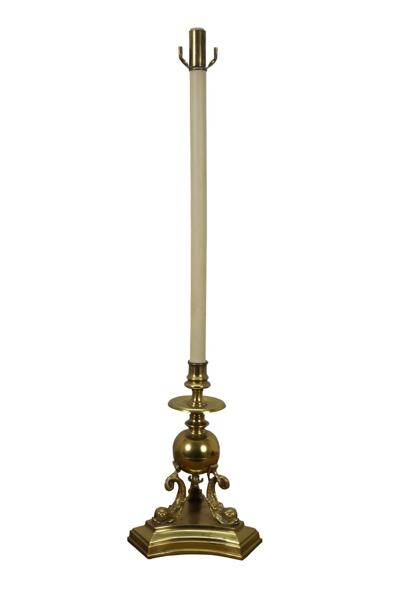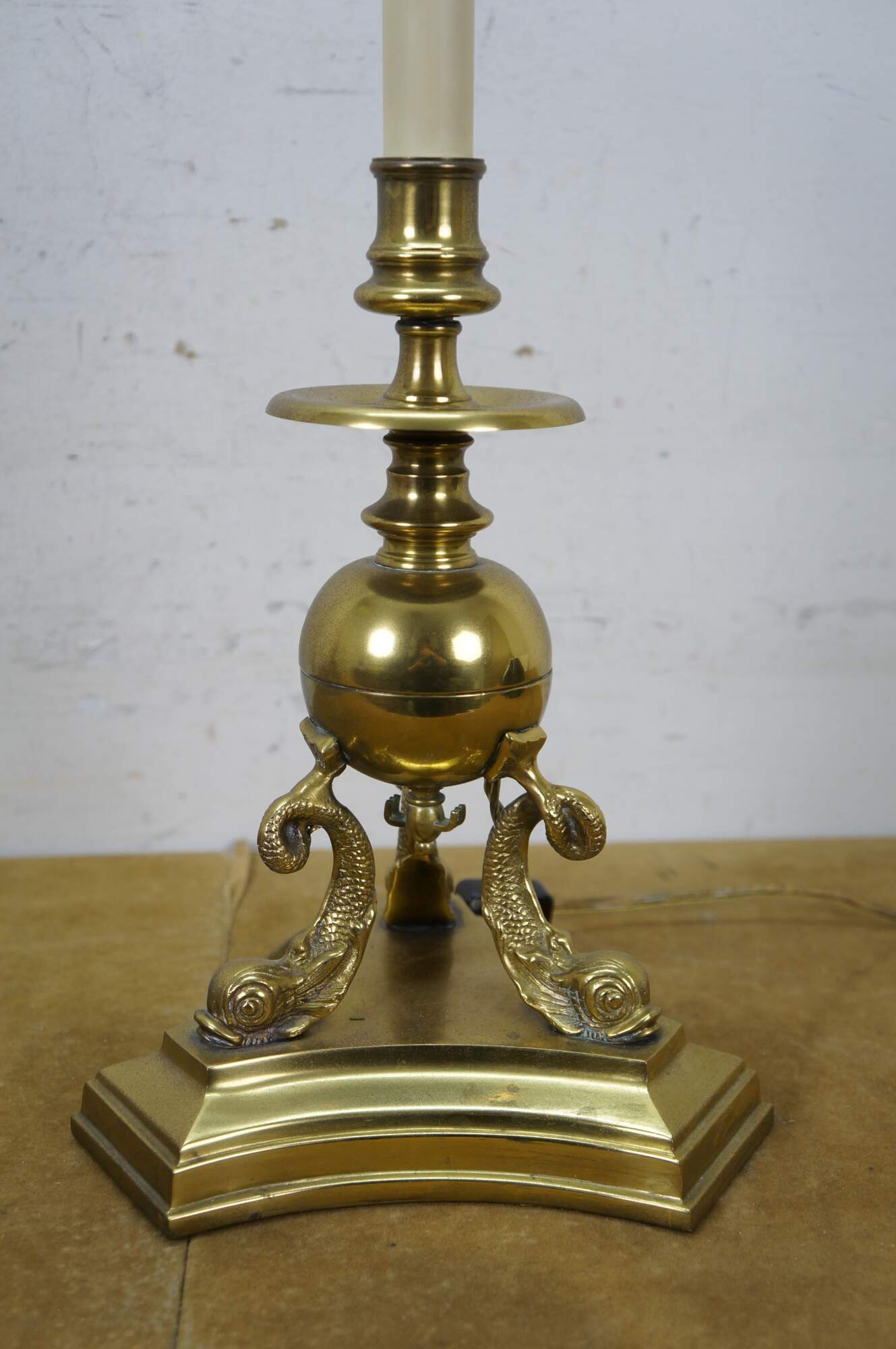 Pair of vintage 1987 Chapman brass buffet / table lamps. Long faux candlesticks in holders set on brightly polished brass orbs, balanced on the tails of three delphin / classical dolphins on triangular bases. Includes harps, fin shaped finials, and fish scale pattern shades with foiled interiors.