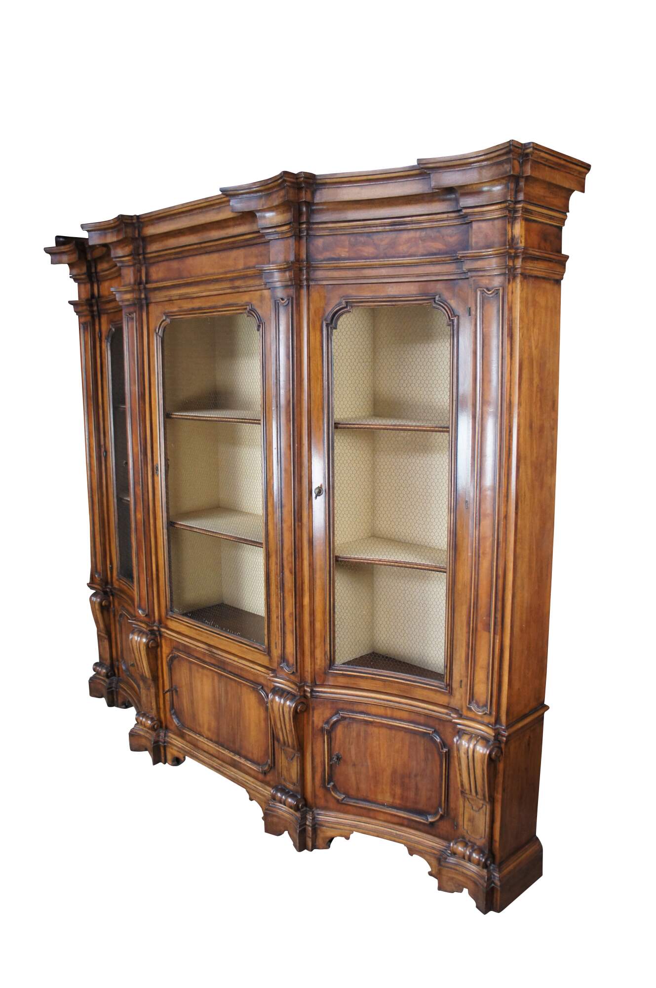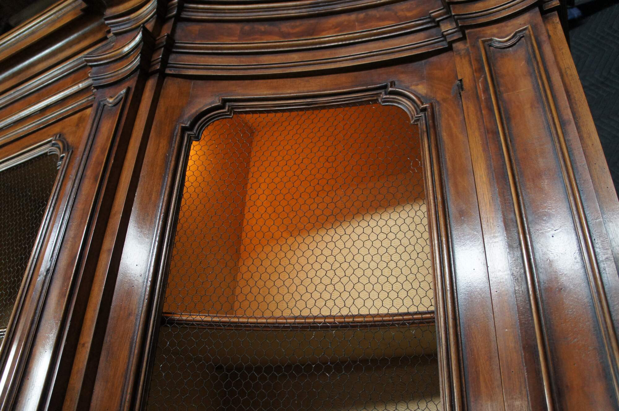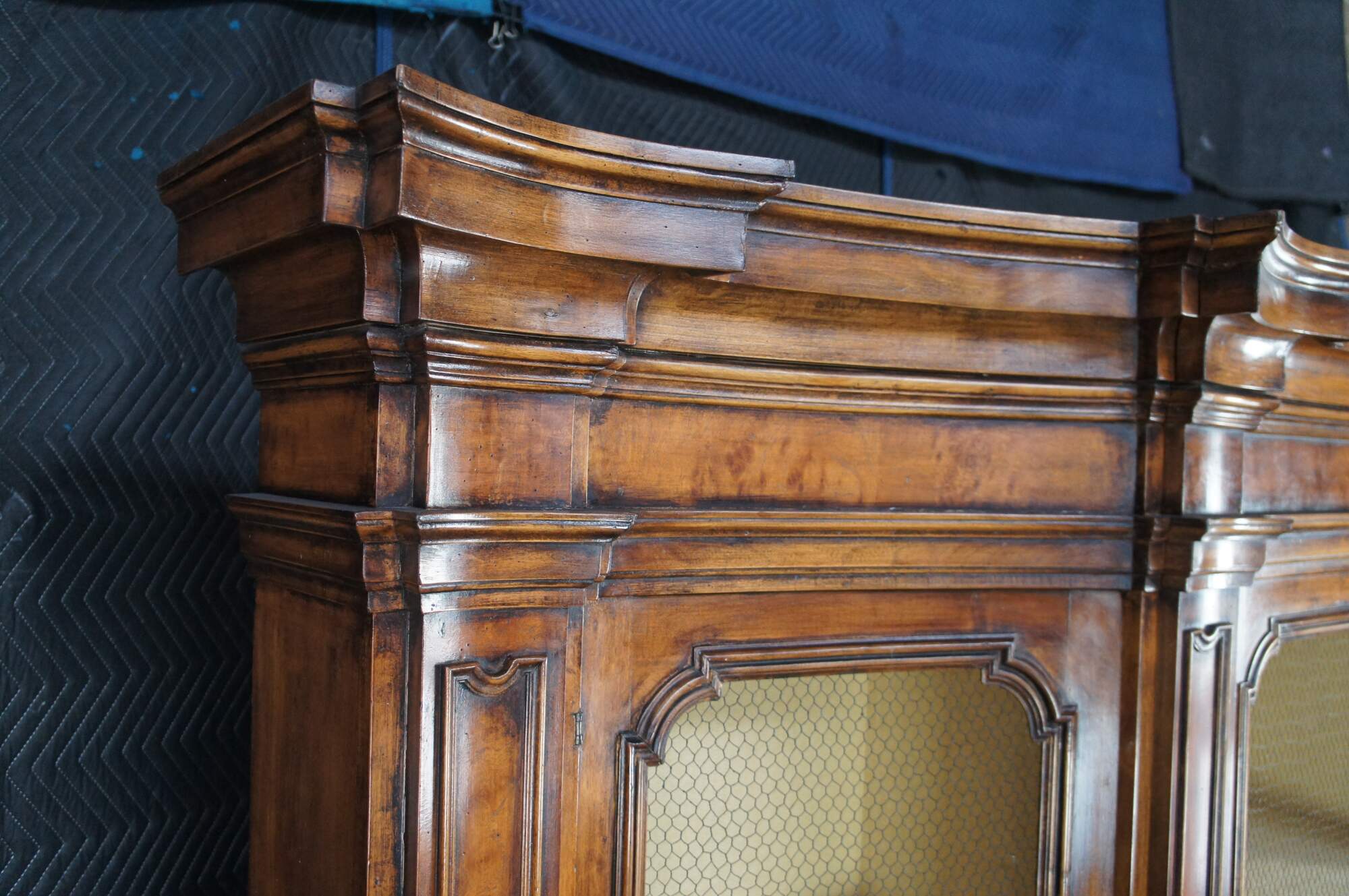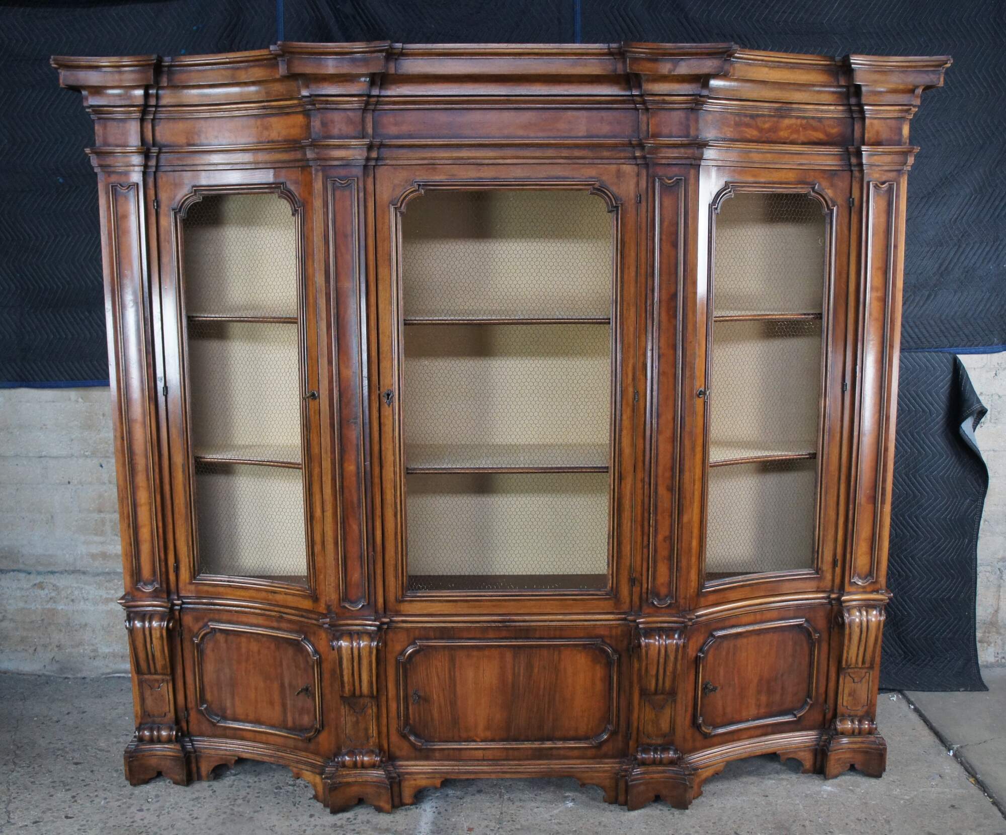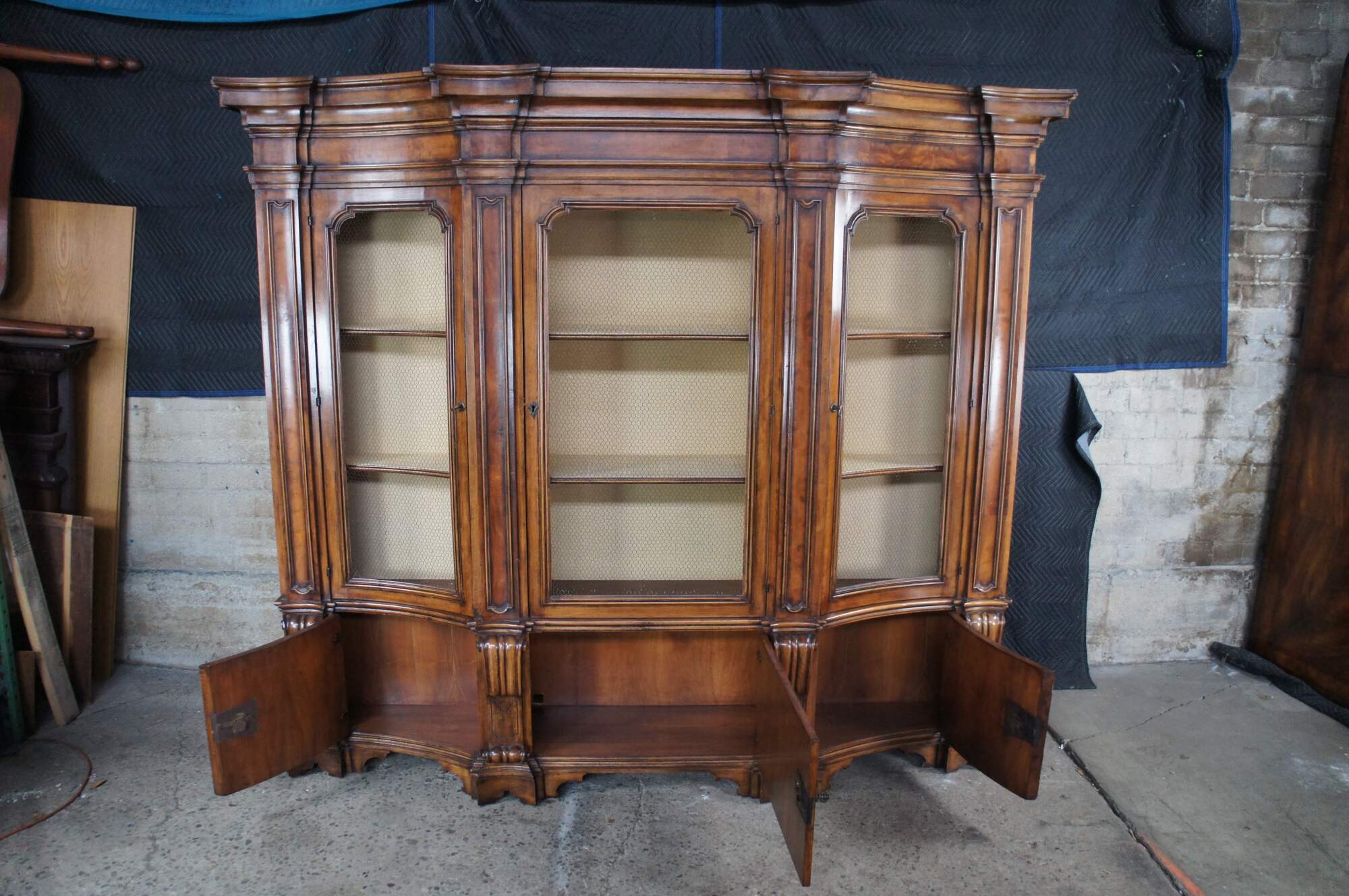 Mid century Wellington Hall breakfront library bookcase or china cabinet. Handmade in Italy from Italian walnut featuring beautful columns, linen lined interior and chicken wire mesh doors. Lower portion of the cabinet shwocases scrolled columns and lower lockable doors with old world hardware. The cabinet was shipped from Italy to Wellington Hall in 1972.