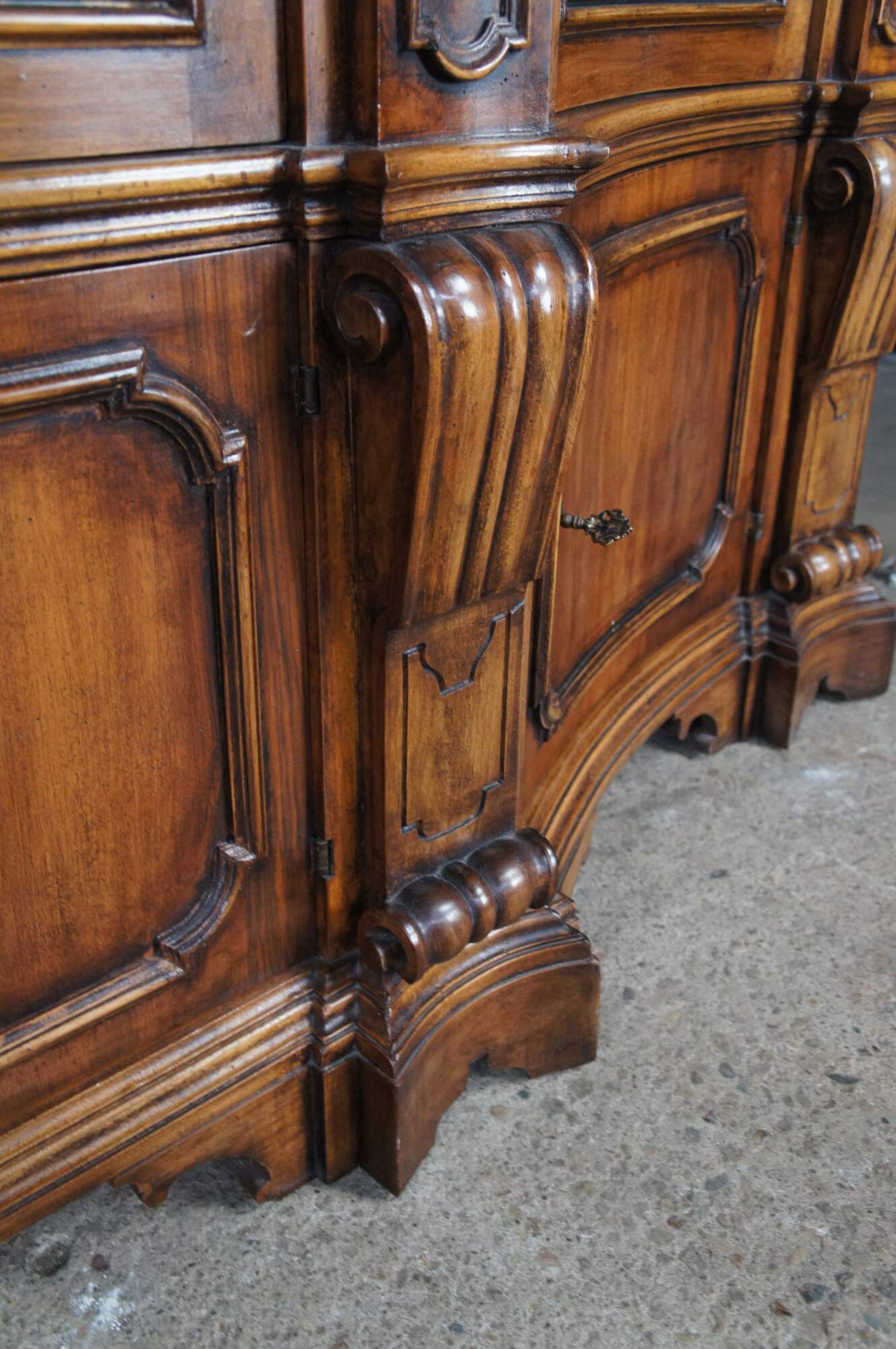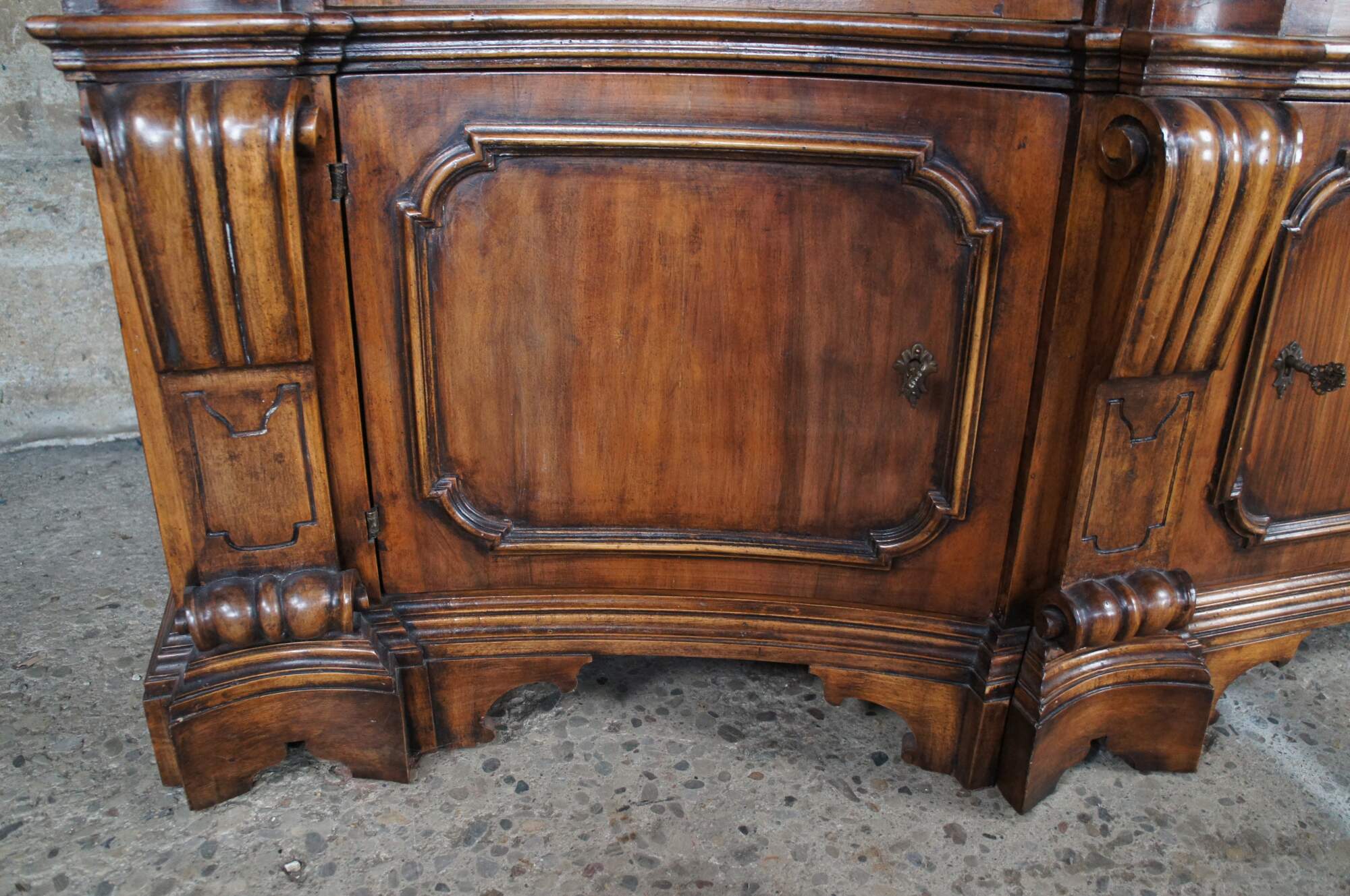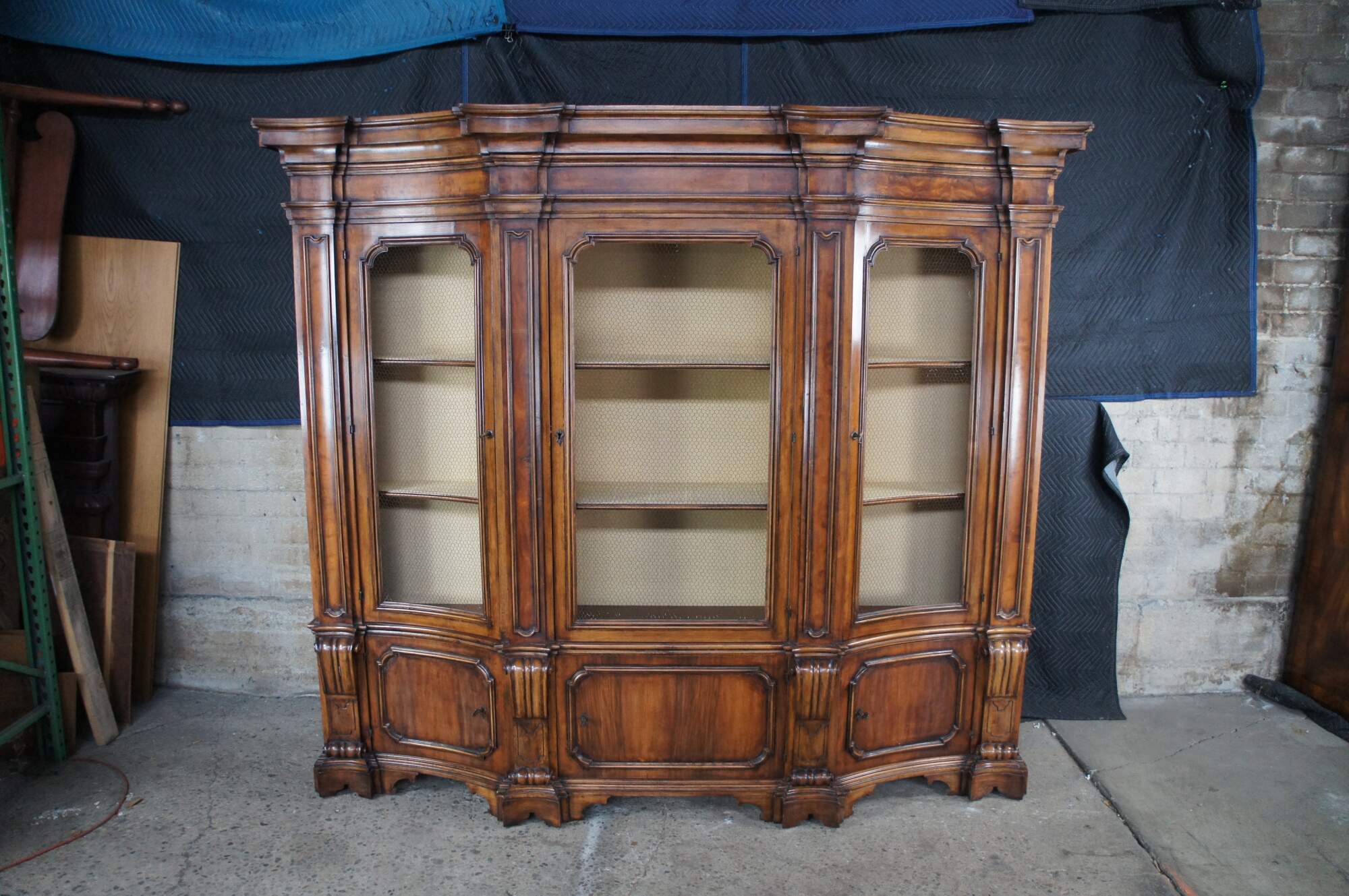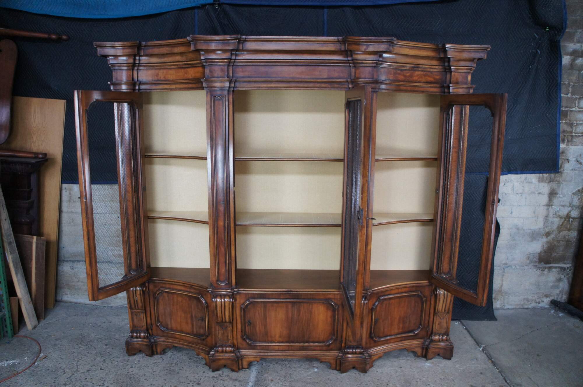 Mid century Wellington Hall breakfront library bookcase or china cabinet. Handmade in Italy from Italian walnut featuring beautful columns, linen lined interior and chicken wire mesh doors. Lower portion of the cabinet shwocases scrolled columns and lower lockable doors with old world hardware. The cabinet was shipped from Italy to Wellington Hall in 1972.
