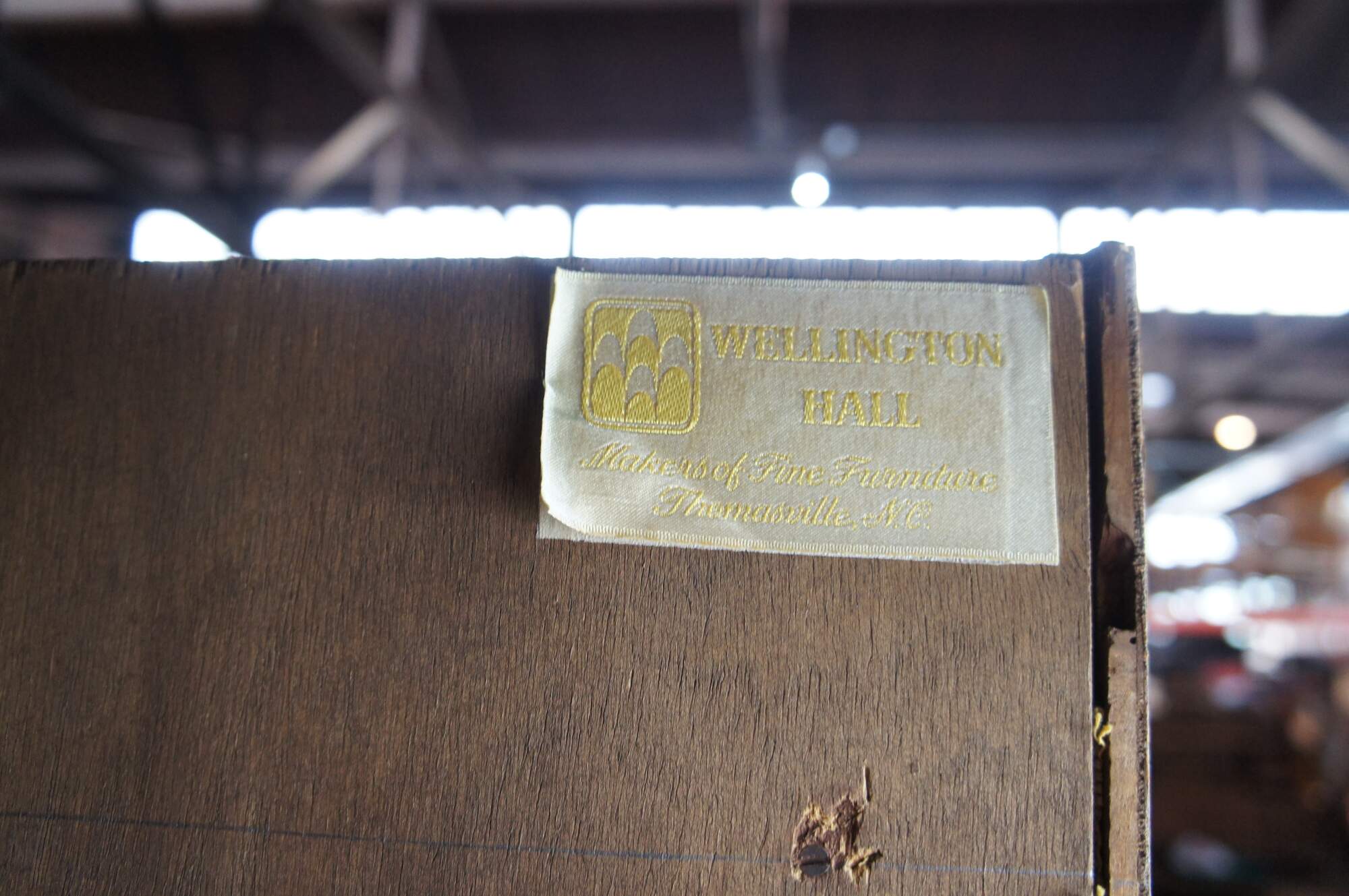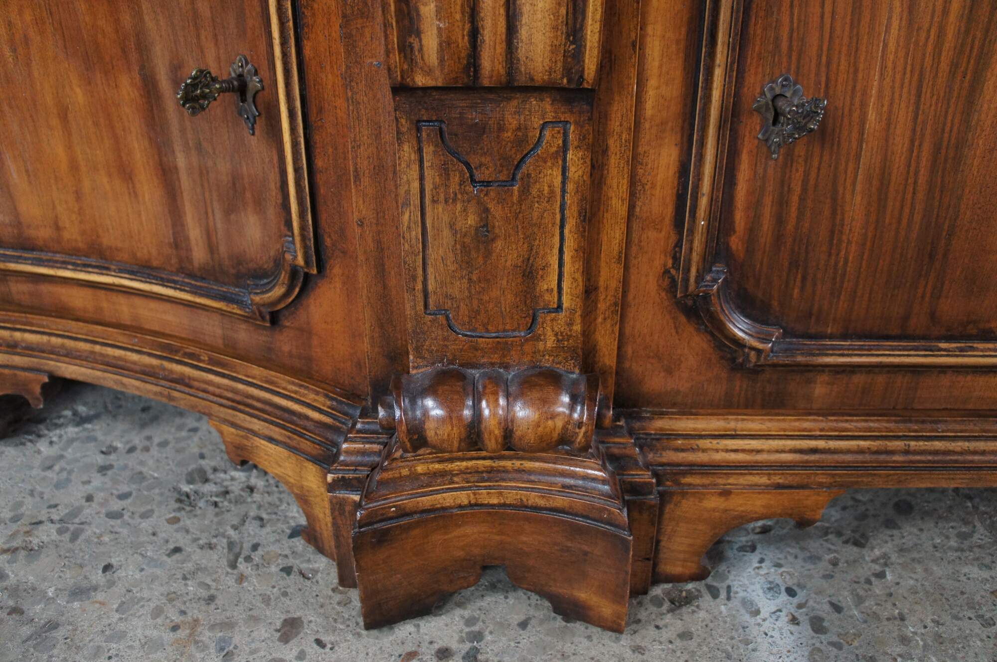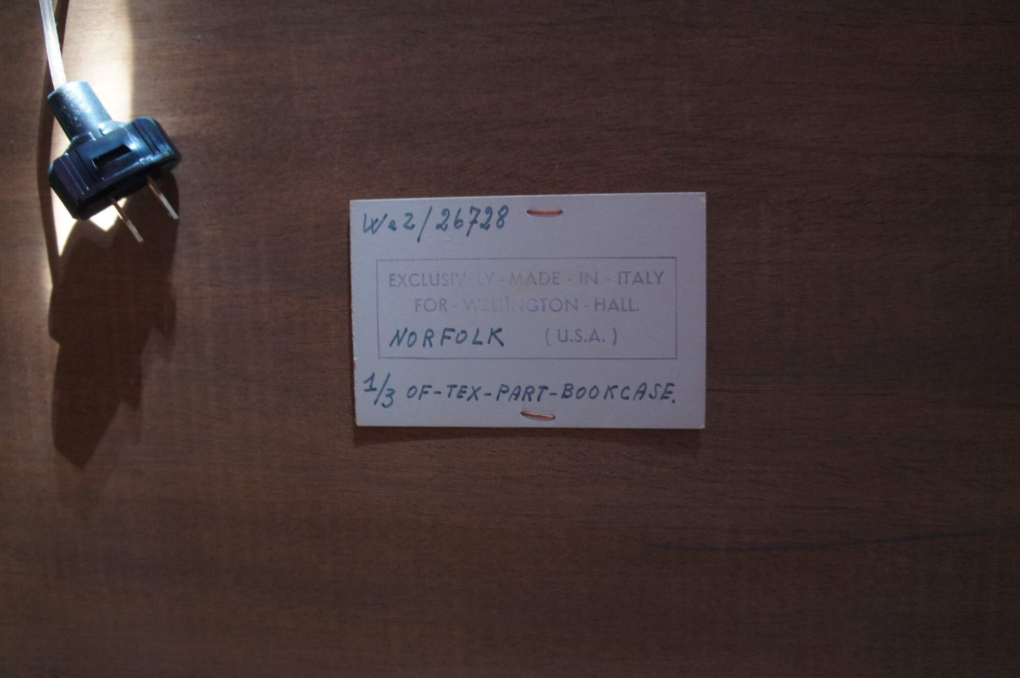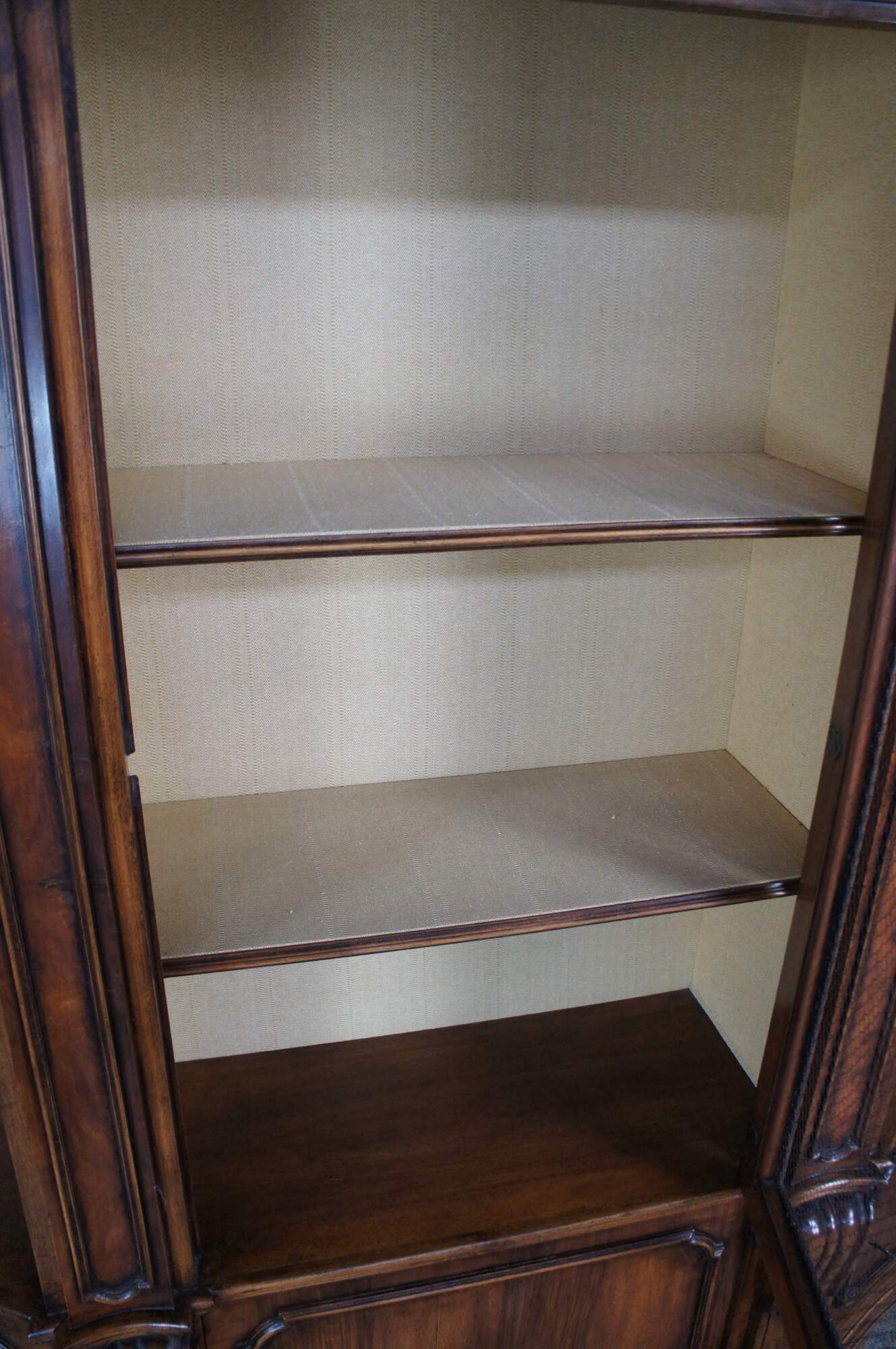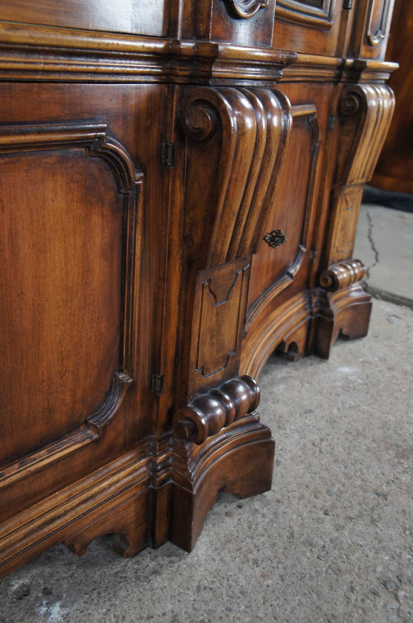 Mid century Wellington Hall breakfront library bookcase or china cabinet. Handmade in Italy from Italian walnut featuring beautful columns, linen lined interior and chicken wire mesh doors. Lower portion of the cabinet shwocases scrolled columns and lower lockable doors with old world hardware. The cabinet was shipped from Italy to Wellington Hall in 1972.