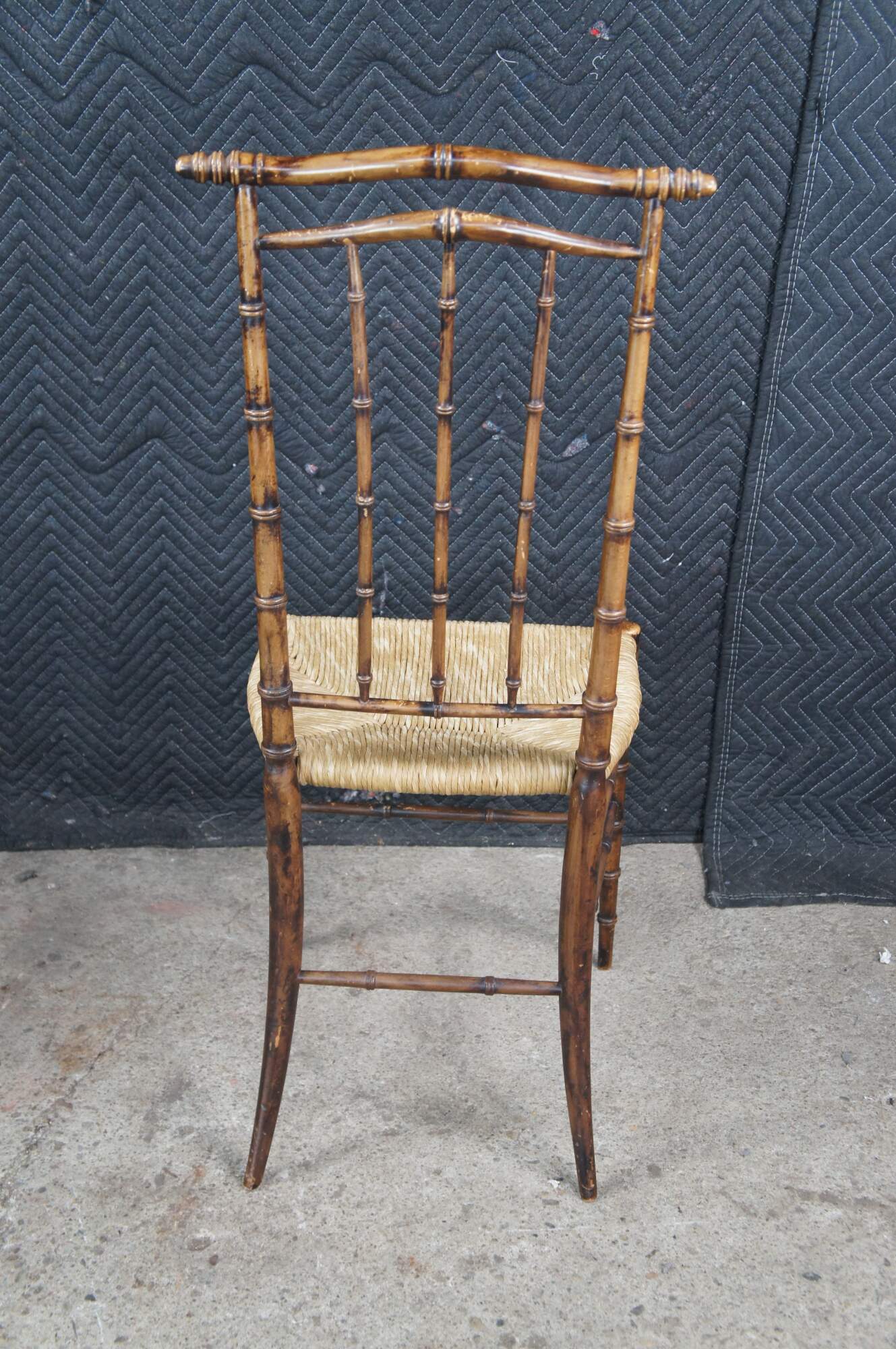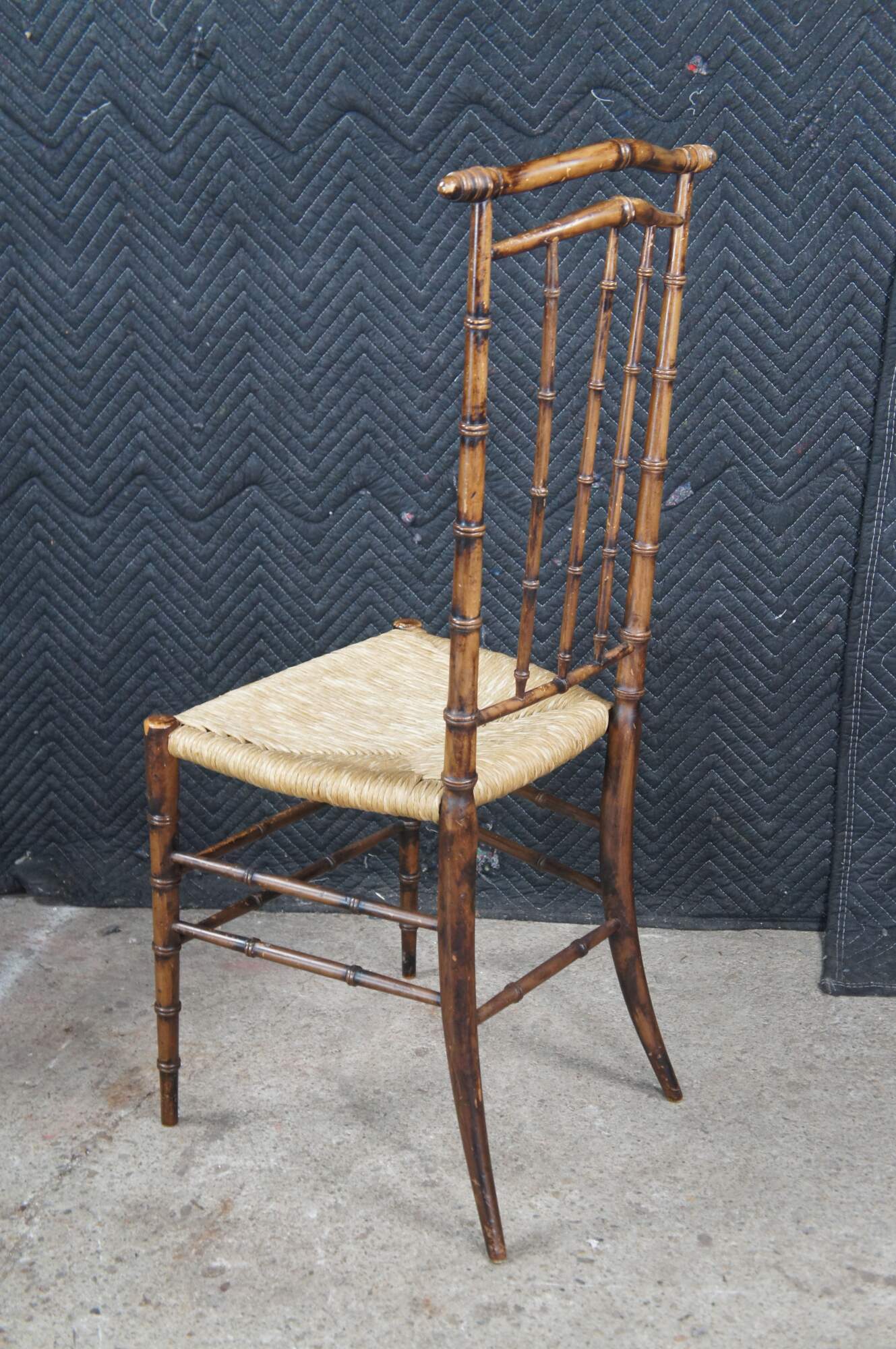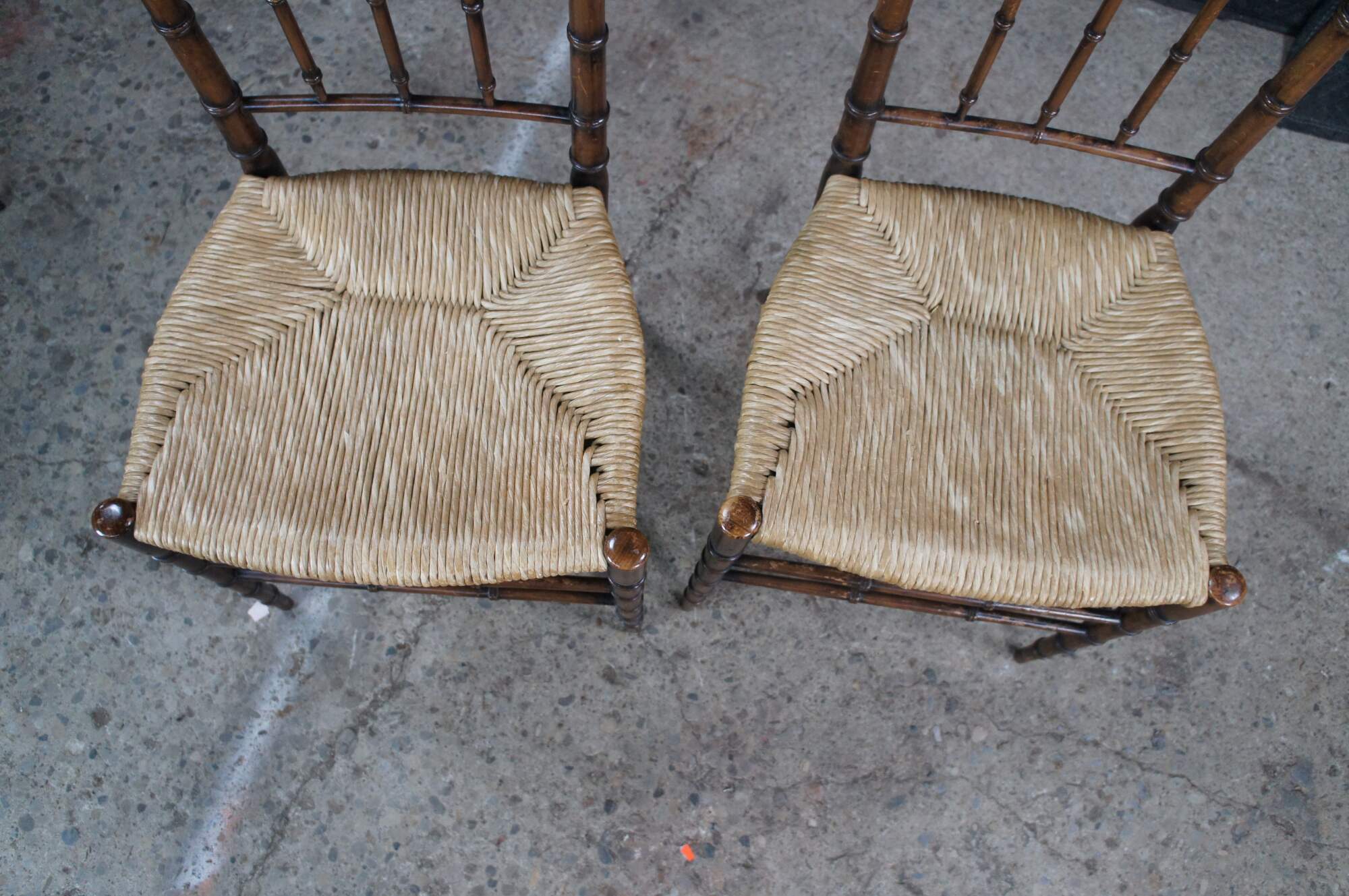 Pair of two mid century circa 1970s high back side dining chairs. Made of Beech or Beechwood featuring a chinoiserie design with faux bamboo slatted supports and rush seats.