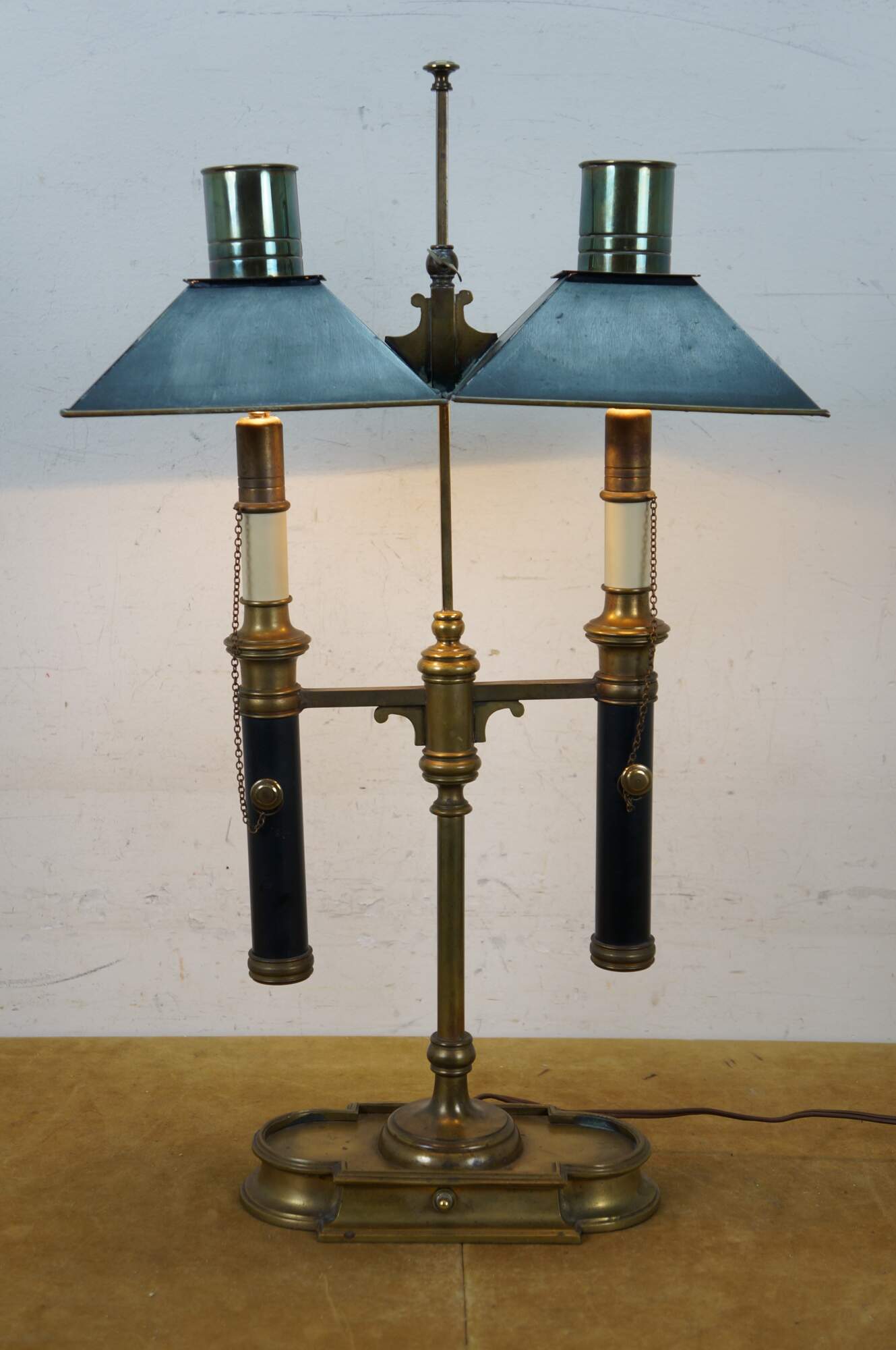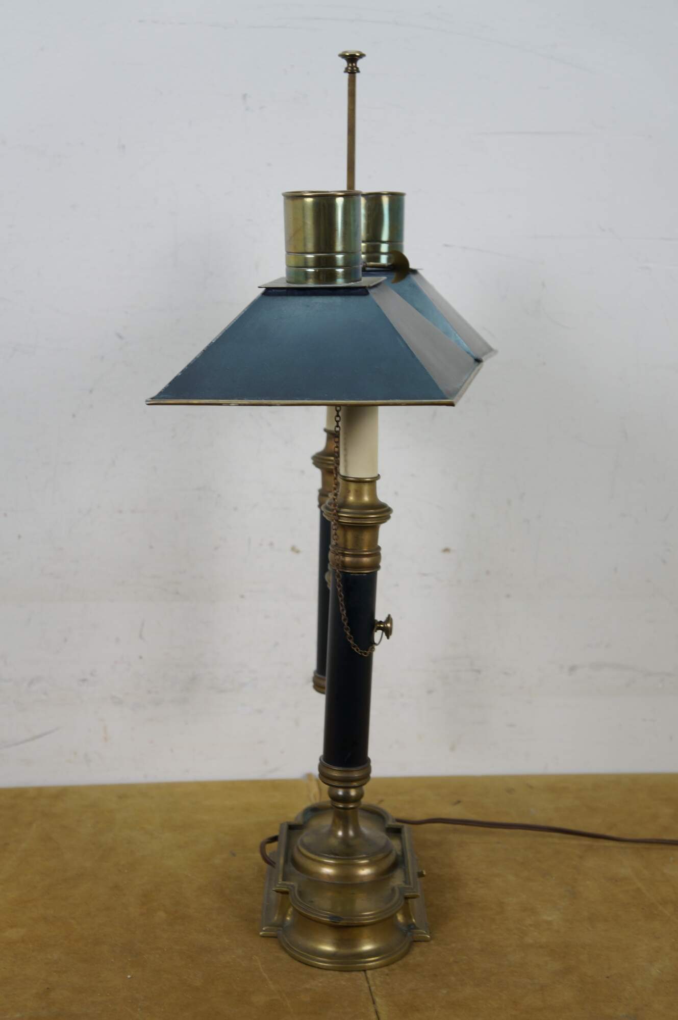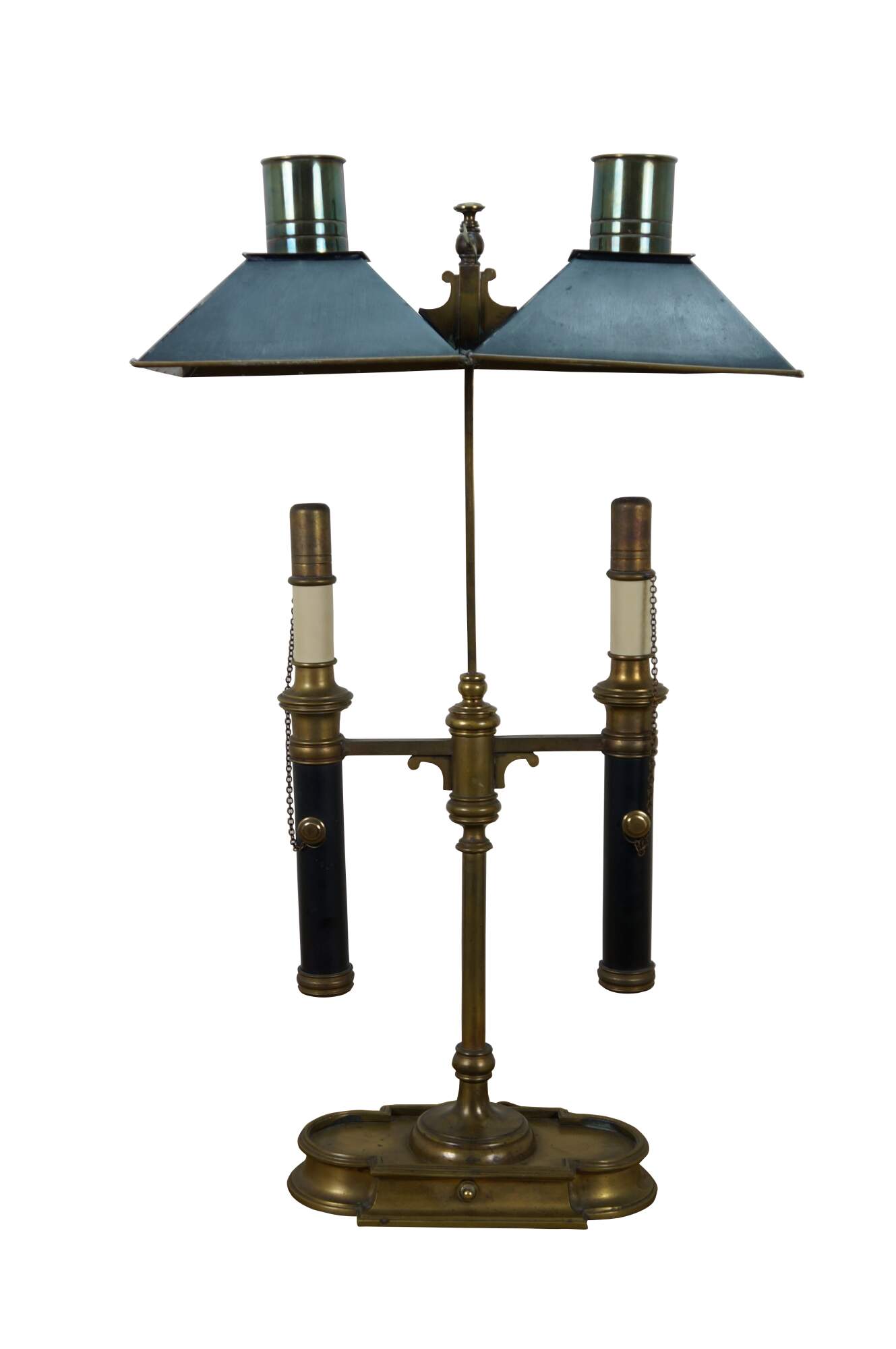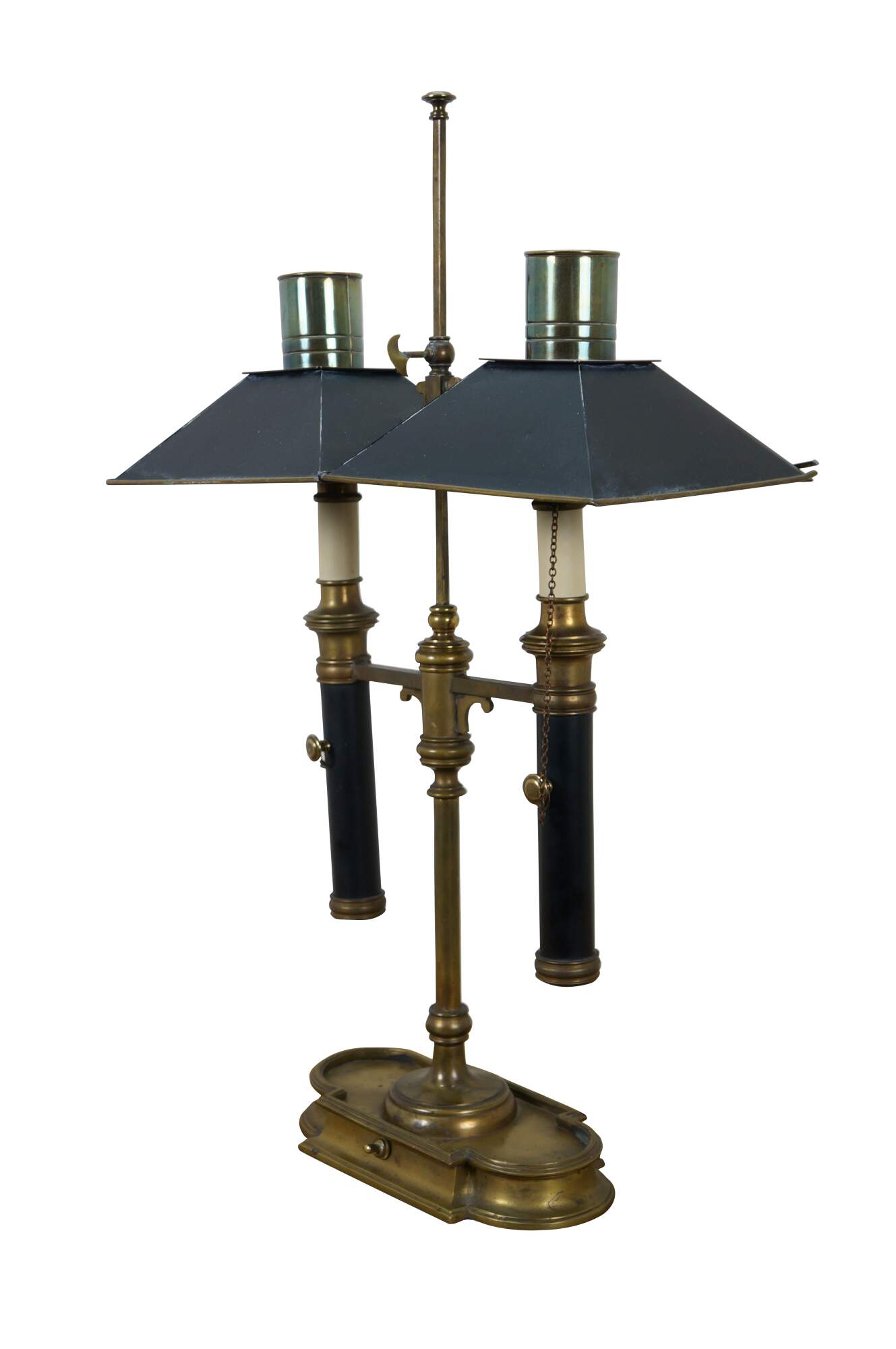 Circa 1970s Chapman brass Empire-style bouillotte two-light table lamp. Shaped like a two-arm candelabra on a lobed base with a pair of faux candlesticks with chained caps, underneath square metal shades with chimneys. Height of shades is adjustable.