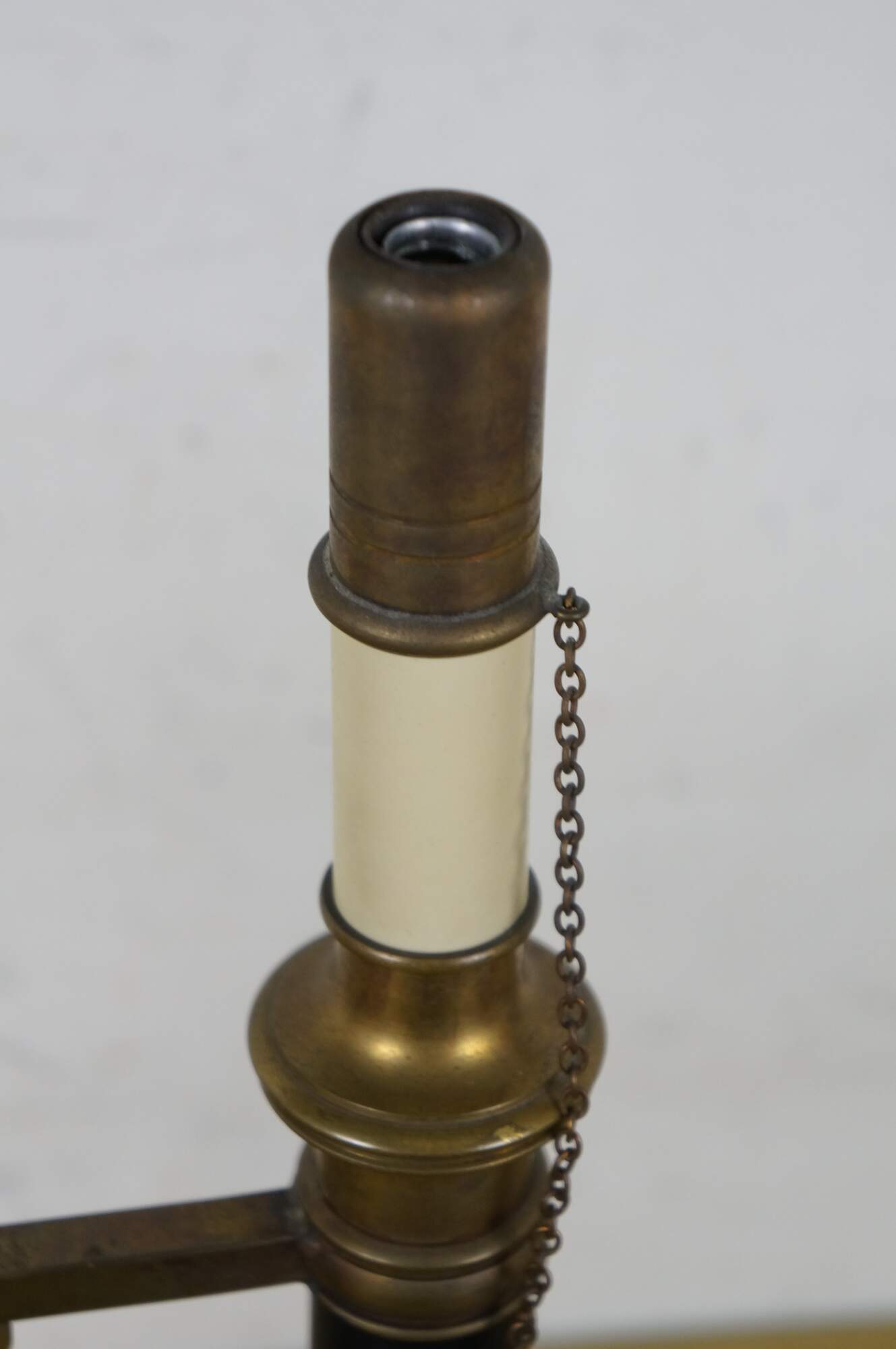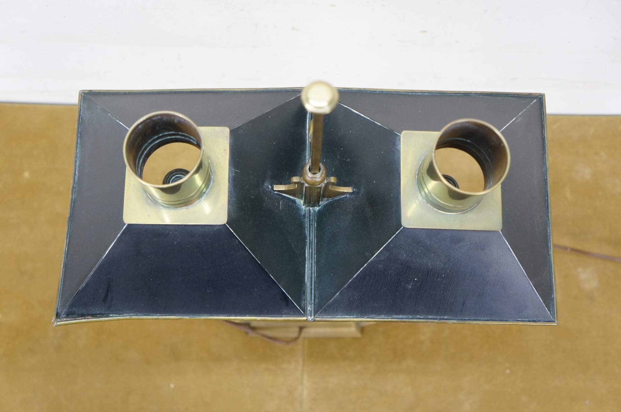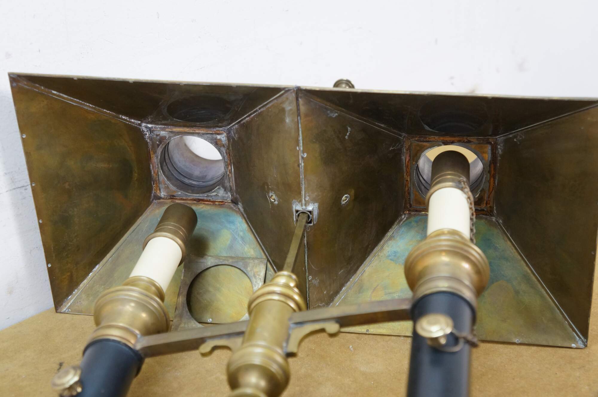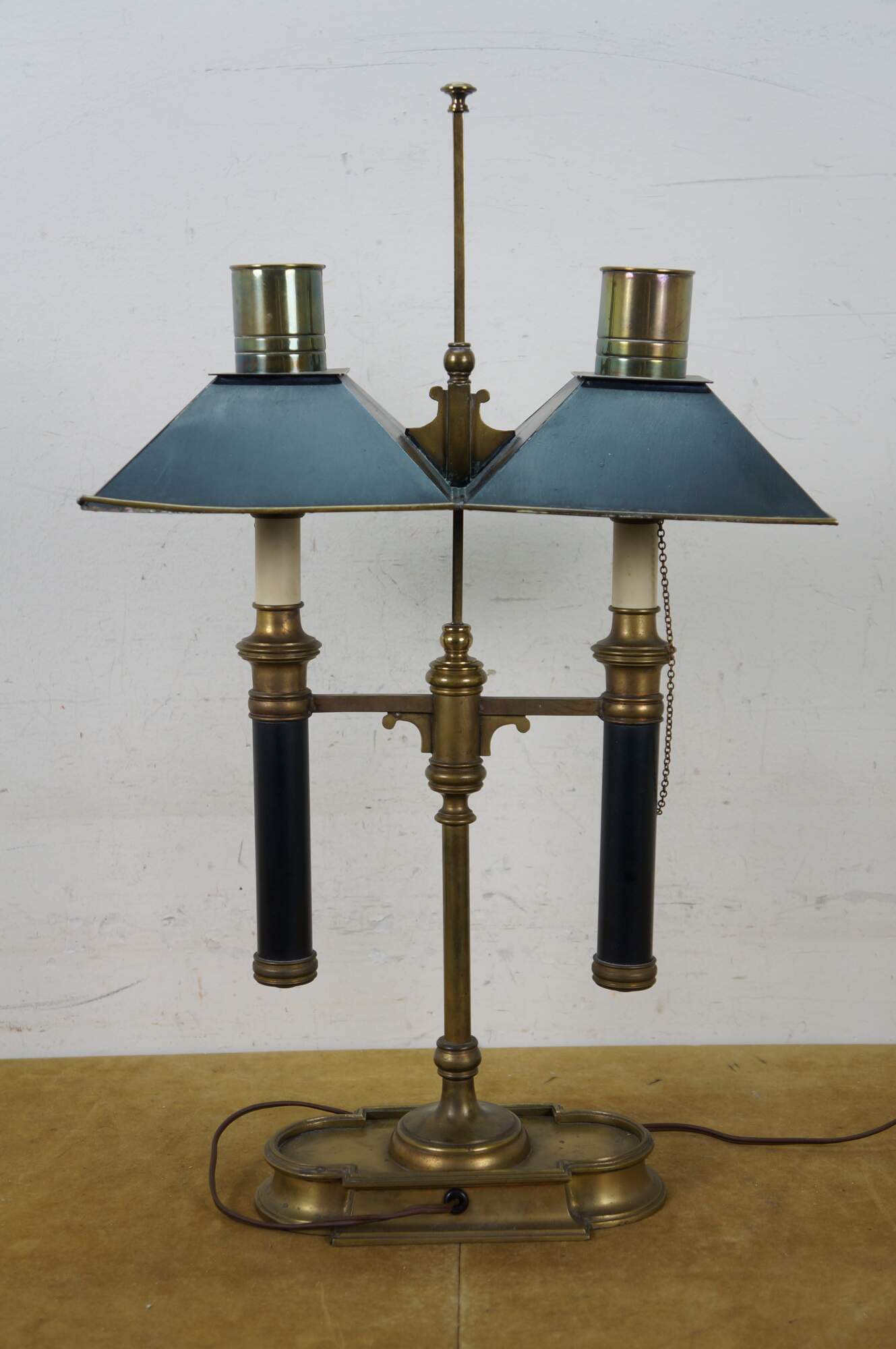 Circa 1970s Chapman brass Empire-style bouillotte two-light table lamp. Shaped like a two-arm candelabra on a lobed base with a pair of faux candlesticks with chained caps, underneath square metal shades with chimneys. Height of shades is adjustable.