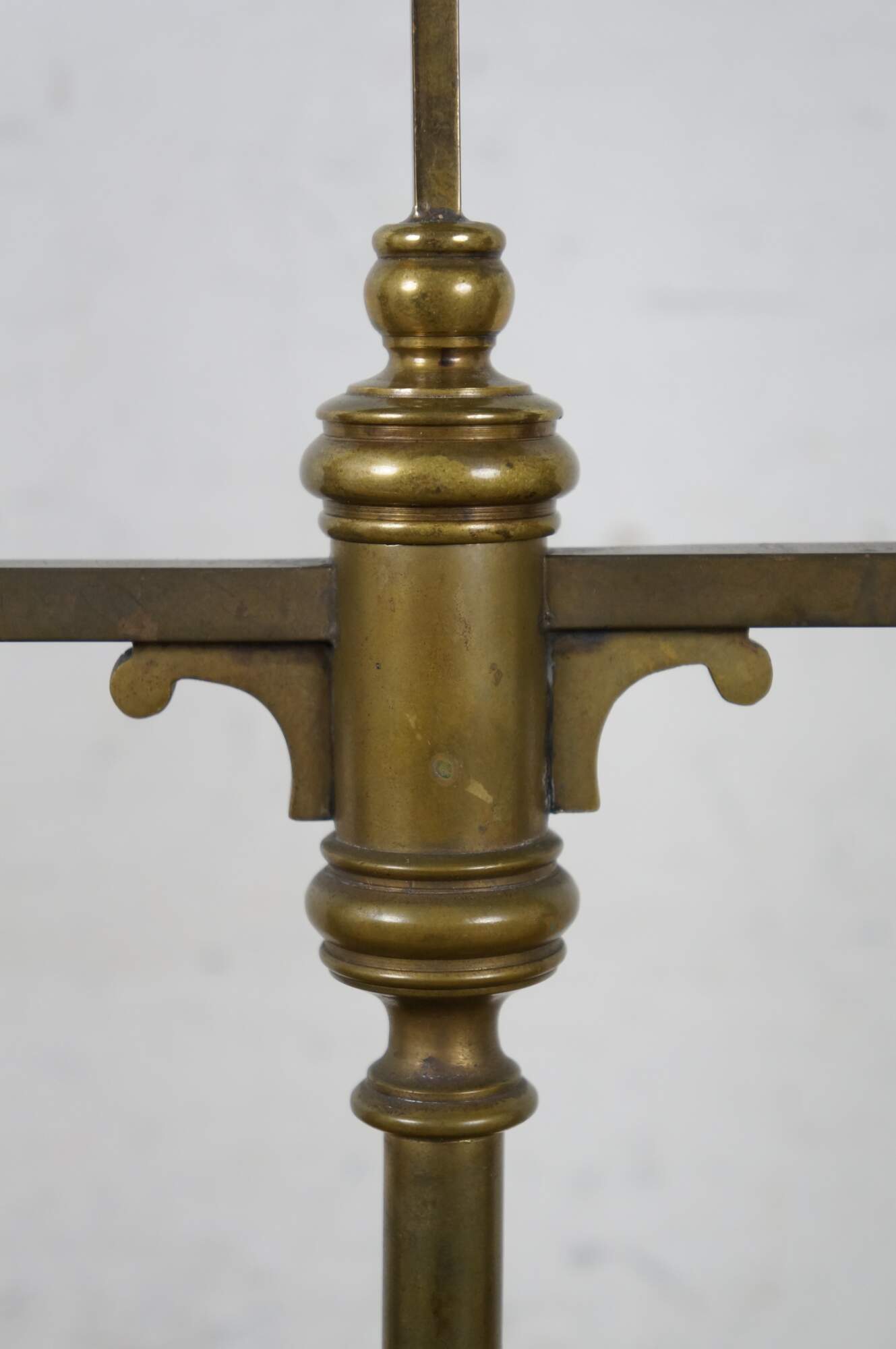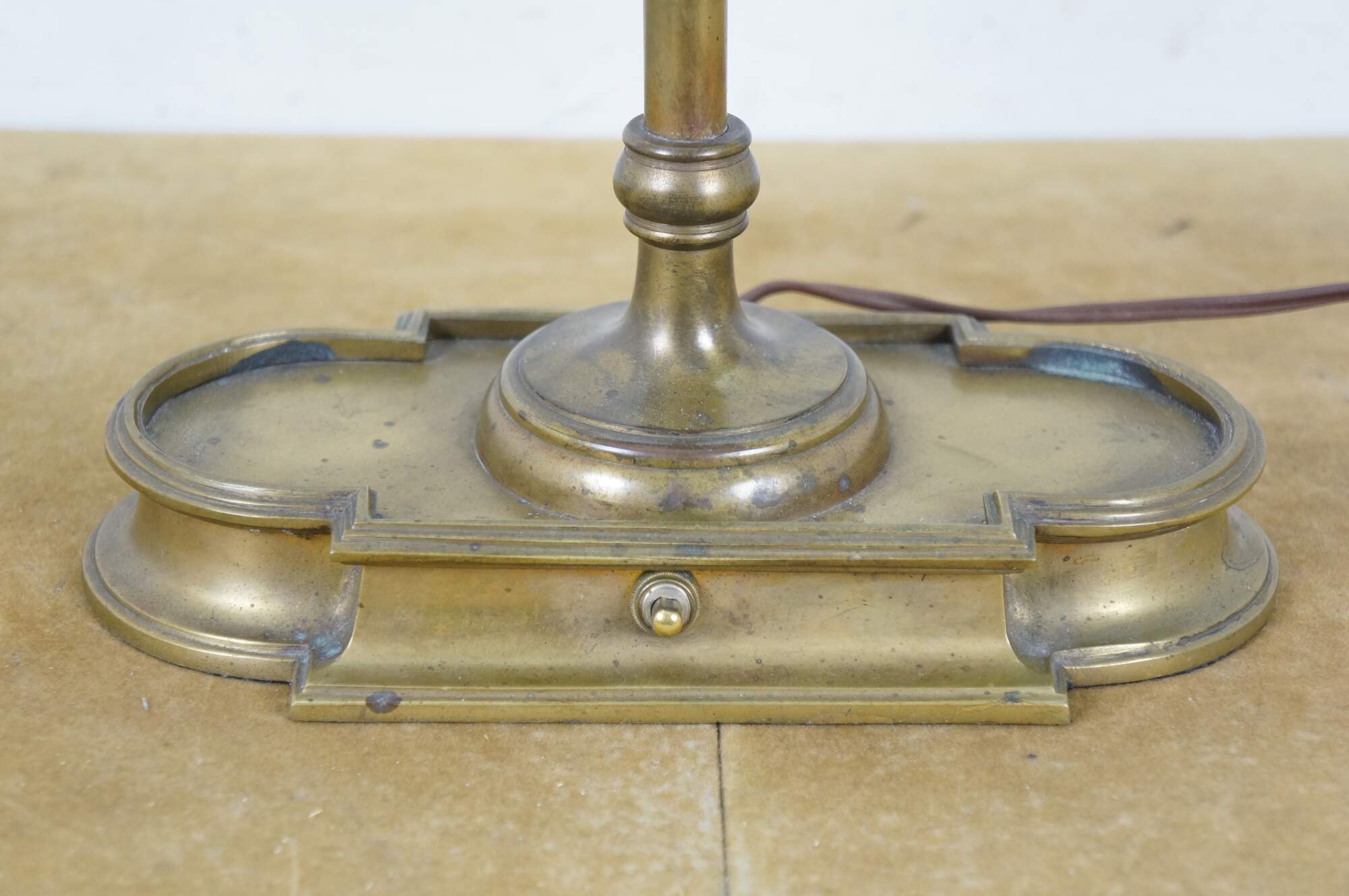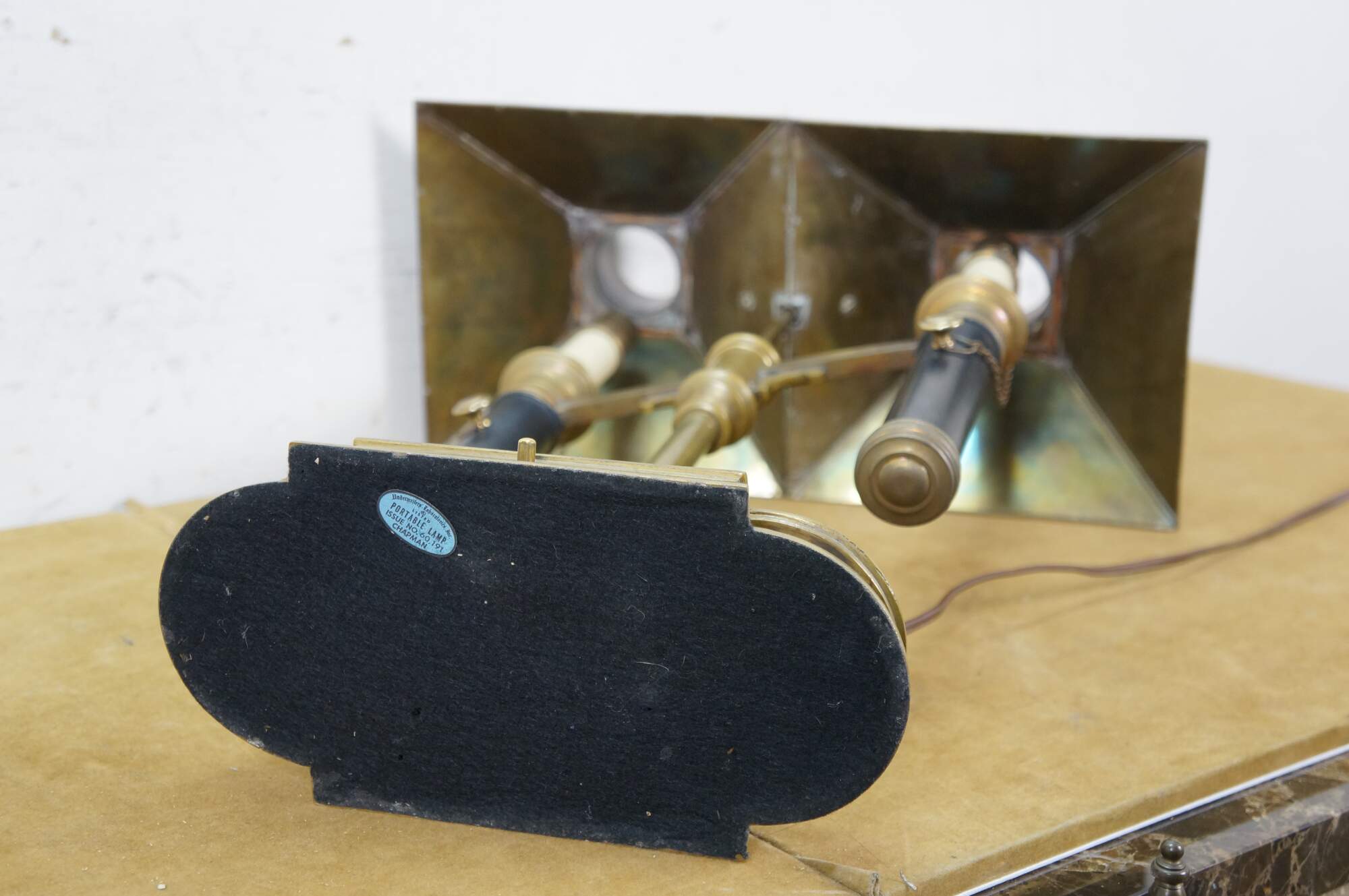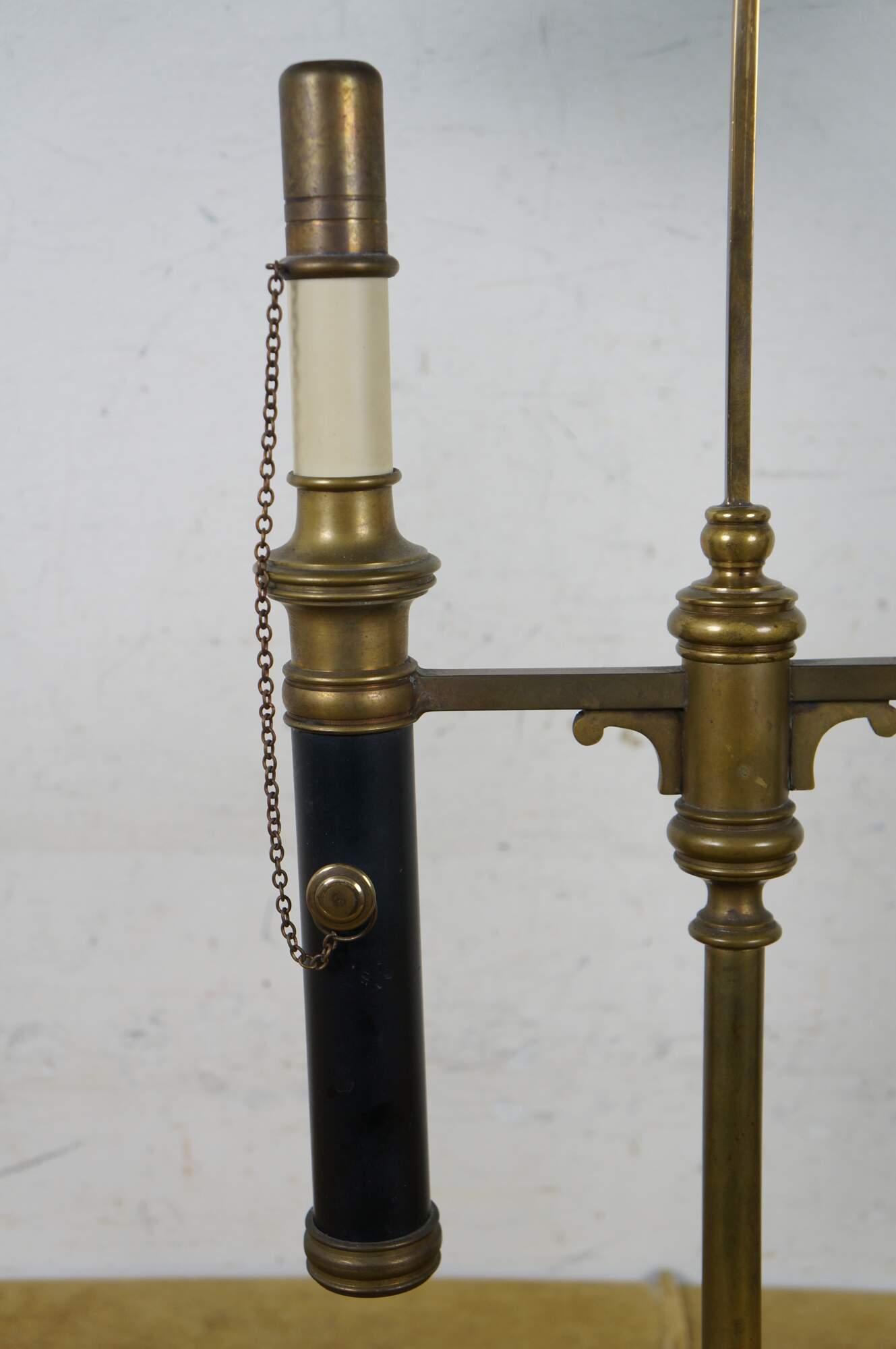 Circa 1970s Chapman brass Empire-style bouillotte two-light table lamp. Shaped like a two-arm candelabra on a lobed base with a pair of faux candlesticks with chained caps, underneath square metal shades with chimneys. Height of shades is adjustable.