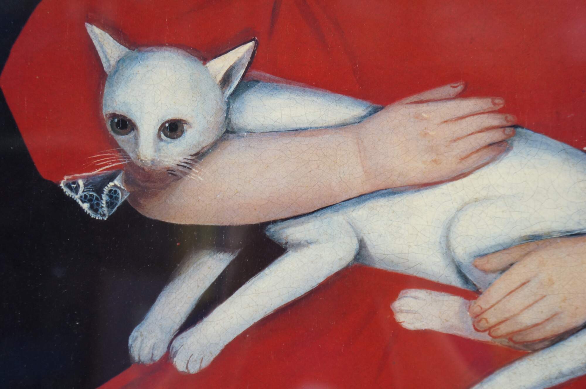 Large vintage print depicting "Girl in Red Dress with cat and Dog" by American portrait artist Ammi Phillips, originally painted circa 1830-1835. Shows a young girl dressed in a bright red dress, holding a white cat on her lap and a small dog at her feet. Black and faux tortoiseshell painted frame, print under museum glass..