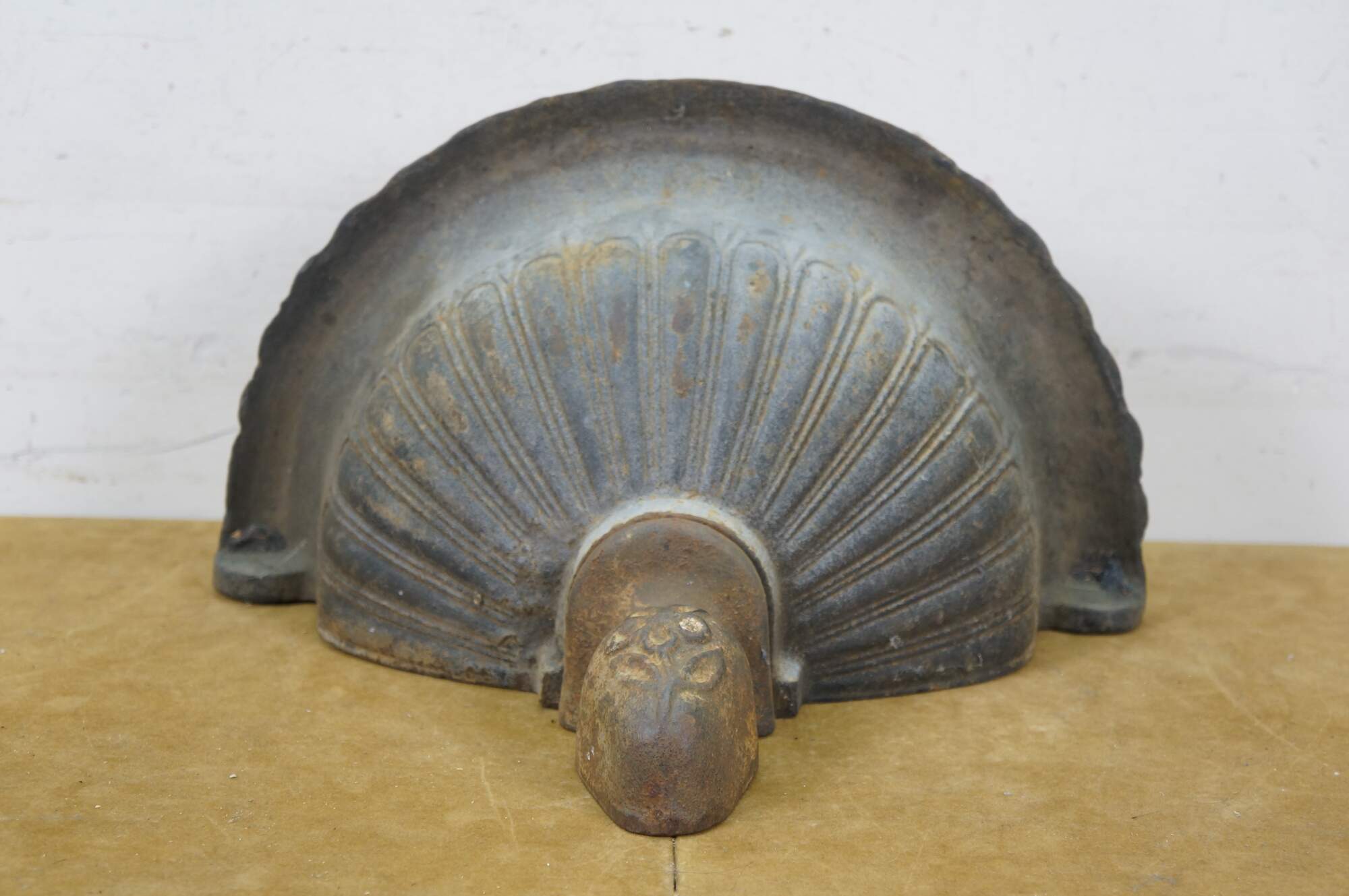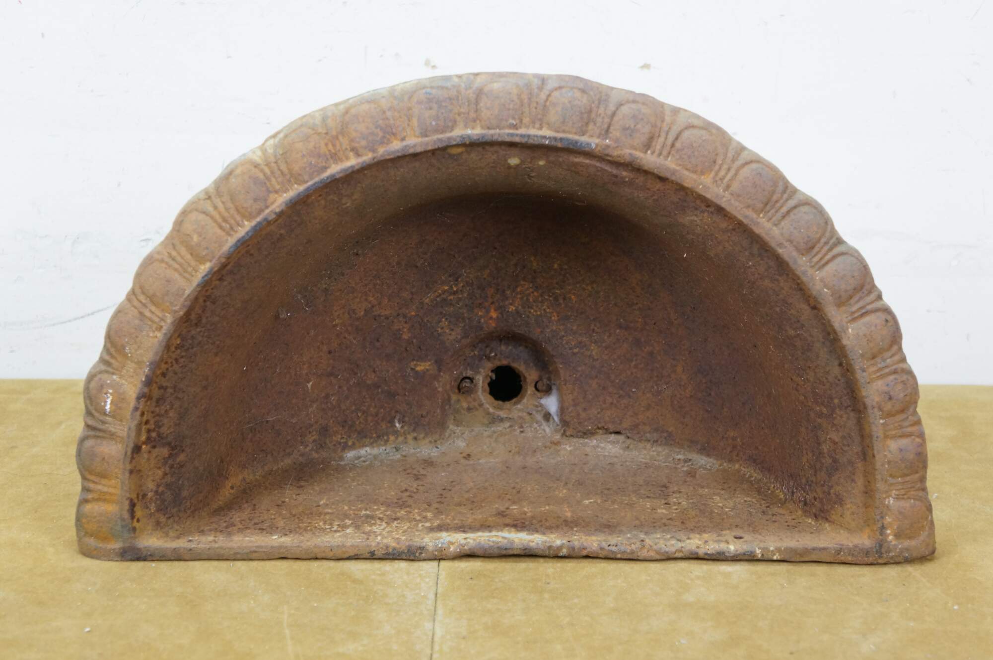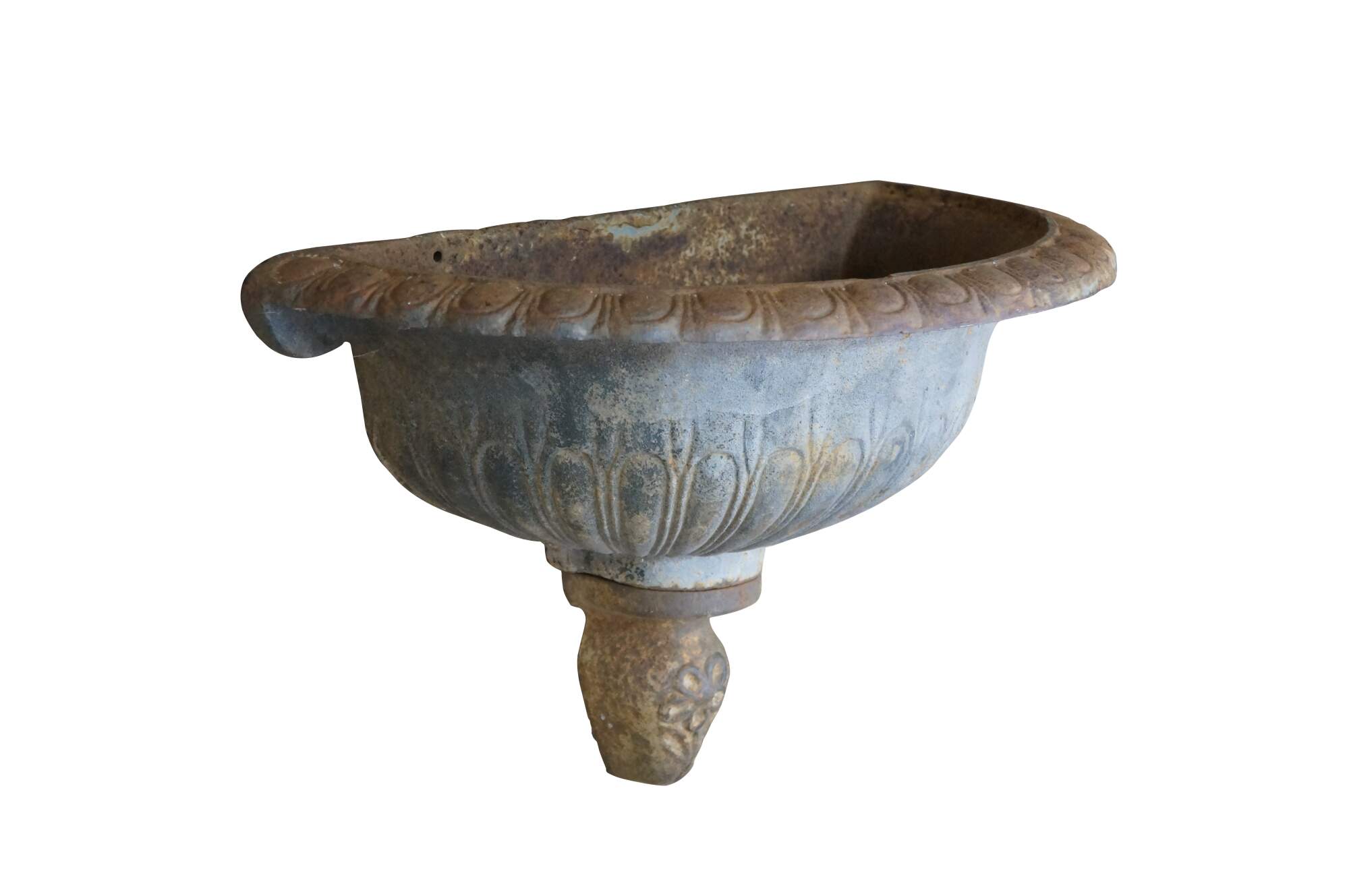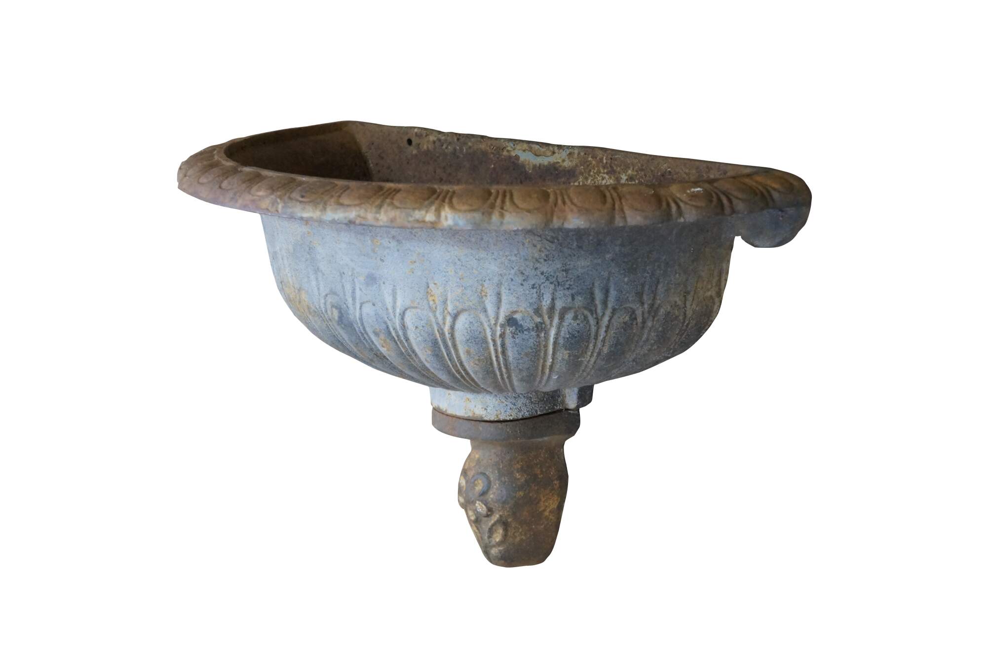 Vintage cast iron wall hanging fountain bowl / planter / garden urn. Demilune / half round shape with fluted Neoclassical styling and a flower on the drop finial.