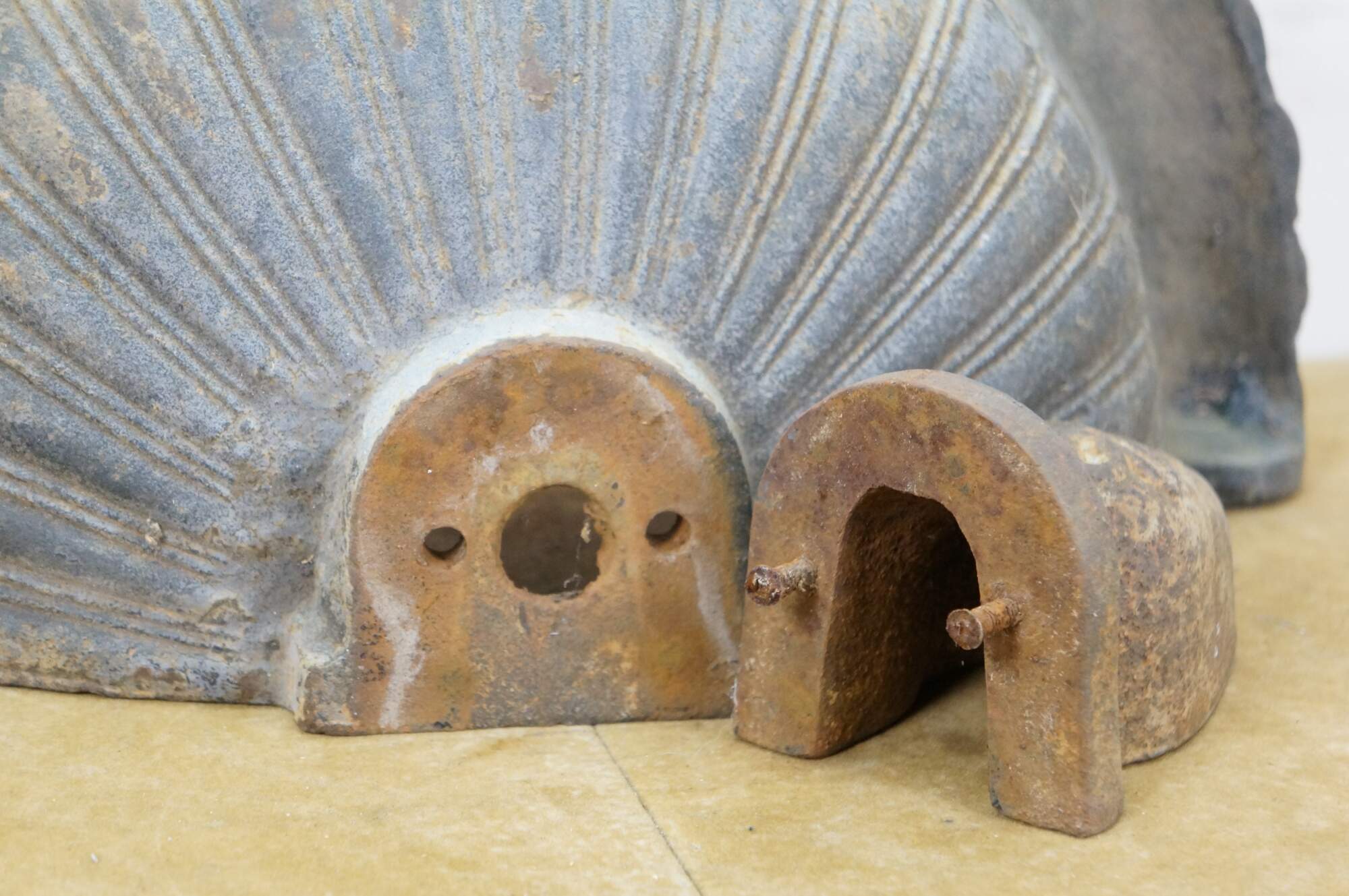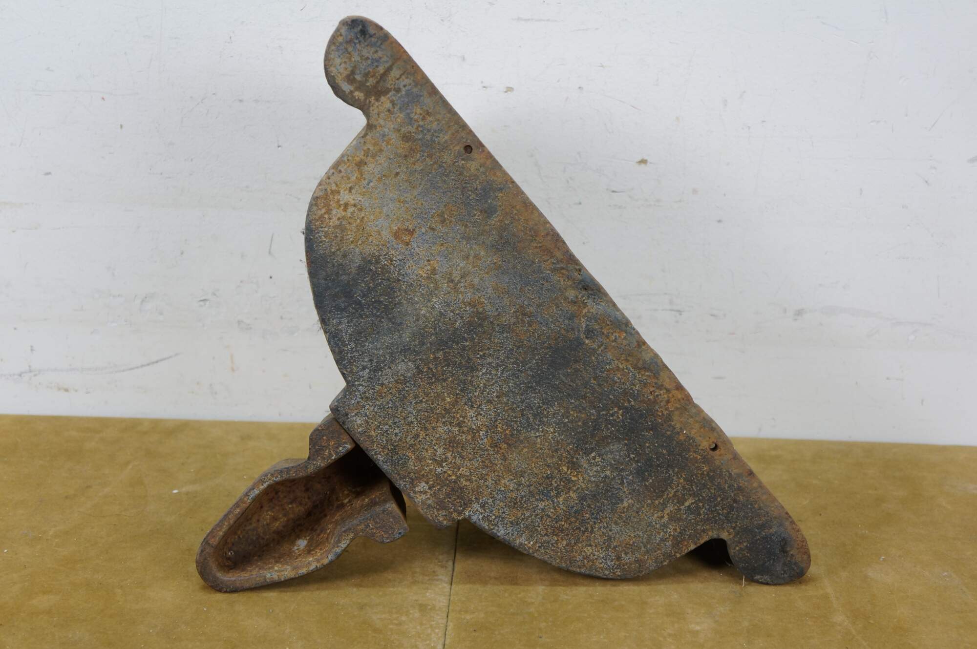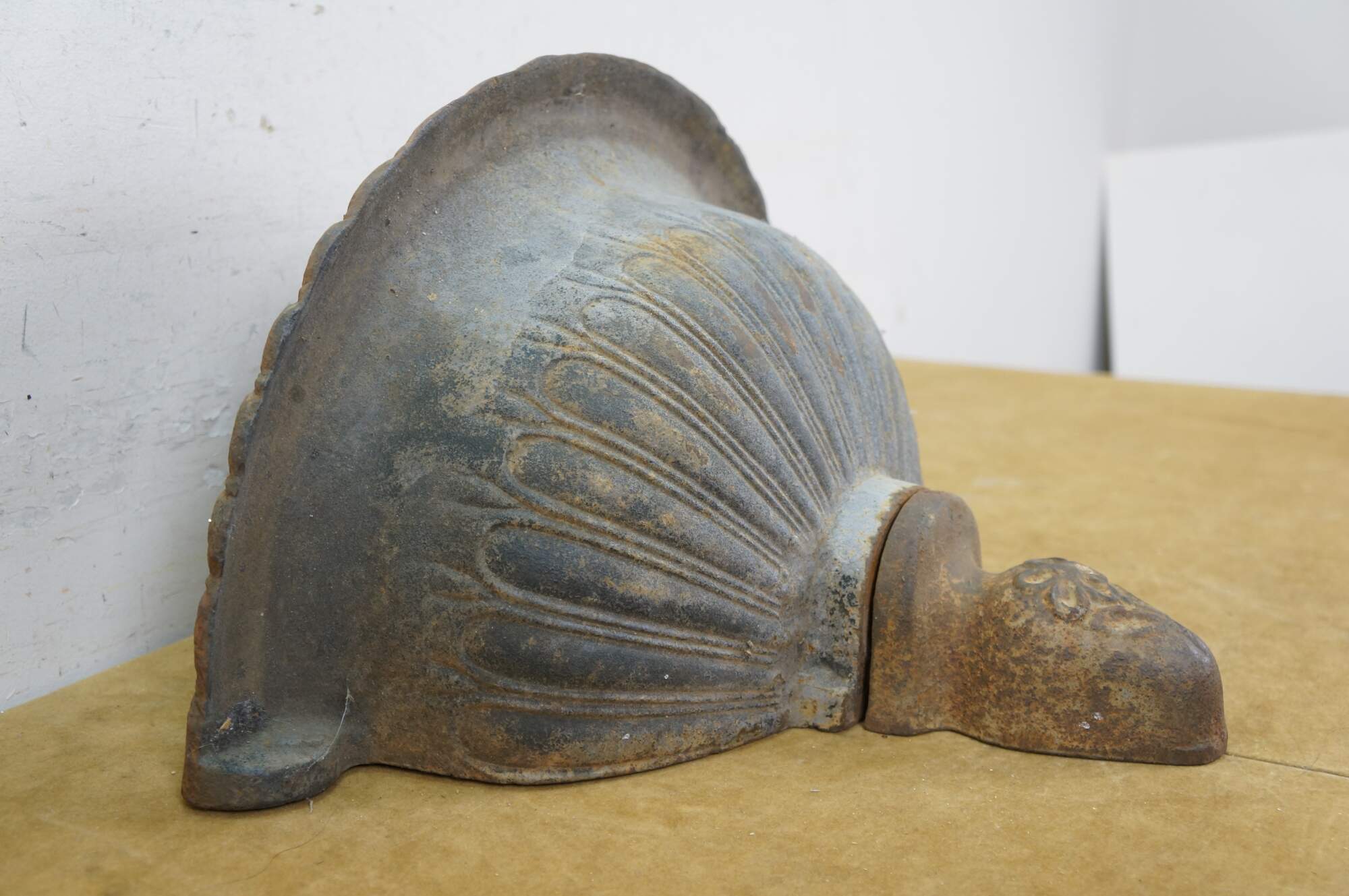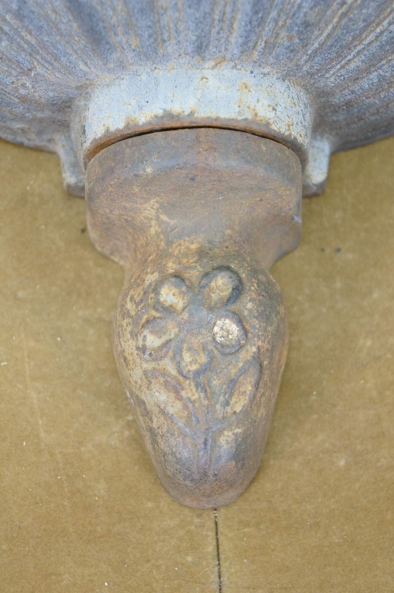 Vintage cast iron wall hanging fountain bowl / planter / garden urn. Demilune / half round shape with fluted Neoclassical styling and a flower on the drop finial.