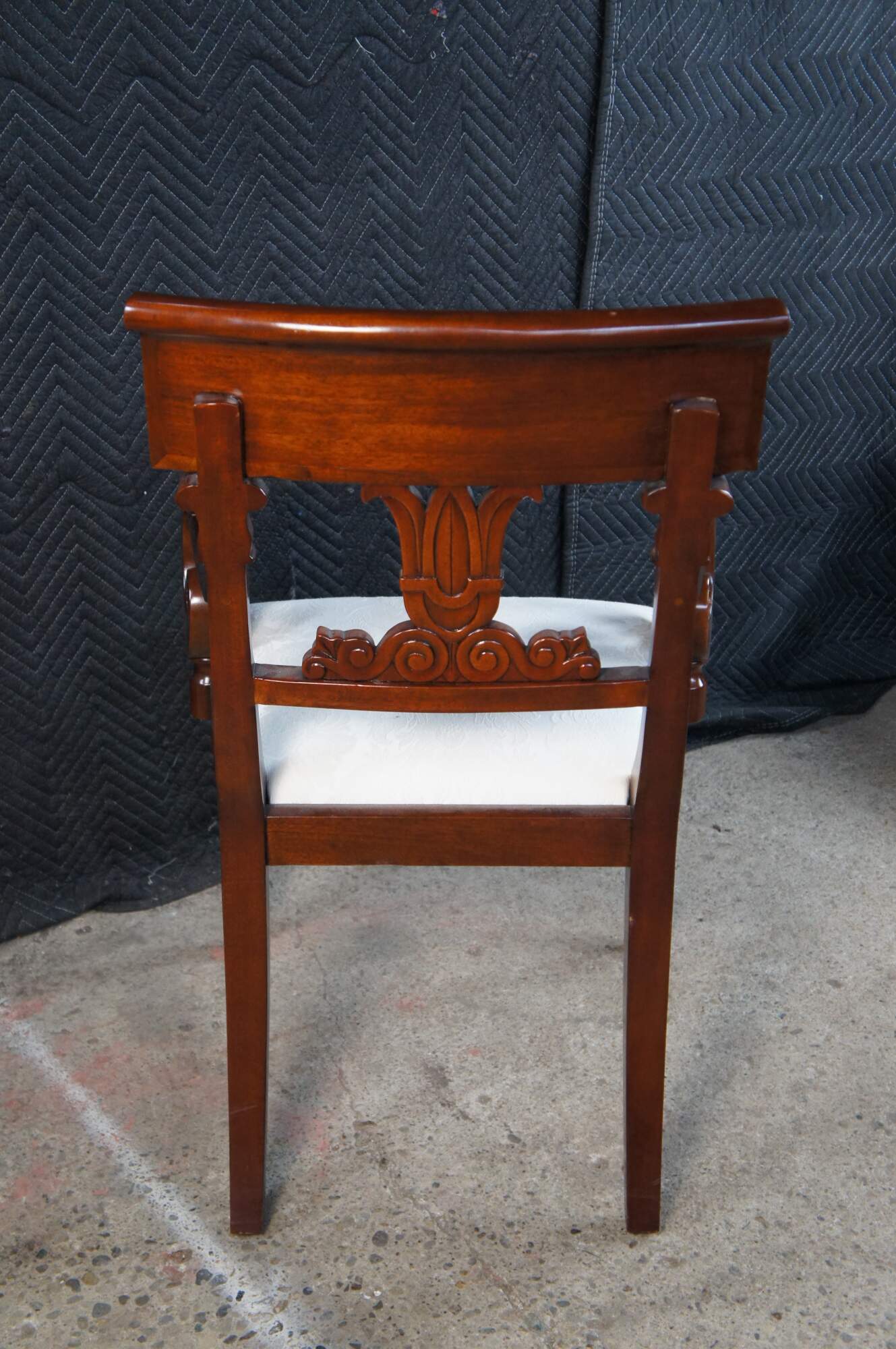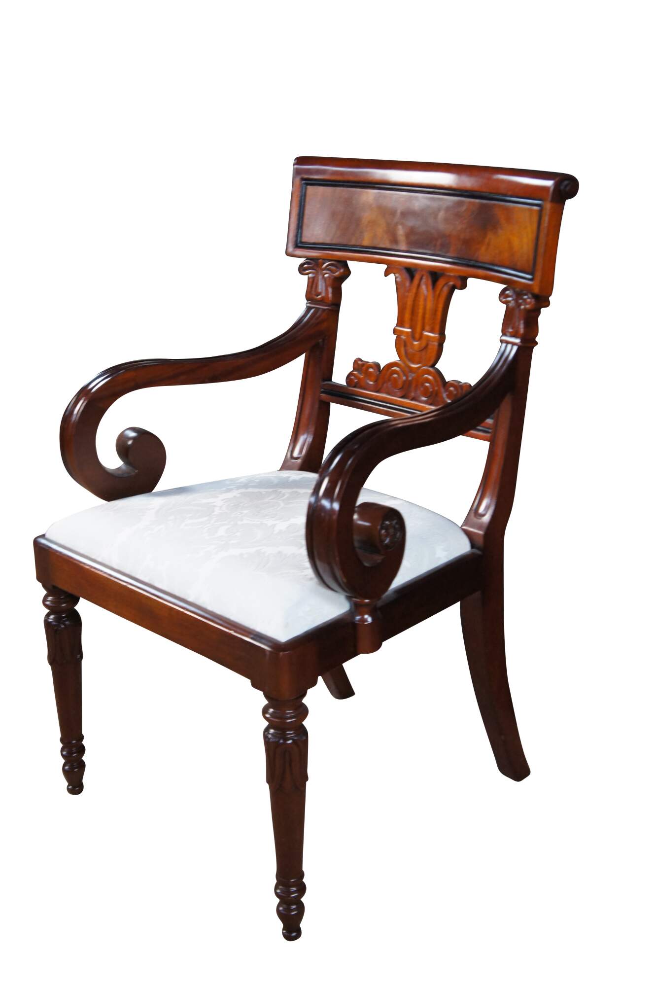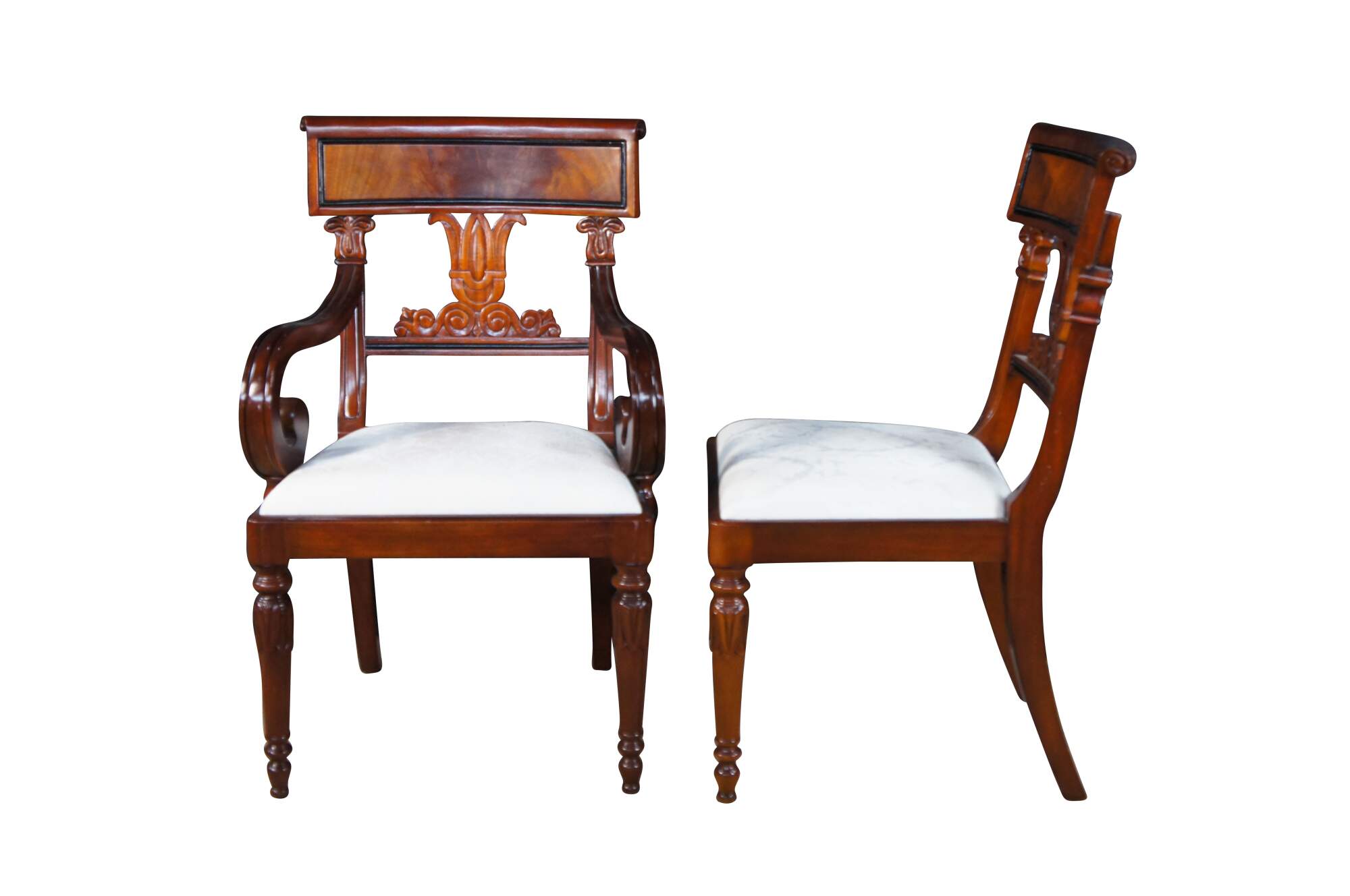 Vintage set of twelve dining chairs from the Robert Adam collection by Millender Furniture Company. Made of flamed mahogany featuring Empire and Regency styling with a carved tulip design, pierced / reticulated back, rolled arms, and turned legs. Includes two armchairs and ten side chairs.