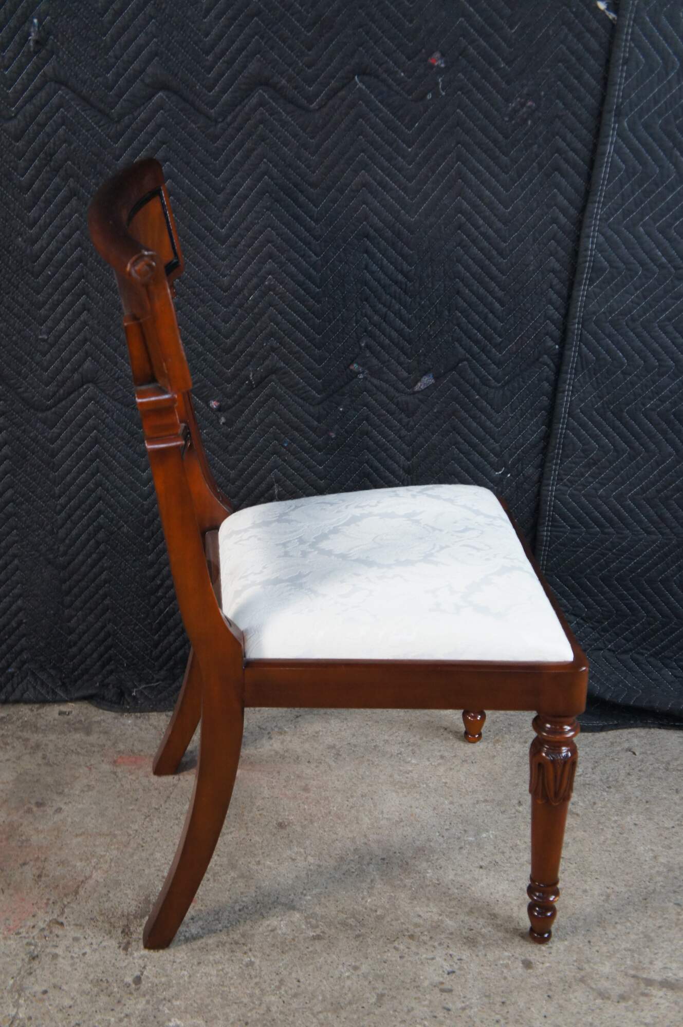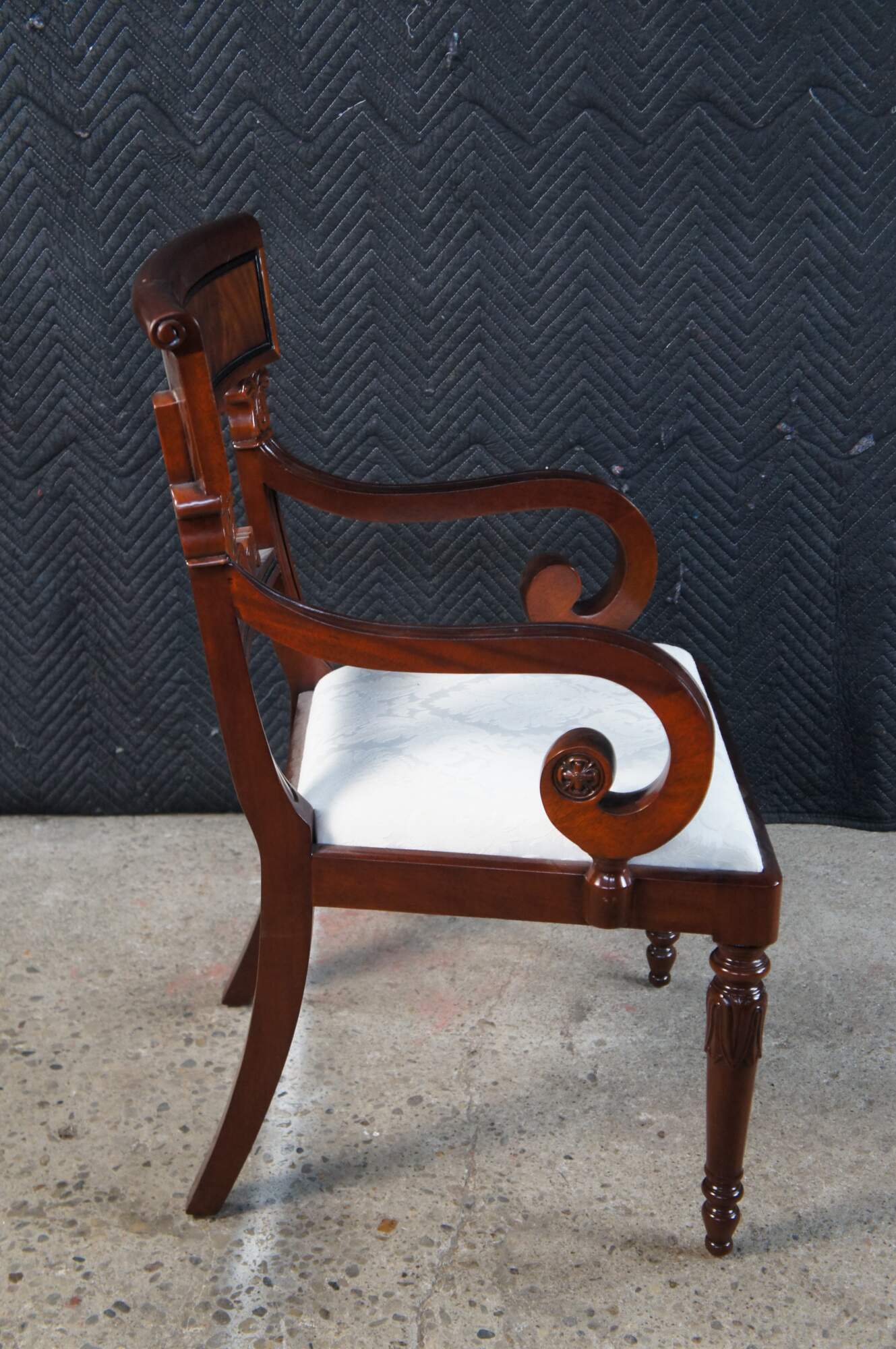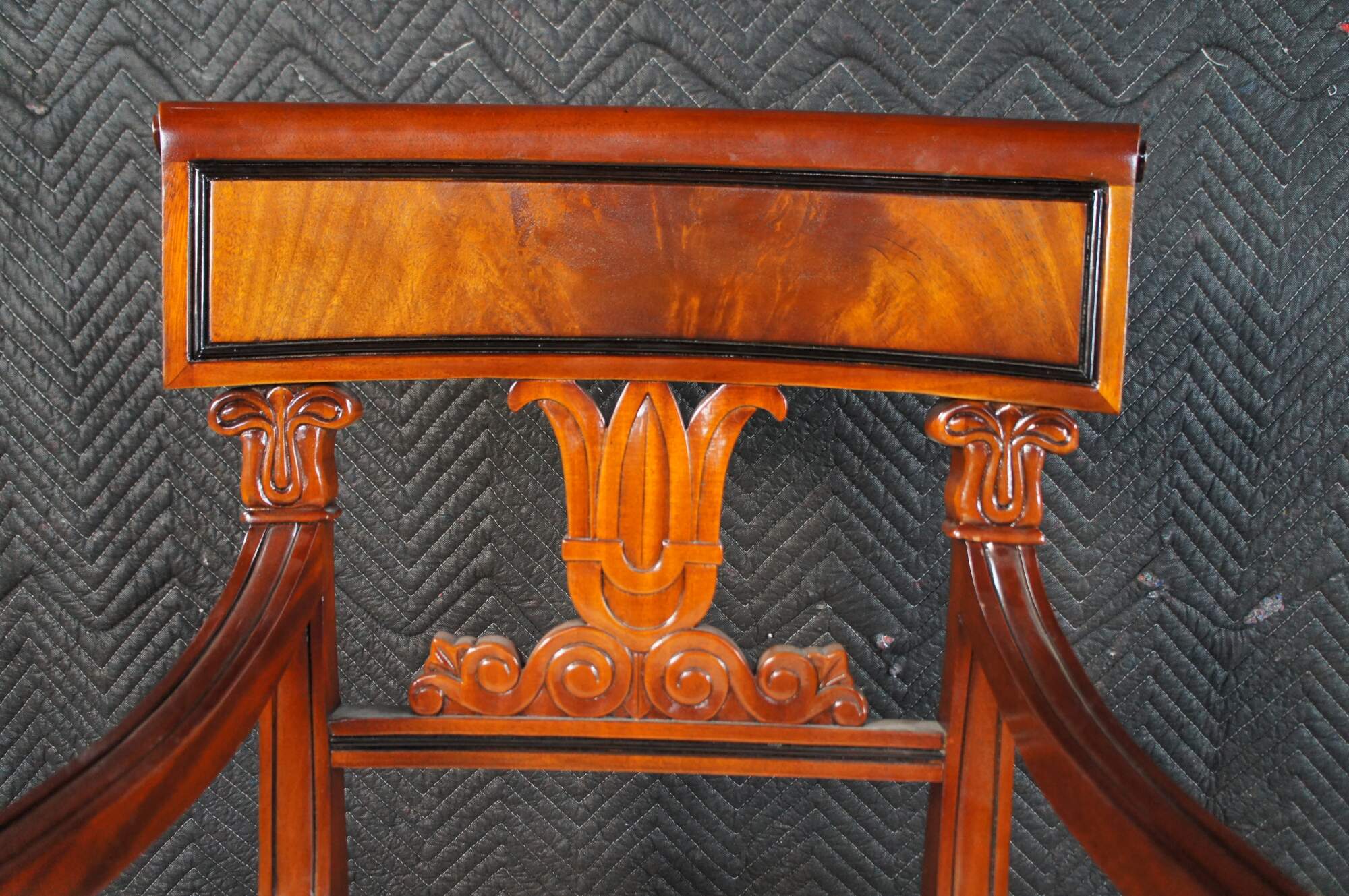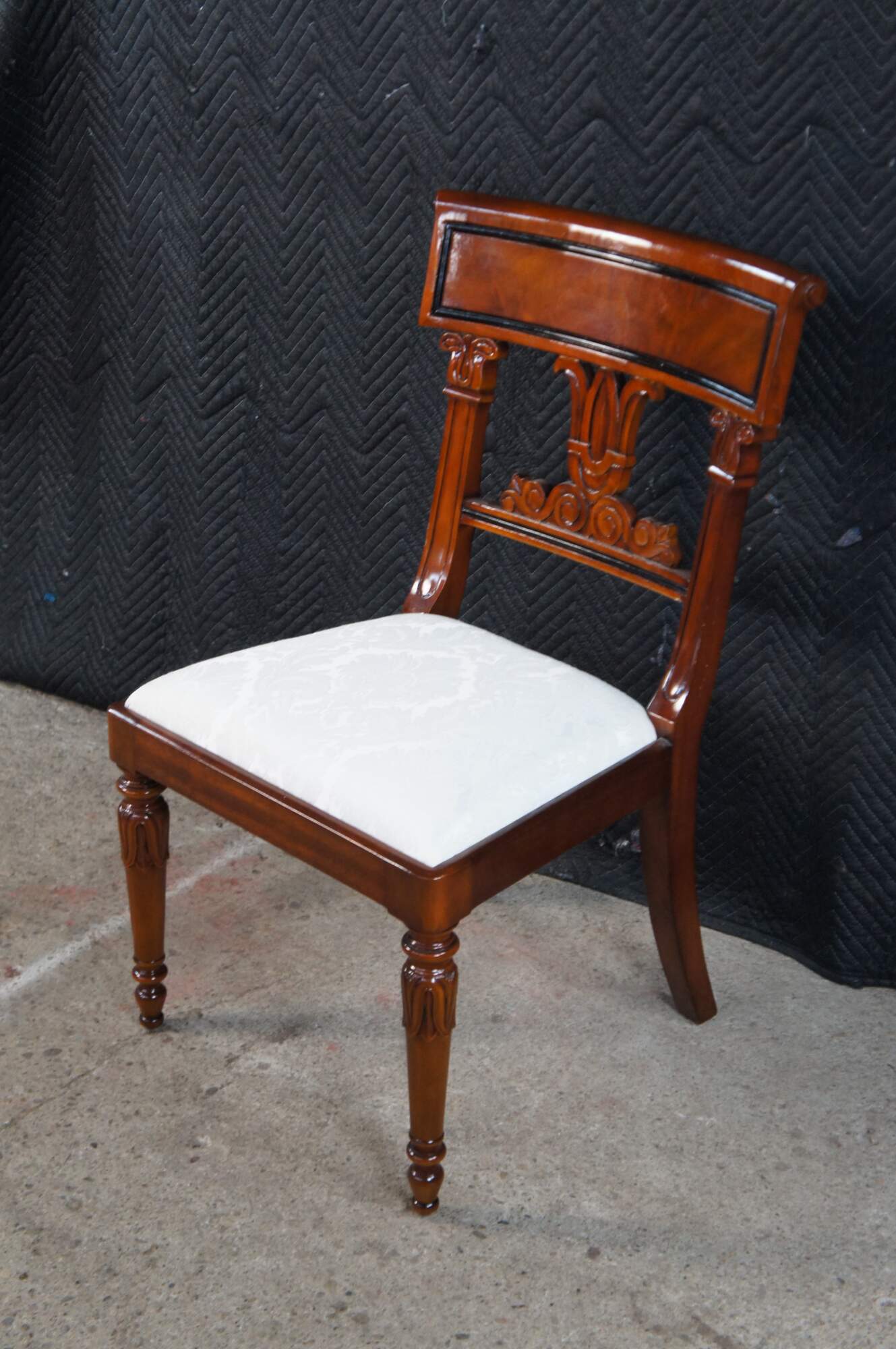 Vintage set of twelve dining chairs from the Robert Adam collection by Millender Furniture Company. Made of flamed mahogany featuring Empire and Regency styling with a carved tulip design, pierced / reticulated back, rolled arms, and turned legs. Includes two armchairs and ten side chairs.