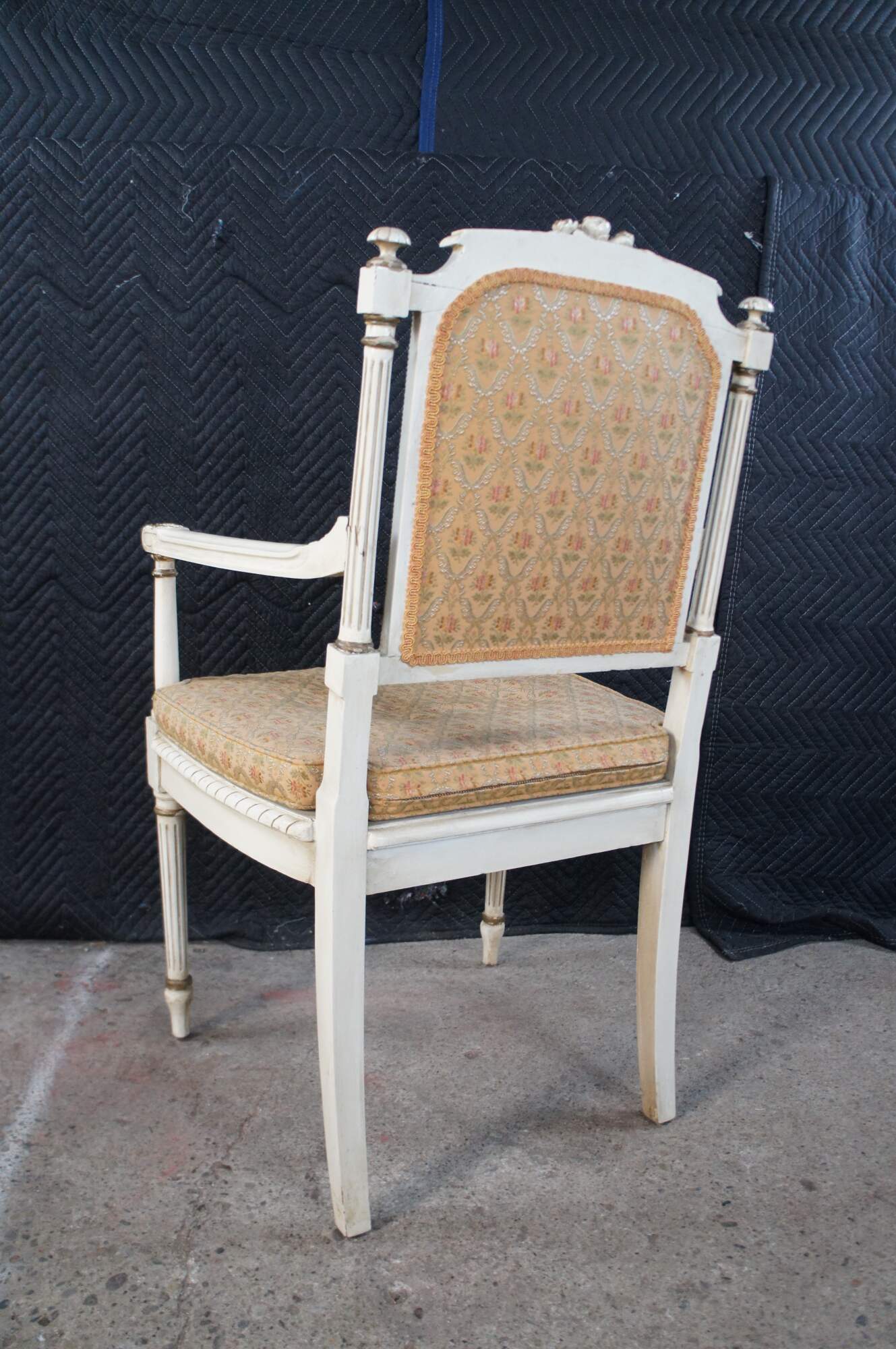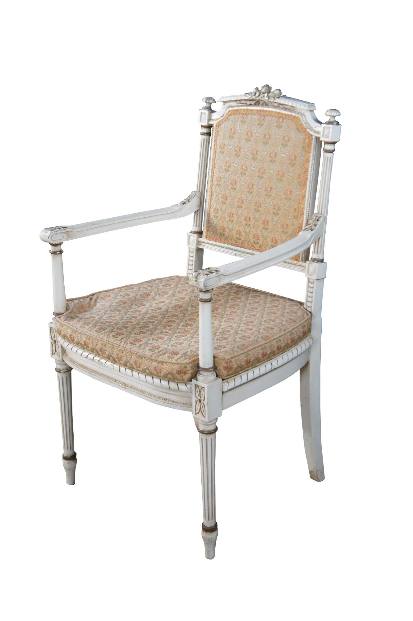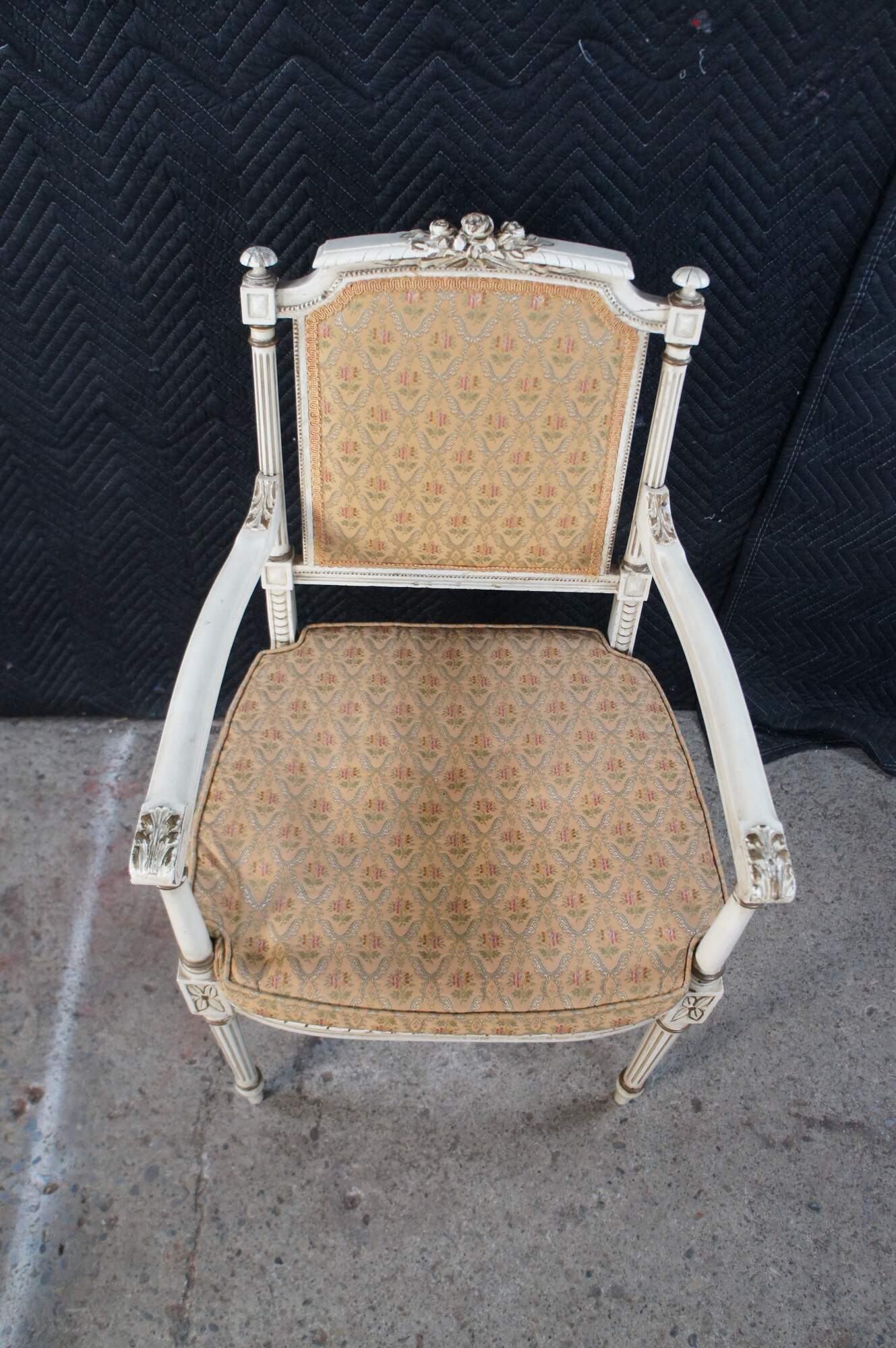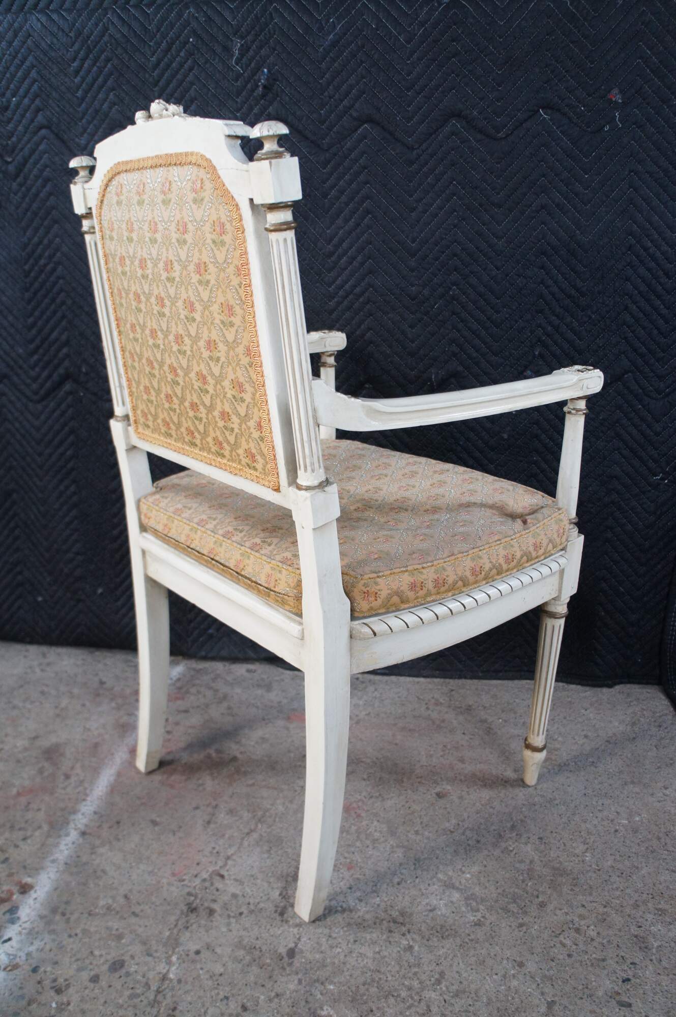 Antique French Provincial arm chair featuring Louis XVI / Neoclassical styling with carved fluted, floral, ribbon, and acanthus accents.