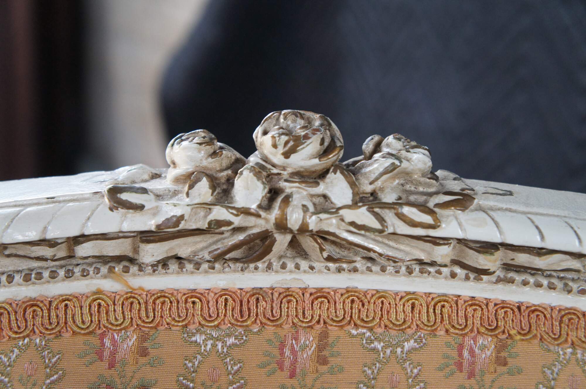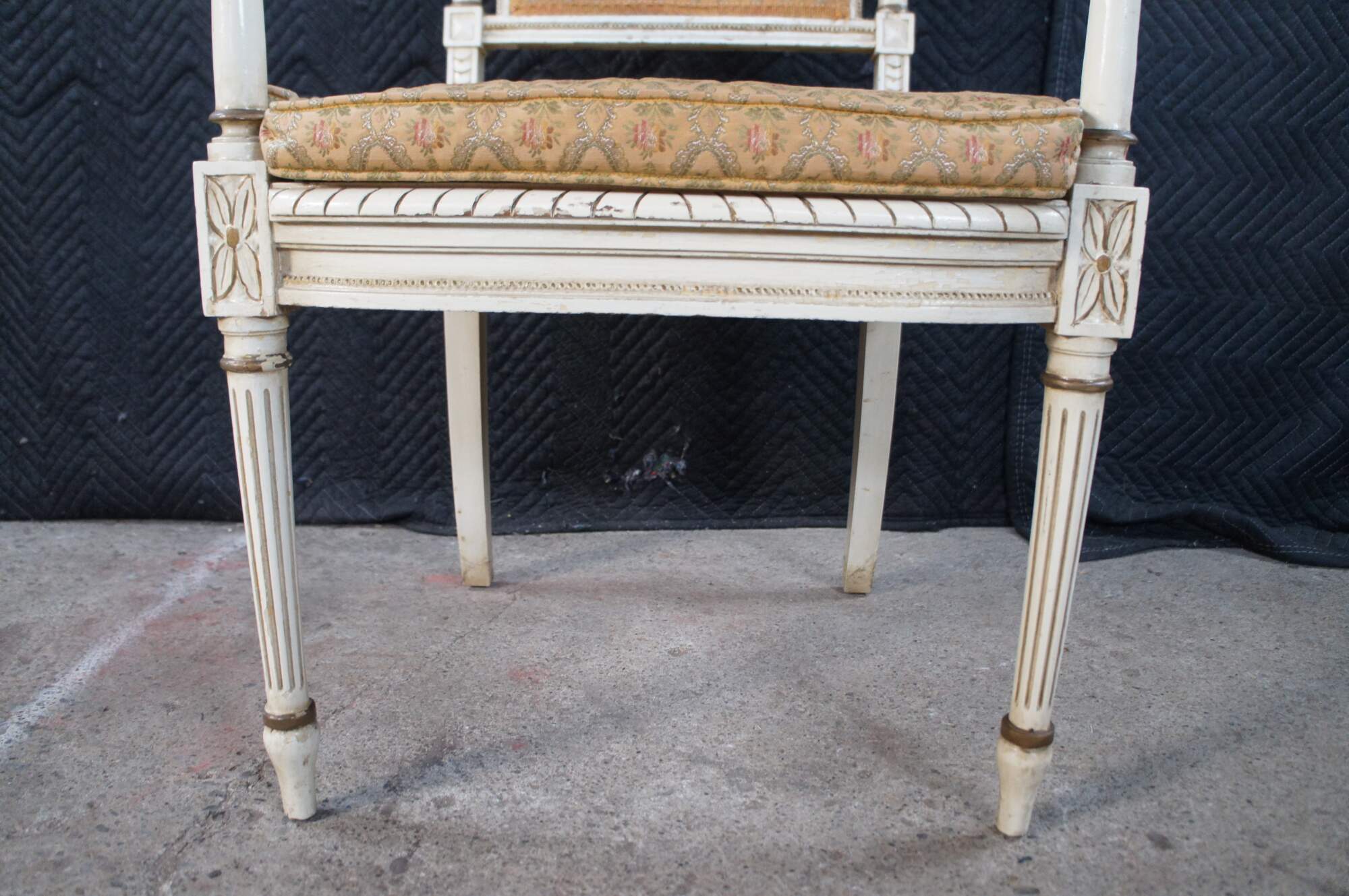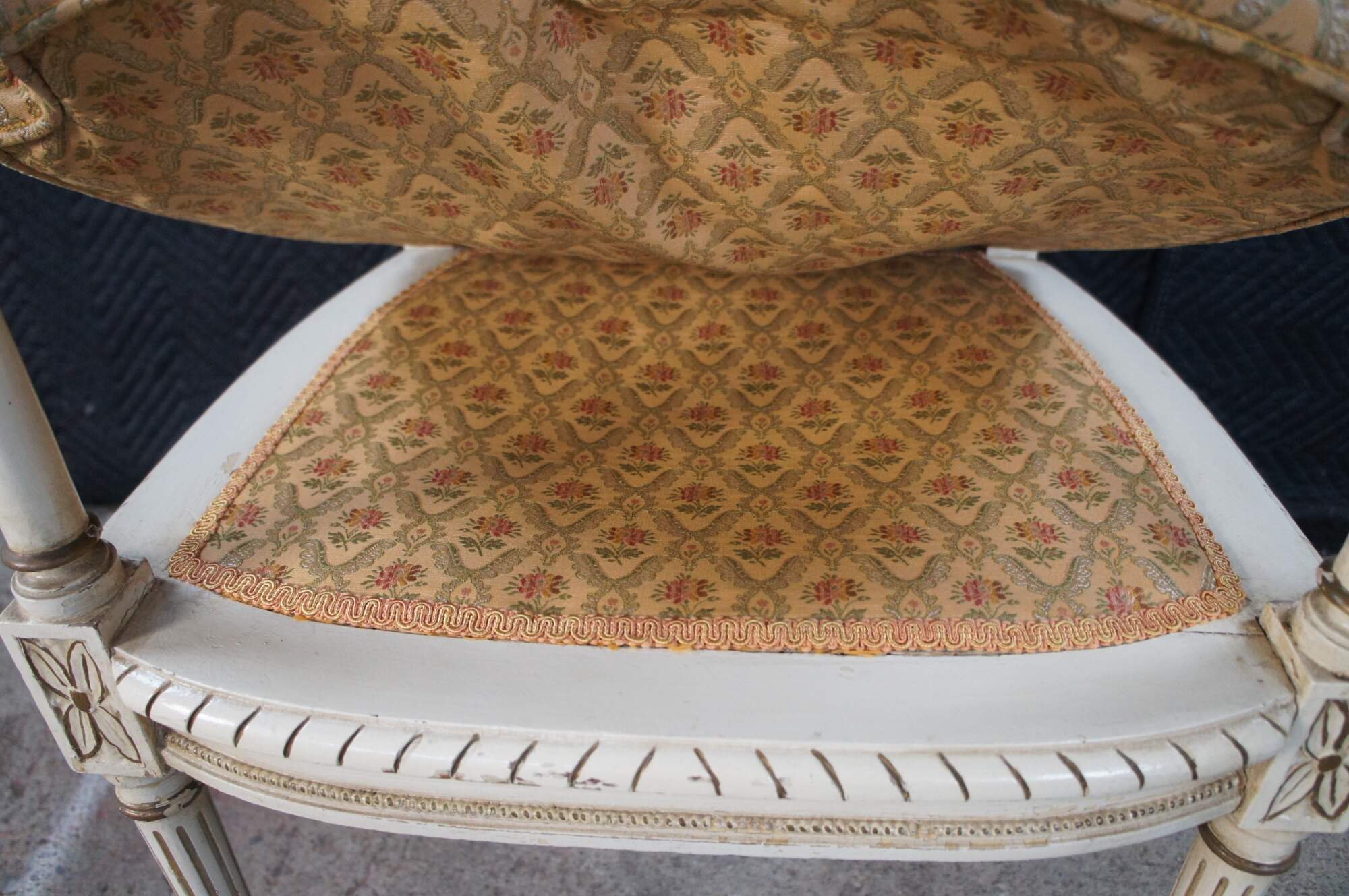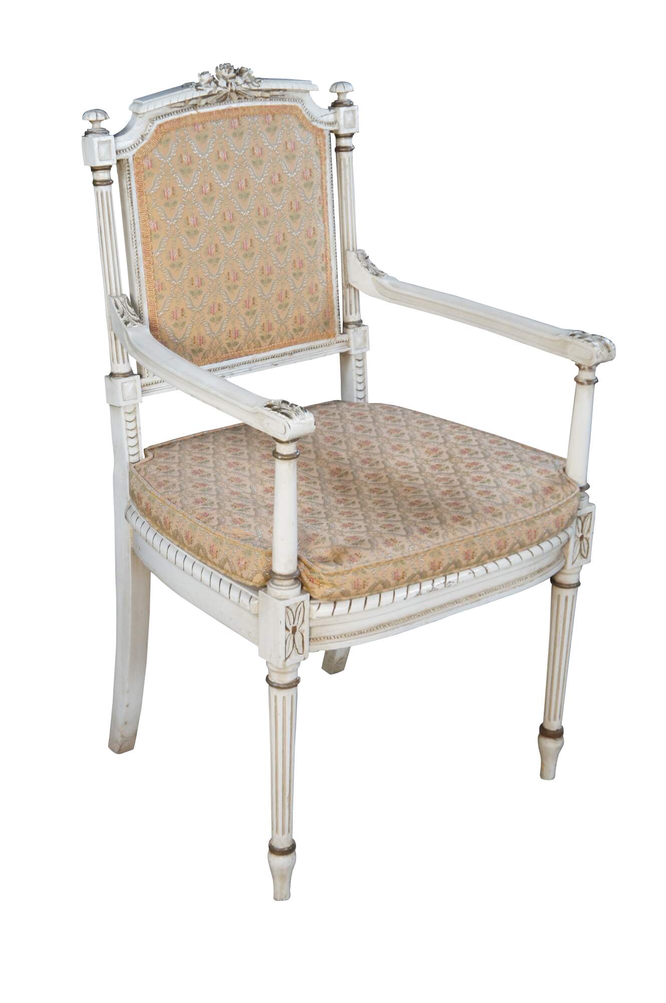 Antique French Provincial arm chair featuring Louis XVI / Neoclassical styling with carved fluted, floral, ribbon, and acanthus accents.