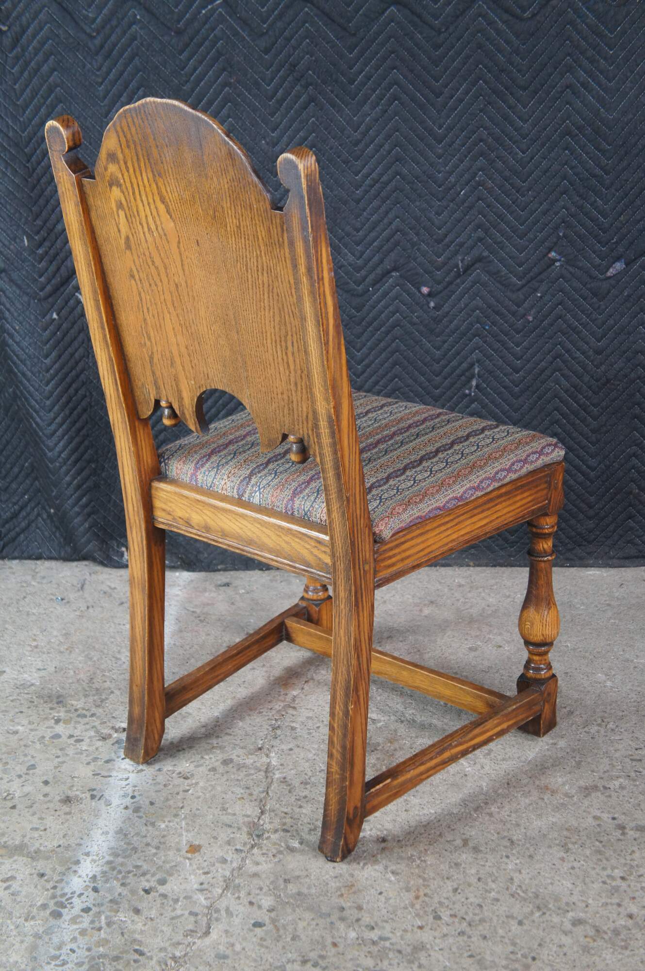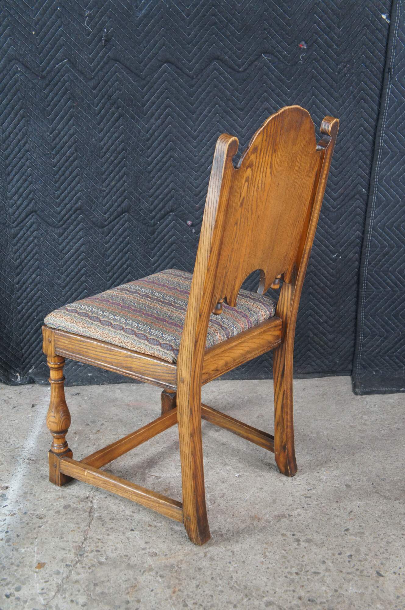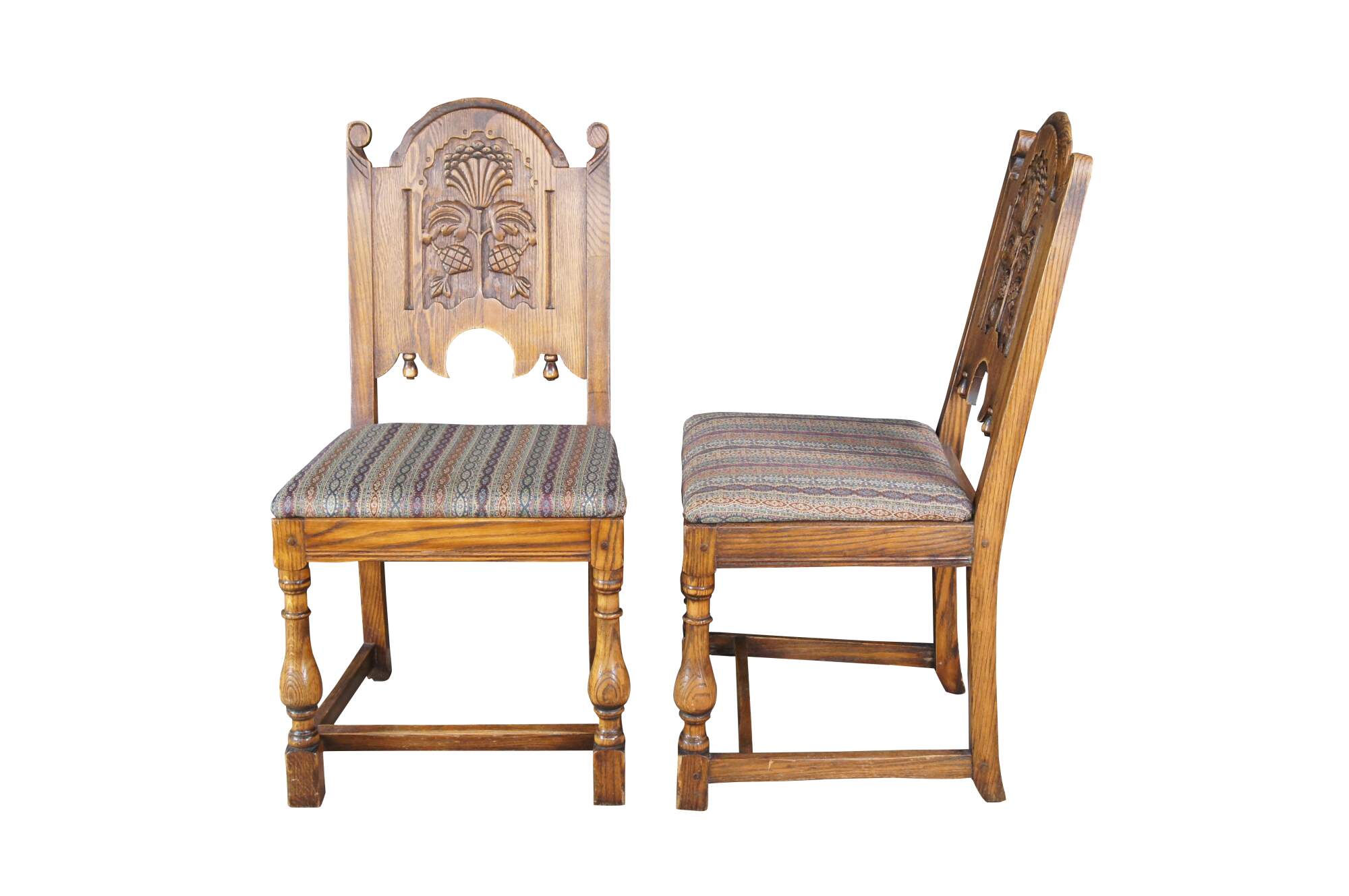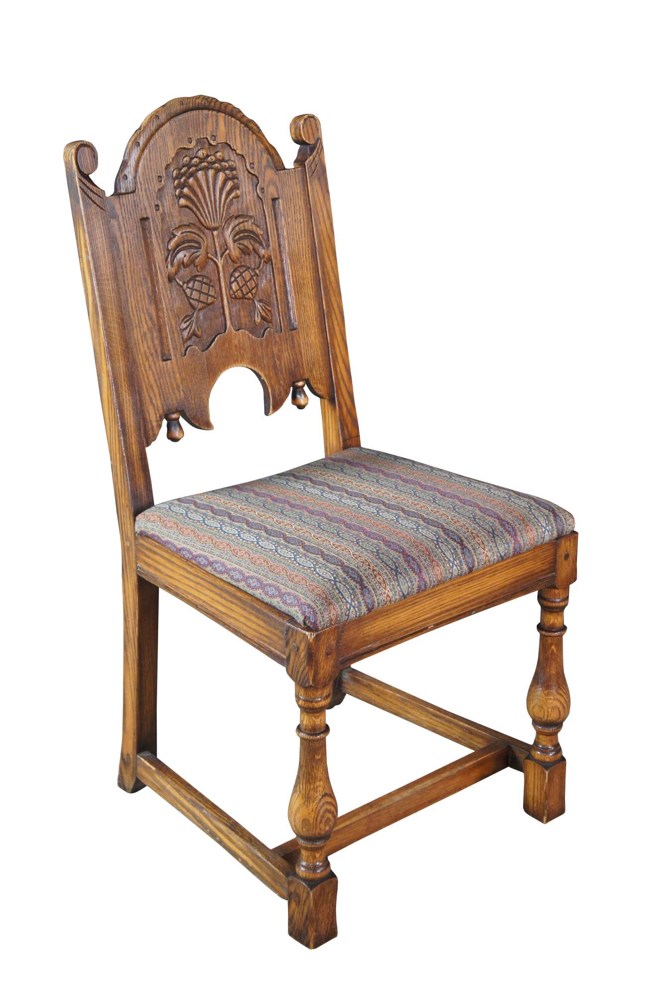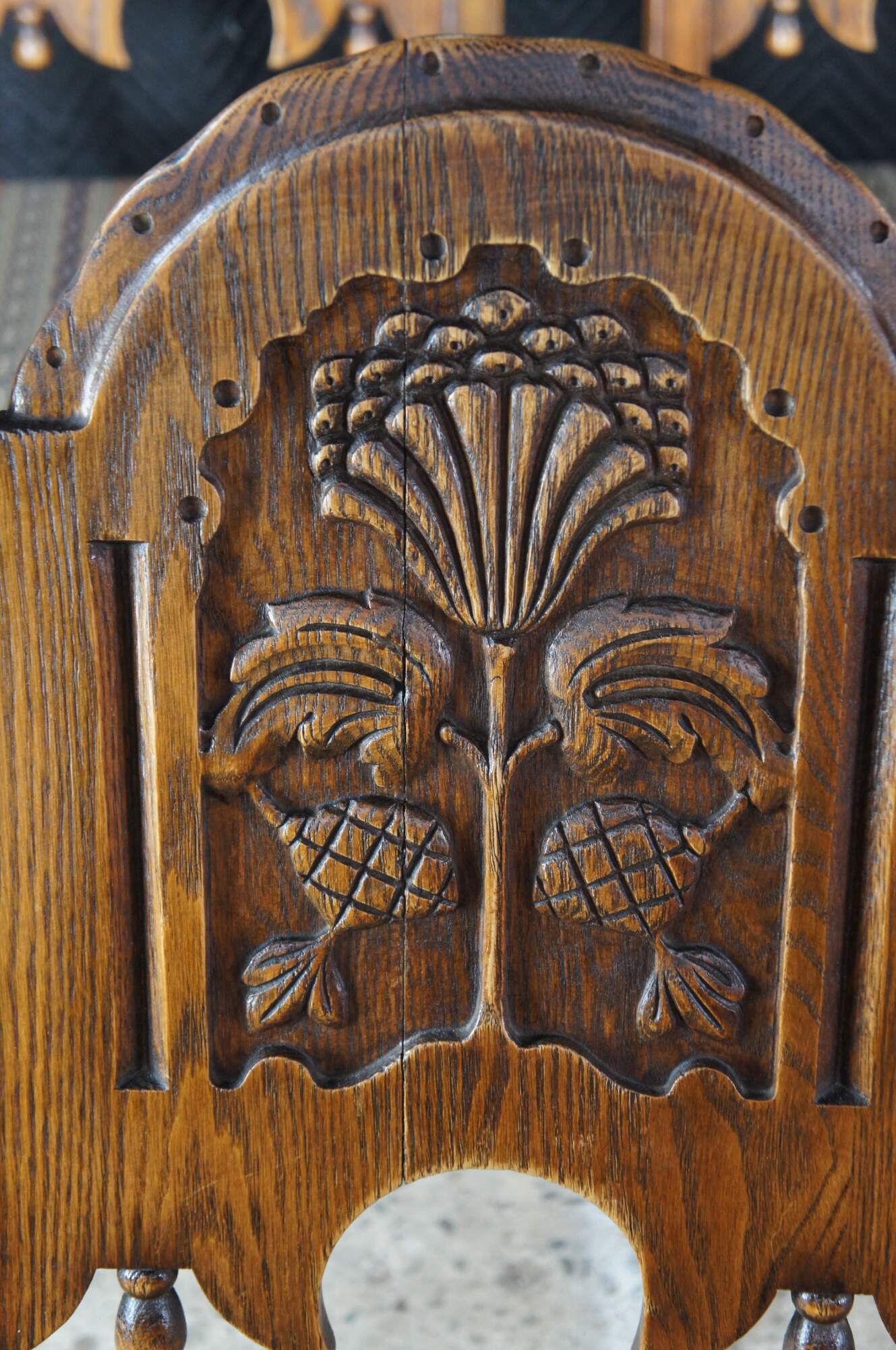 Set of six Antique Feudal Oak dining chairs by Jamestown Lounge Company. The chairs feature a rustic, ornately carved floral motif with domed top and turned baluster legs connected by stretchers. Circa 1920s-1930s.