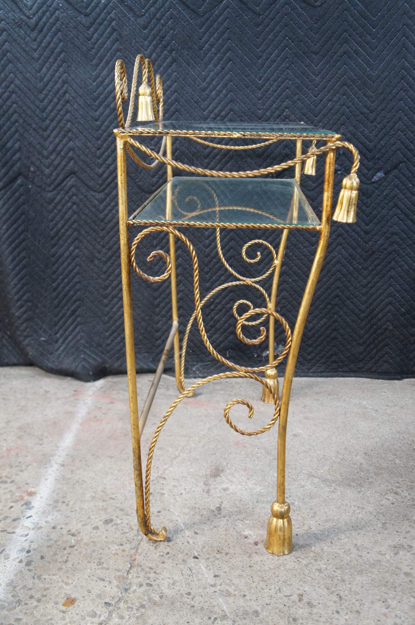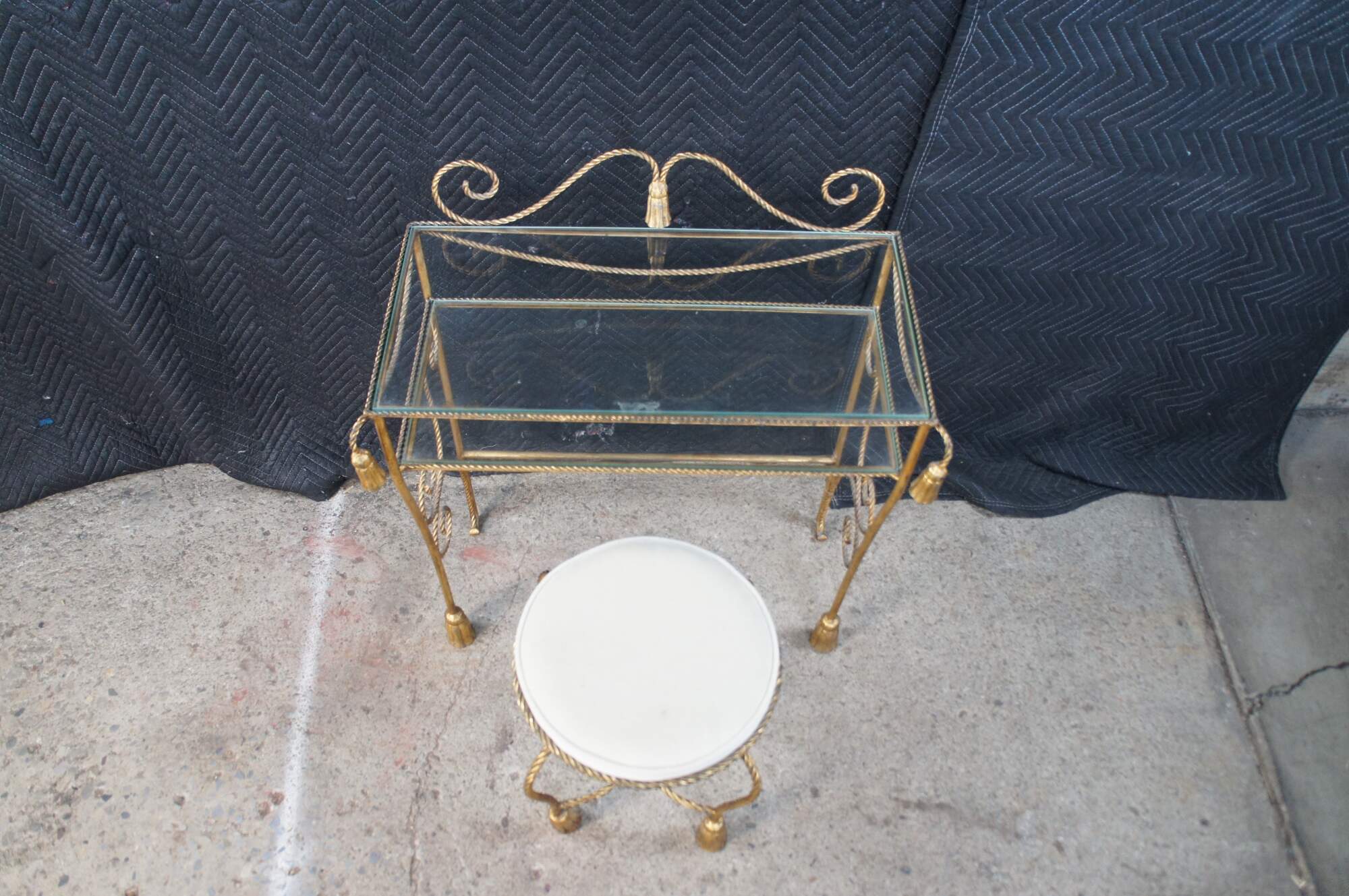 Vintage Edward P. Paul and Co. Italian mid century makeup vanity table, stool and trifold mirror. Made of gilded metal and glass featuring Hollywood Regency styling with serpentine form and tassel accents. Made in Italy.