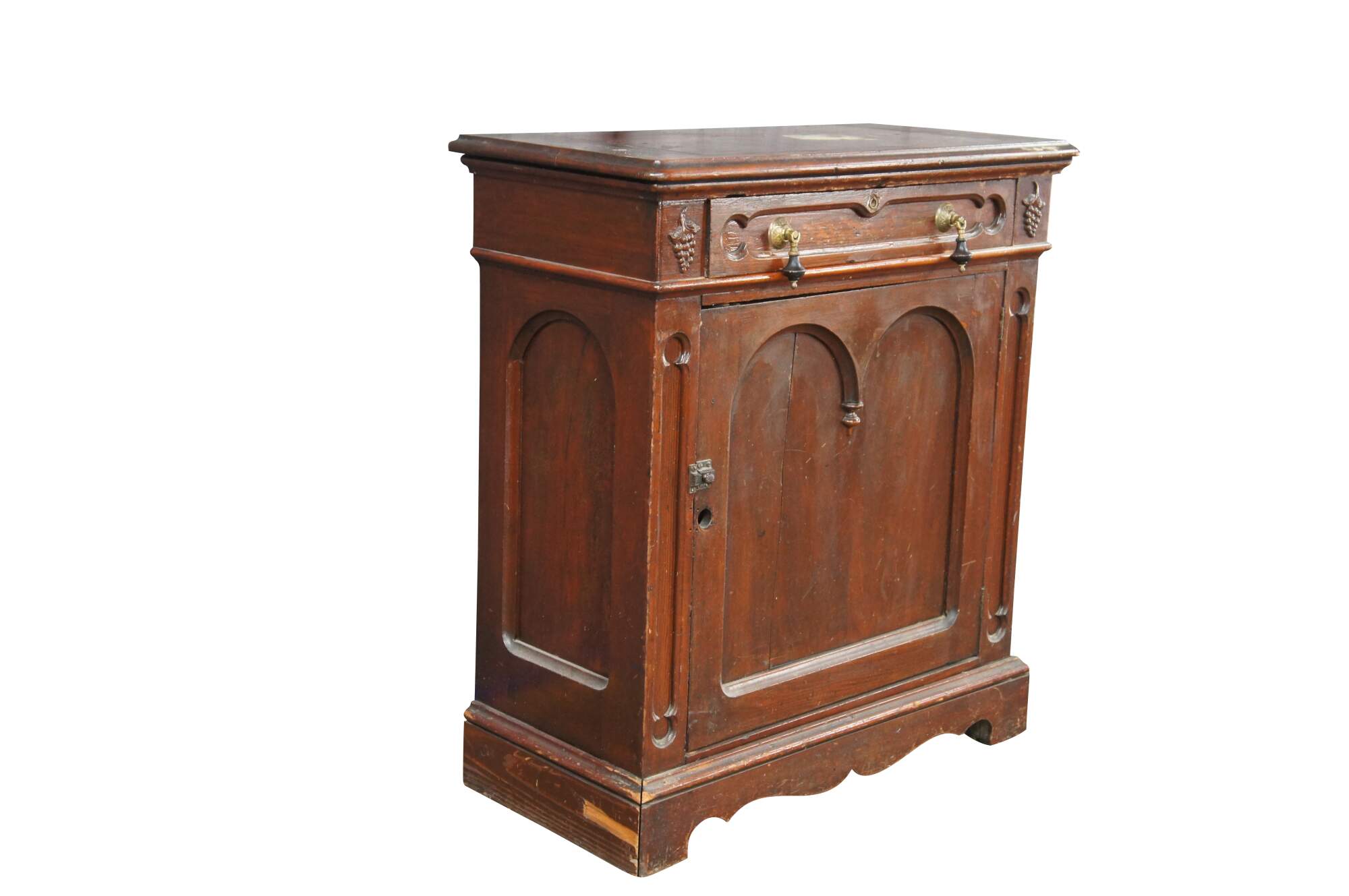 American Victorian Gothic Revival hall chest, console table or cabinet. Circa 1870s. Features a rectangular form made from walnut with a hand dovetailed inset paneled drawer flanked by grape carvings, over a lower cabinet with gothic style arched door. The cabinet opens to one shelf for accessory storage. The upper drawer features brass knocker pulls. Drawer is hand planed along the underside.