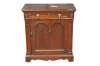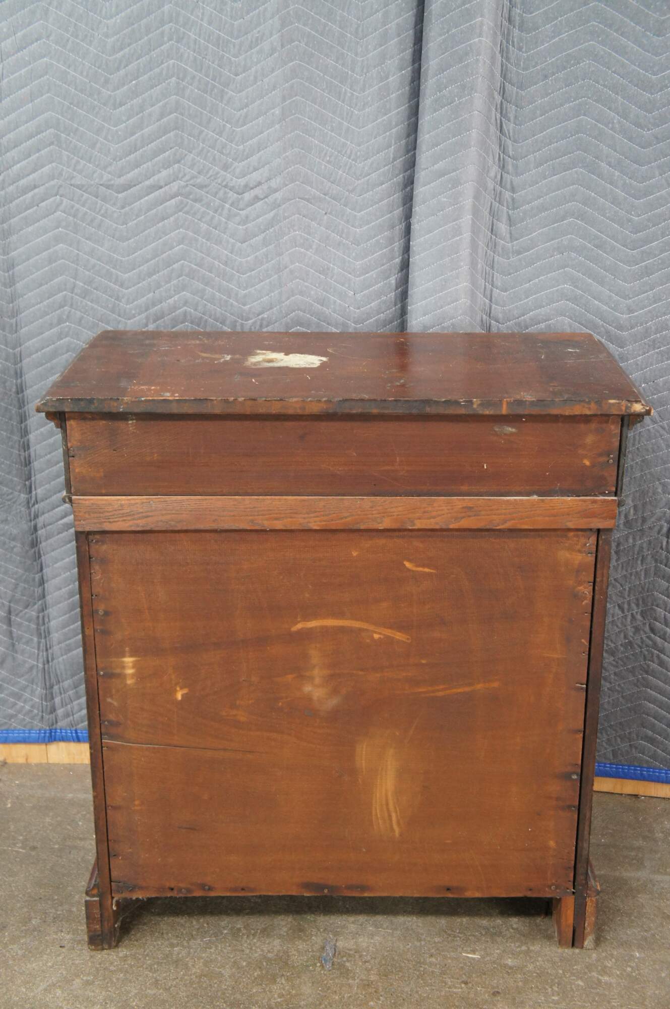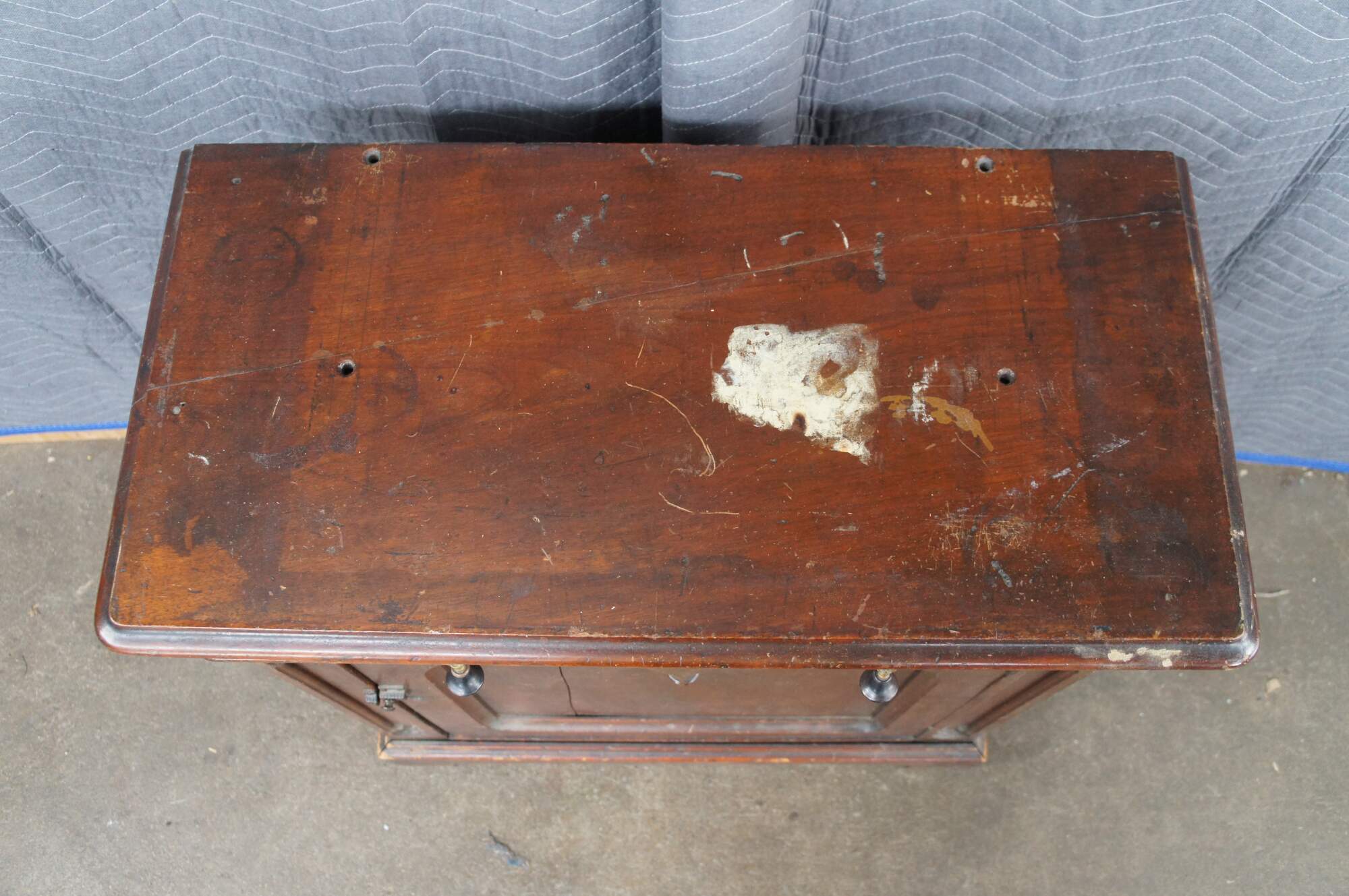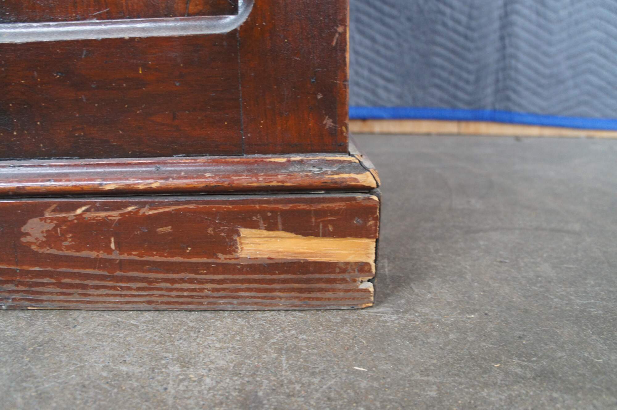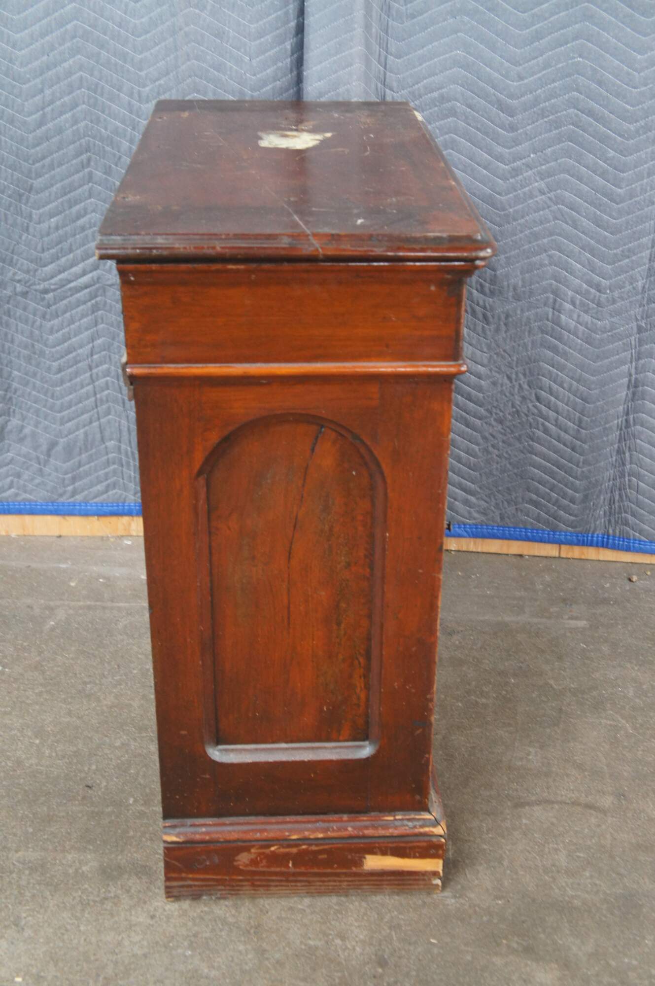fair; wear and distressing from use and age, split to door. Finish loss. Stain along top as well as holes from where a topper used to rest.