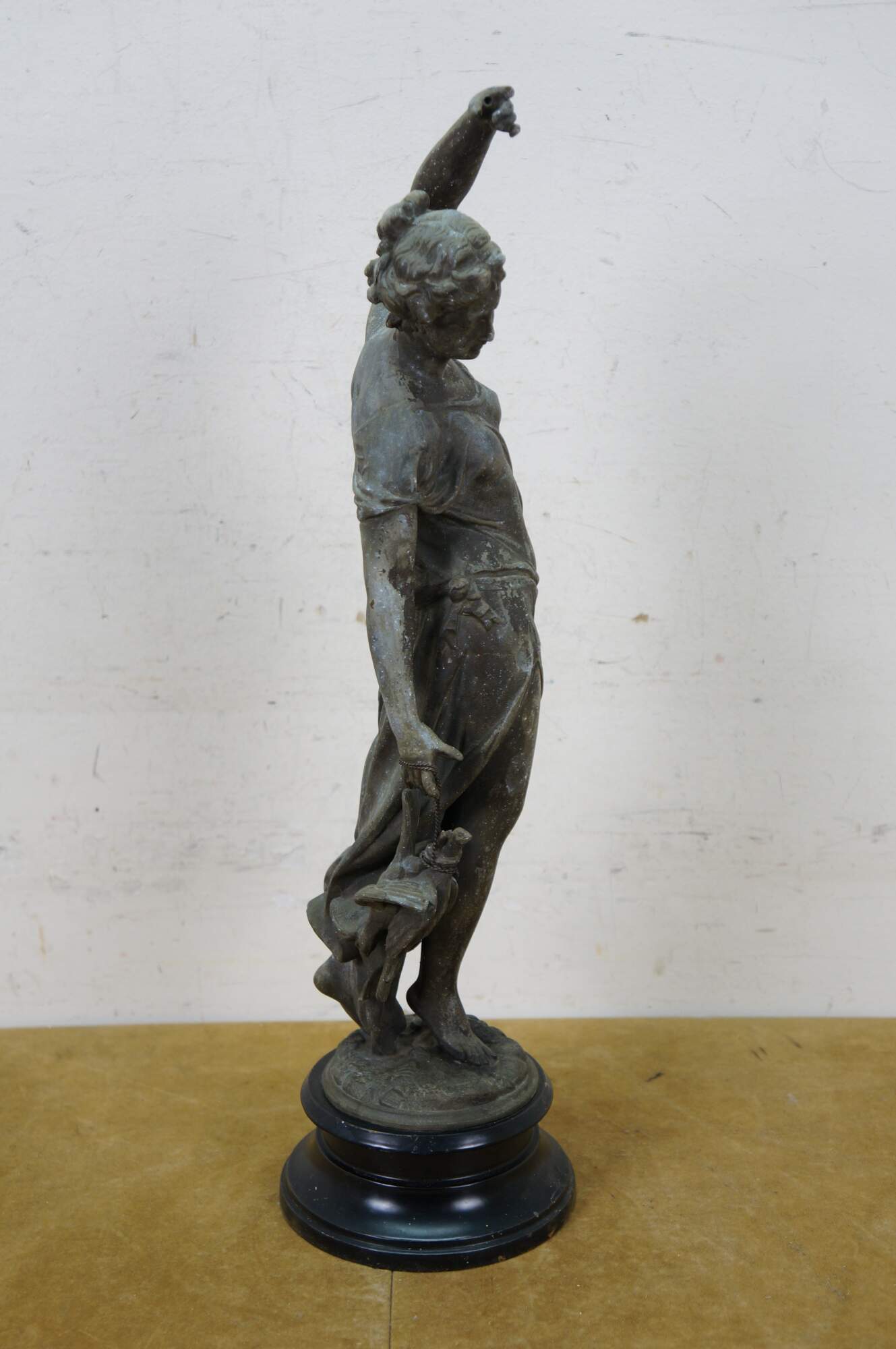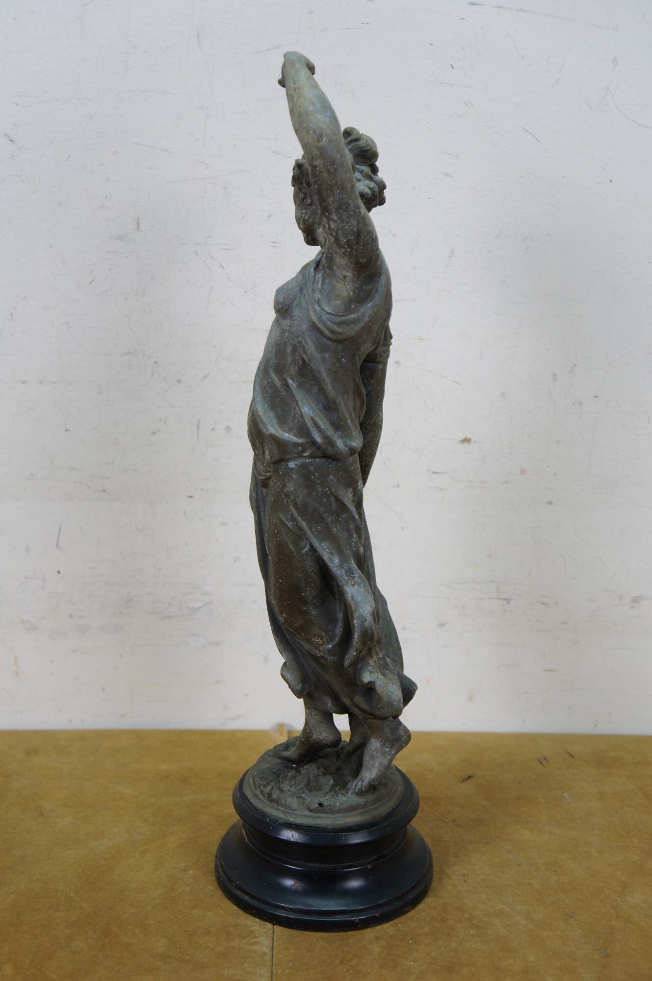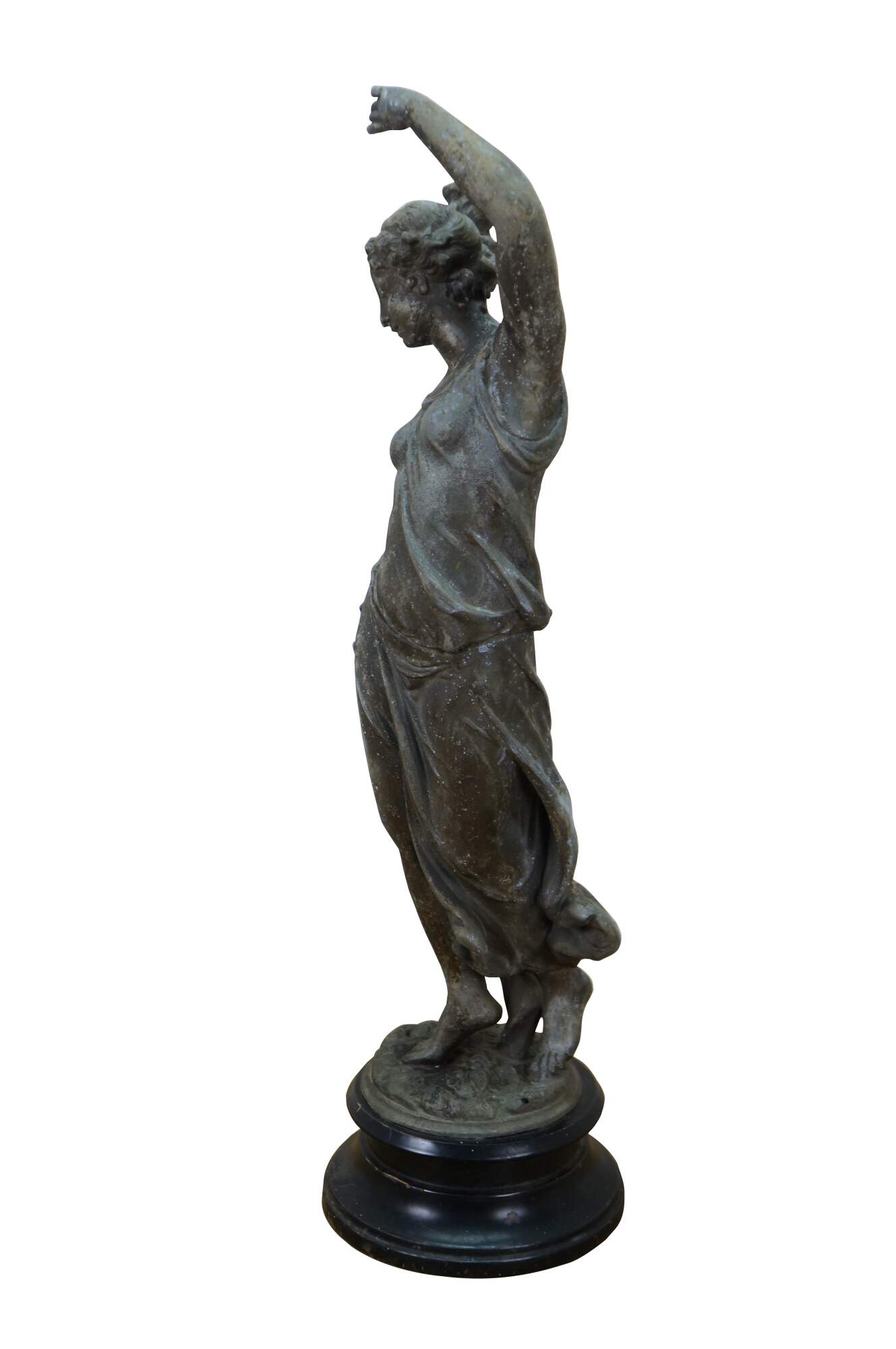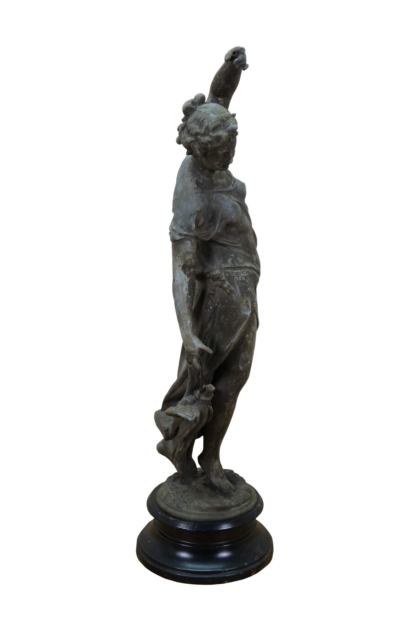Antique spelter bronze sculpture / figurine in the shape of a classical Grecian styled woman with one arm raised over her head and the other holding a pair of game birds. Stands on a round plinth.