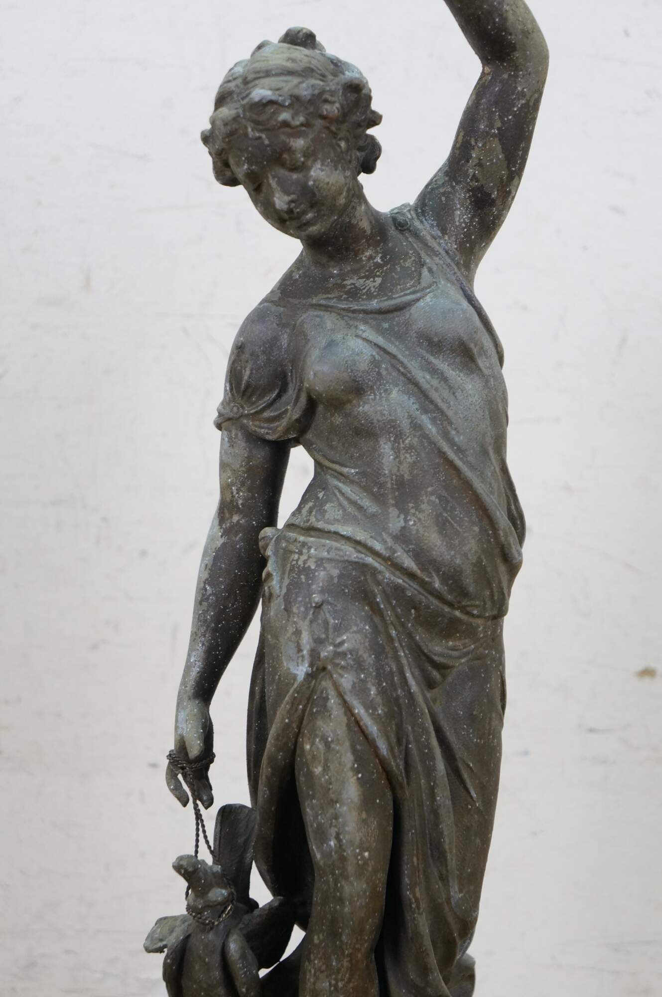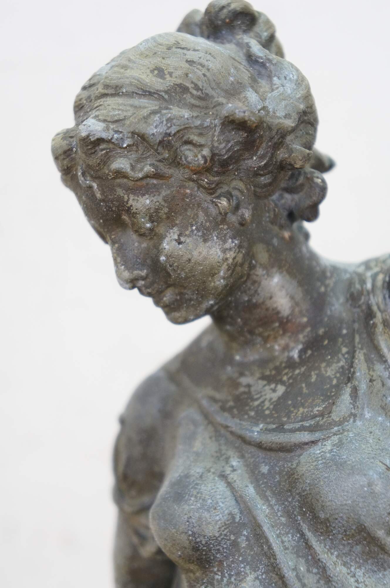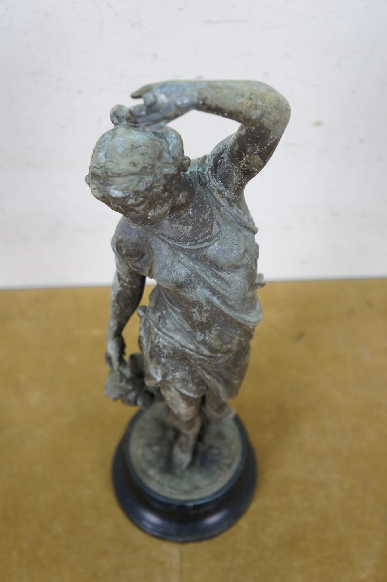 Antique spelter bronze sculpture / figurine in the shape of a classical Grecian styled woman with one arm raised over her head and the other holding a pair of game birds. Stands on a round plinth.