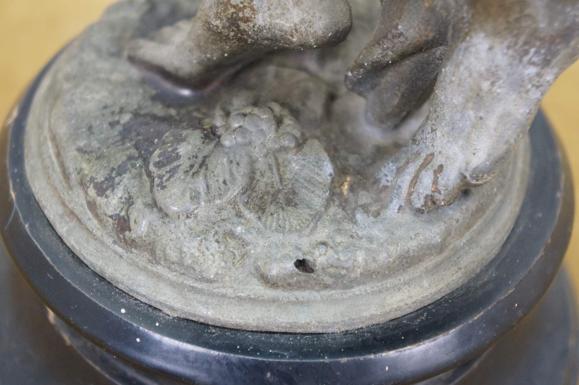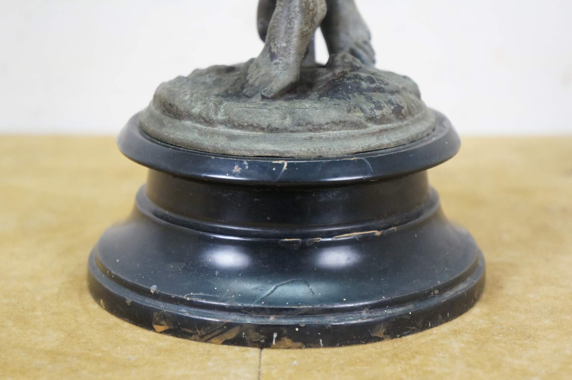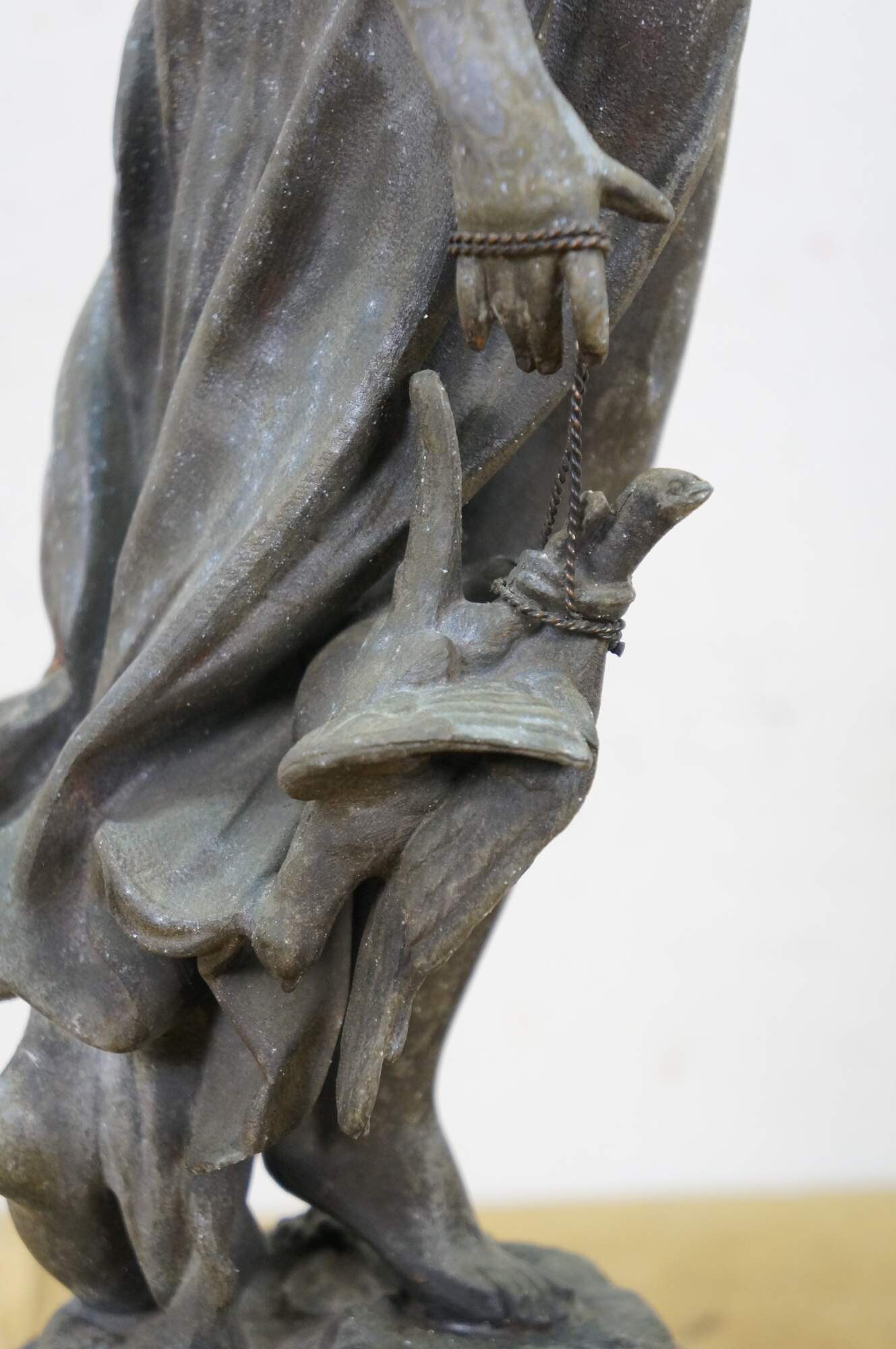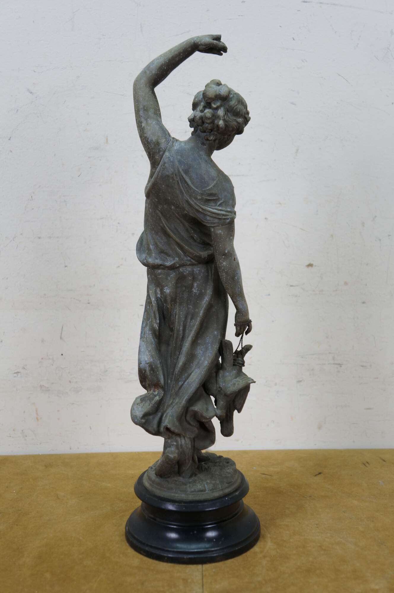 Antique spelter bronze sculpture / figurine in the shape of a classical Grecian styled woman with one arm raised over her head and the other holding a pair of game birds. Stands on a round plinth.